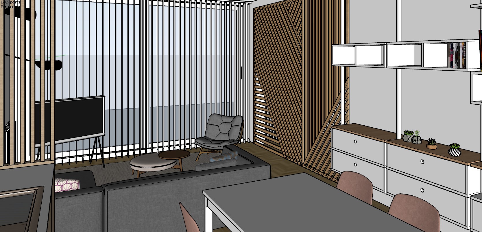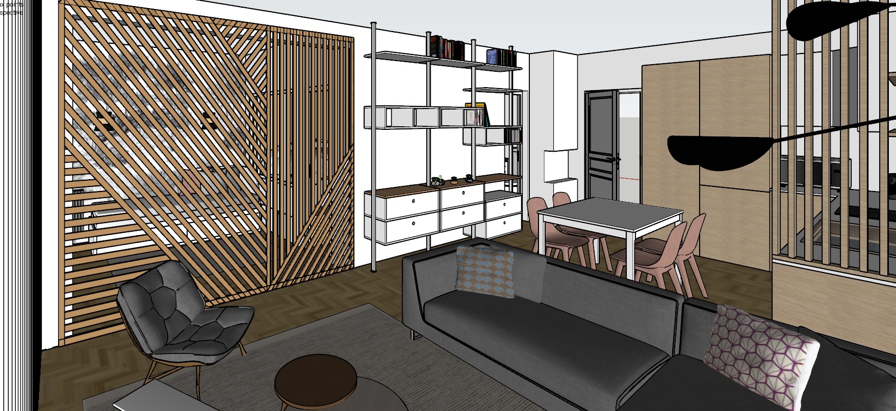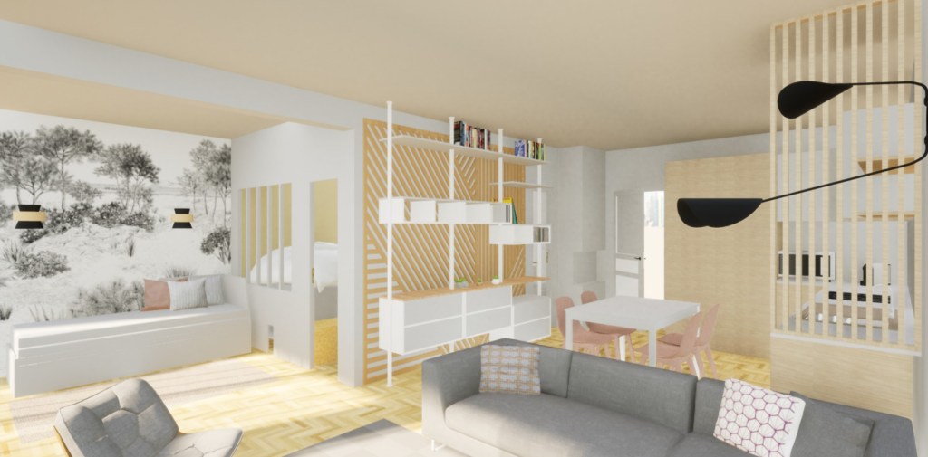 A la place de l’ancienne chambre principale, on trouve désormais un espace détente / lecture avec une banquette pouvant être transformée en lit 1 ou 2 places. Afin de donner de l’intimité à cet espace, j’ai proposé un grand claustra coulissant derrière une grande bibliothèque légèrement décollée du mur. Ce meuble, dont la structure est coincée entre le sol et le plafond, permet de laisser quelques centimètres pour que la paroi coulisse totalement entre la bibliothèque et la cloison pour une ouverture totale du passage et une perspective décuplée.