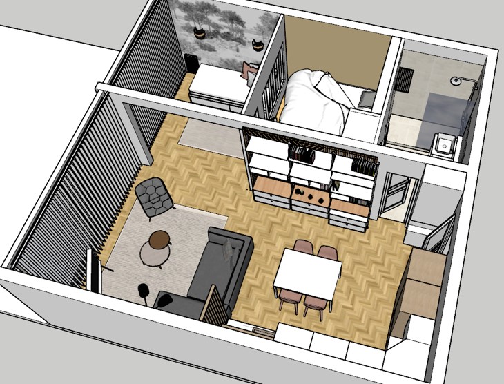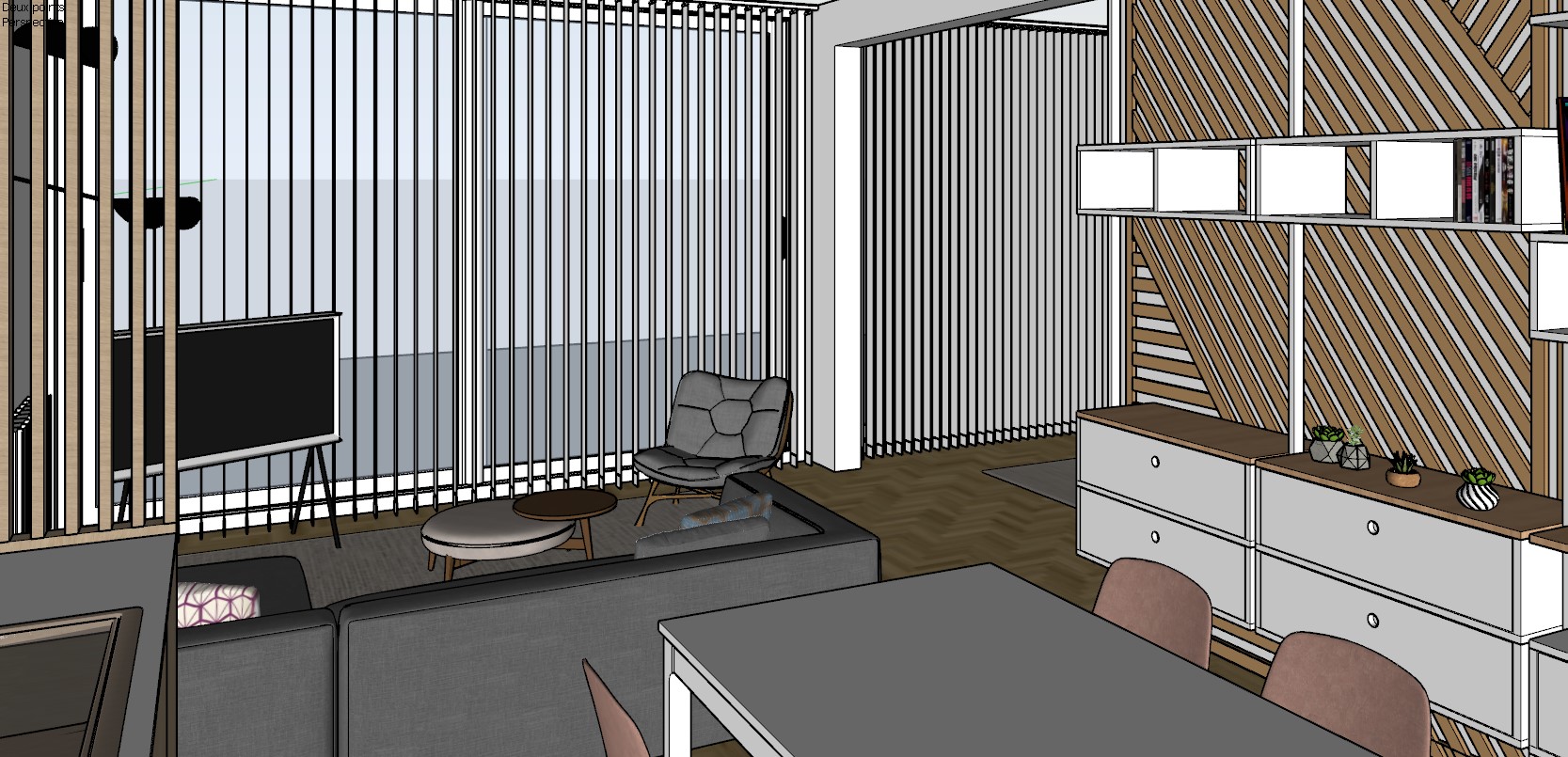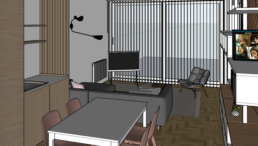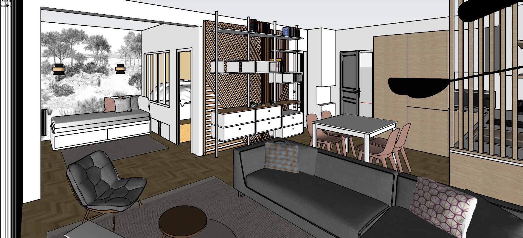 Conception (plans, images d’inspiration et 3D) pour un projet de rénovation d’un grand studio de 50m² avec terrasse en première ligne sur le Bassin d’Arcachon. Cette résidence secondaire se trouve dans un immeuble de standing qui date des années 70. Les propriétaires ont pour objectif de le remettre au goût du jour d’ici quelques années et d’avoir un espace modulable pour y séjourner à 2, 4 ou exceptionnellement 5 ou 6 avec aussi un espace repas à l’intérieur.