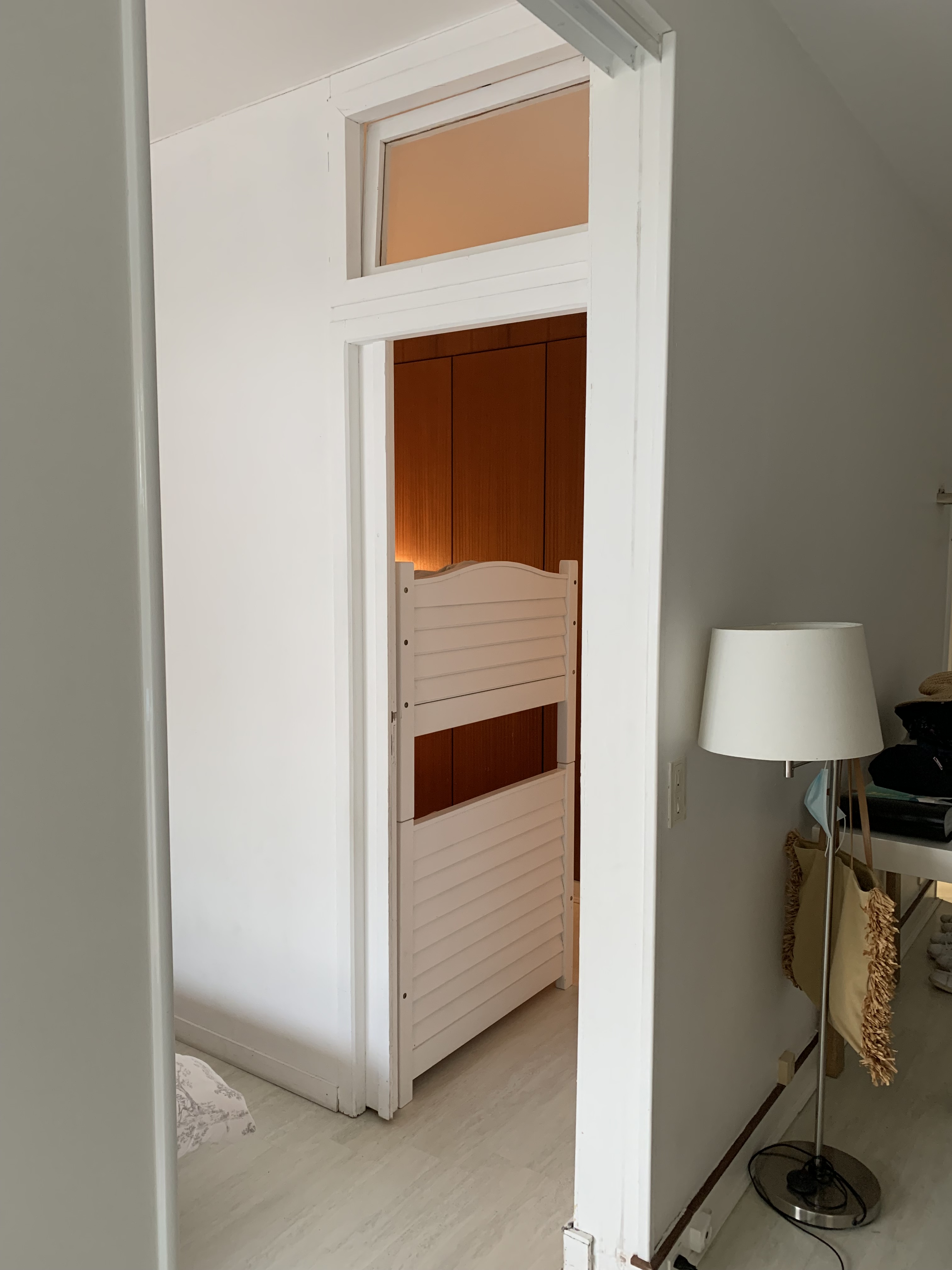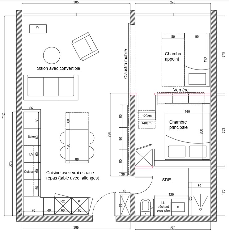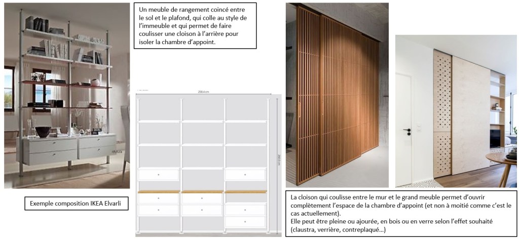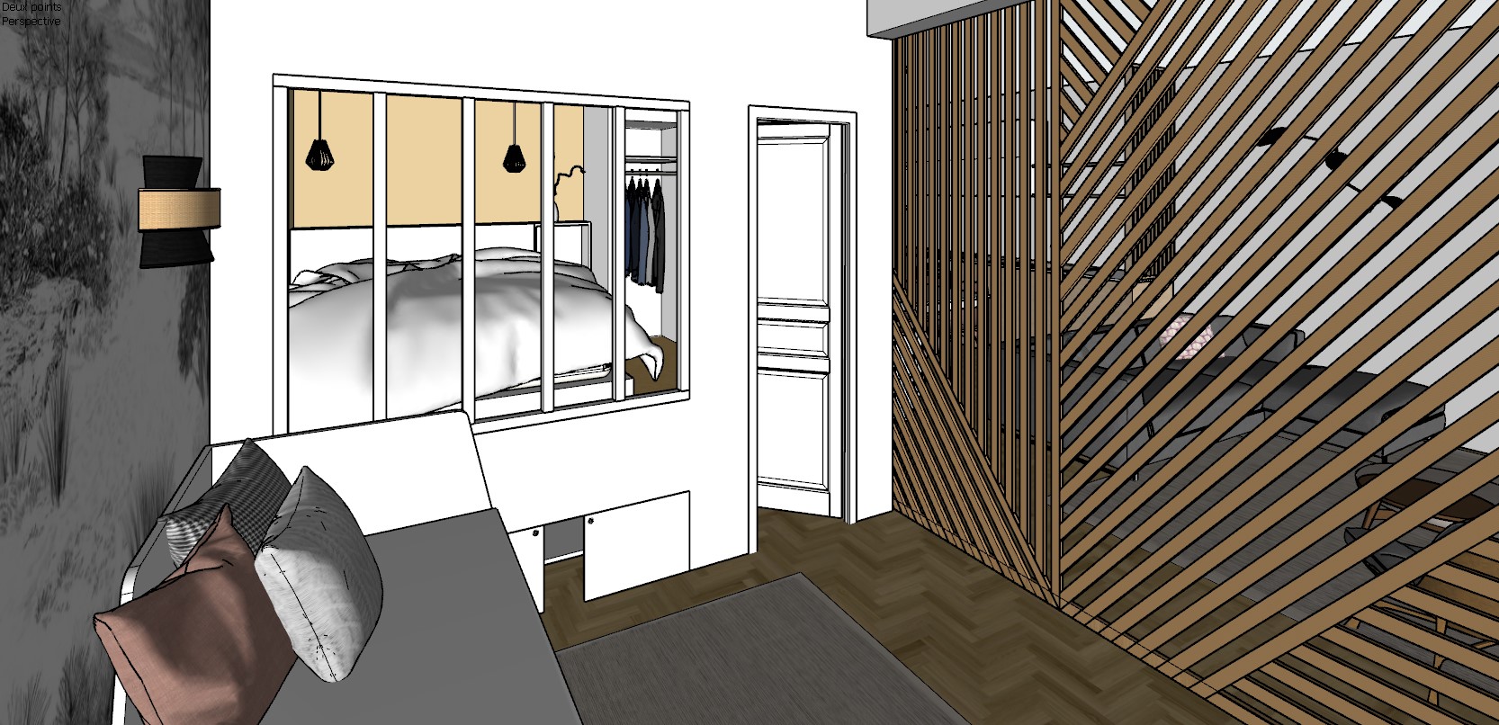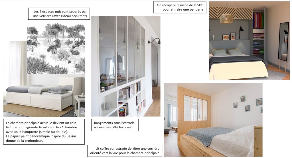 L’idée a été d’inverser la partie nuit principale (couchage double) avec la partie couchage d’appoint afin de profiter d’un grand séjour en L quand on n’est qu’à 2. Afin de rendre la chambre principale, désormais en second jour, plus agréable, le lit double a été positionné face à la baie vitrée, sur estrade et derrière une verrière afin de profiter de la vue même assis dans le lit. Sous l’estrade : du rangement. Le recoin qui accueillait le sèche linge dans la SDB à été inversé pour être accessible depuis la chambre et créer une penderie.