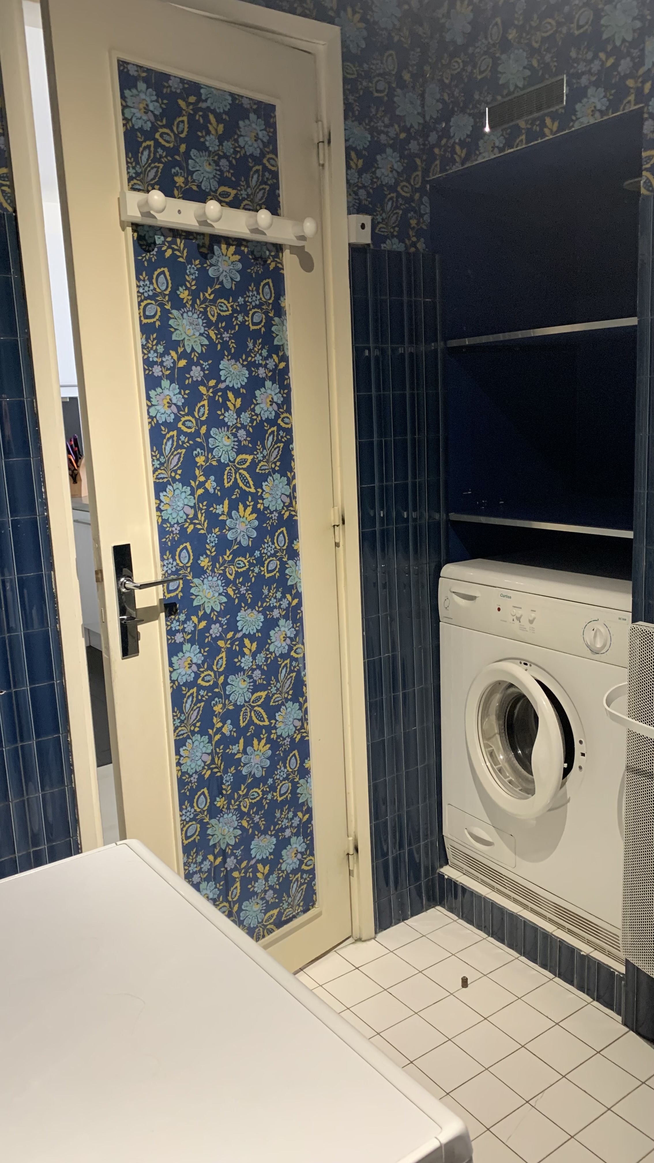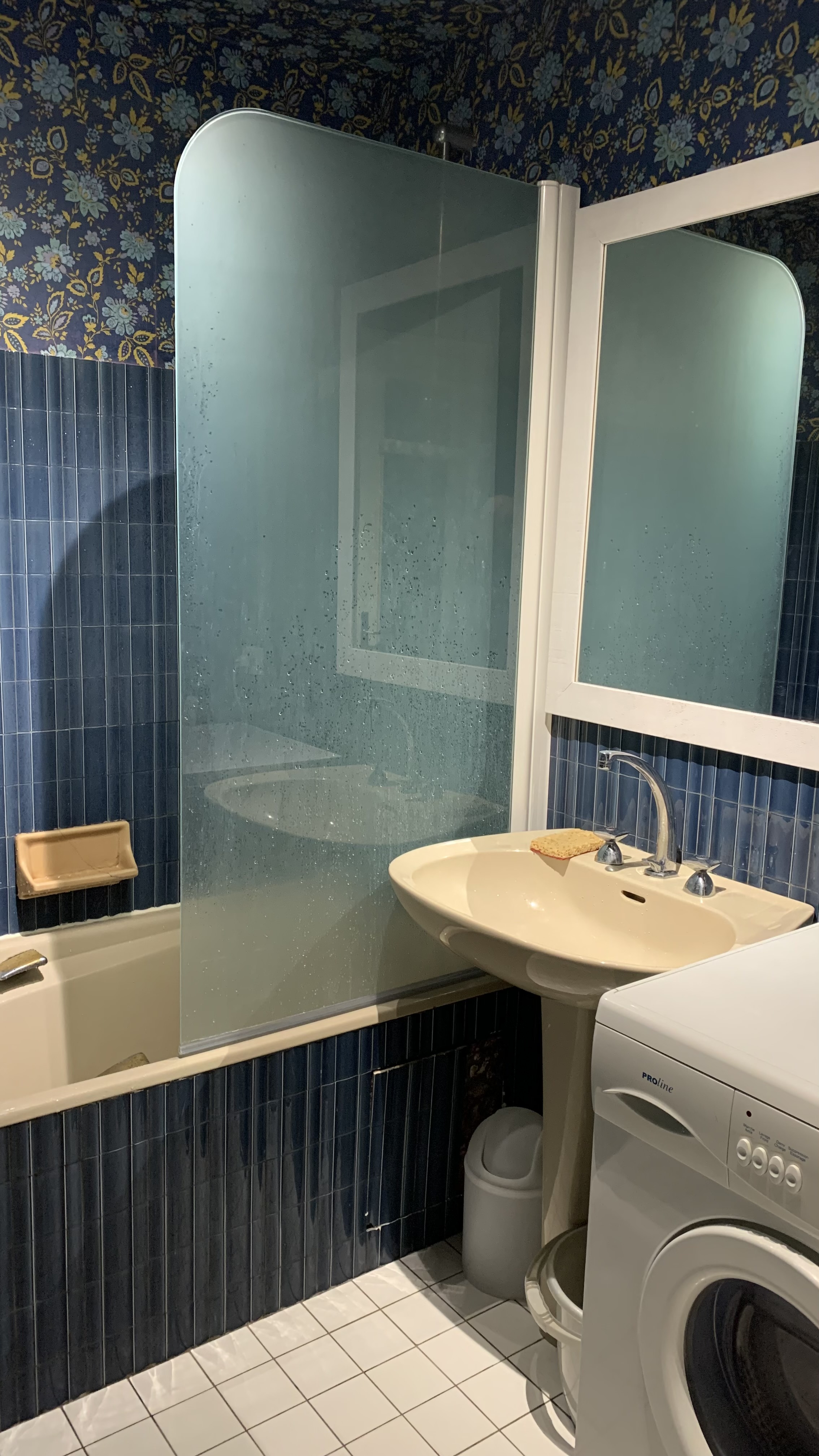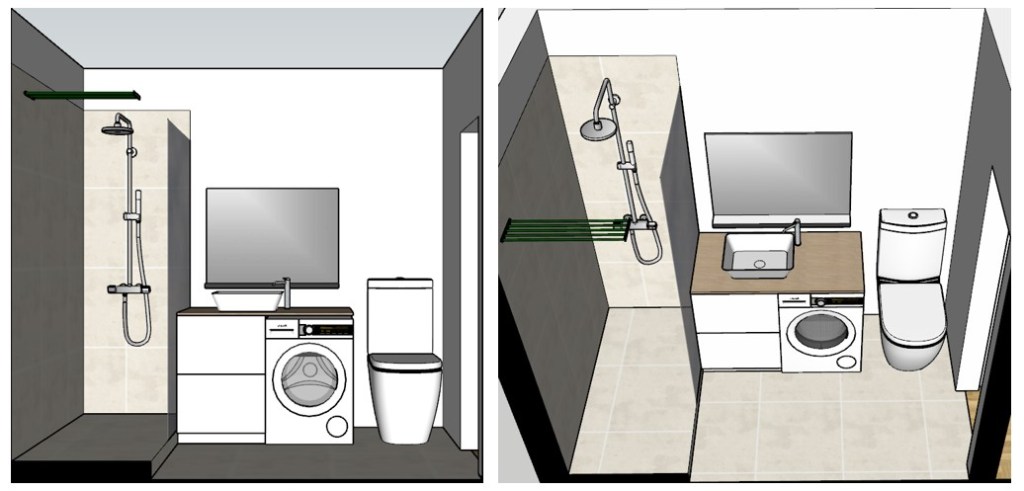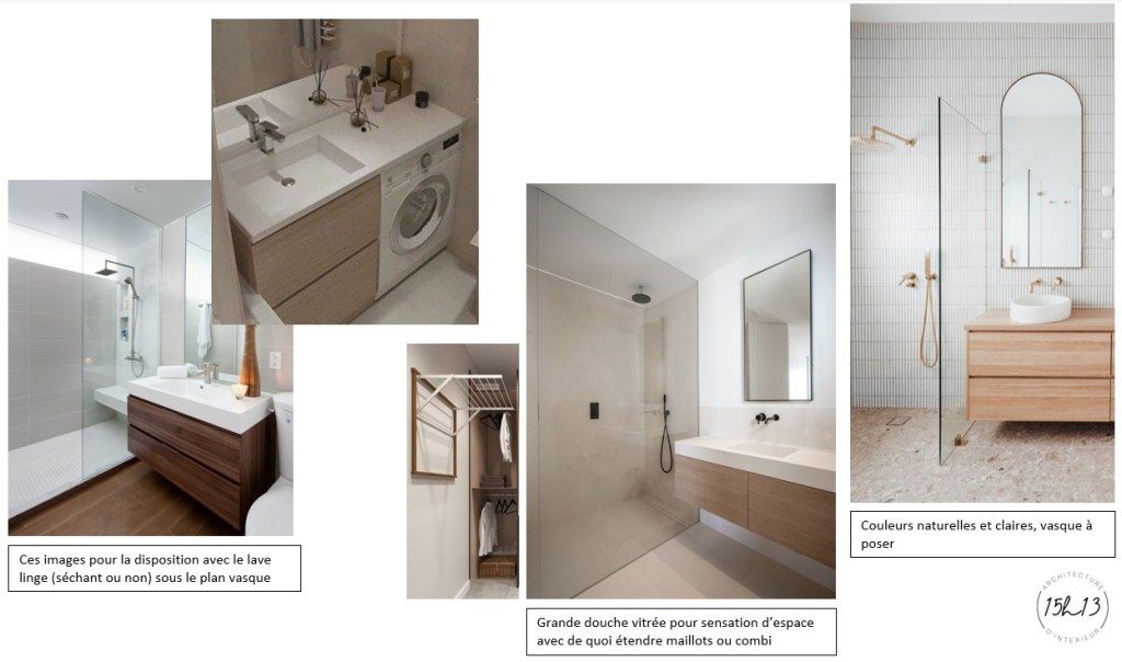 Pour la salle d’eau, relooking total avec des couleurs claires et épurées pour donner une plus grande sensation d’espace. Une grande douche plus pratique remplace la baignoire et un lave-linge séchant prend place sous le plan vasque pour un gain de place.