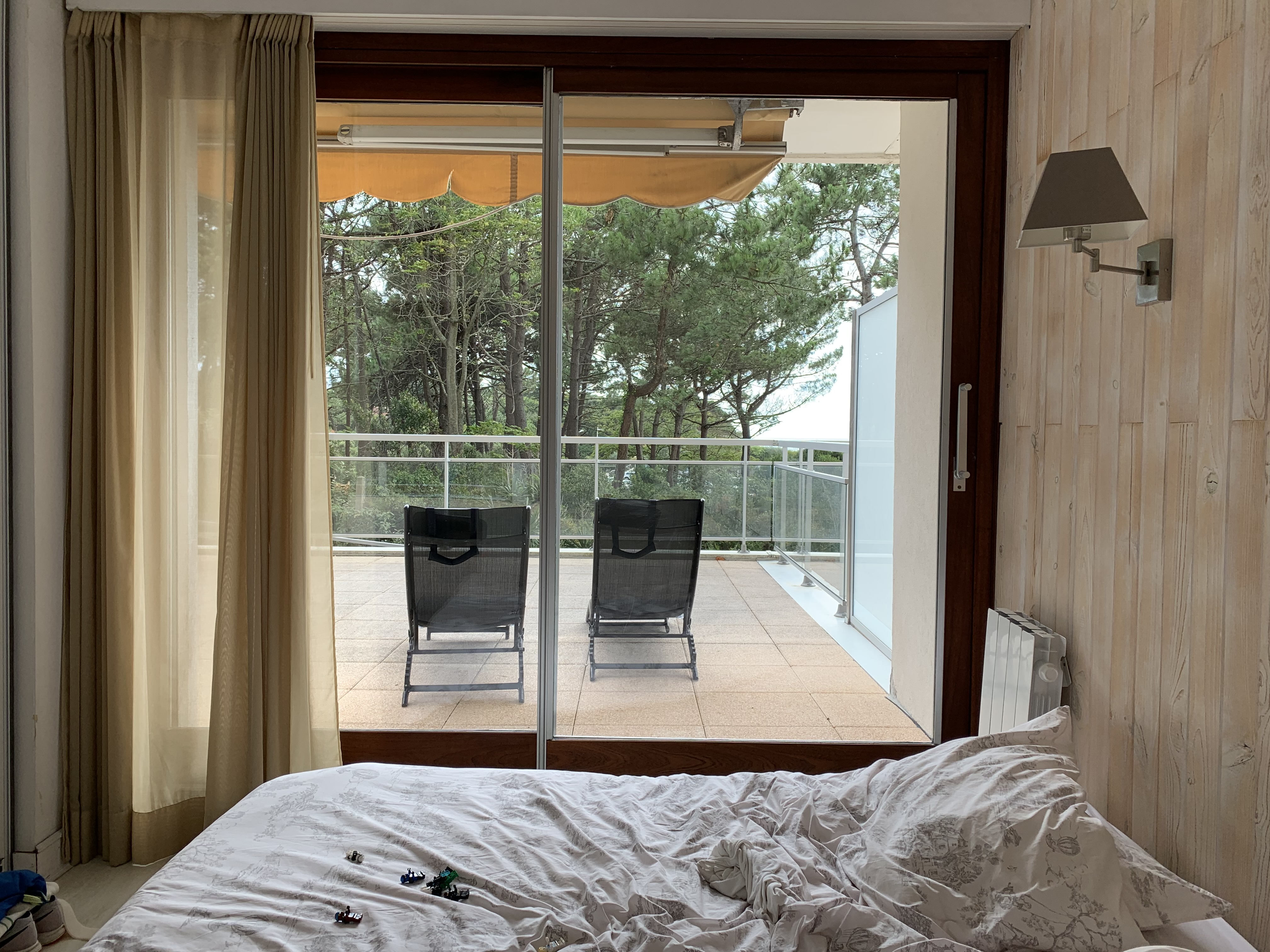 L’atout indéniable de cet appartement est sa grande terrasse de 40m² avec une vue imprenable sur les arbres et le Bassin avec au fond le Cap Ferret. 2 grandes baies vitrées coulissantes permettent de profiter de la vue.