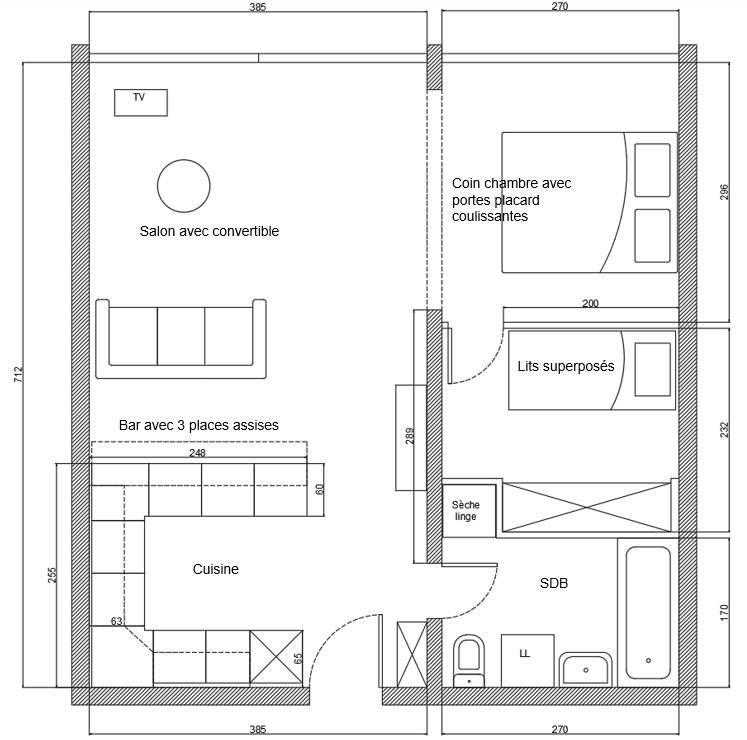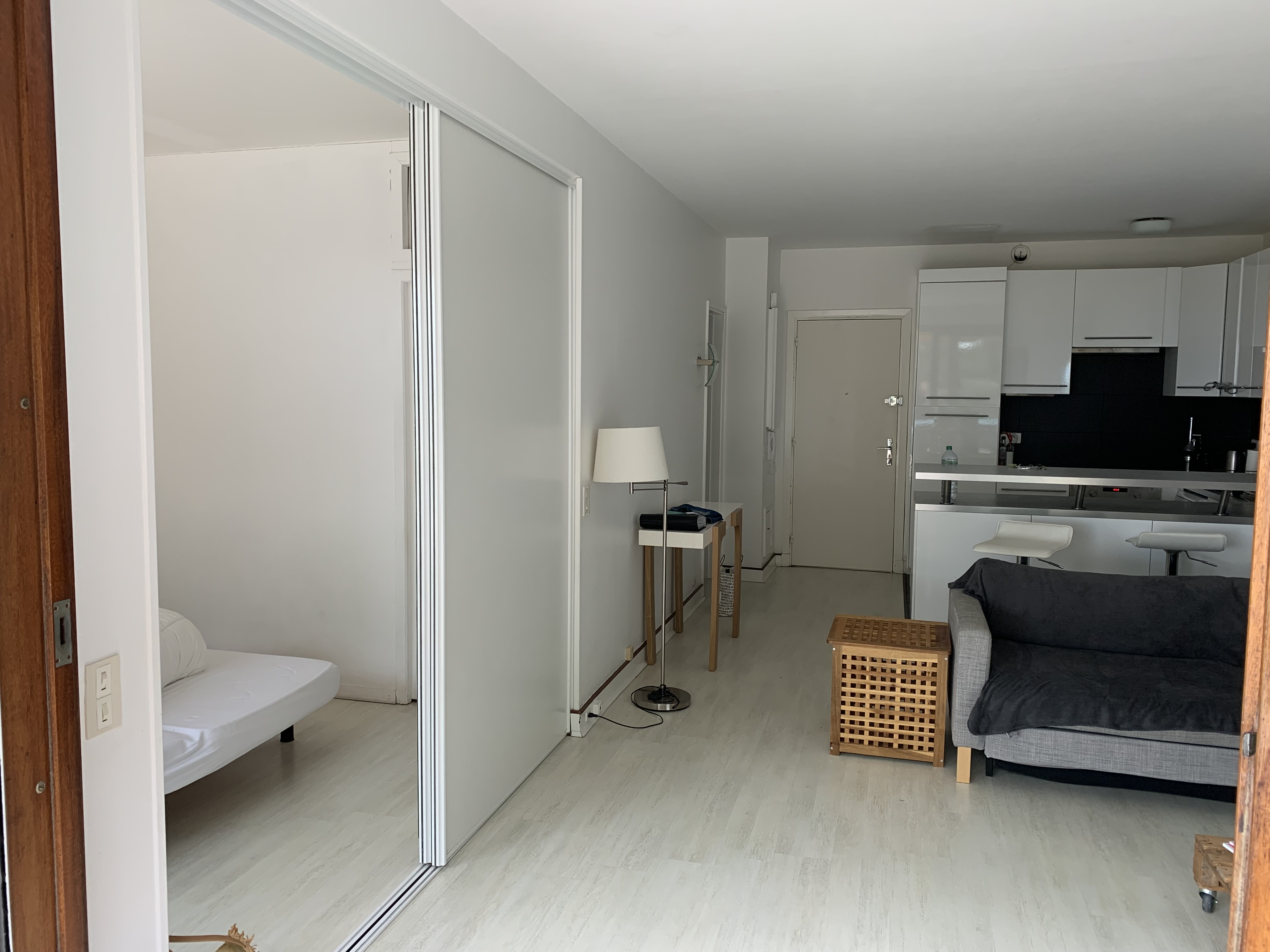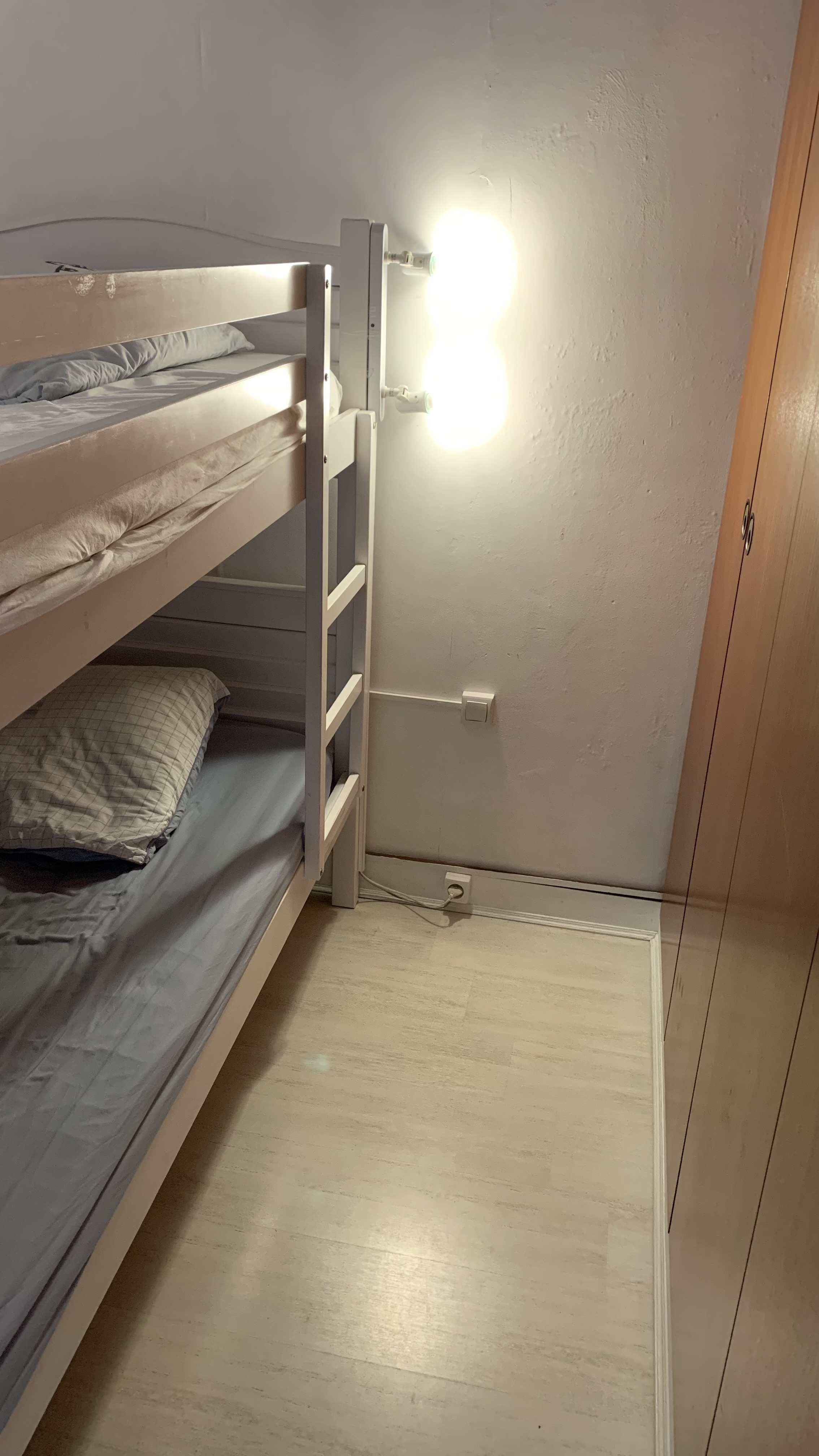 Ce grand studio a déjà bénéficié d’un rafraichissement il y a quelques années, exceptée la salle de bain restée dans son jus. On entre directement dans la cuisine en U avec un bar qui offre 3 places assises en hauteur mais pas de table à manger, excepté le salon de jardin sur la terrasse. On arrive ensuite dans un espace salon et au fond à droite, derrière des portes de placard coulissantes ne s’ouvrant pas totalement, une chambre avec, en enfilade, un petit coin nuit avec 2 lits superposés et un grand placard (pièce quasi aveugle). On accède à la salle de bain à l’entrée.