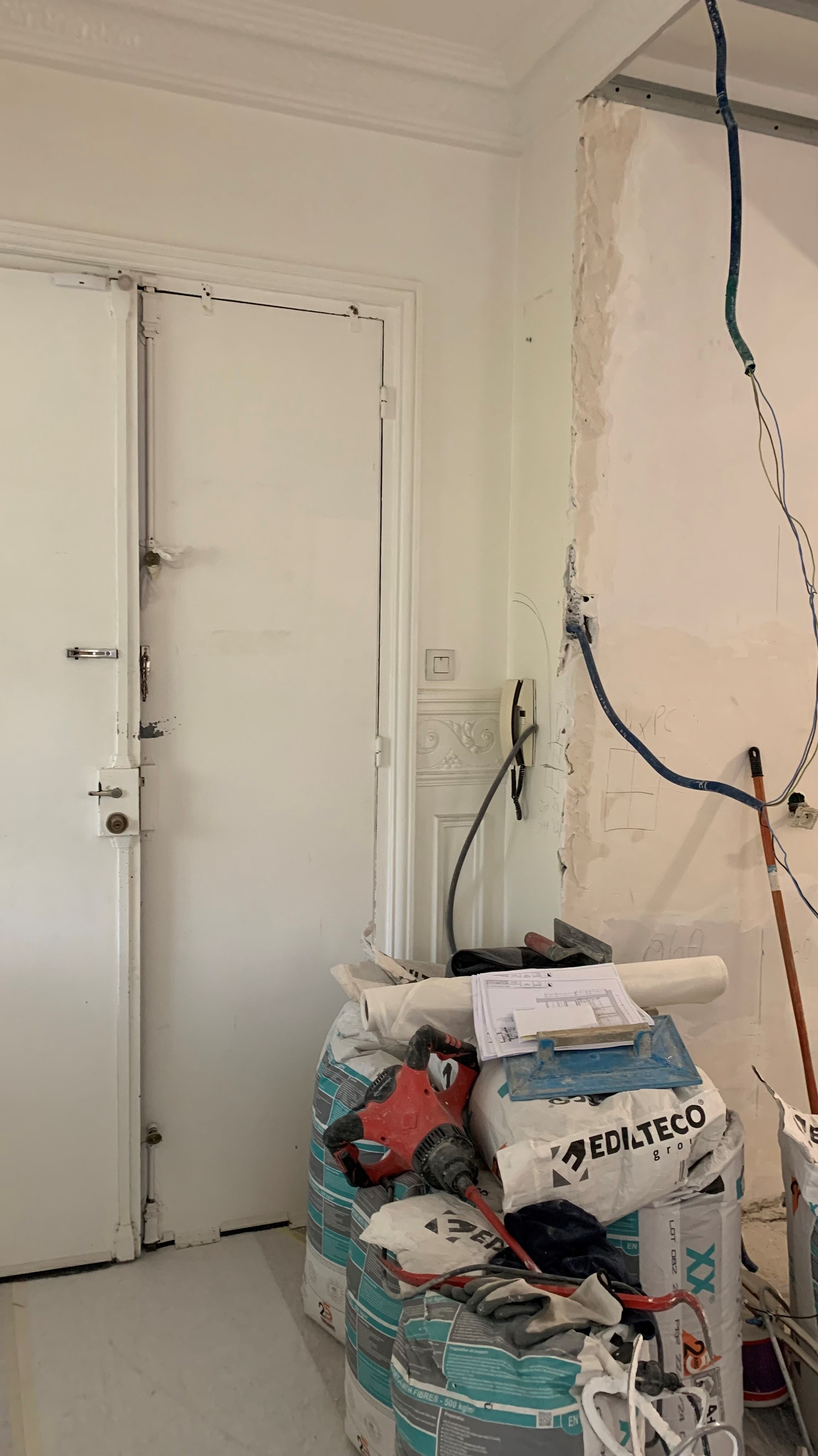 On commence par l’entrée. La problématique ici était de délimiter une entrée dans le futur espace ouvert et d’y caser une banquette, une penderie et de quoi ranger les chaussures dans un espace très restreint et en partie devant le second battant de la double porte d’entrée. Tout cela en préservant les moulures du plafond et en repositionnant l’interphone ! En face, sous la fenêtre, les clients souhaitaient un meuble qui serve à la fois de console avec 2 petits tiroirs et de meuble à chaussures pour toute la famille.