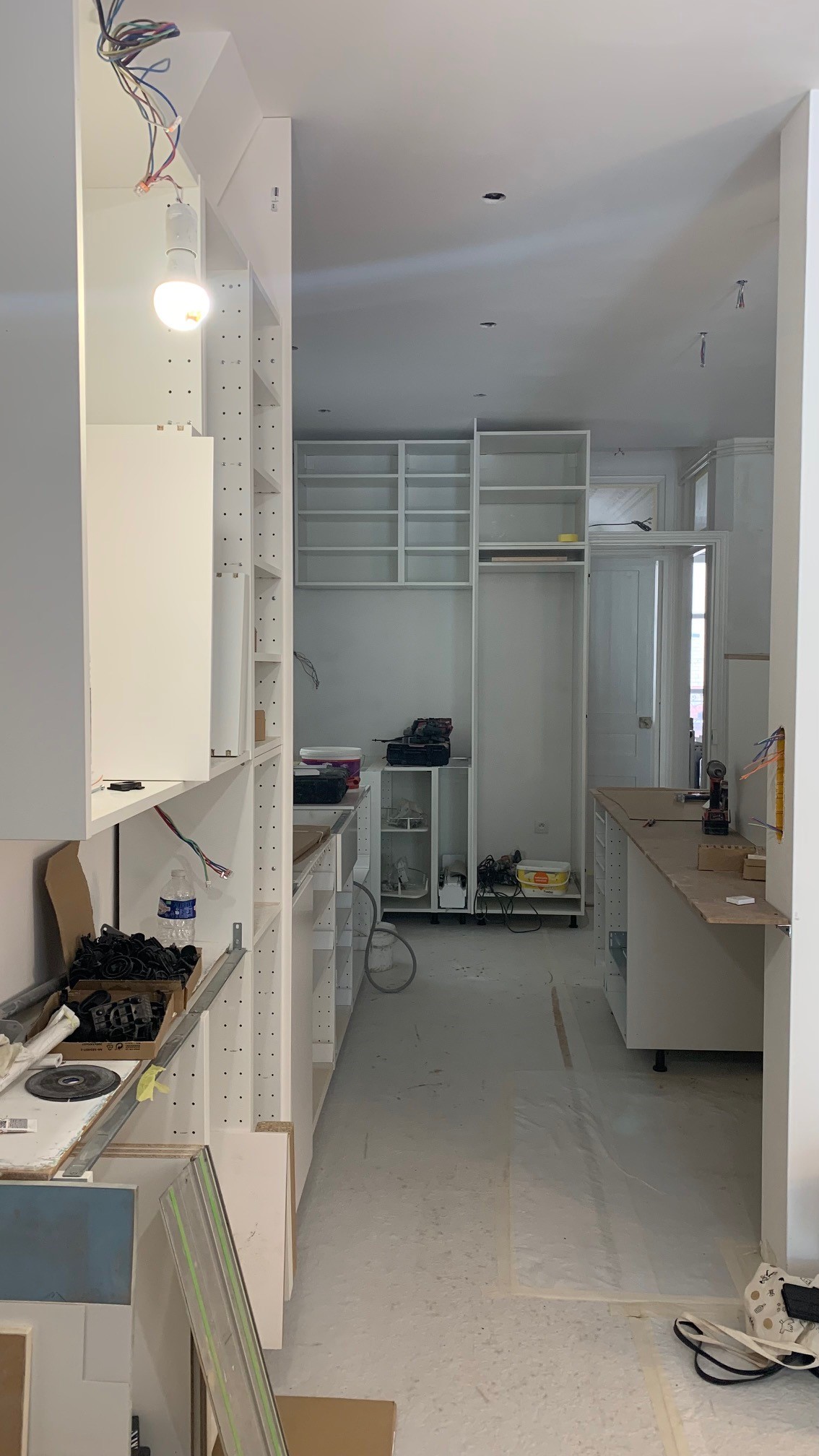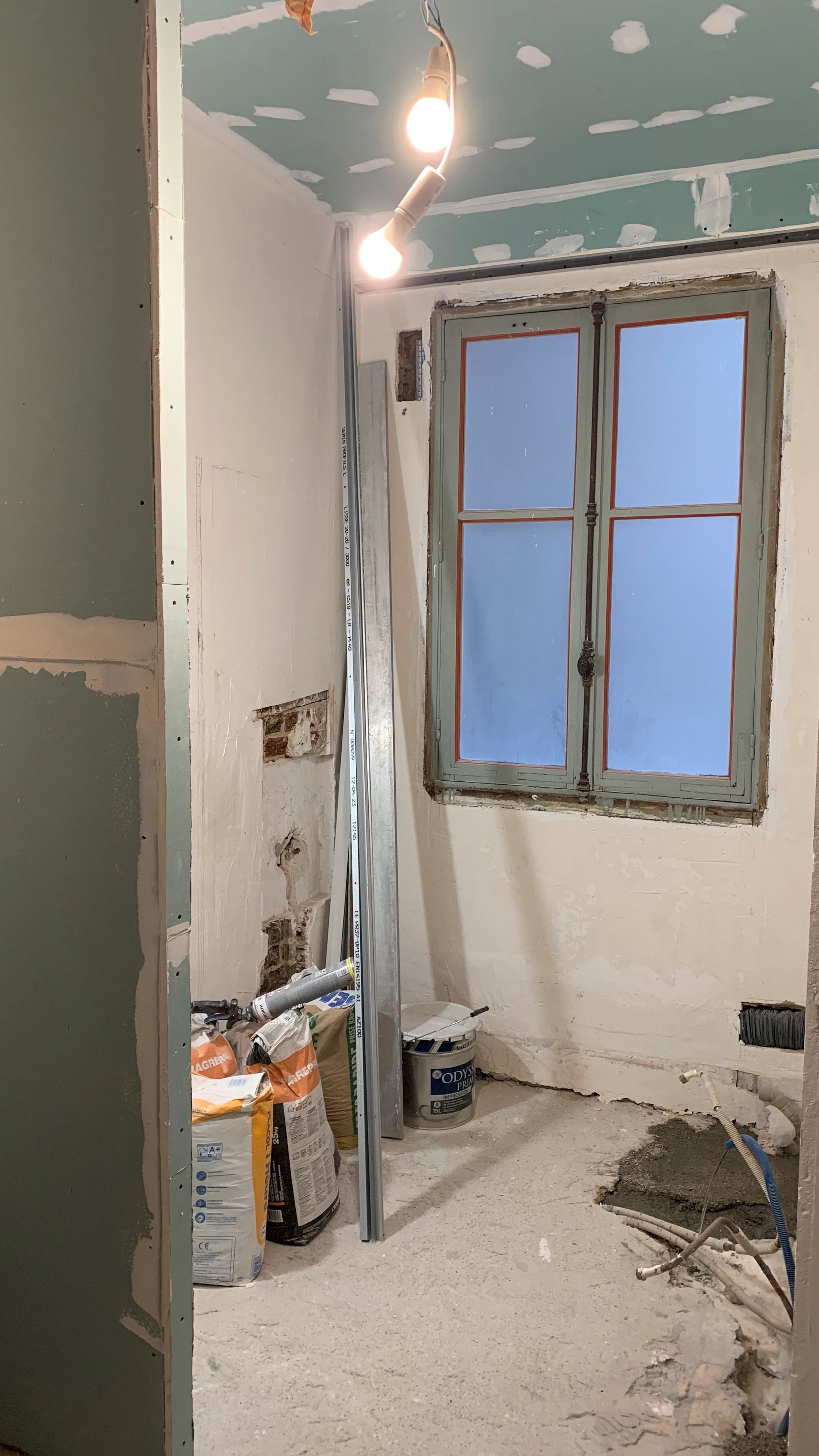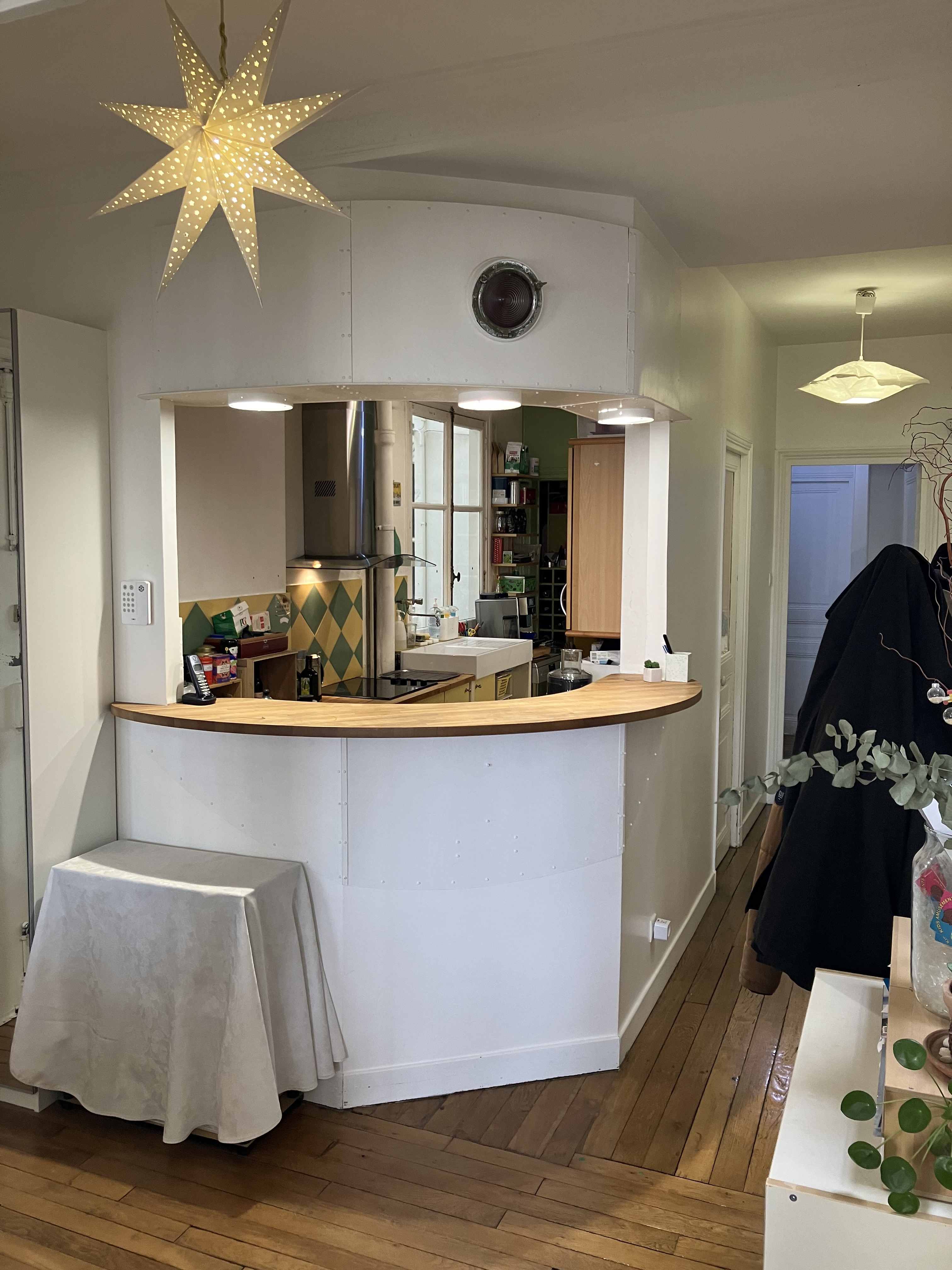 Avant l’installation de ces éléments de mobilier et de décoration, nous avons totalement repensé la coque en faisant un travail d’isolation en doublant les murs donnant sur l’extérieur, changeant les fenêtres mouton et gueule de loup, en changeant le sol tout en conservant le même niveau que l’ancien parquet conservé et en travaillant un faux plafond le plus fin possible afin de conserver le plus de hauteur sous plafond possible.