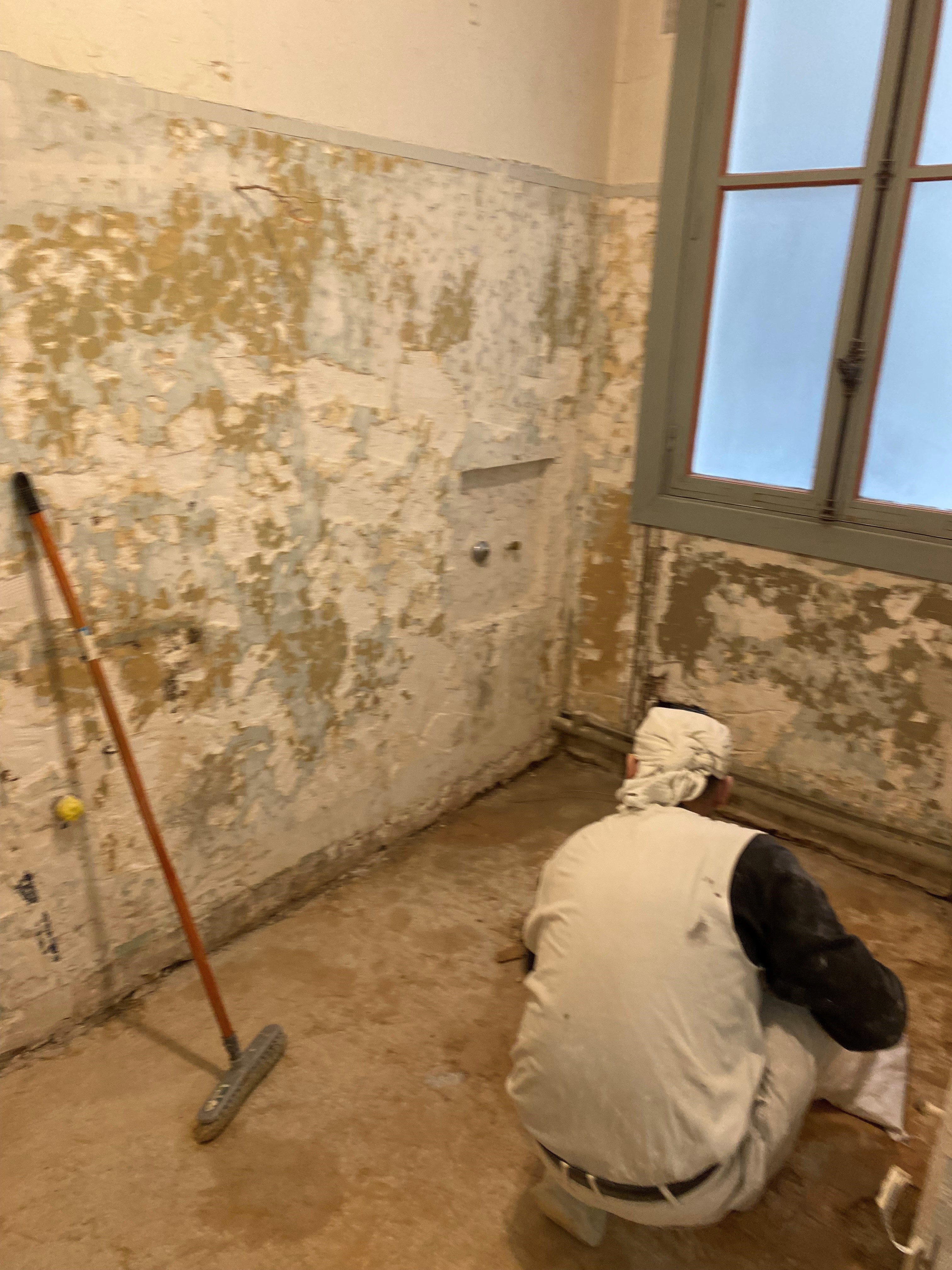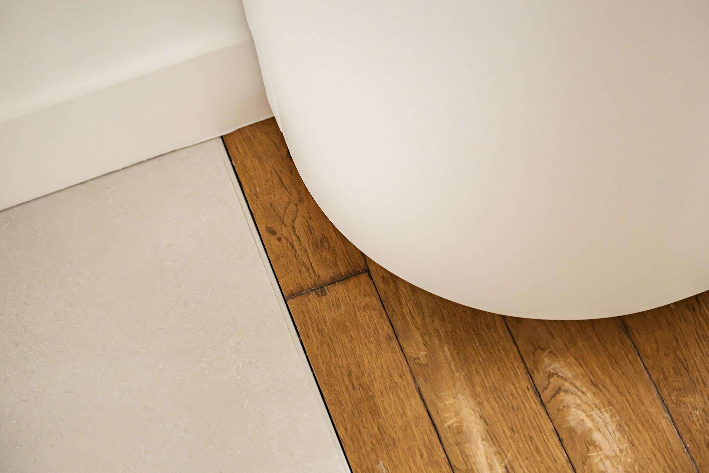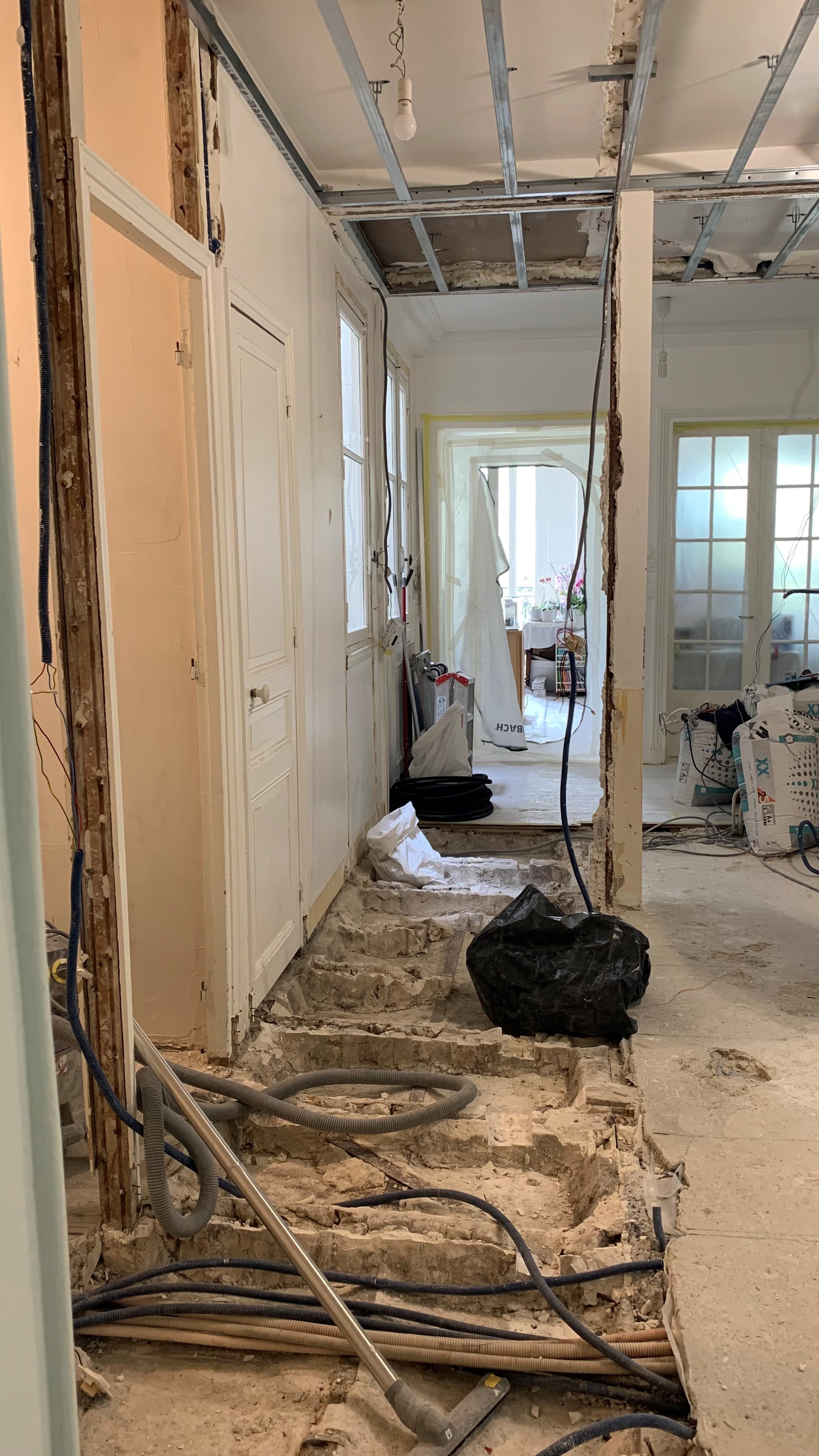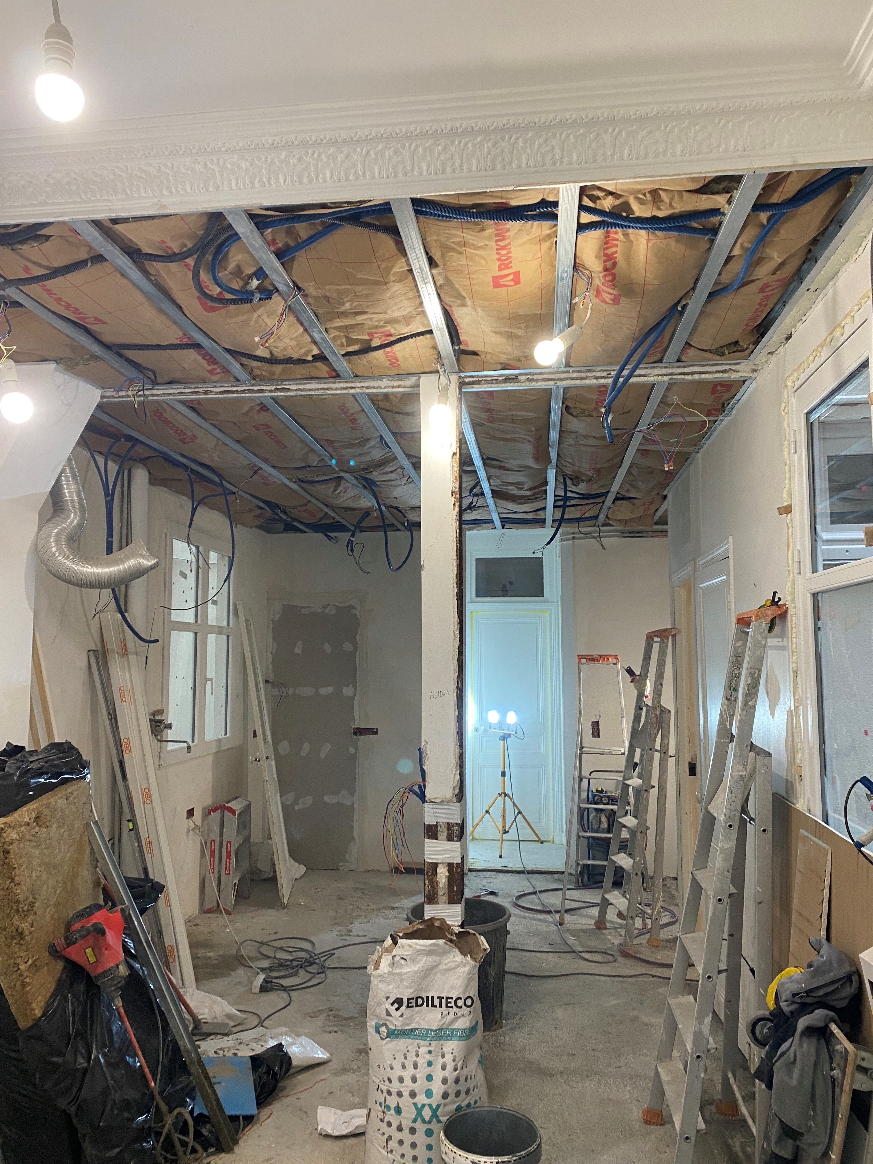 Avant l’installation de ces éléments de mobilier et de décoration, nous avons totalement repensé la coque en faisant un travail d’isolation en doublant les murs donnant sur l’extérieur, changeant les fenêtres mouton et gueule de loup, en changeant le sol tout en conservant le même niveau que l’ancien parquet conservé et en travaillant un faux plafond le plus fin possible afin de conserver le plus de hauteur sous plafond possible.