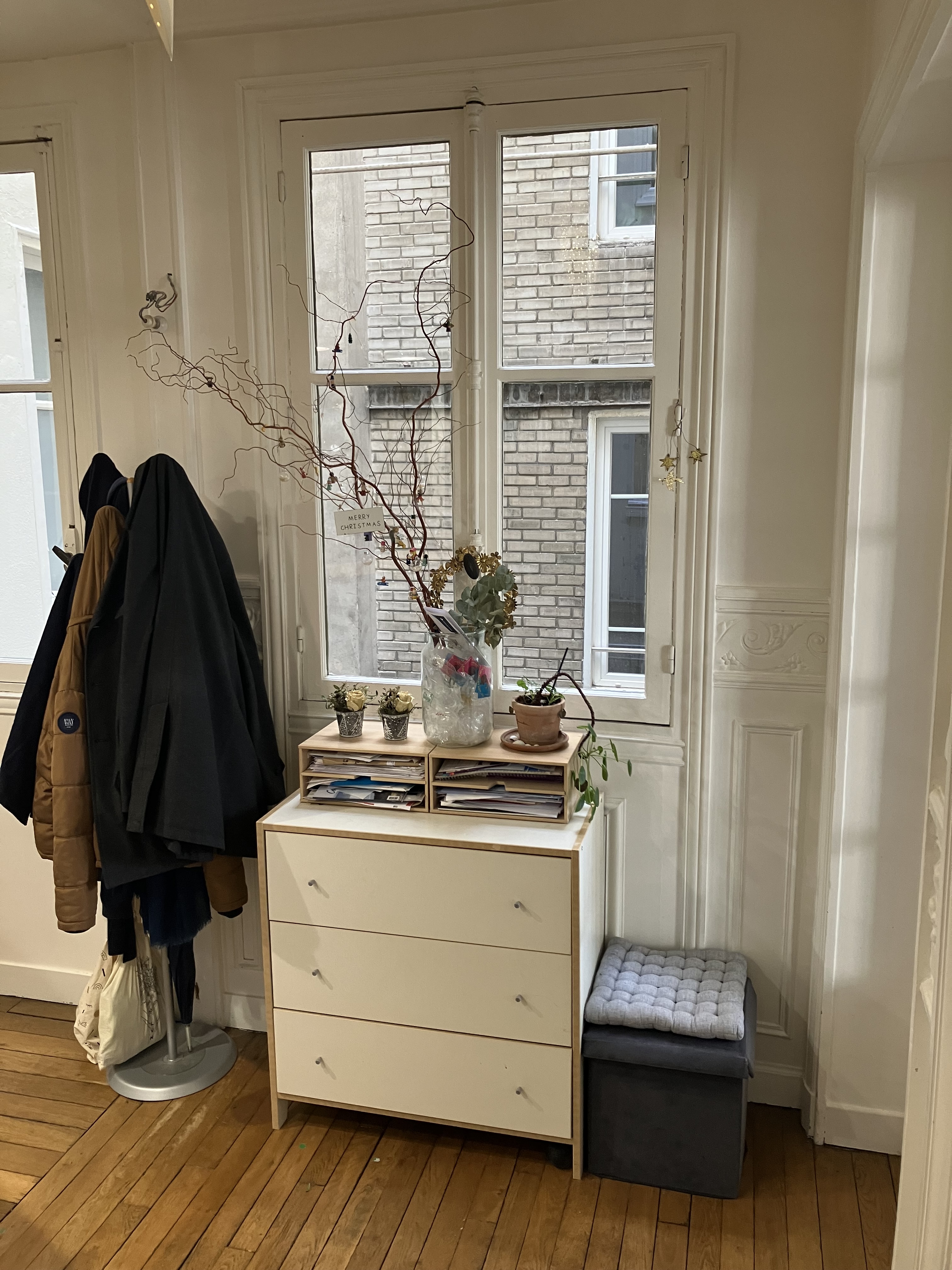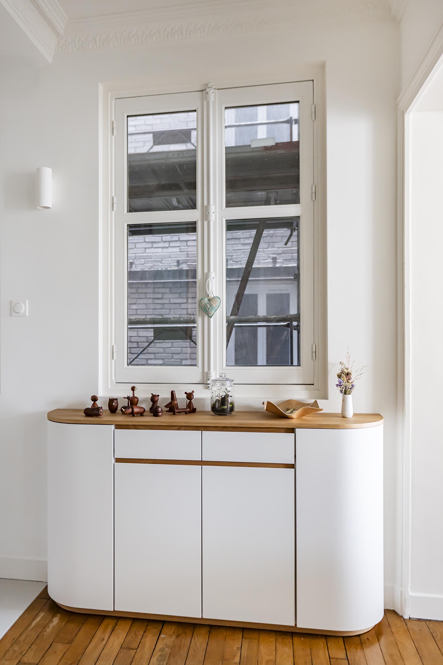 En face, sous la fenêtre, j’ai pensé un meuble cintré de faible profondeur afin de ne pas gêner la circulation car il est proche de la double porte qui donne sur la salle à manger. Il fait à la fois office de console avec ses 2 petits tiroirs et de meuble à chaussures derrières les 4 portes.