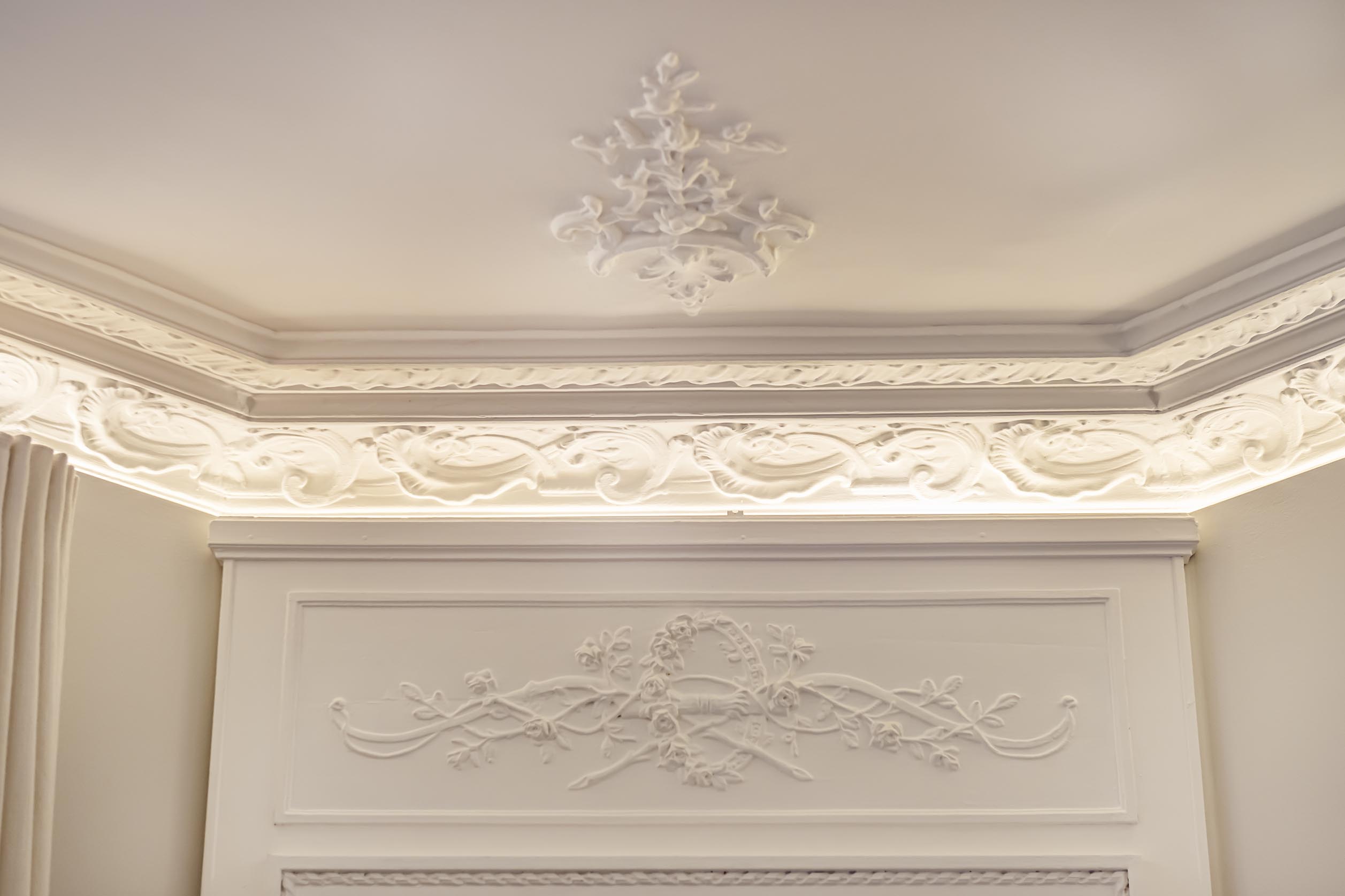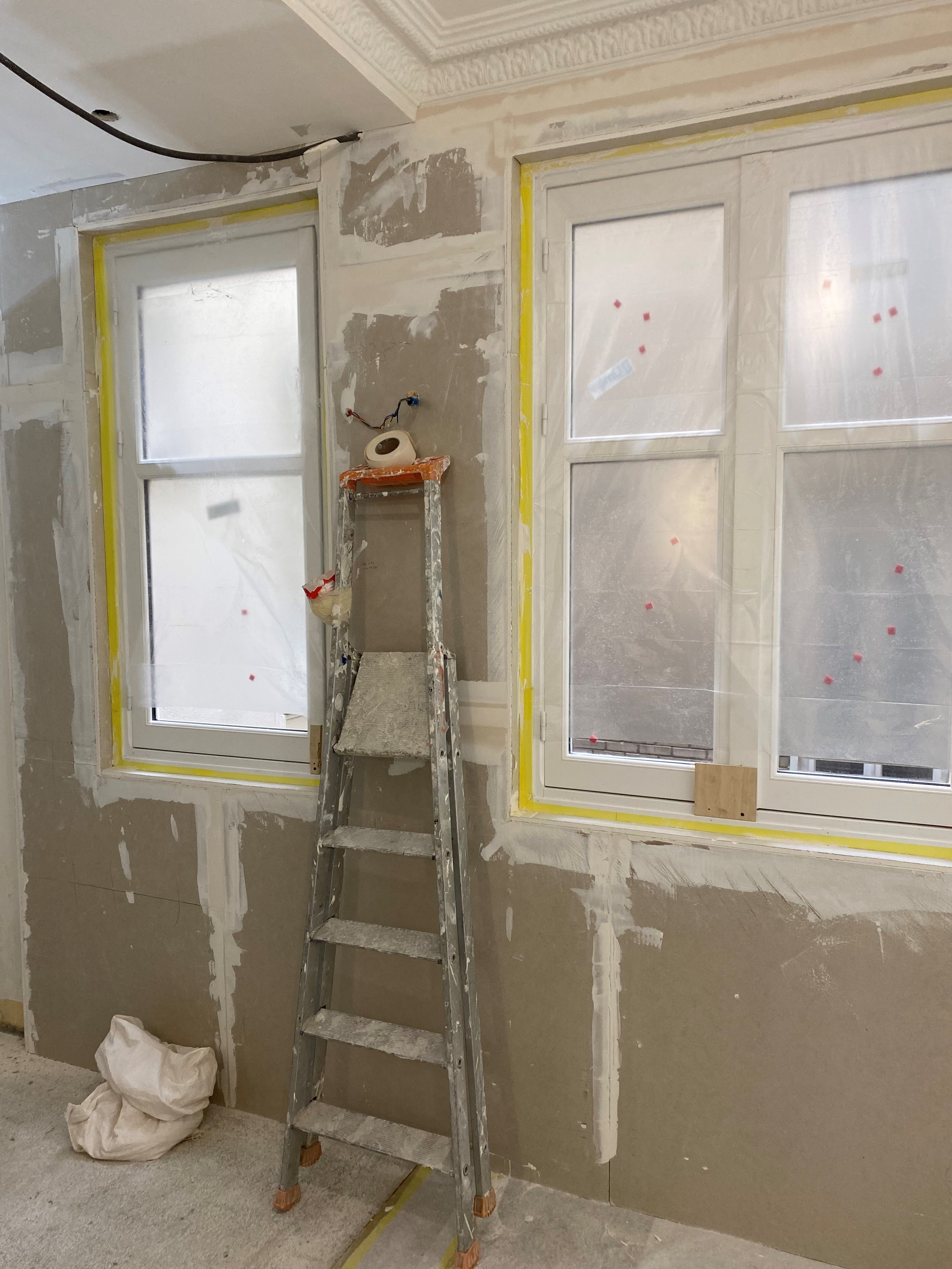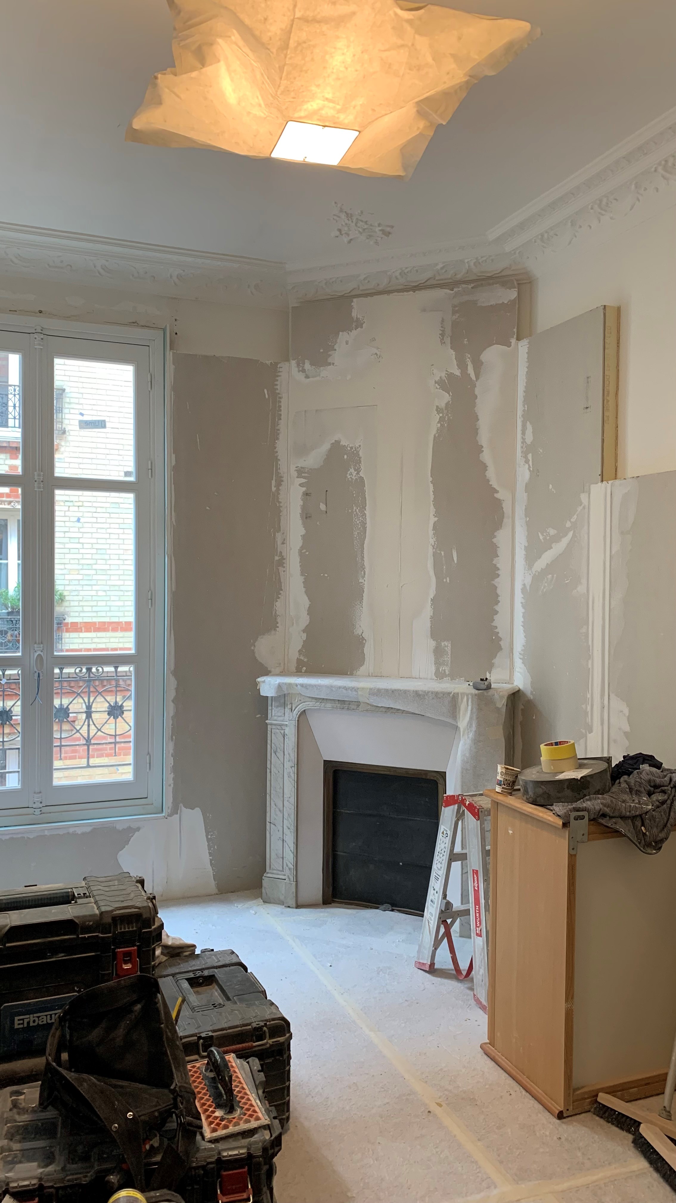 La chambre parentale n’est pas en reste et a subi une belle transformation. On a commencé par isoler thermiquement le mur donnant sur l’extérieur, et phoniquement celui mitoyen avec les voisins, tout en préservant les moulures. Mon astuce a été de créer une petite réservation en haut dans l’épaisseur du doublage pour y intégrer un bandeau LED afin d’éclairer les moulures du plafond et de donner une fonction à cette surépaisseur.
