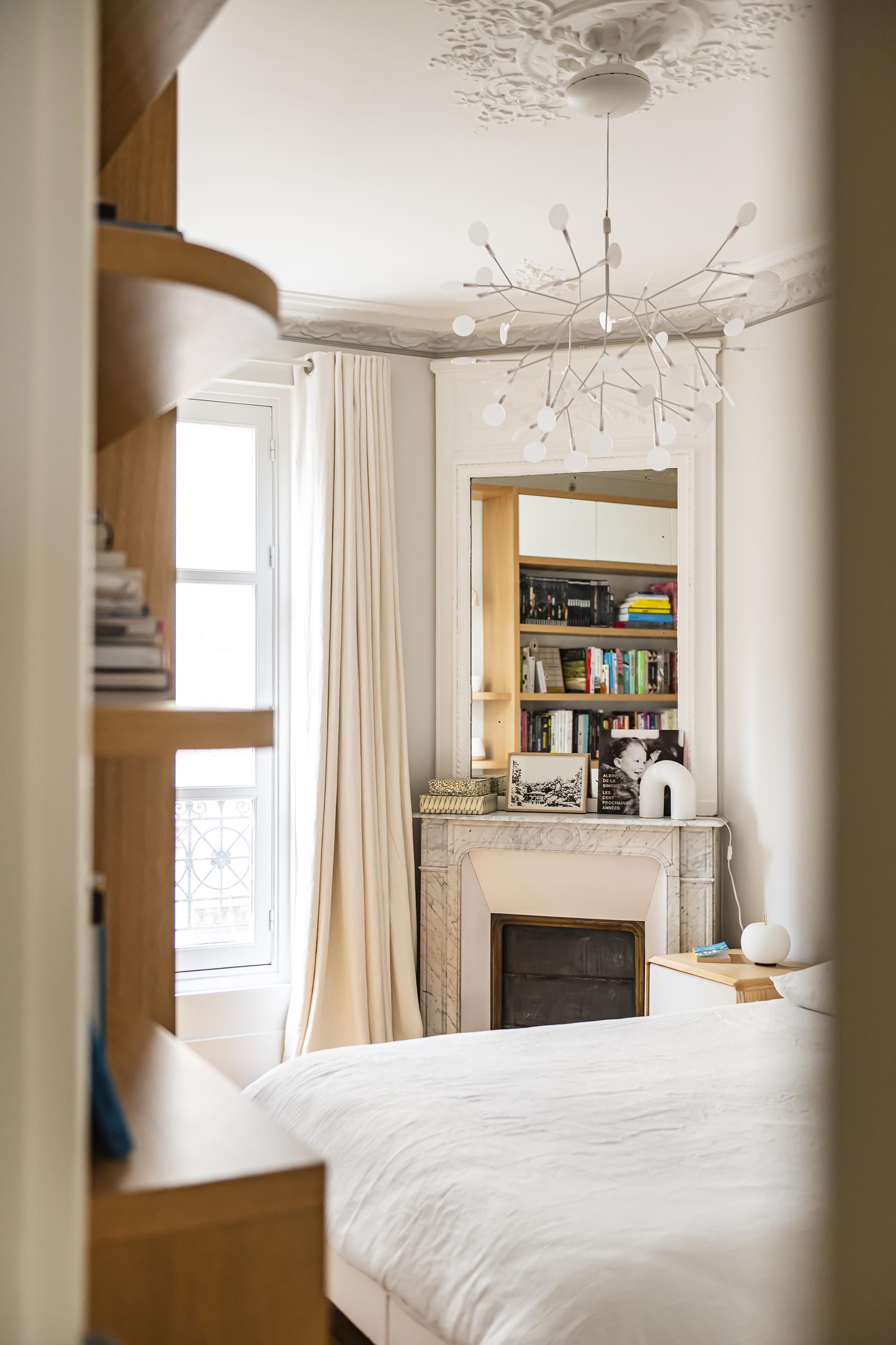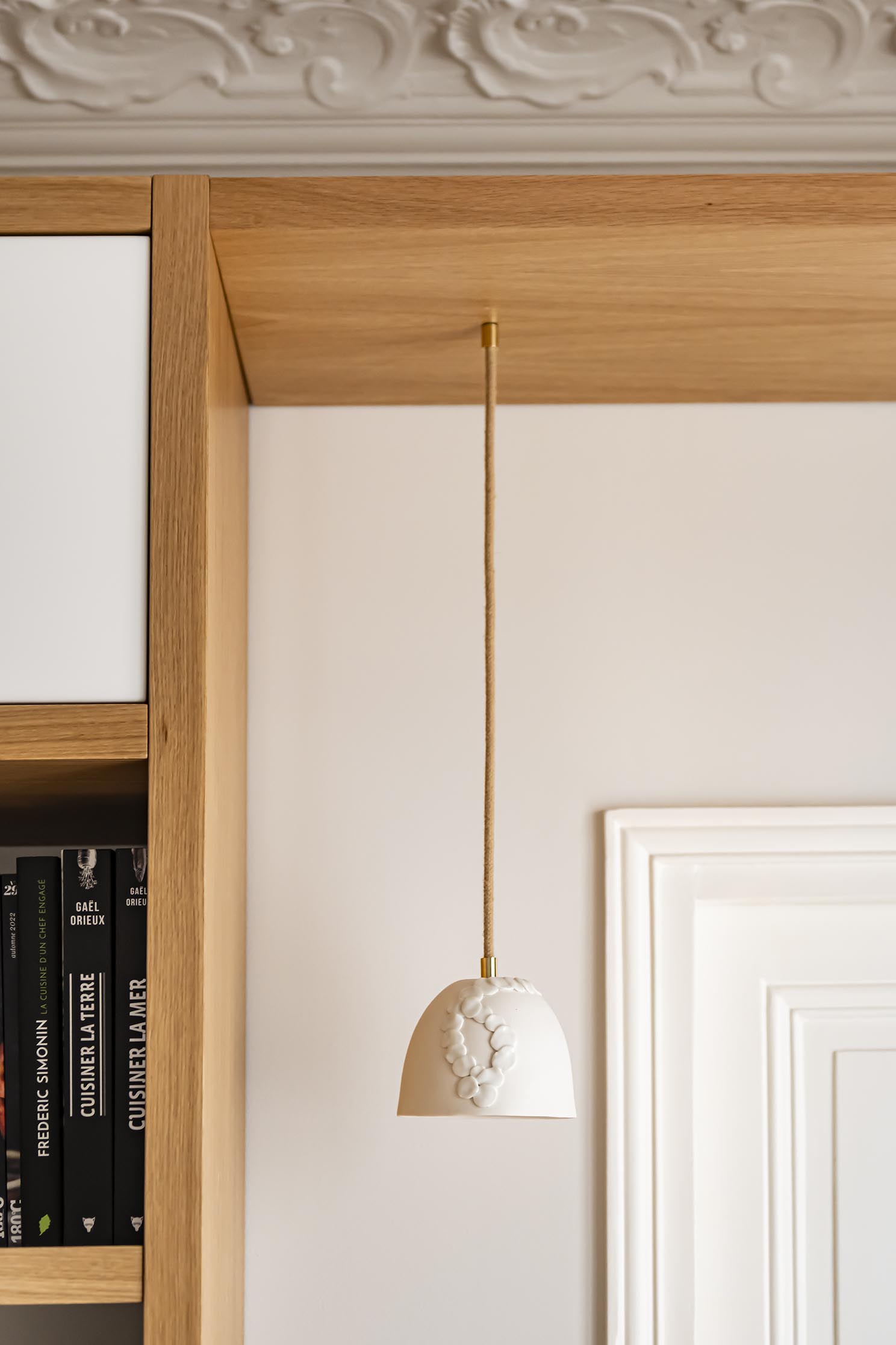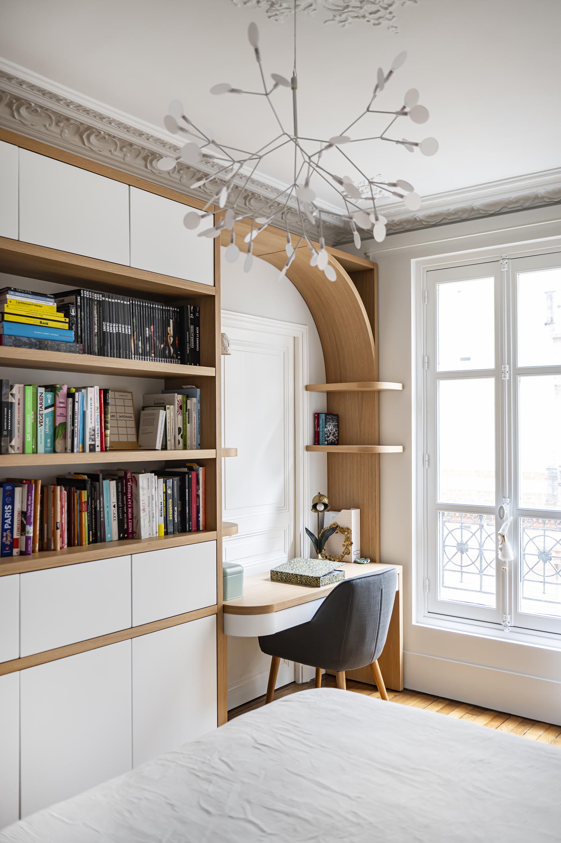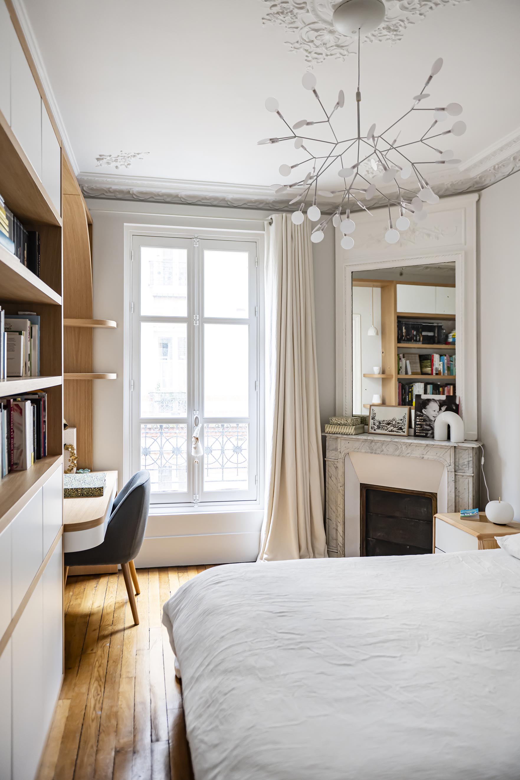 Côté décoration, on a choisi des nuances de blanc avec des touches de chêne et mis l’accent sur le choix des luminaires. Ici aussi, les rangements ont été un point crucial : joli dressing pour Madame avec de jolis détails (patères en guise de poignées et fileurs en bois), un rangement caché en grande partie derrière le dressing avec une petite trappe très discrète dans un ancien passage de porte condamné, et surtout, l’une des pièces maitresses du projet : ce grand linéaire sur-mesure avec 3 fonctions : cache-radiateur, bibliothèque et bureau sous arche. Le bureau se trouve devant la porte qui permet de rendre les 2 chambres communicantes. Cette porte ne sert que pour déménager de gros meubles donc les clients souhaitaient la conserver mais sans pour autant perdre cet espace près de la fenêtre. J’ai proposé d’y placer un bureau amovible qui se glisse simplement sous l’arche, sans que l’on ait besoin de démonter quoique ce soit pour utiliser la porte ; les tablettes arrondies ne dépassent pas sur le passage de porte.