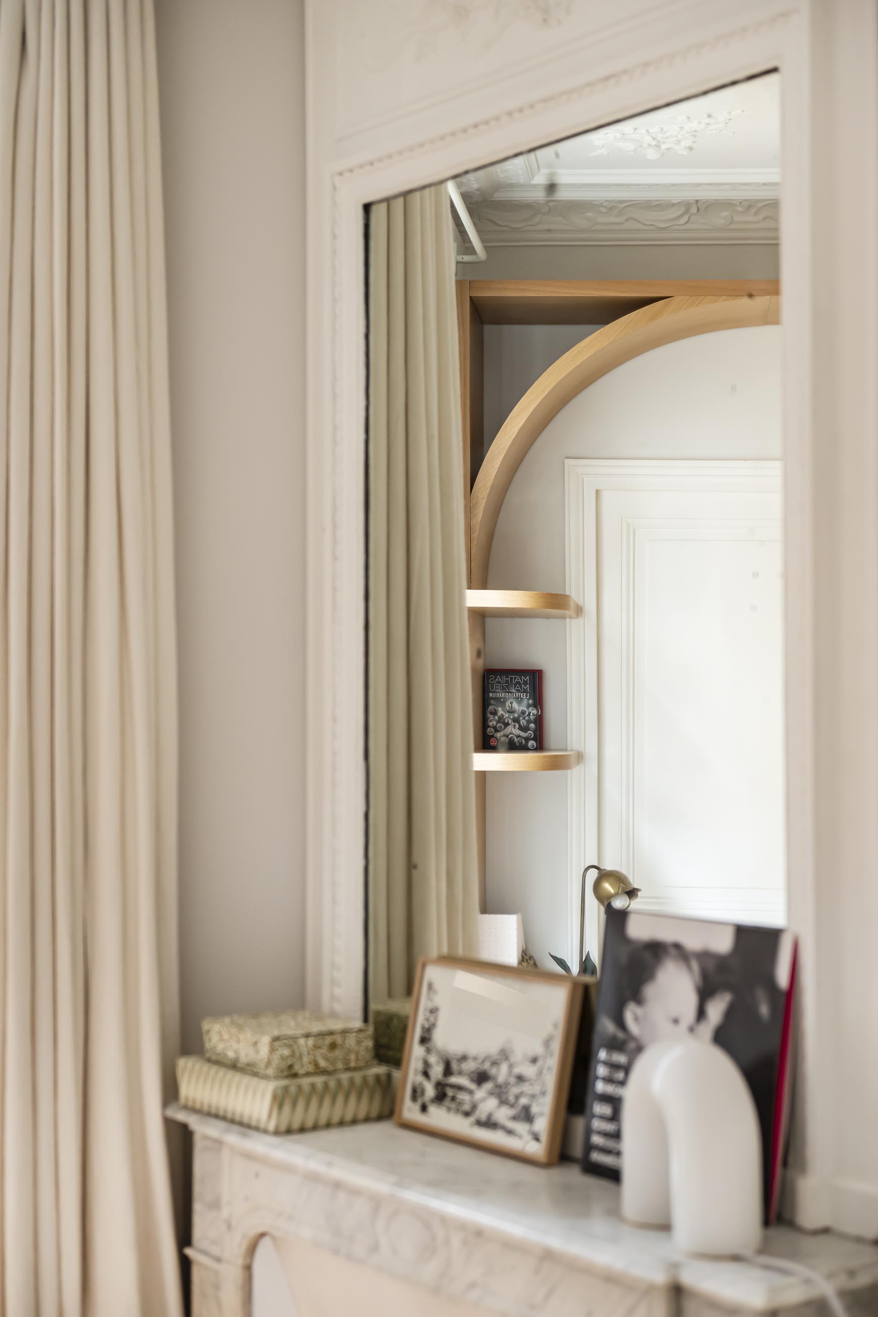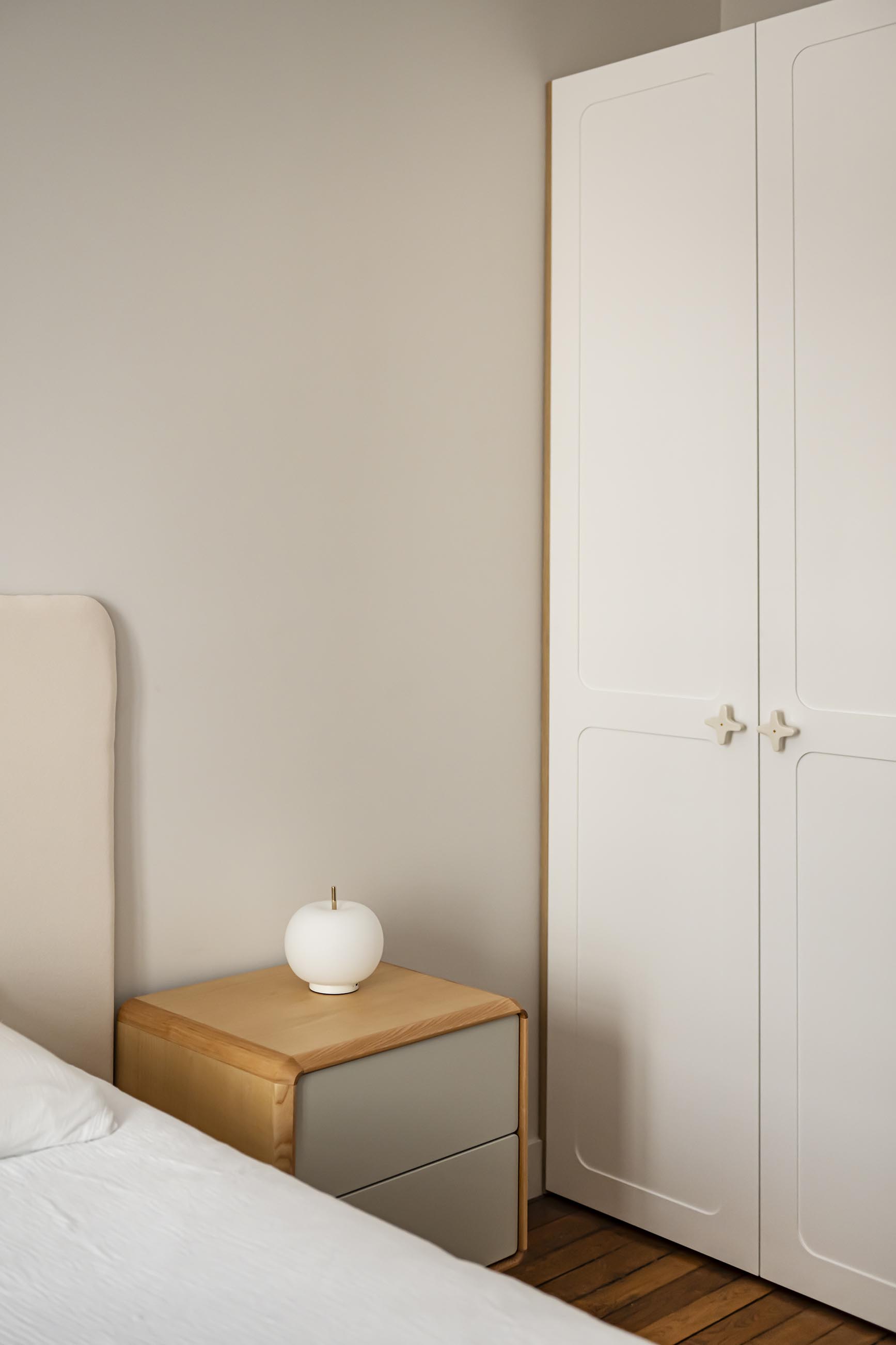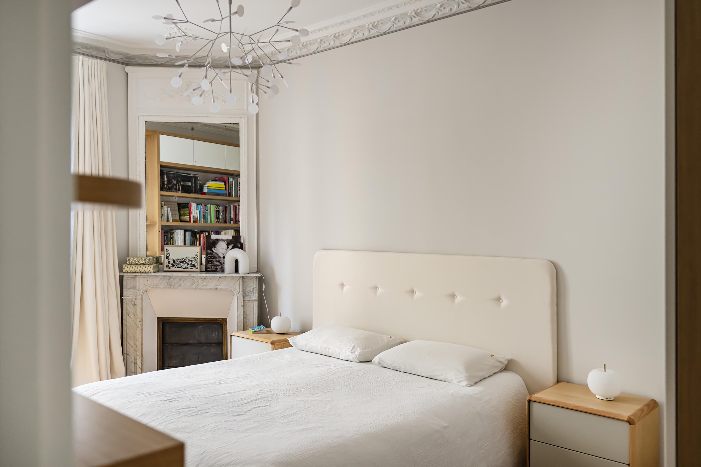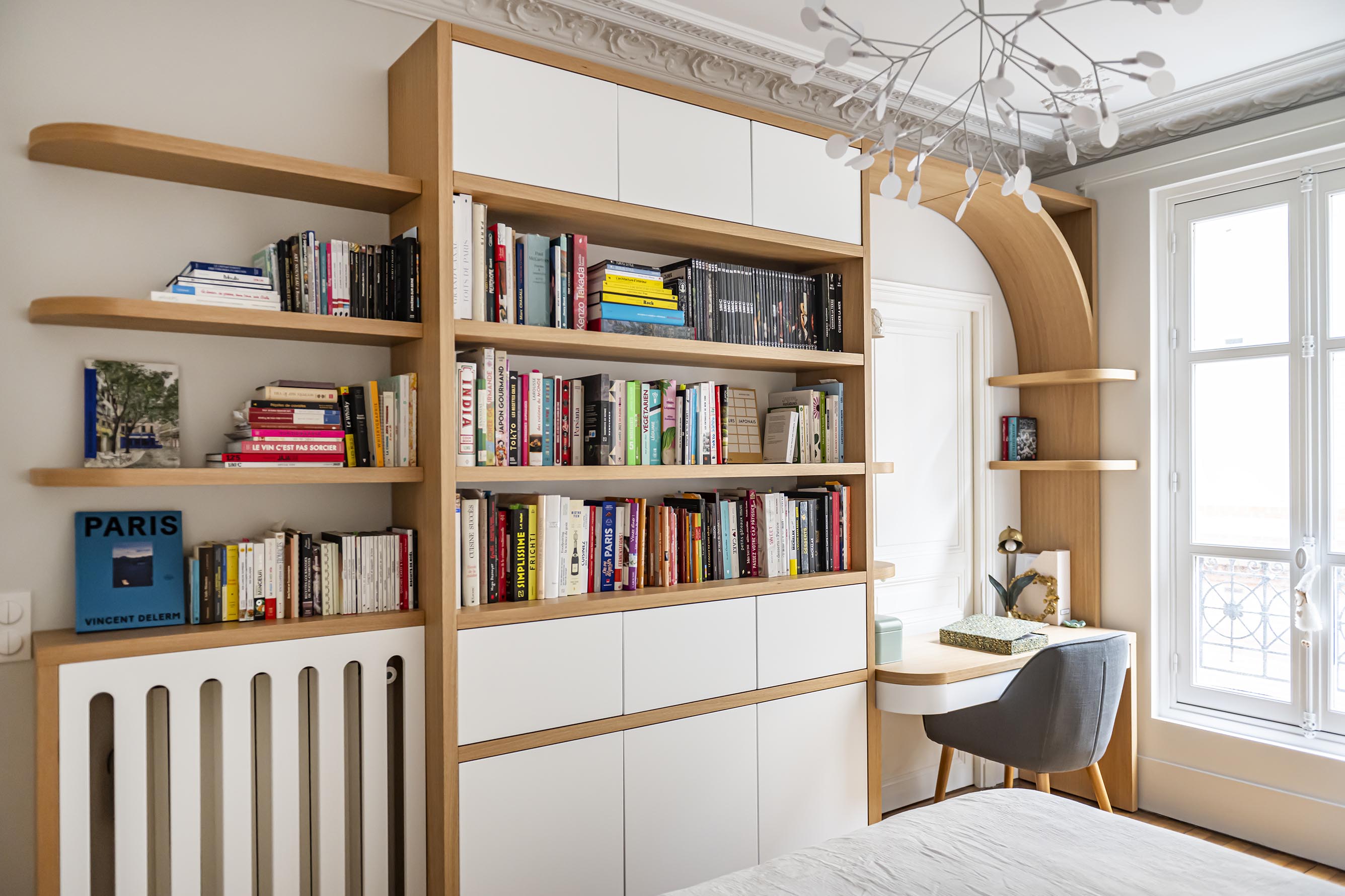 Côté décoration, on a choisi des nuances de blanc avec des touches de chêne et mis l’accent sur le choix des luminaires. Ici aussi, les rangements ont été un point crucial : joli dressing pour Madame avec de jolis détails (patères en guise de poignées et fileurs en bois), un rangement caché en grande partie derrière le dressing avec une petite trappe très discrète dans un ancien passage de porte condamné, et surtout, l’une des pièces maitresses du projet : ce grand linéaire sur-mesure avec 3 fonctions : cache-radiateur, bibliothèque et bureau sous arche. Le bureau se trouve devant la porte qui permet de rendre les 2 chambres communicantes. Cette porte ne sert que pour déménager de gros meubles donc les clients souhaitaient la conserver mais sans pour autant perdre cet espace près de la fenêtre. J’ai proposé d’y placer un bureau amovible qui se glisse simplement sous l’arche, sans que l’on ait besoin de démonter quoique ce soit pour utiliser la porte ; les tablettes arrondies ne dépassent pas sur le passage de porte.