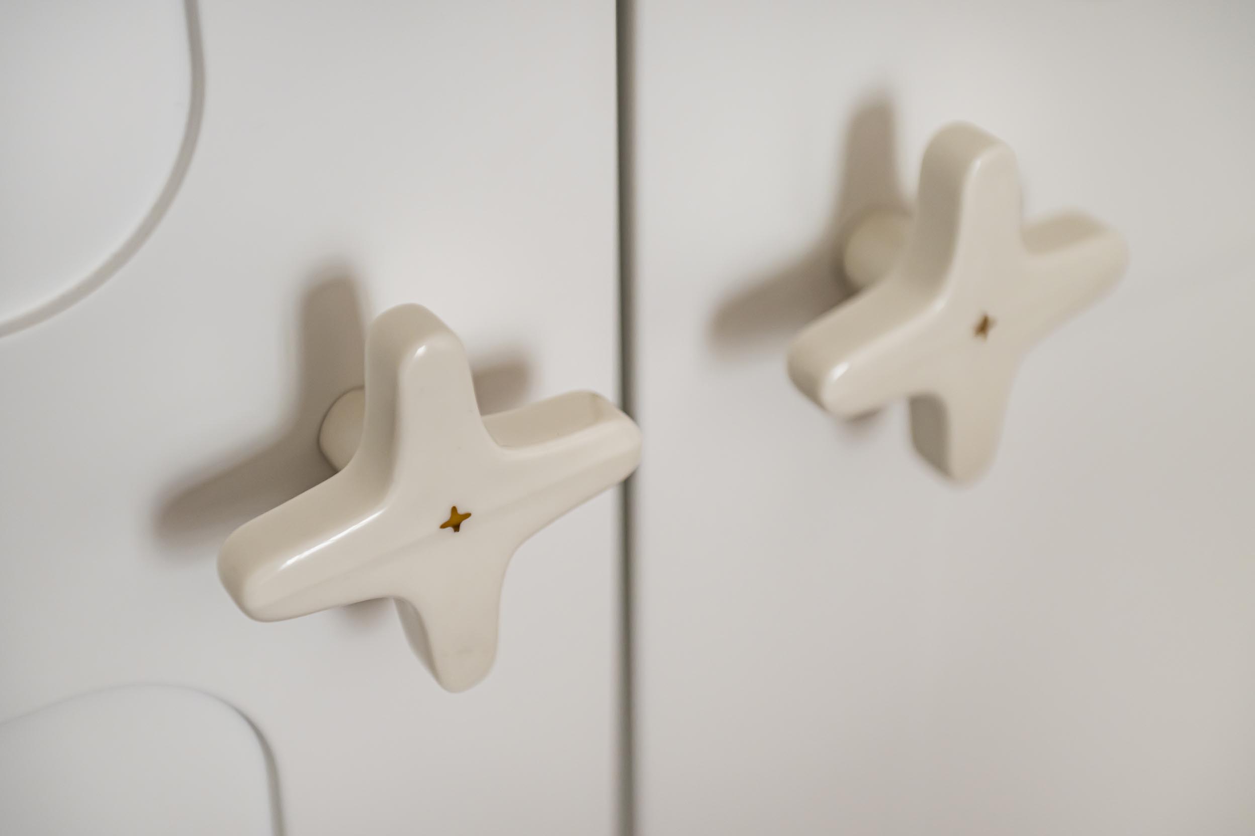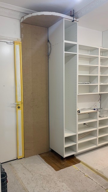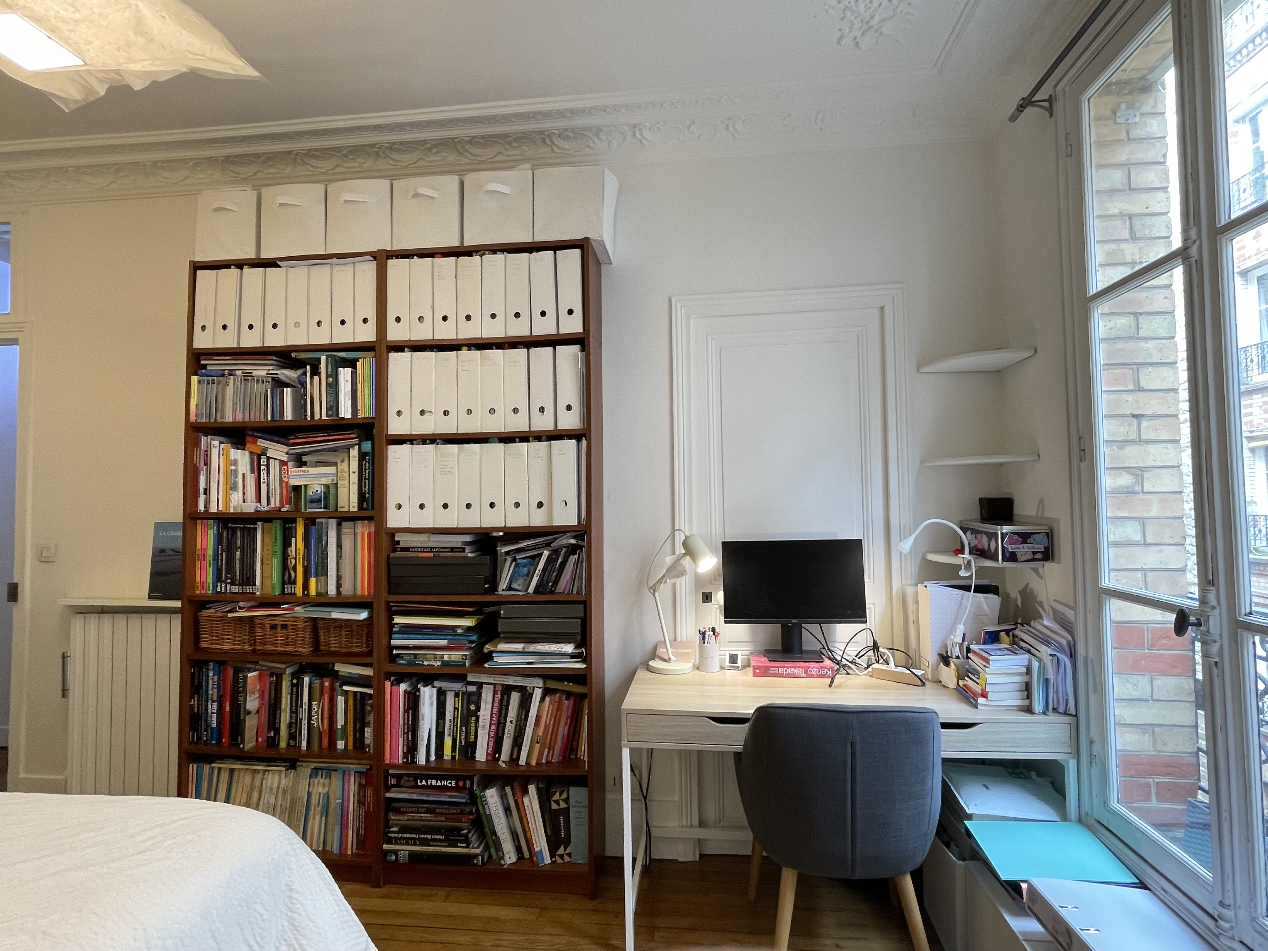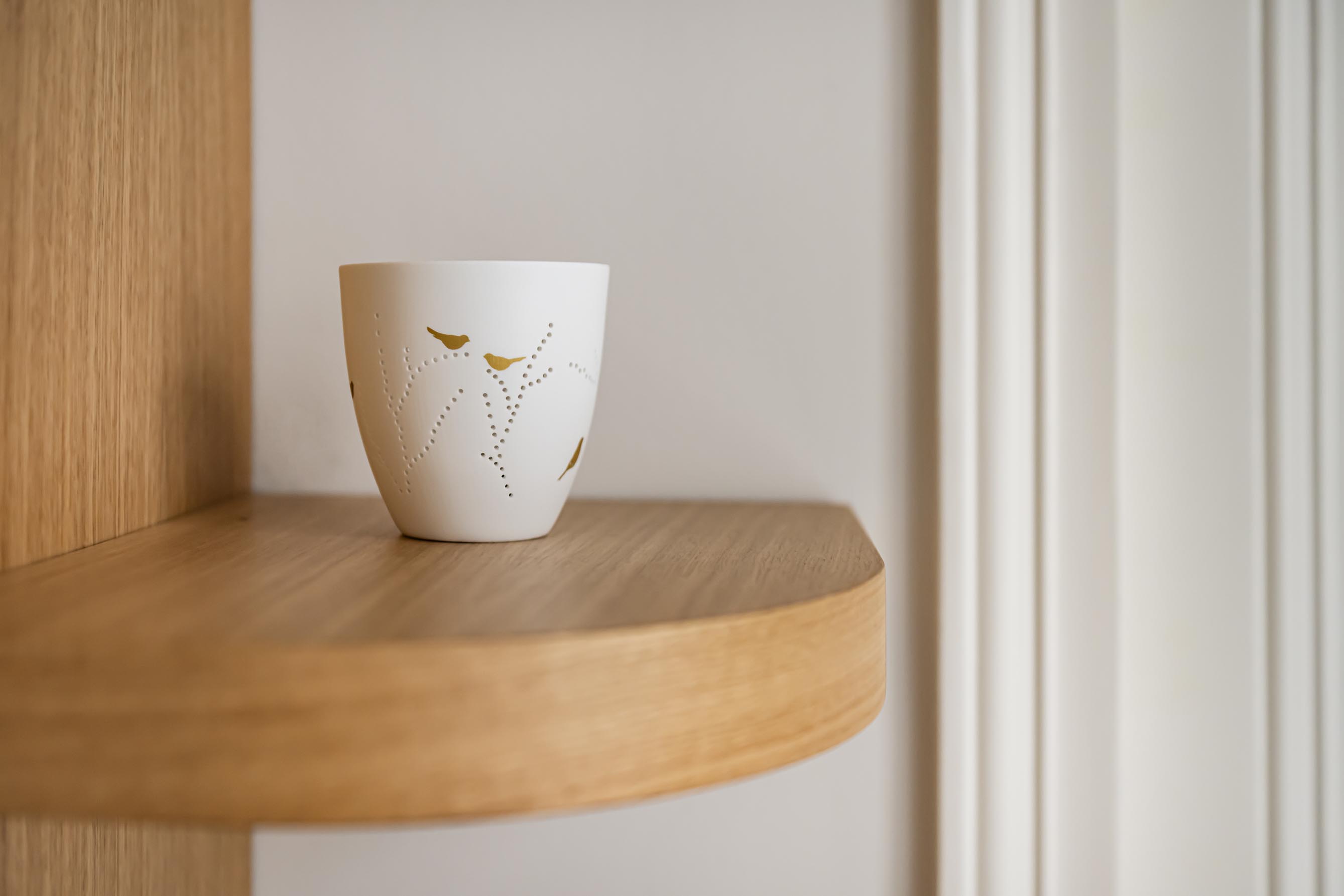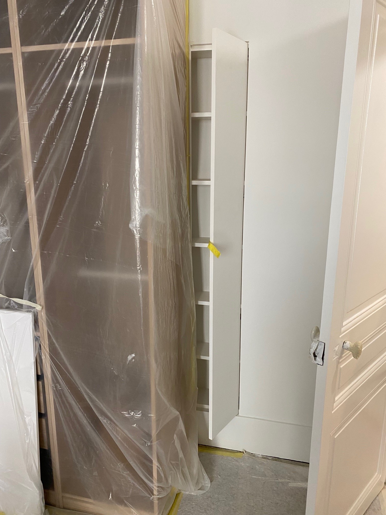 Côté décoration, on a choisi des nuances de blanc avec des touches de chêne et mis l’accent sur le choix des luminaires. Ici aussi, les rangements ont été un point crucial : joli dressing pour Madame avec de jolis détails (patères en guise de poignées et fileurs en bois), un rangement caché en grande partie derrière le dressing avec une petite trappe très discrète dans un ancien passage de porte condamné, et surtout, l’une des pièces maitresses du projet : ce grand linéaire sur-mesure avec 3 fonctions : cache-radiateur, bibliothèque et bureau sous arche. Le bureau se trouve devant la porte qui permet de rendre les 2 chambres communicantes. Cette porte ne sert que pour déménager de gros meubles donc les clients souhaitaient la conserver mais sans pour autant perdre cet espace près de la fenêtre. J’ai proposé d’y placer un bureau amovible qui se glisse simplement sous l’arche, sans que l’on ait besoin de démonter quoique ce soit pour utiliser la porte ; les tablettes arrondies ne dépassent pas sur le passage de porte.