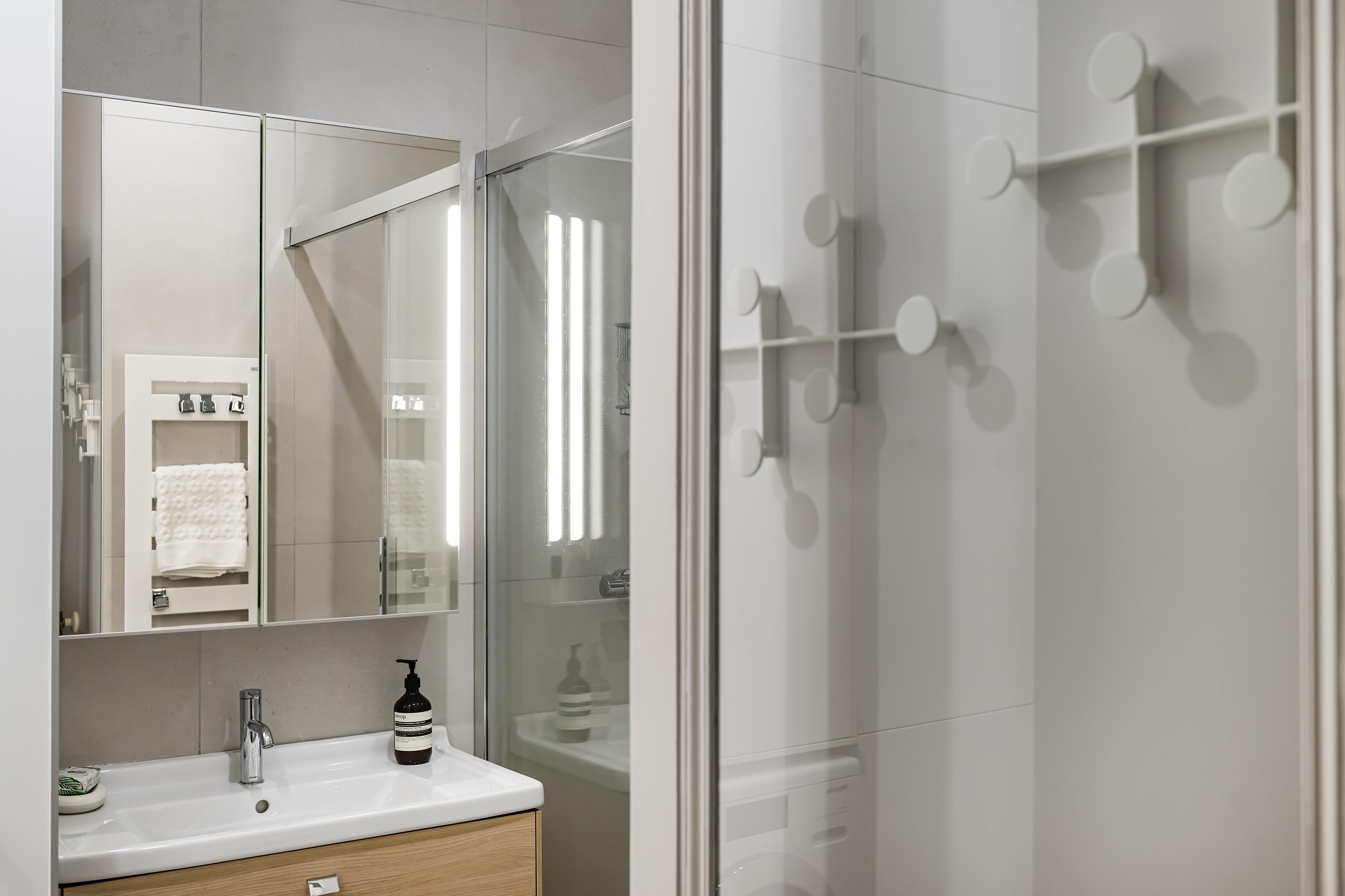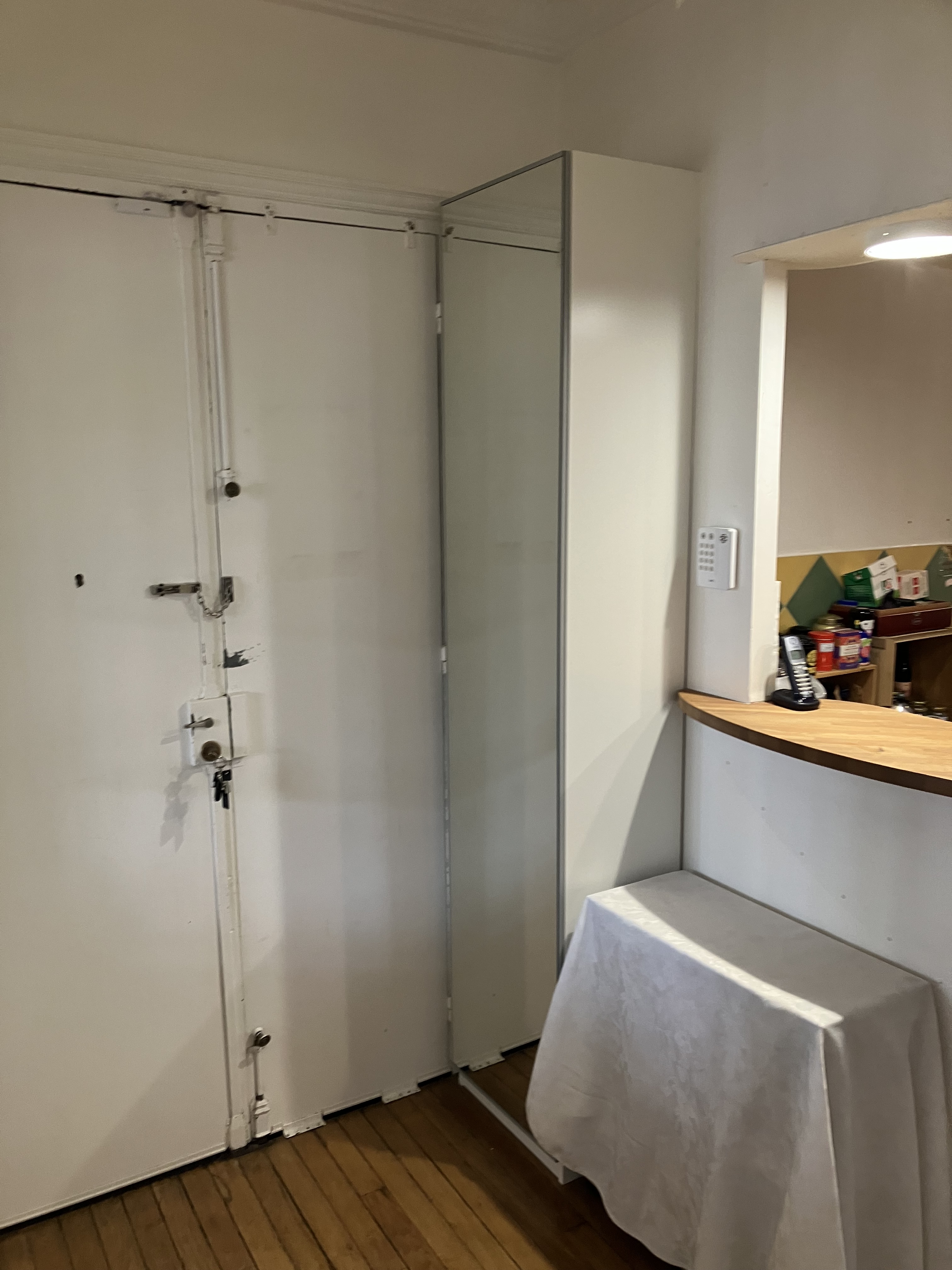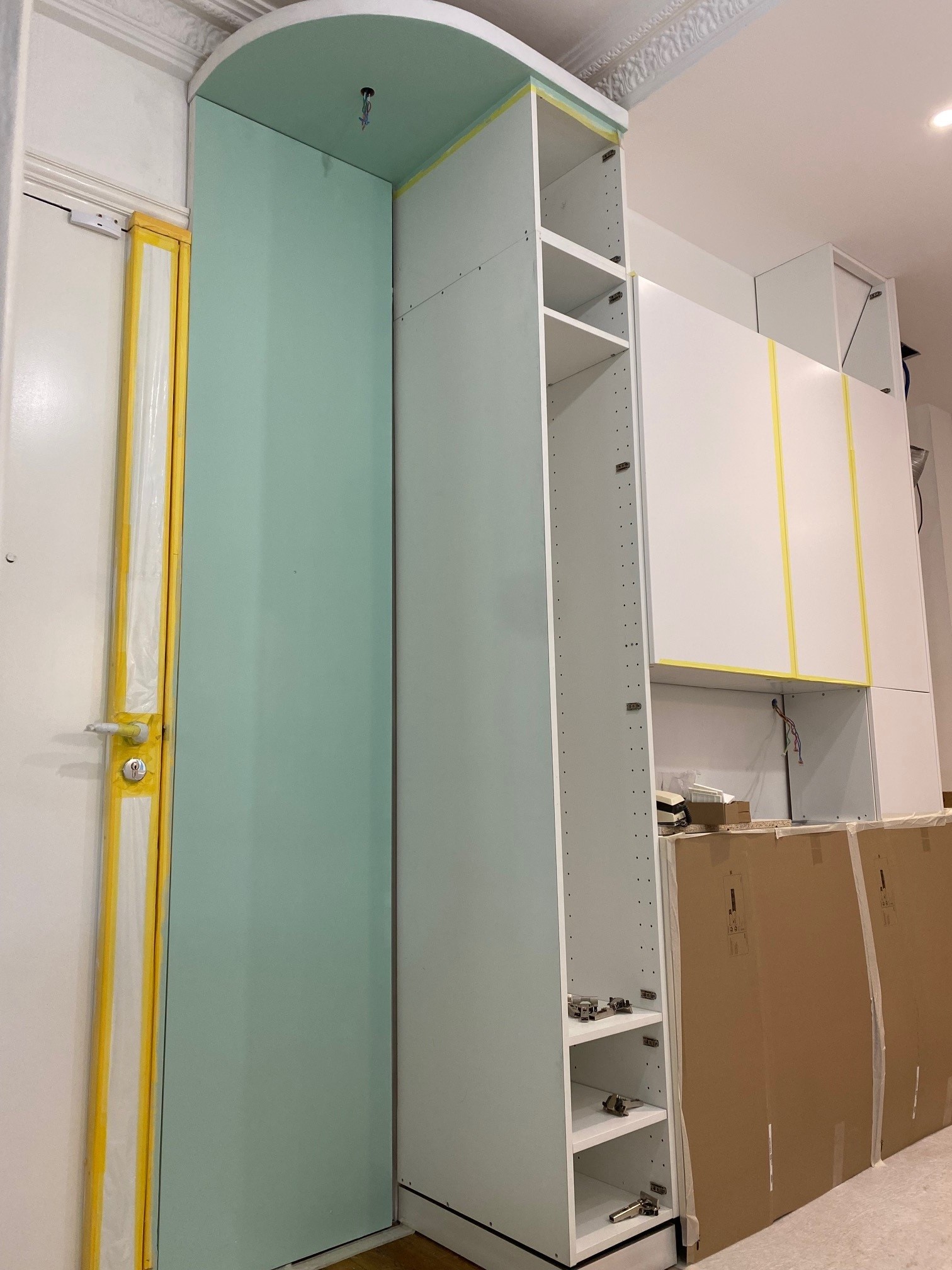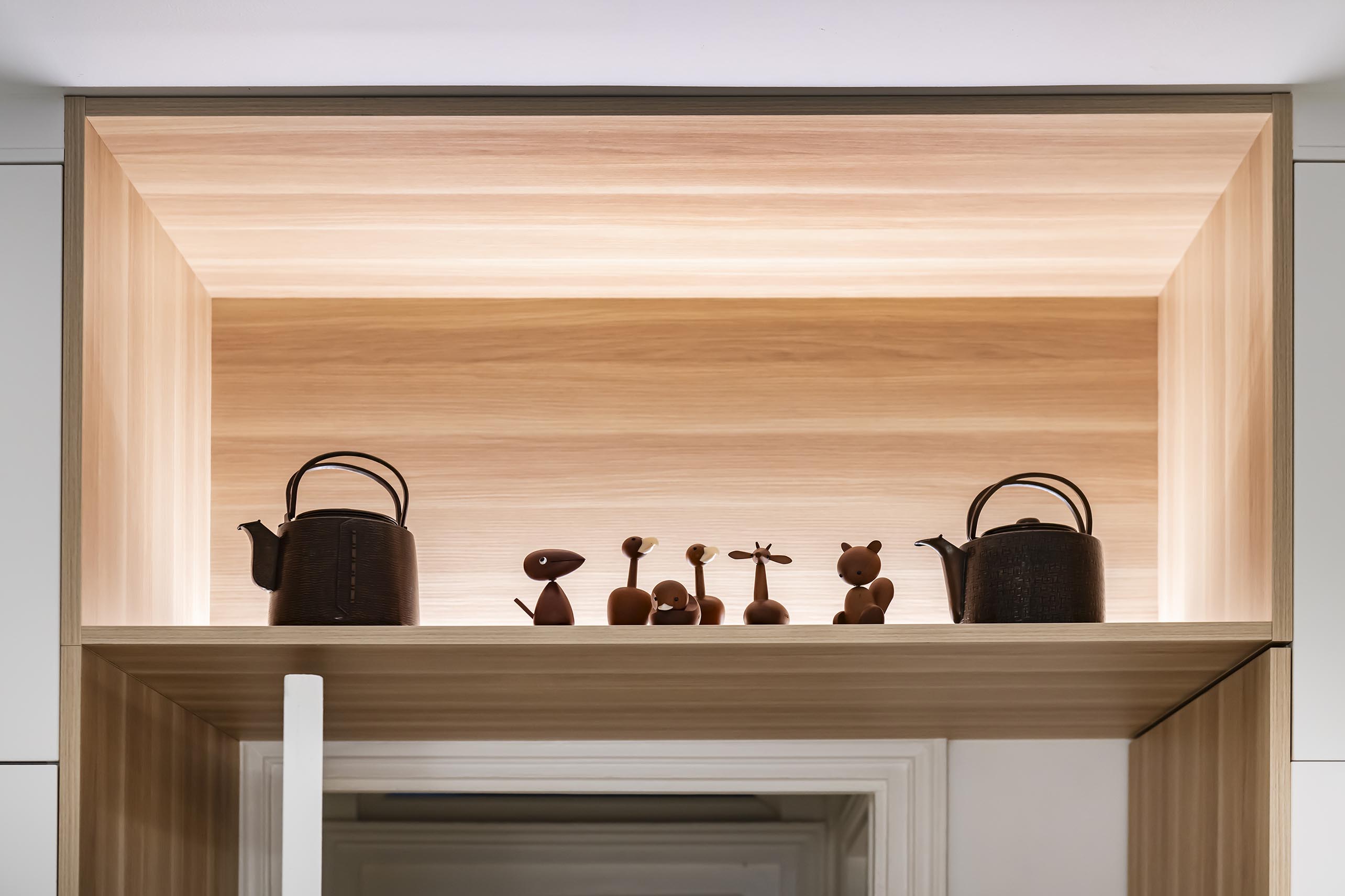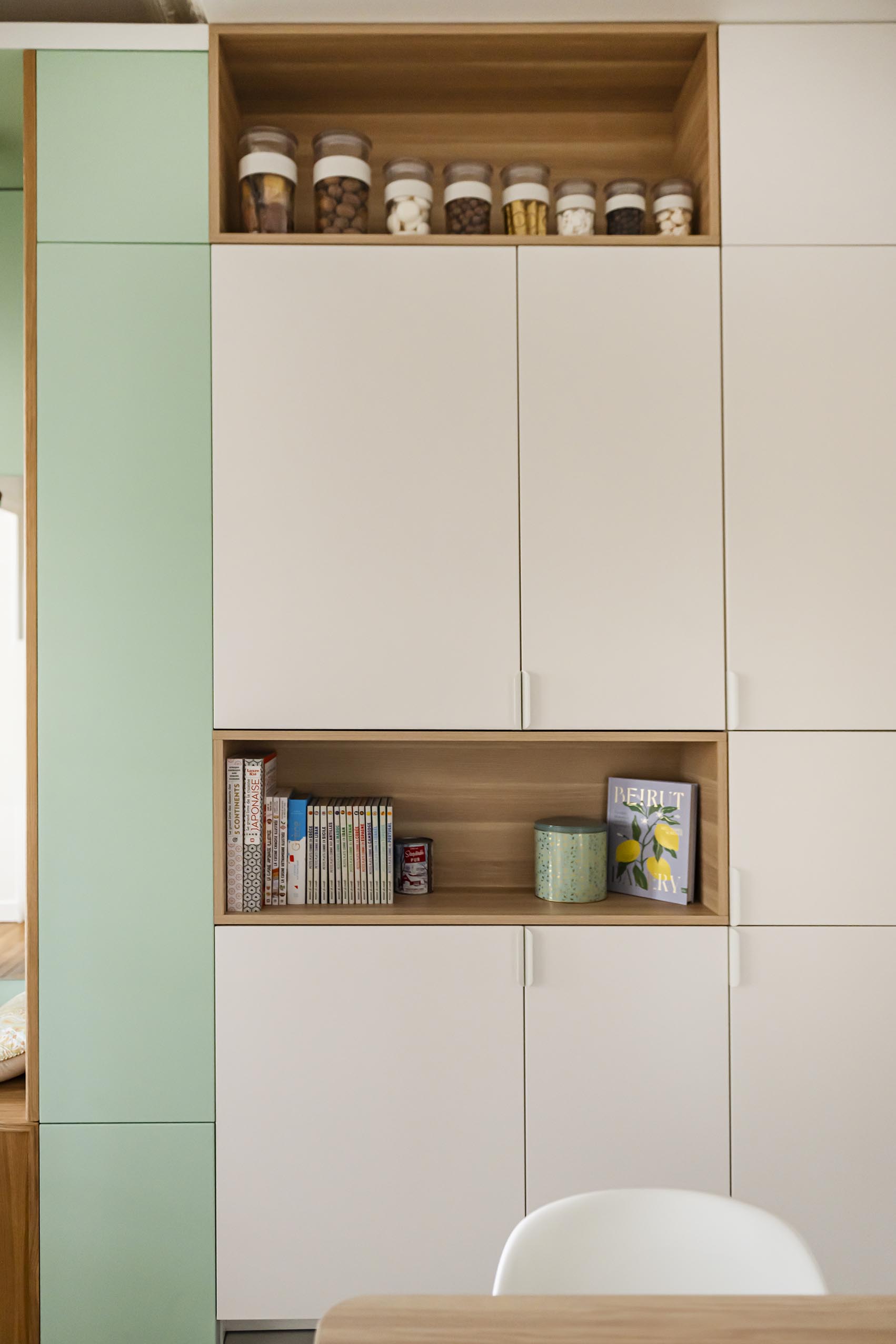 La solution côté porte d’entrée : une penderie fixe étroite pour manteaux et chaussures avec une casquette en partie haute pour ne pas toucher aux moulures et intégrer un spot, un bardage en chêne cannelé avec quelques patères avec une triple fonction esthétique, pratique et technique (pour cacher les alimentations électriques), une petite banquette arrondie avec rangement supplémentaire, et au-dessus de cette dernière, un panneau amovible (accueillant un joli miroir) pour permettre d’ouvrir le second battant de manière très occasionnelle. Afin de délimiter l’entrée visuellement, ce meuble est essentiellement vert, et contraste avec les tonalités blanches du reste du projet. Ce meuble est compact mais a finalement été un véritable petit casse-tête pour prendre en compte les nombreuses contraintes.