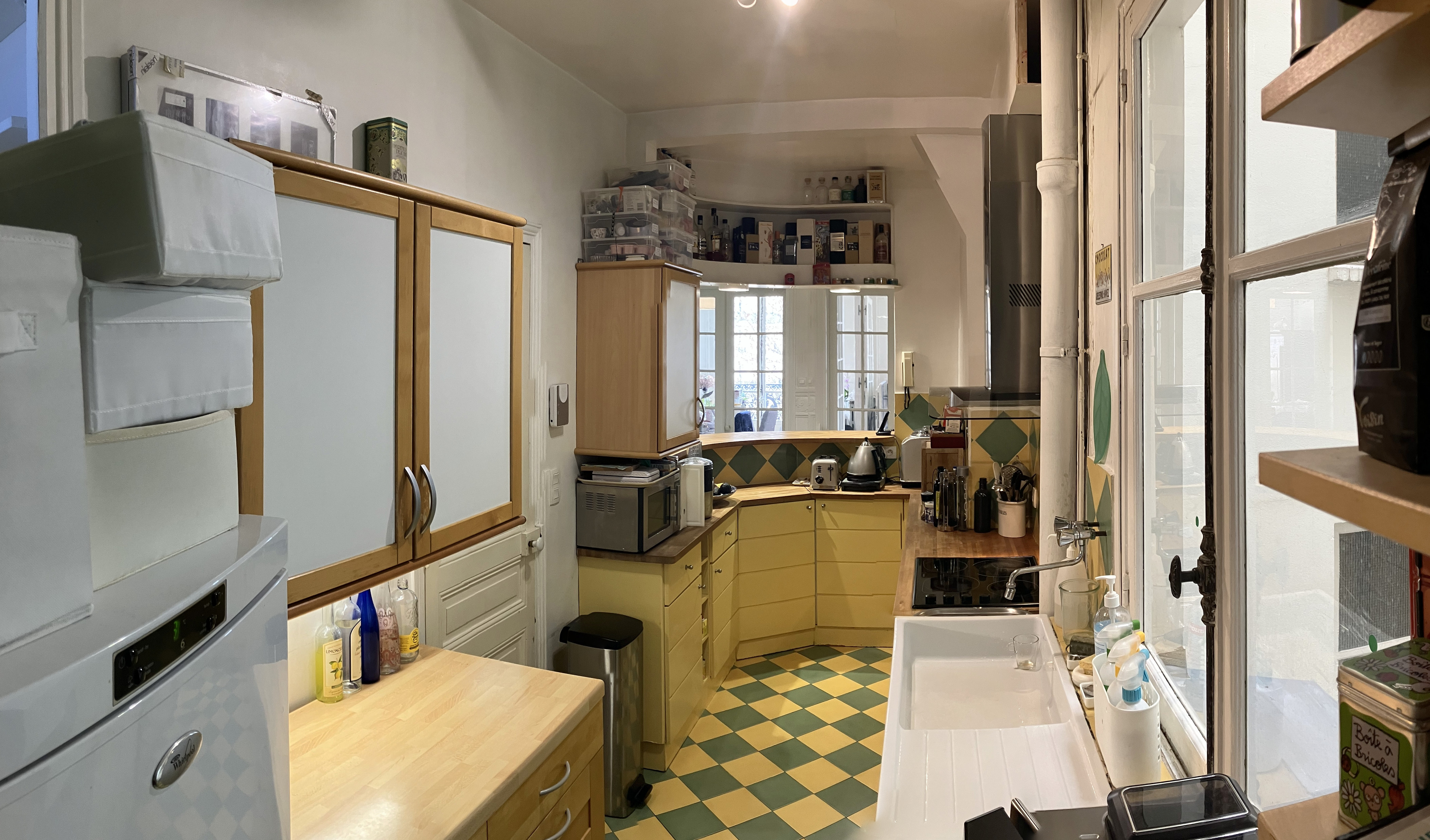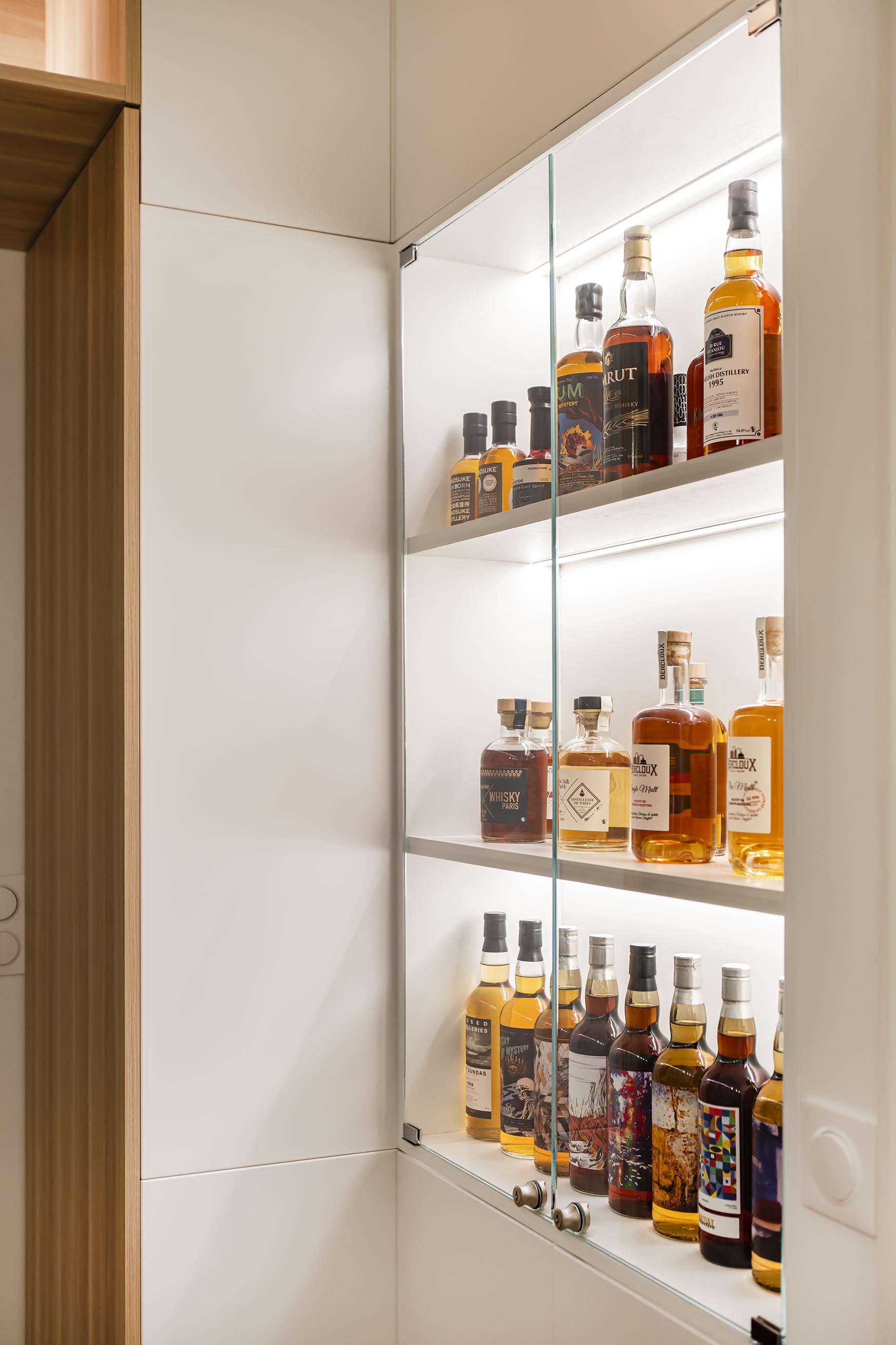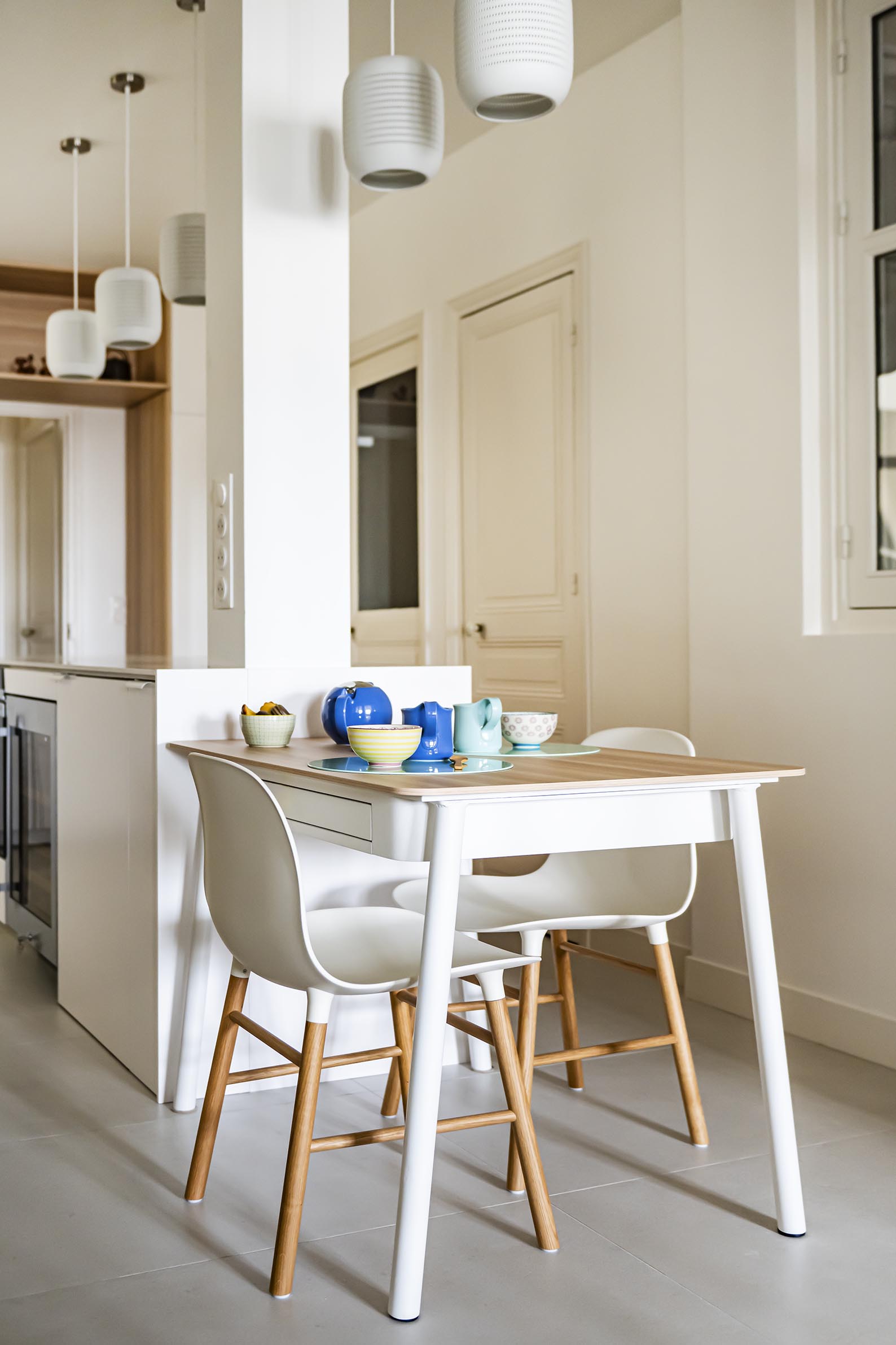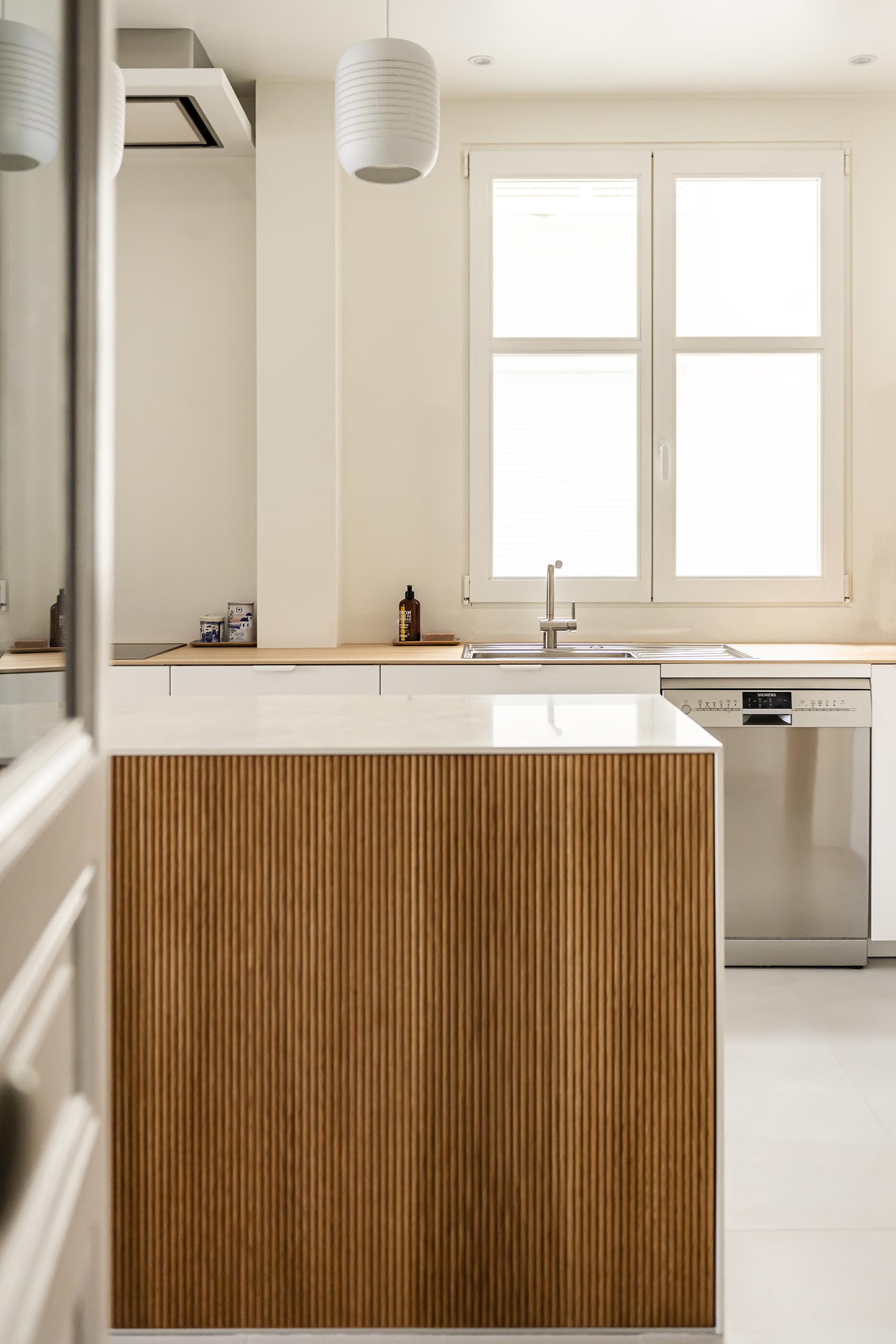 La cuisine avait grand besoin de rénovation et a été totalement ouverte sur l’entrée et l’ancien couloir, modulo le poteau porteur que nous avons dû conserver. Les clients ont dit adieu aux carrelages colorés et à ce bar esprit paquebot, sans aucun regret. Place à l’espace, la lumière, aux teintes claires et sobres et à la fonctionnalité. On se trouve désormais dans une véritable cuisine familiale ultra conviviale avec cet îlot central recouvert de céramique et de bois cannelé, une optimisation totale des rangements et même une bibliothèque / vitrine pour mettre en valeur la collection de bonnes bouteilles de Whisky. On retrouve du mobilier sur-mesure ici avec la table repas que j’ai dessinée spécialement pour le projet afin qu’elle soit parfaitement alignée avec l’îlot et conçue avec le même matériau que le plan de travail du reste de la cuisine (compact). Sous l’arche avec la niche vers les chambres, le panneau de droite dissimule même une penderie avec étagères.