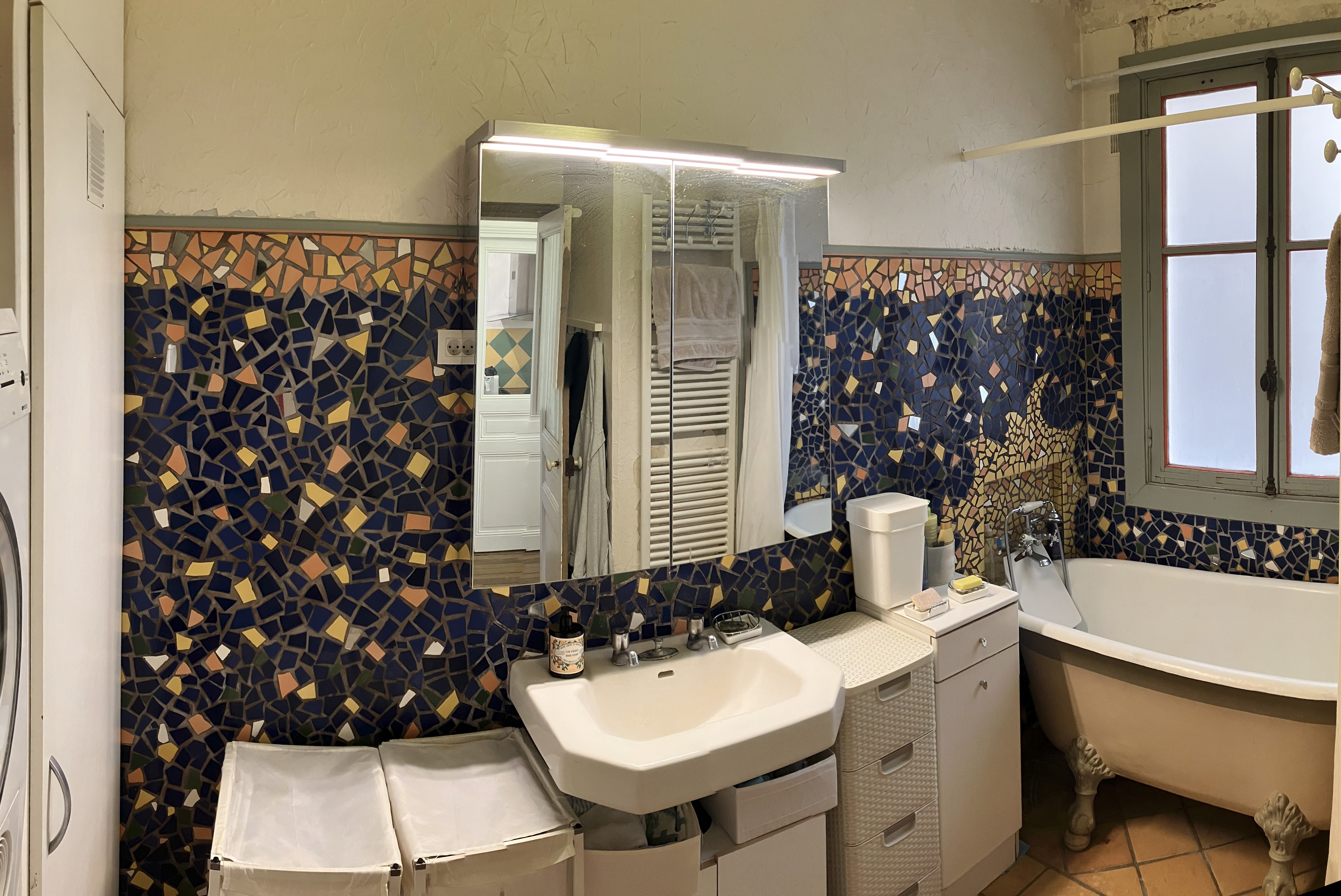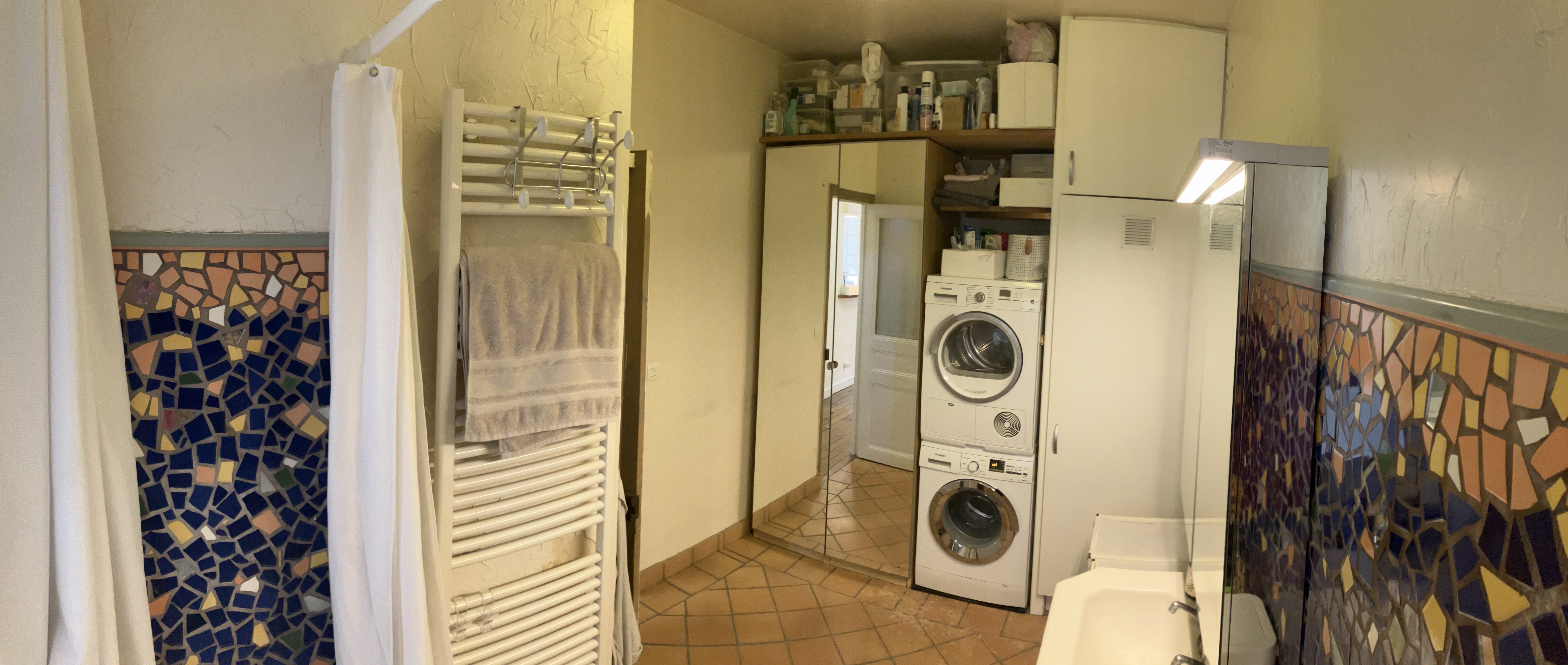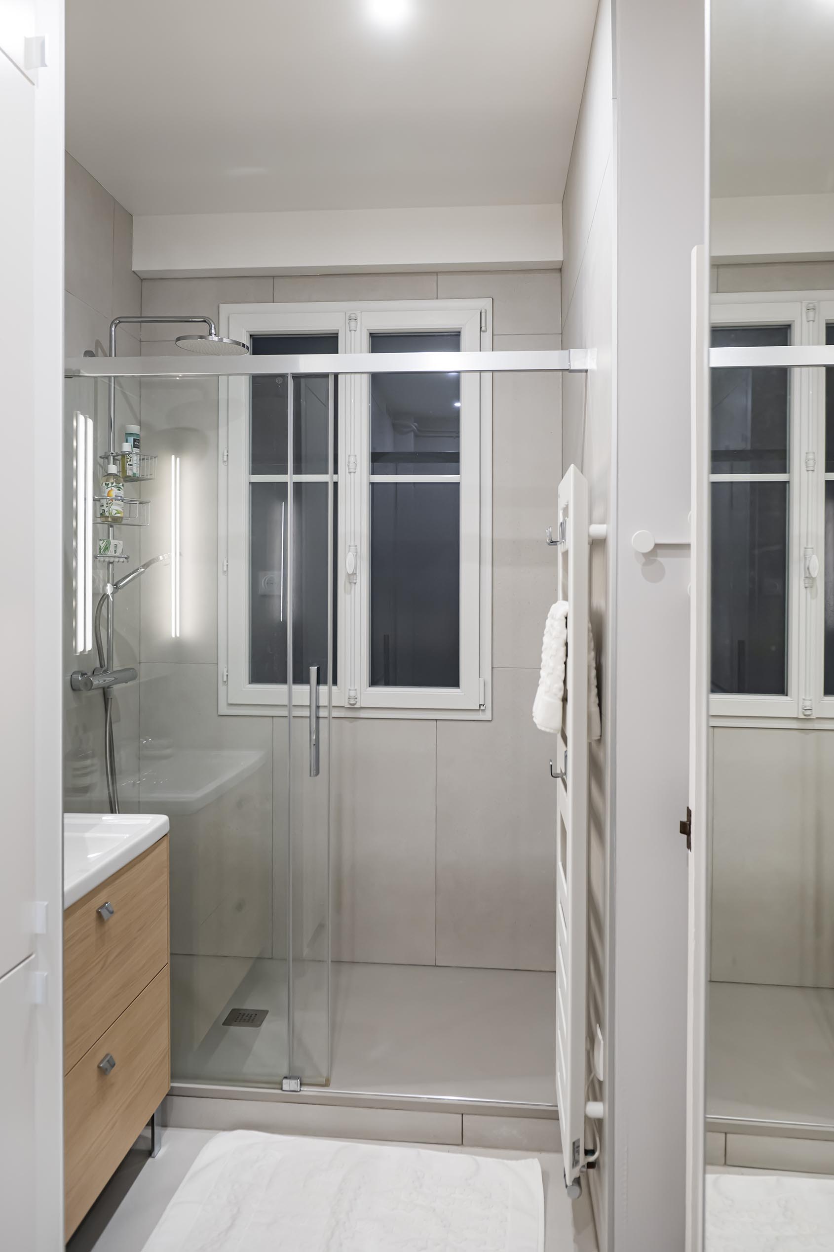 On termine par la salle de bain qui a elle aussi connu une vraie révolution. La pièce est grande et permet d’accueillir une grande douche, un meuble vasque ainsi qu’un véritable coin dressing (pour Monsieur) avec des portes miroir et buanderie en face. La porte en partie centrale dessert le côté rangements à gauche et salle d’eau à droite. Nous avons ici également doublé le mur vers l’extérieur pour l’isolation thermique et changé la fenêtre pour du PVC cette fois, comme elle se situe dans la douche, refait un faux plafond et même tourné la chaudière d’un quart de tour pour l’intégrer complètement dans un placard.