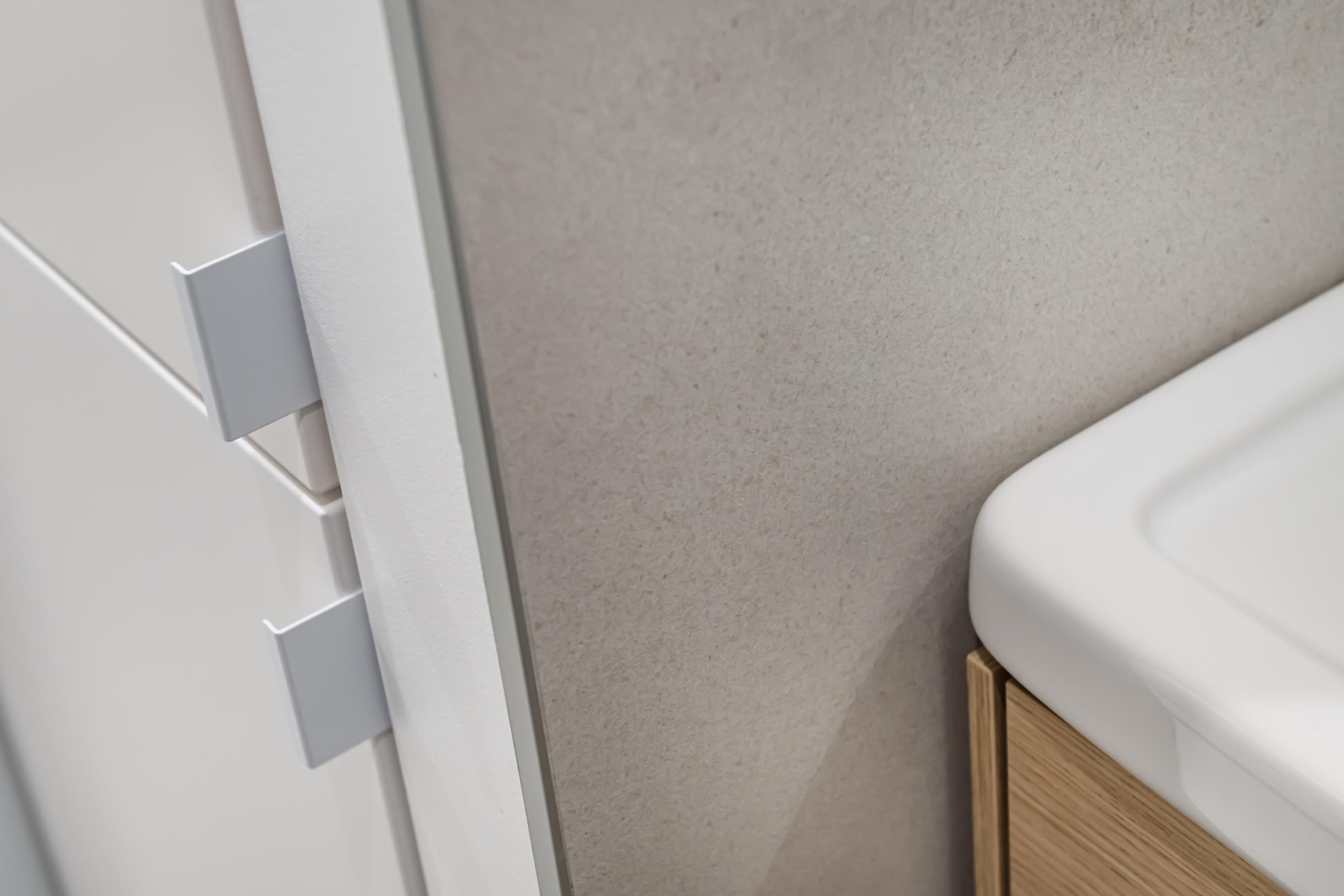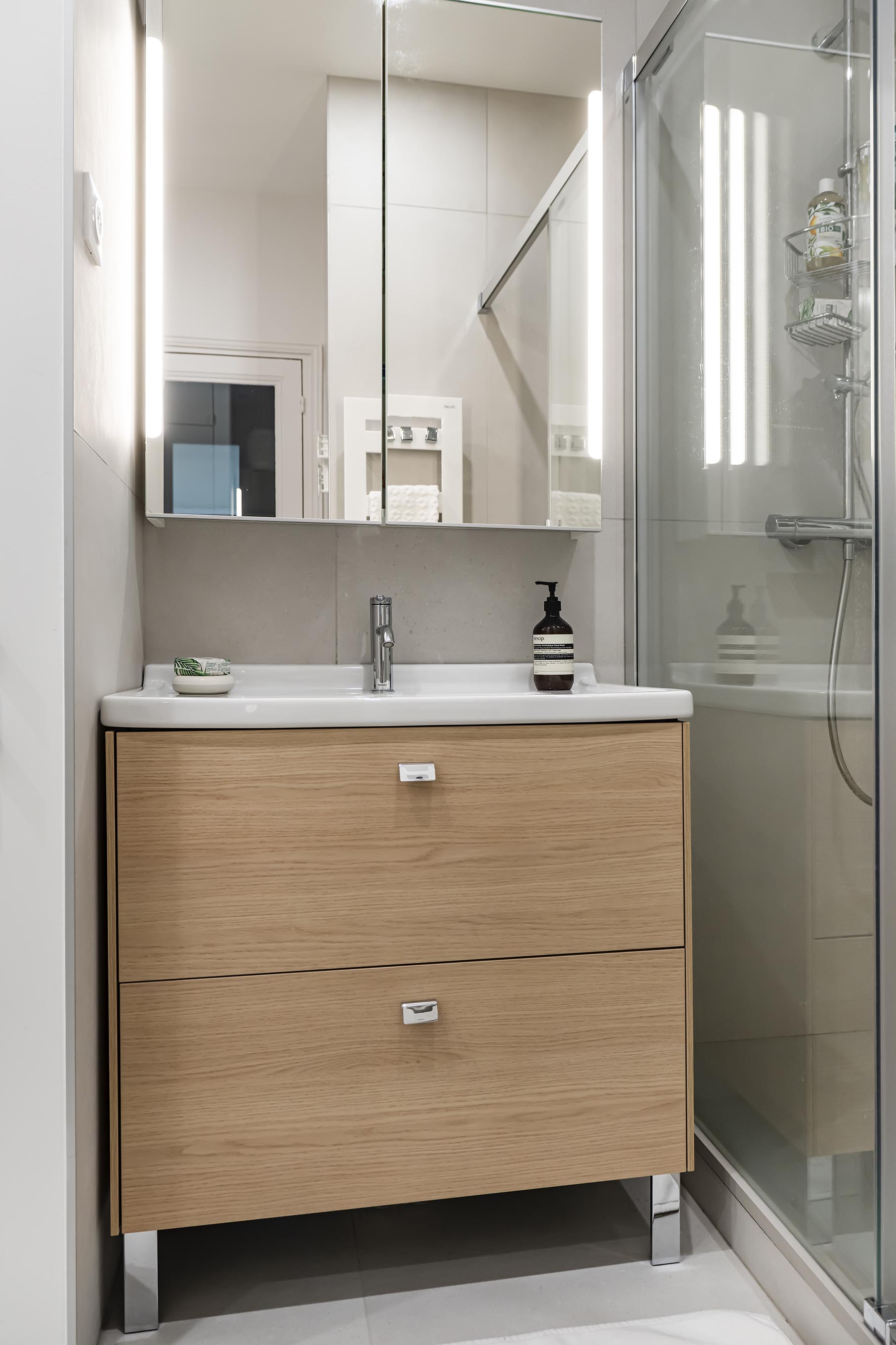 Côté décoration, la sobriété est de mise, comme dans l’ensemble du projet avec une cohérence de carrelage (même référence que le sol de la cuisine) et toujours cette base de blanc cassé et touches de bois. Des lignes et teintes simples, épurées et intemporelles.