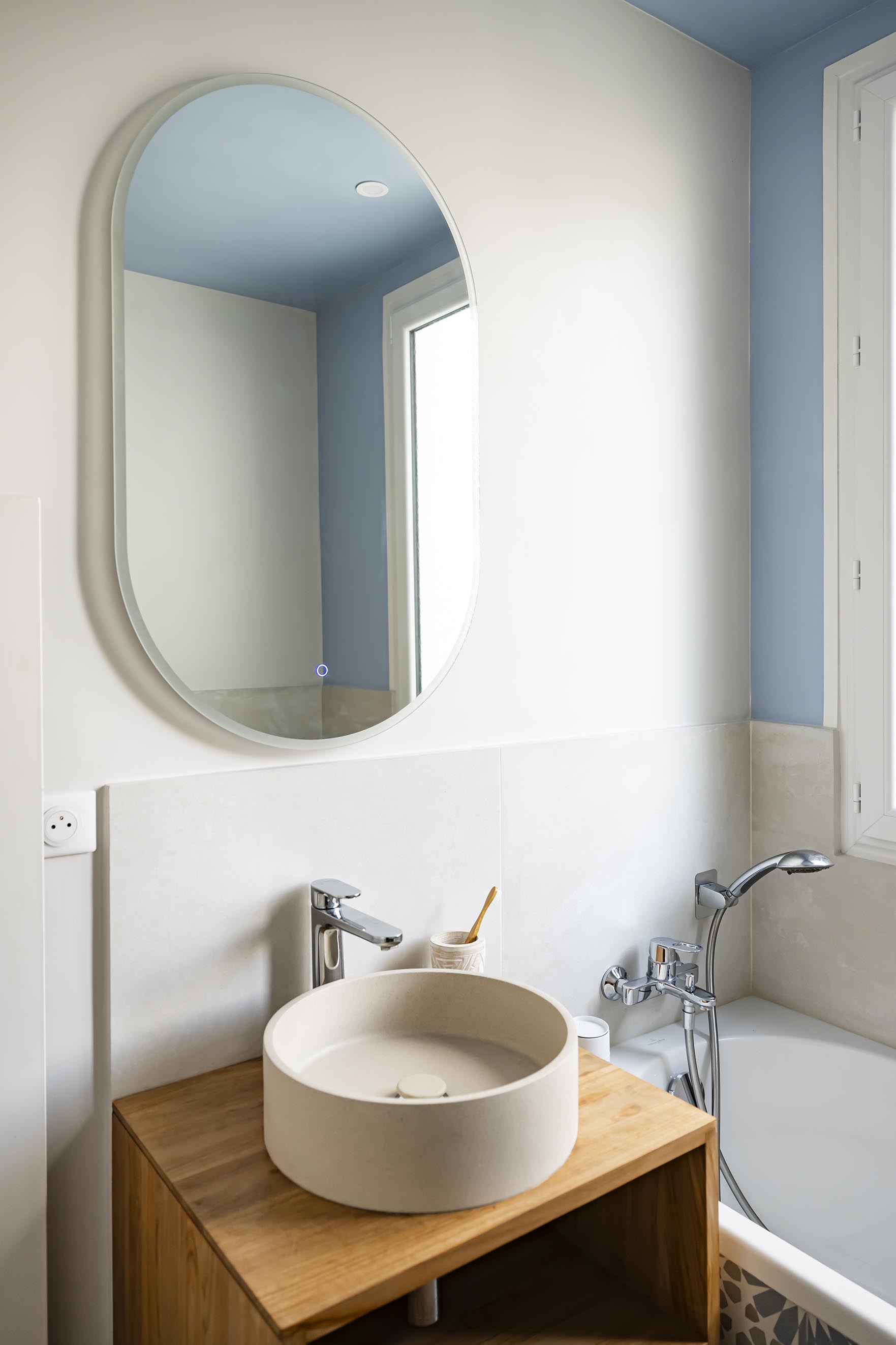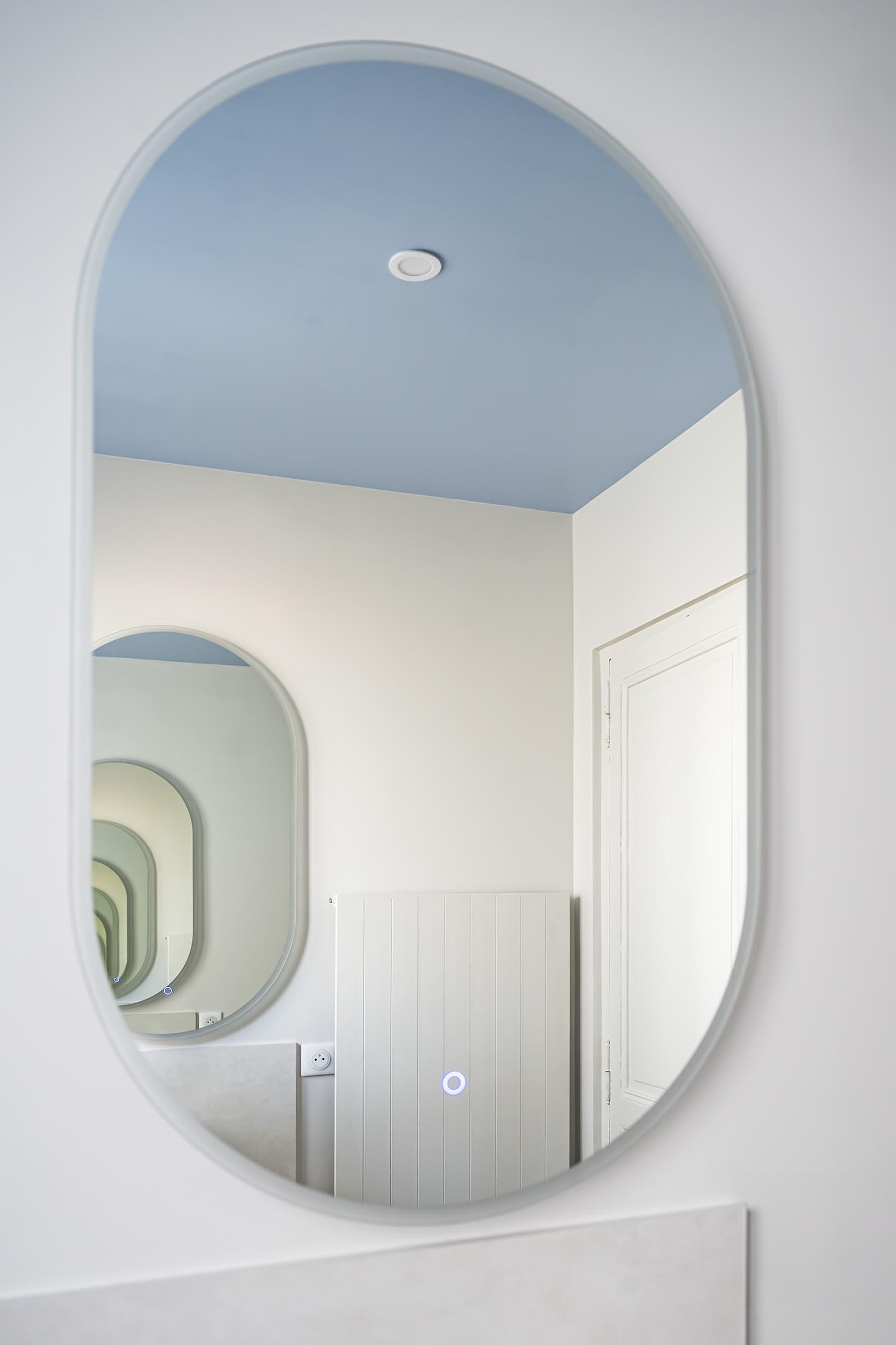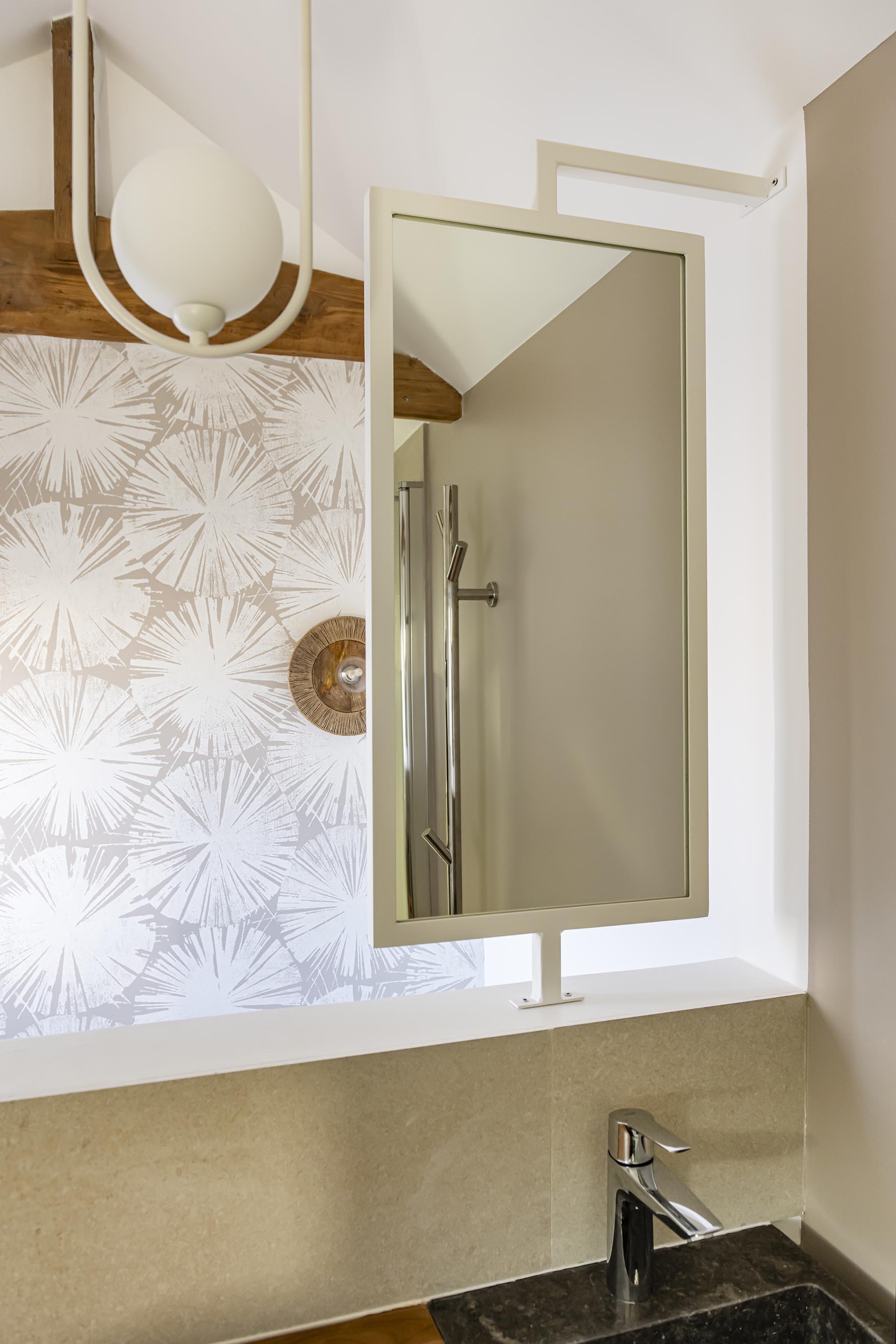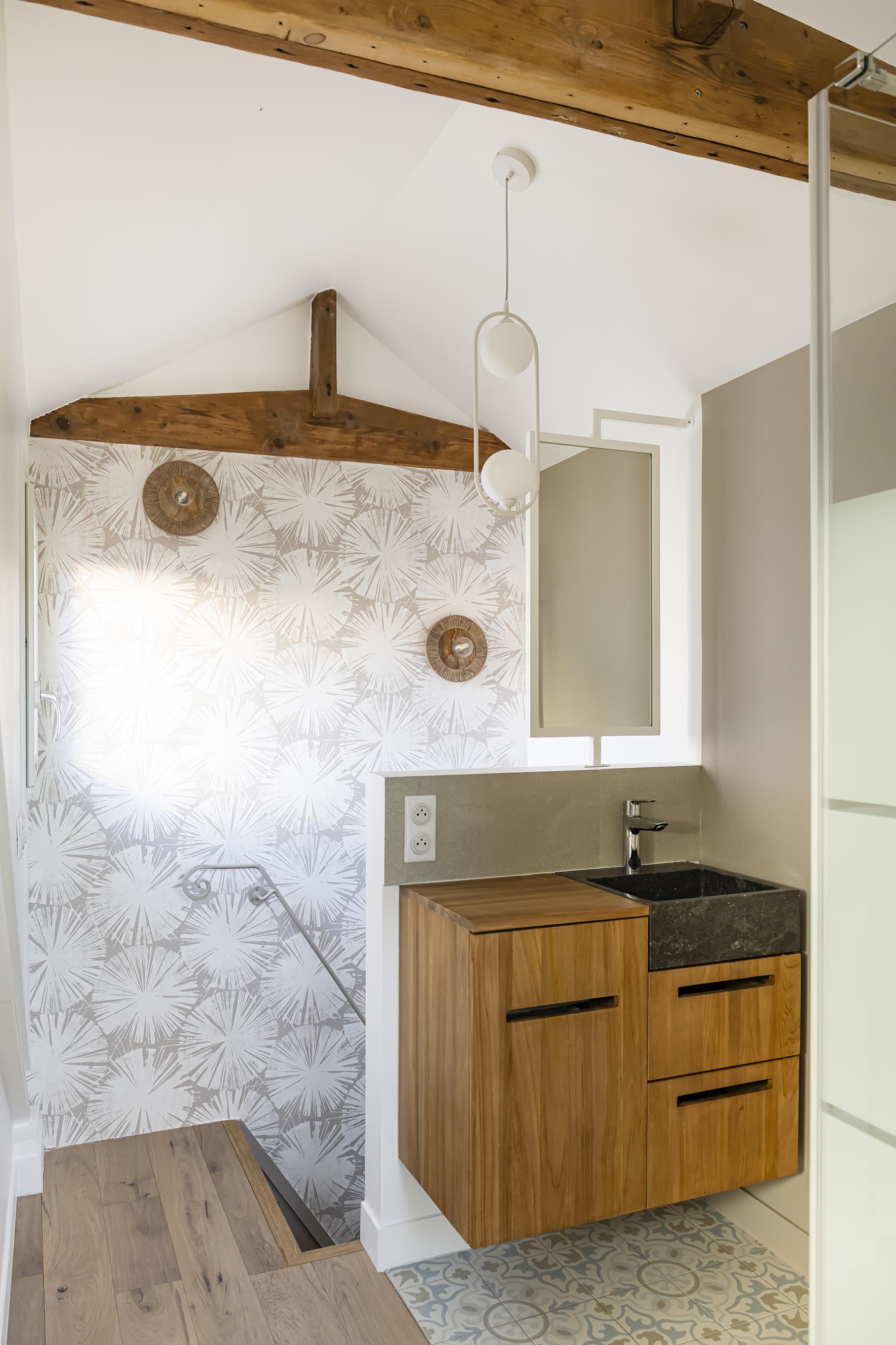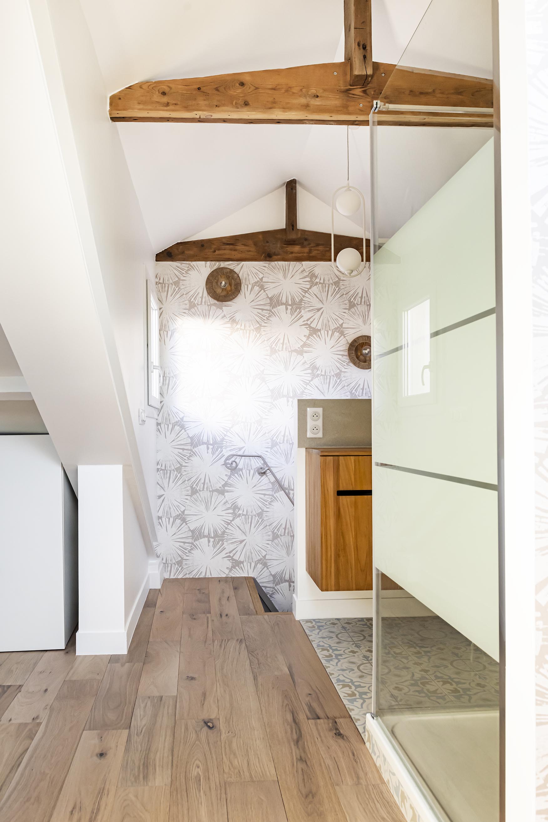 Une petite fenêtre a été ajoutée en haut de la cage d’escaliers afin de lui apporter de la lumière naturelle. Les escaliers ont été poncés, on a ajouté une rampe sur-mesure en fer forgé peinte de la même couleur que les contremarches, dans une tonalité qui fait écho au papier peint graphique. Et surtout, on l’a ouverte sur l’espace combles avec une salle d’eau esprit loft totalement ouverte. L’idée étant d’augmenter le volume visuellement, la verrière initialement prévue entre la salle d’eau et les escaliers a laissé place à un miroir totalement réalisé sur-mesure et une jolie suspension. 2 appliques viennent apporter un éclairage optimisé dans la montée d’escalier et un côté déco depuis le fond de la pièce.