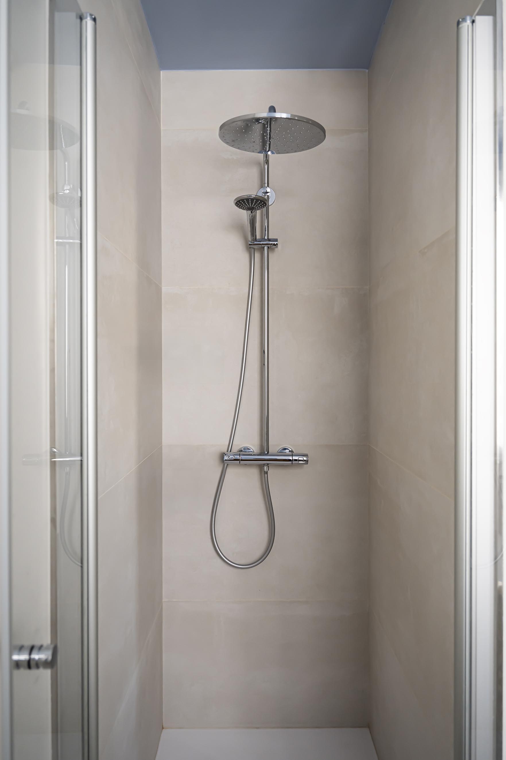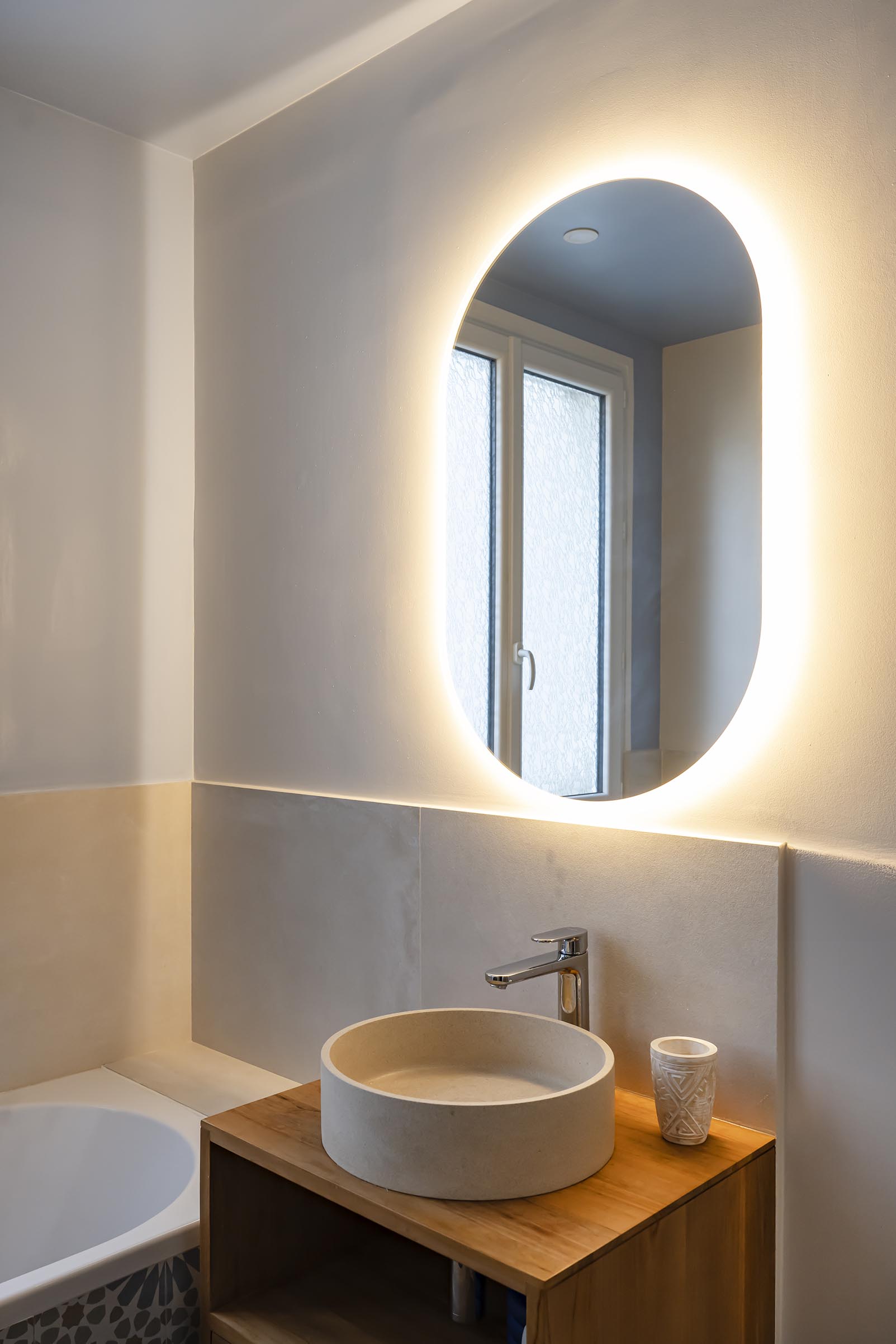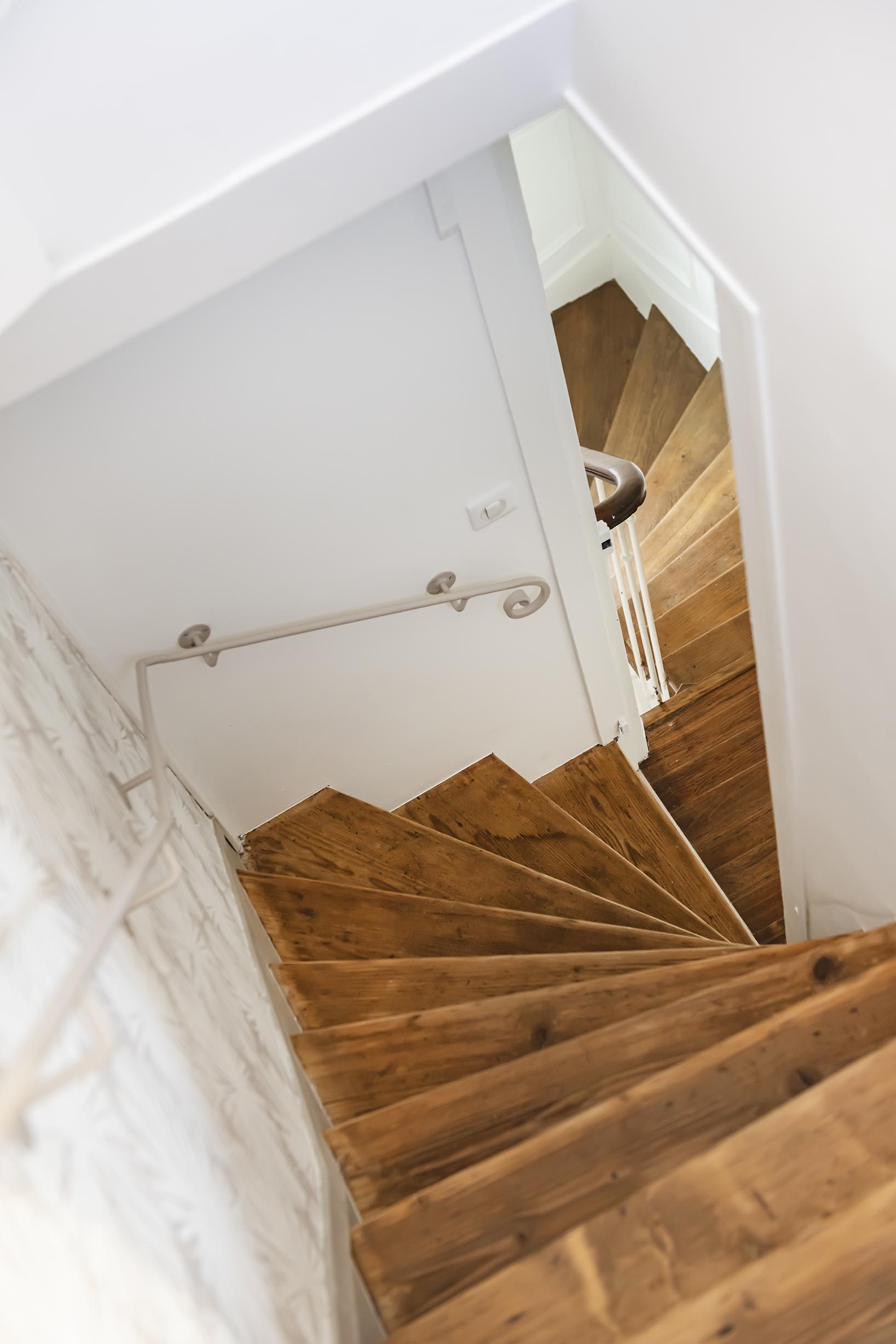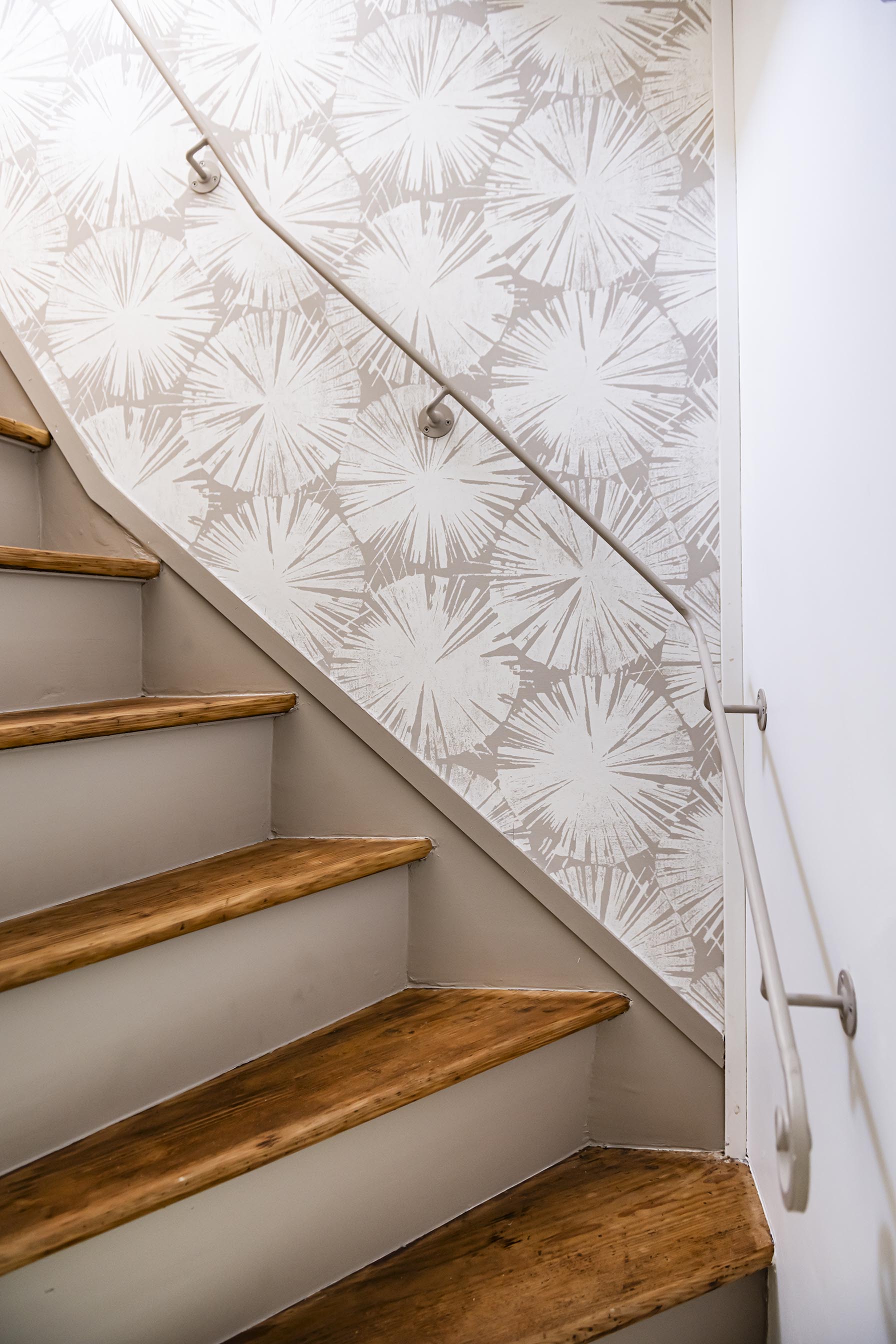 Une petite fenêtre a été ajoutée en haut de la cage d’escaliers afin de lui apporter de la lumière naturelle. Les escaliers ont été poncés, on a ajouté une rampe sur-mesure en fer forgé peinte de la même couleur que les contremarches, dans une tonalité qui fait écho au papier peint graphique. Et surtout, on l’a ouverte sur l’espace combles avec une salle d’eau esprit loft totalement ouverte. L’idée étant d’augmenter le volume visuellement, la verrière initialement prévue entre la salle d’eau et les escaliers a laissé place à un miroir totalement réalisé sur-mesure et une jolie suspension. 2 appliques viennent apporter un éclairage optimisé dans la montée d’escalier et un côté déco depuis le fond de la pièce.