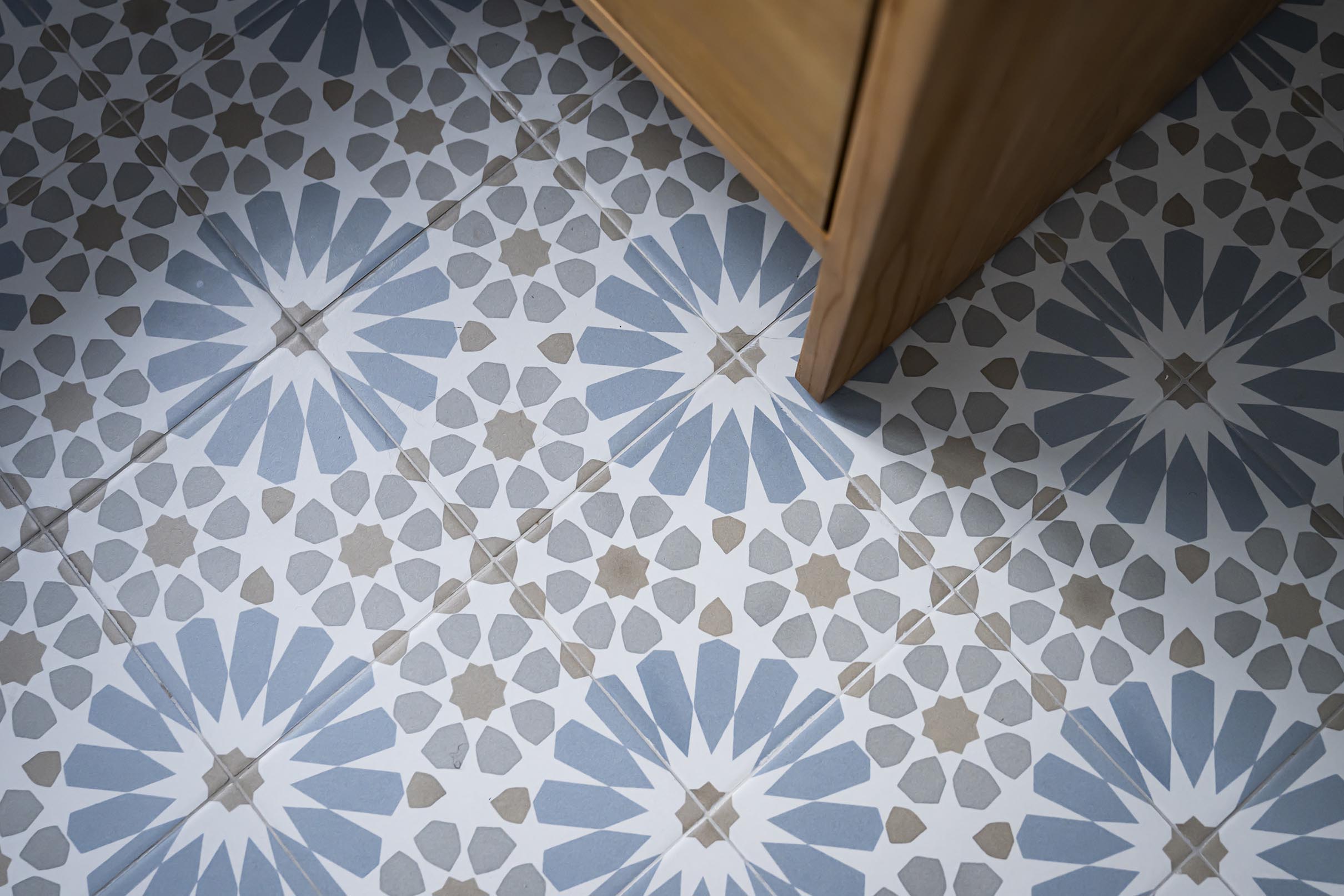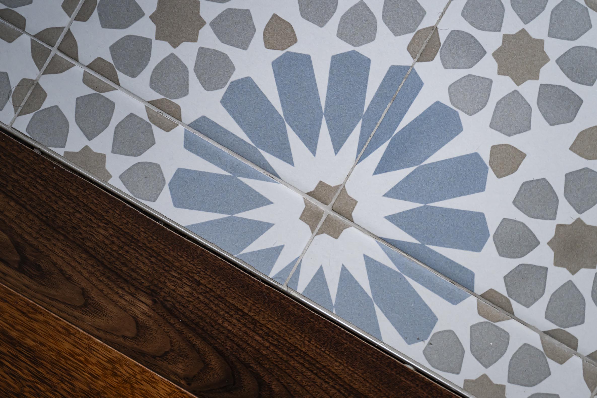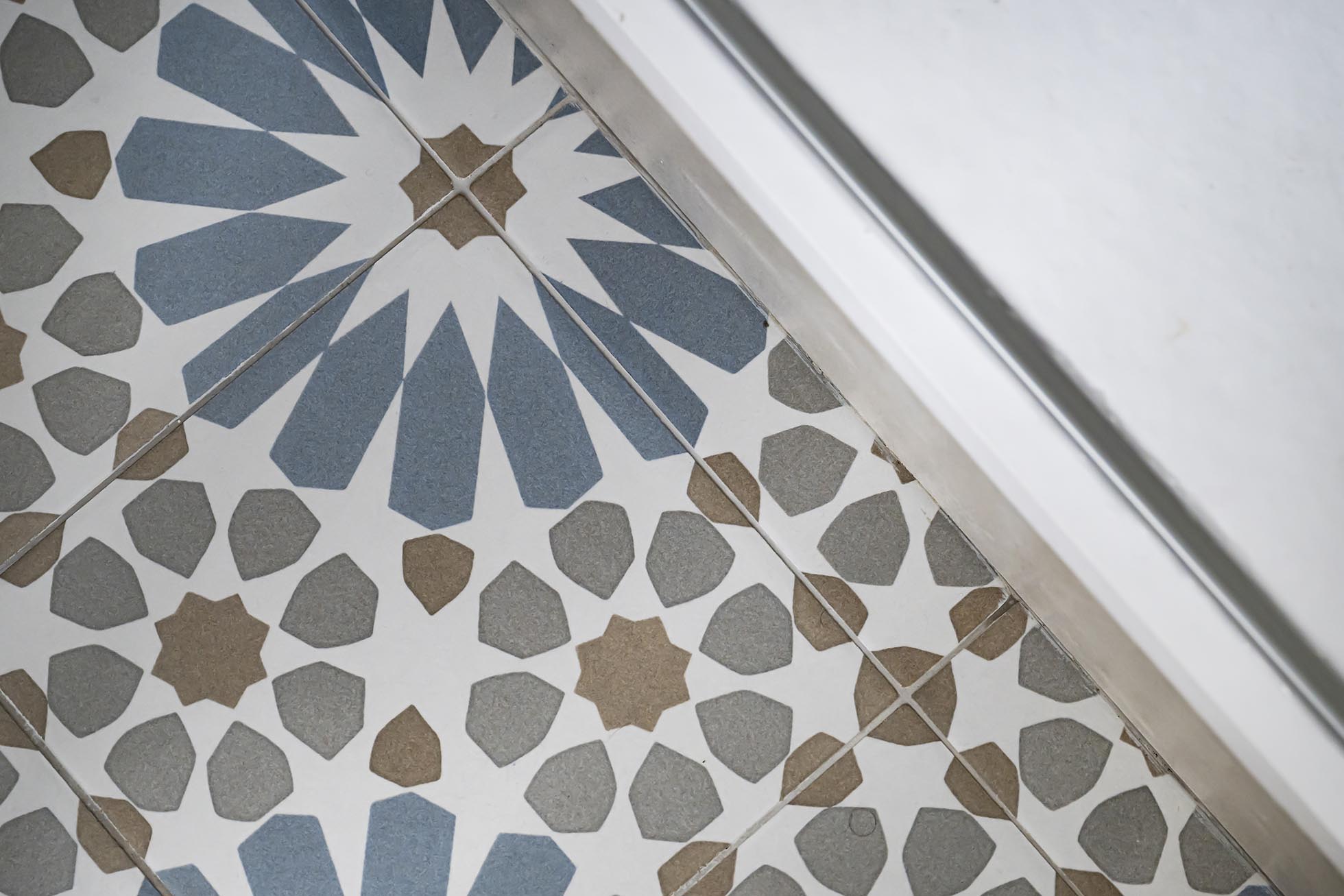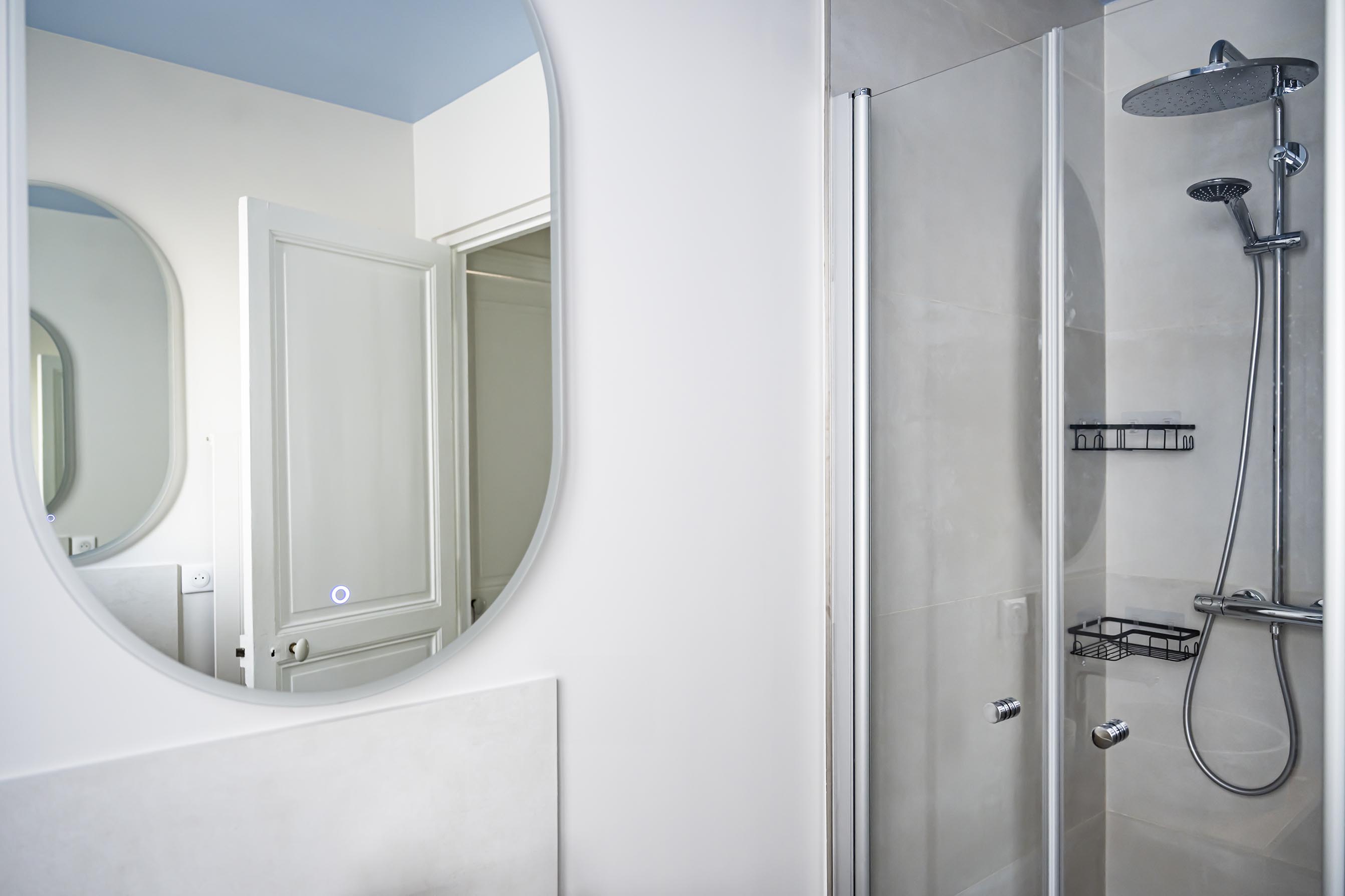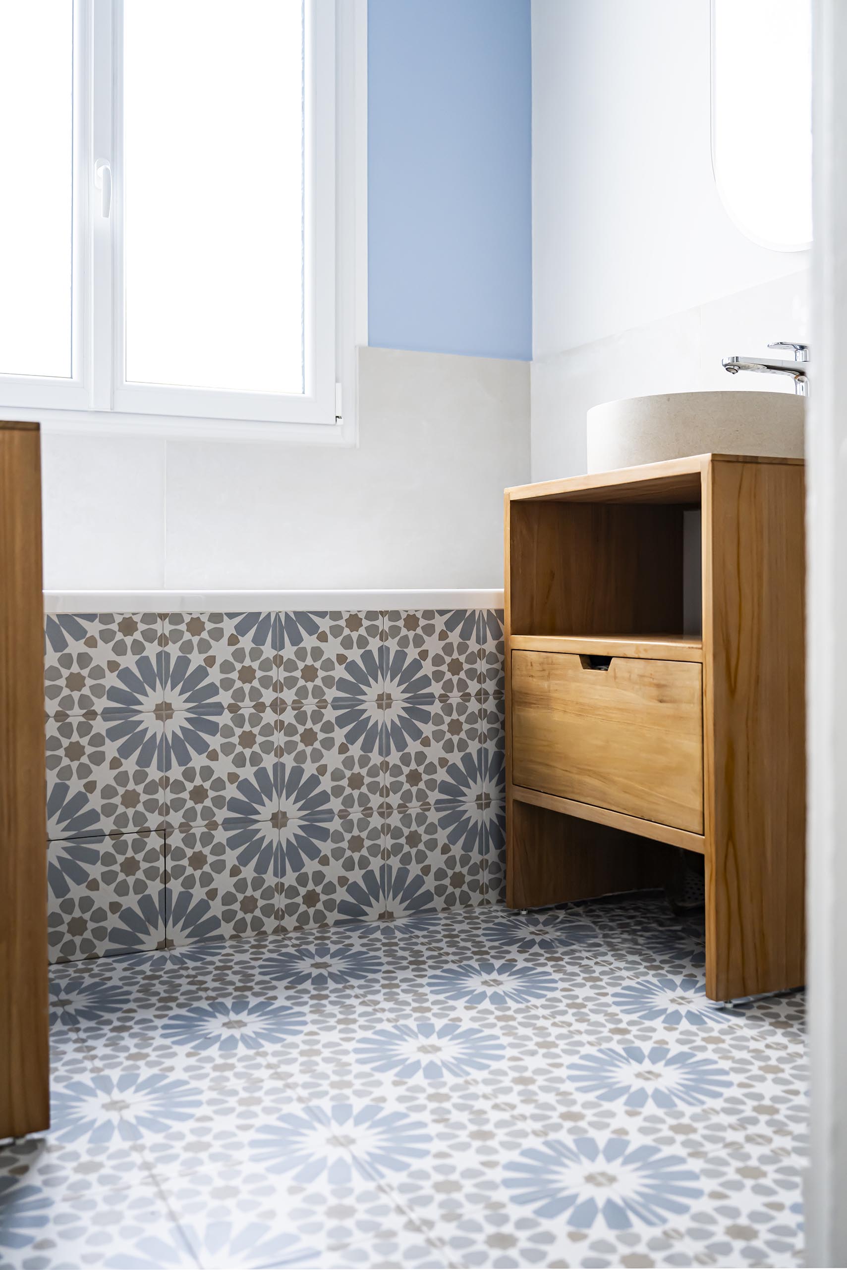 Une petite fenêtre a été ajoutée en haut de la cage d’escaliers afin de lui apporter de la lumière naturelle. Les escaliers ont été poncés, on a ajouté une rampe sur-mesure en fer forgé peinte de la même couleur que les contremarches, dans une tonalité qui fait écho au papier peint graphique. Et surtout, on l’a ouverte sur l’espace combles avec une salle d’eau esprit loft totalement ouverte. L’idée étant d’augmenter le volume visuellement, la verrière initialement prévue entre la salle d’eau et les escaliers a laissé place à un miroir totalement réalisé sur-mesure et une jolie suspension. 2 appliques viennent apporter un éclairage optimisé dans la montée d’escalier et un côté déco depuis le fond de la pièce.