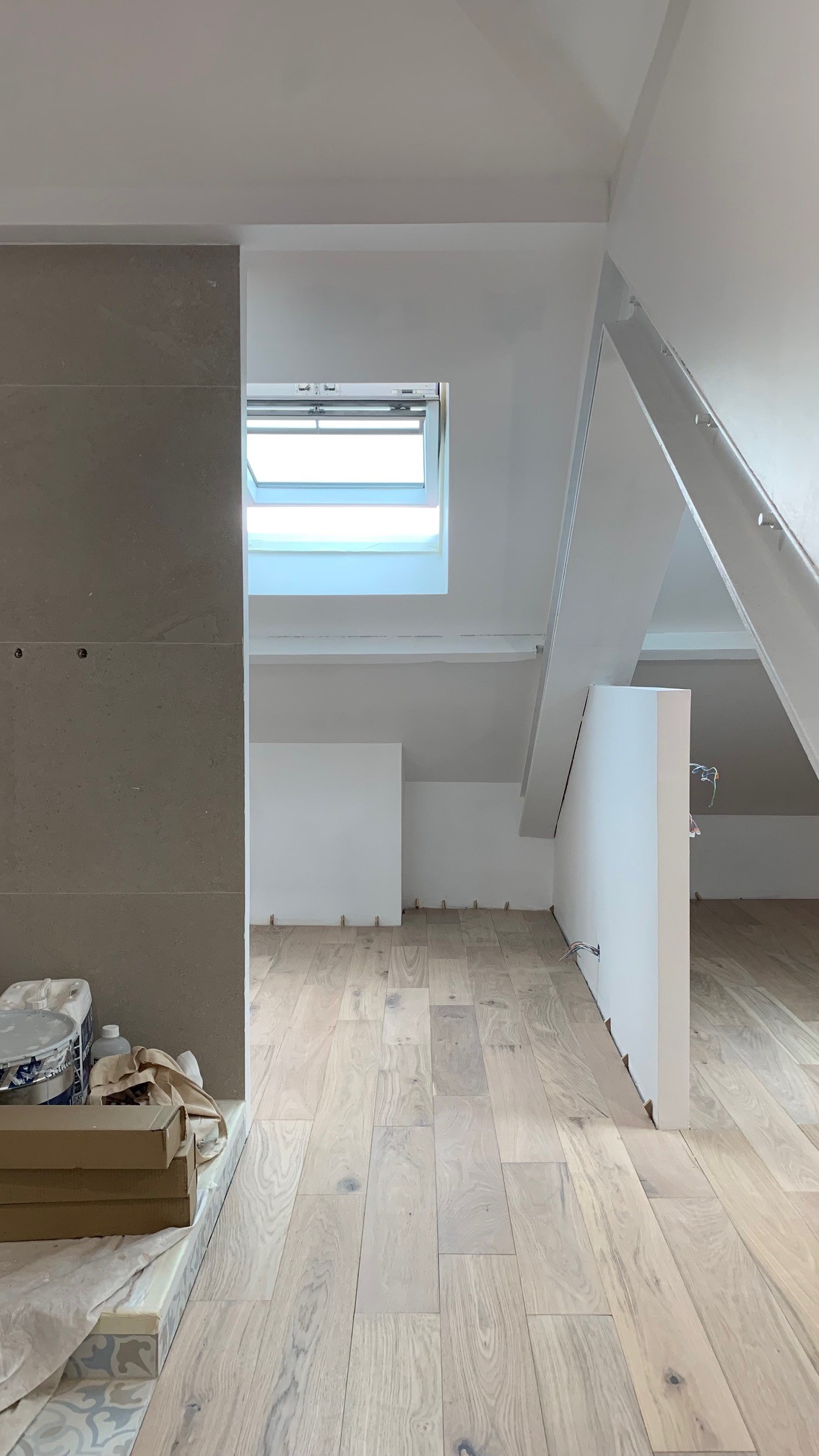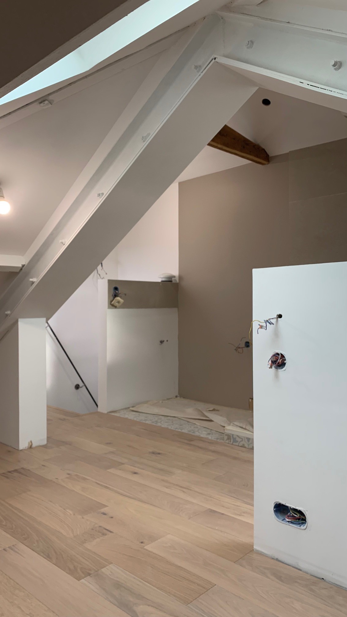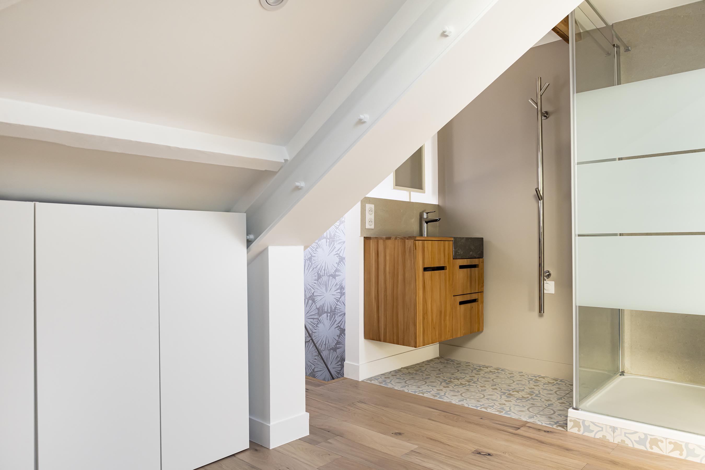 Aménagement de combles très mansardés d’environ 50m² au sol (à peine 7 m² Carrez) avec reprise structurelle de charpente afin de créer 2 espaces nuit et 1 salle d’eau pour 2 ados. Cette rénovation à partir de rien a aussi été l’occasion de bien isoler l’espace et d’y installer une climatisation réversible et une VMC. Le parti pris : ouvrir et créer de la perspective dans un esprit Loft ! Les clients nous ont ensuite sollicités pour ouvrir un mur porteur au RDC et refaire la SDB du 1er étage !