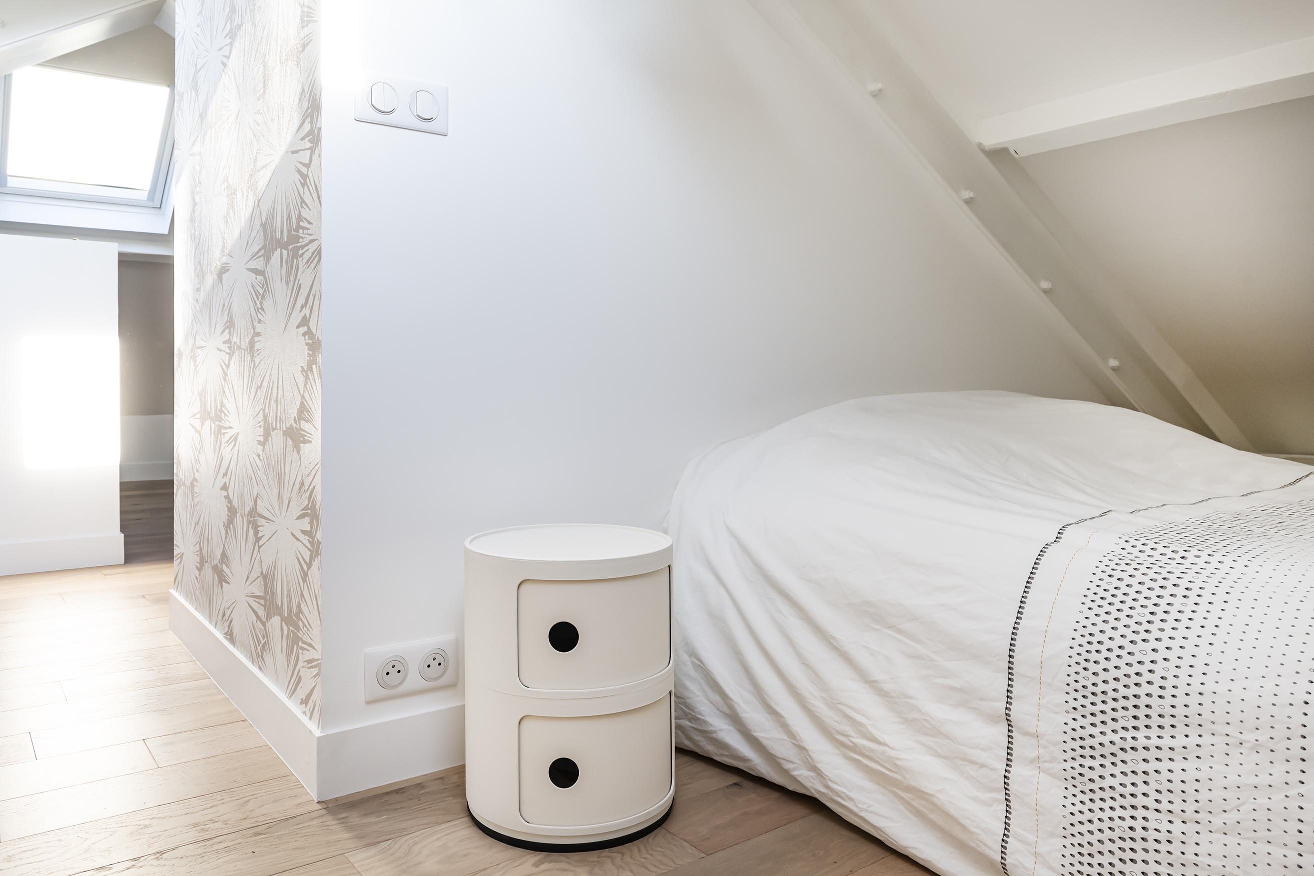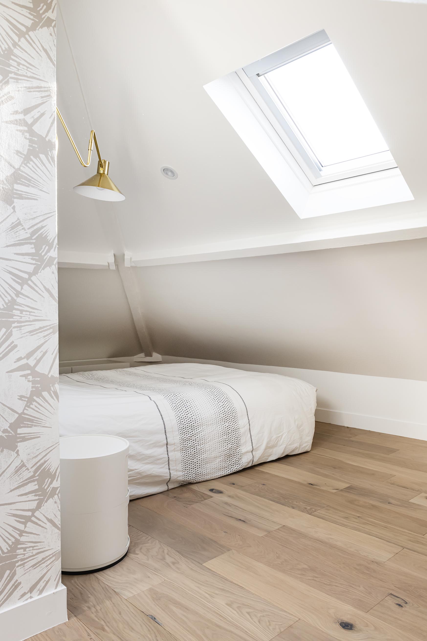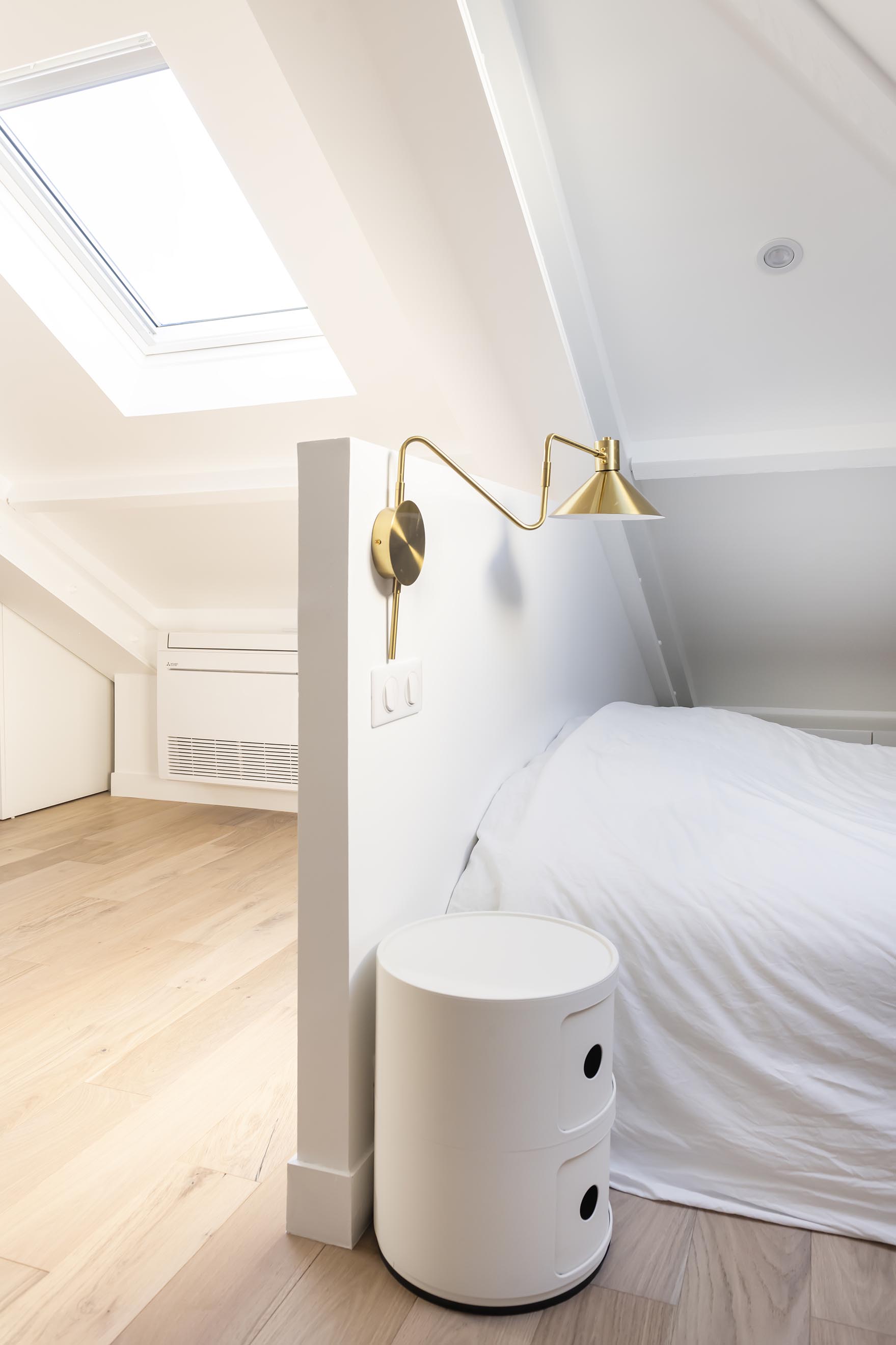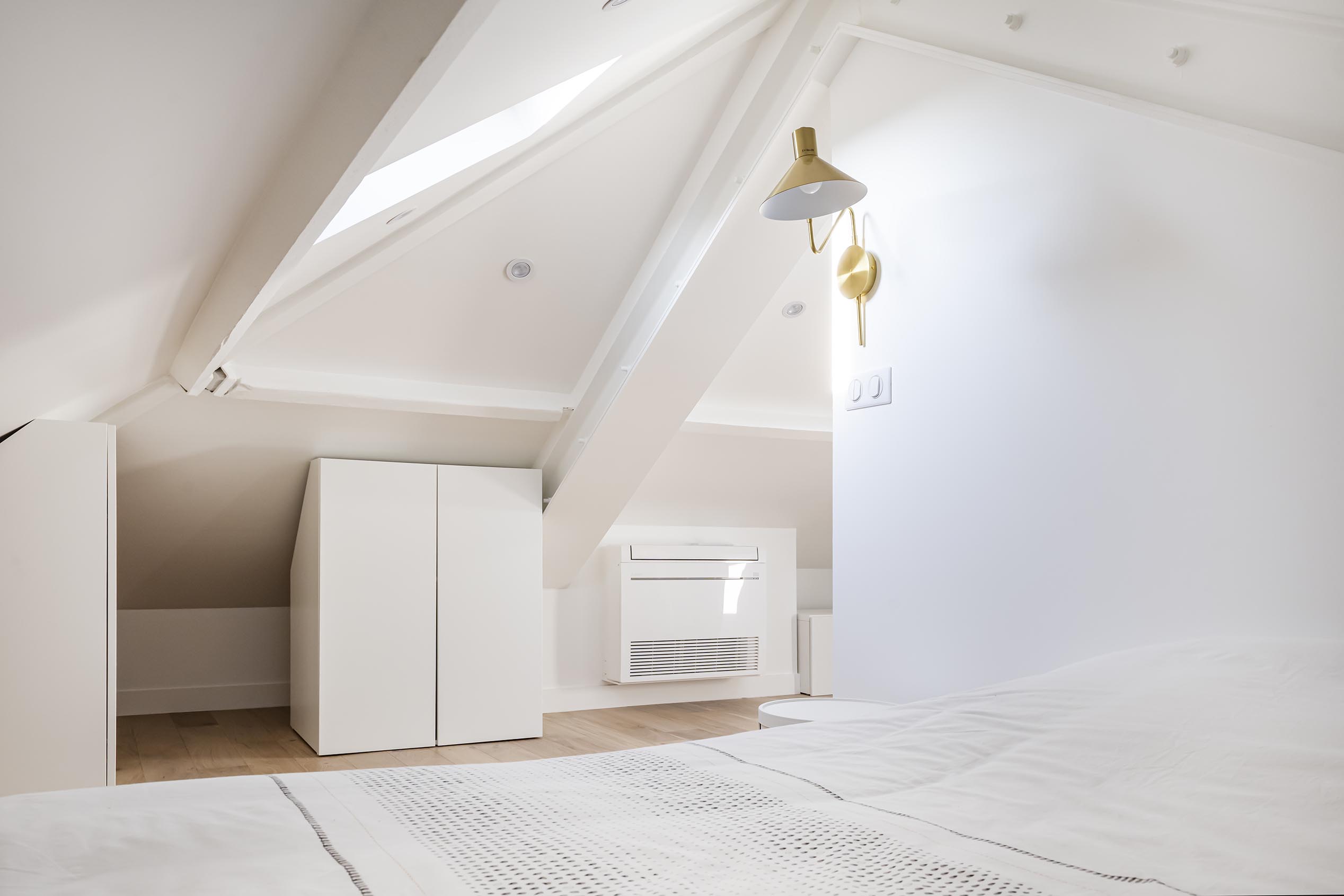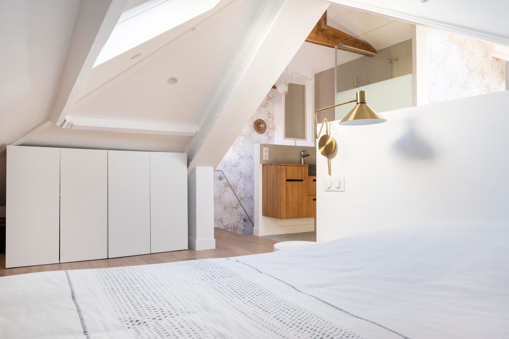 Les espaces nuit se situent dans les 2 extrémités les plus mansardées mais ma volonté était que les ados puissent a minima arriver debout devant leur lit et se tenir assis dans leur lit sans toucher les sous pentes avec la tête. Les chambres ont été pensées de façon très minimalistes, avec un sol en bois et les murs et rangements blancs afin de laisser la sensation d’espace. Seule l’espace salle de bain est légèrement coloré.