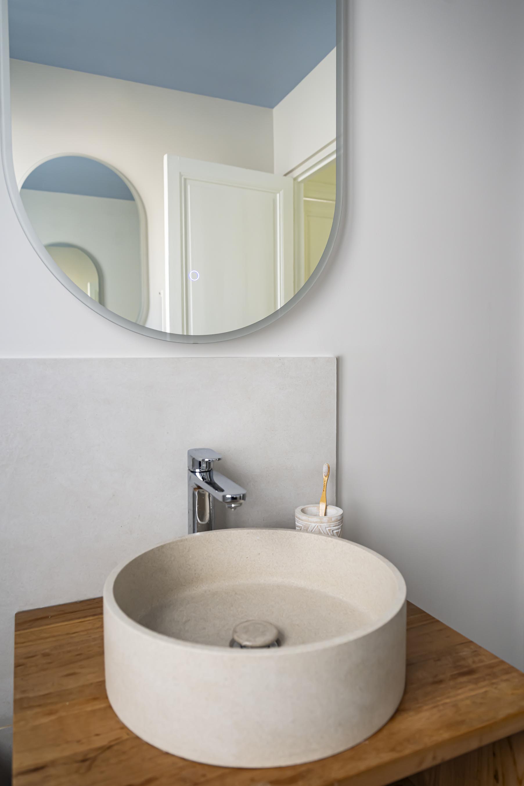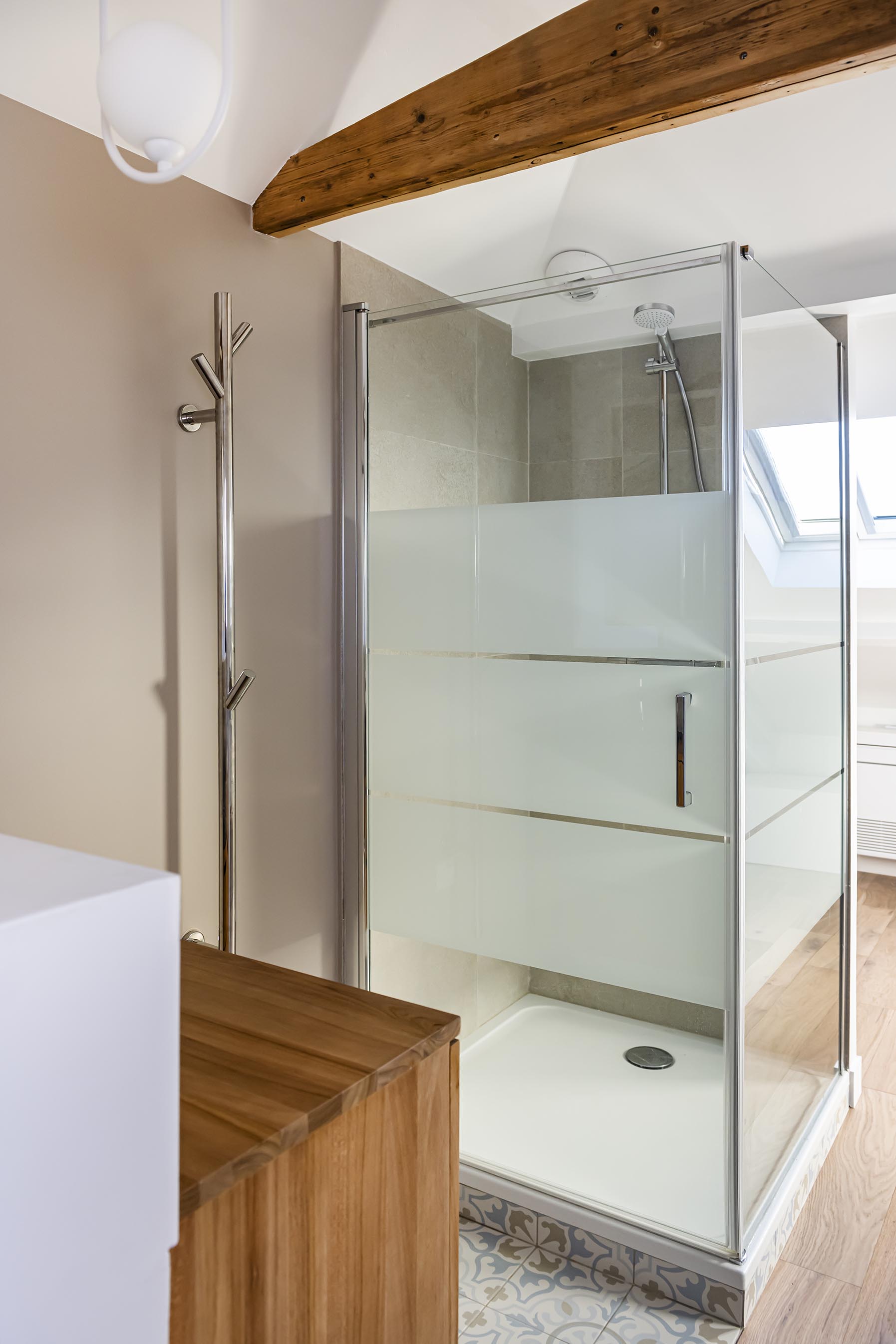 La salle d’eau a été créée de toute pièce et comme nous partions de rien, nous avons pu en profiter pour passer les évacuations entre les solives sous le plancher que nous avons ajouté sous le parquet. Elle est très ouverte sur le reste des combles, toujours dans un esprit loft et pour ne pas casser les perspectives, simplement délimitée au sol par un carrelage effet carreaux de ciments aux couleurs douces, sur les murs par une teinte qui fait écho à la cage d’escaliers, et séparée de la cage d’escaliers par ce miroir dessiné sur-mesure. Un meuble vasque en teck massif réchauffe l’ambiance et rappelle la teinte des poutres conservées couleur bois sous le faîtage.
