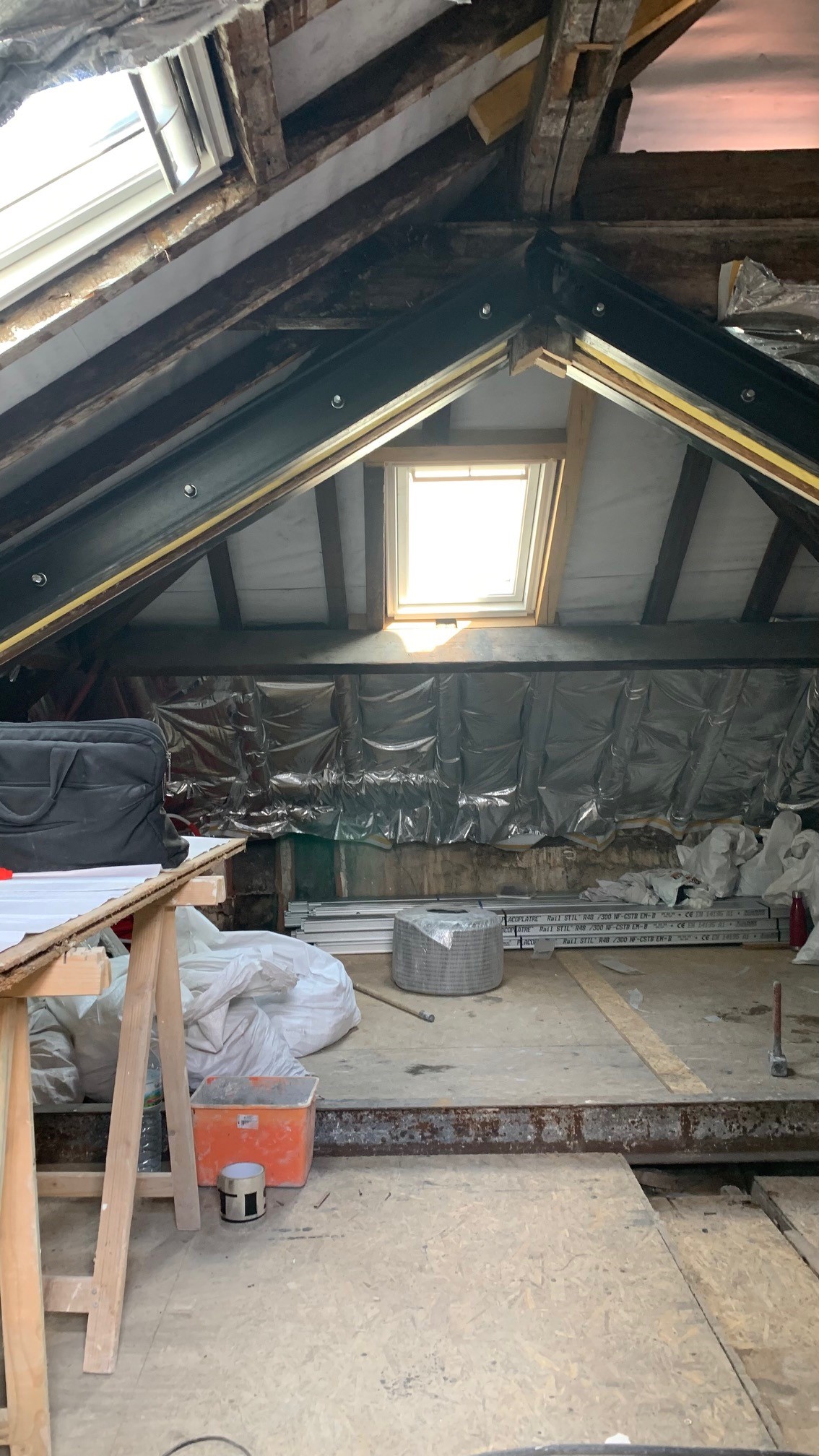Comme souvent en Région Parisienne, les propriétaires de maisons anciennes aimeraient réaliser une surélévation mais le budget les freine la plupart du temps. C’était le cas ici alors les clients se sont rabattus sur une optimisation de leur espace sous combles mais les contraintes étaient énormes et on partait de presque rien : pas de plancher, pas d’isolation, une cage d’escaliers étroite et sombre, et surtout : une charpente très présente qui délimitait énormément l’espace et empêchait toute circulation debout. La première chose à faire a été de faire passer un Ingénieur Structure pour voir si les solives pouvaient supporter un plancher et le poids de l’aménagement et surtout d’envisager les solutions possibles pour pouvoir circuler dans cet espace déjà très étriqué en reprenant la structure de la charpente. Bilan du BET : ok pour le sol et aussi pour « simplifier » la charpente en doublant une partie de la structure en métallique.