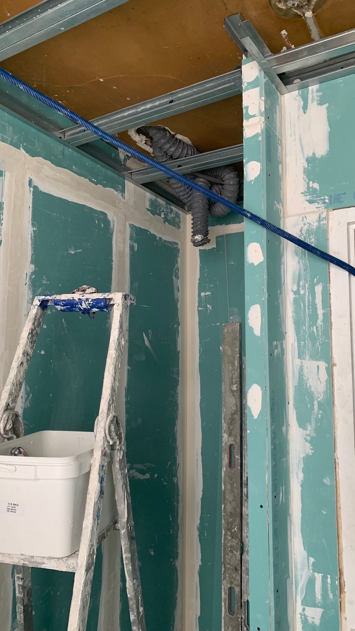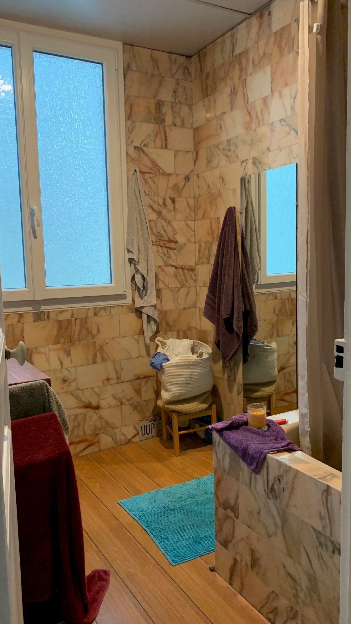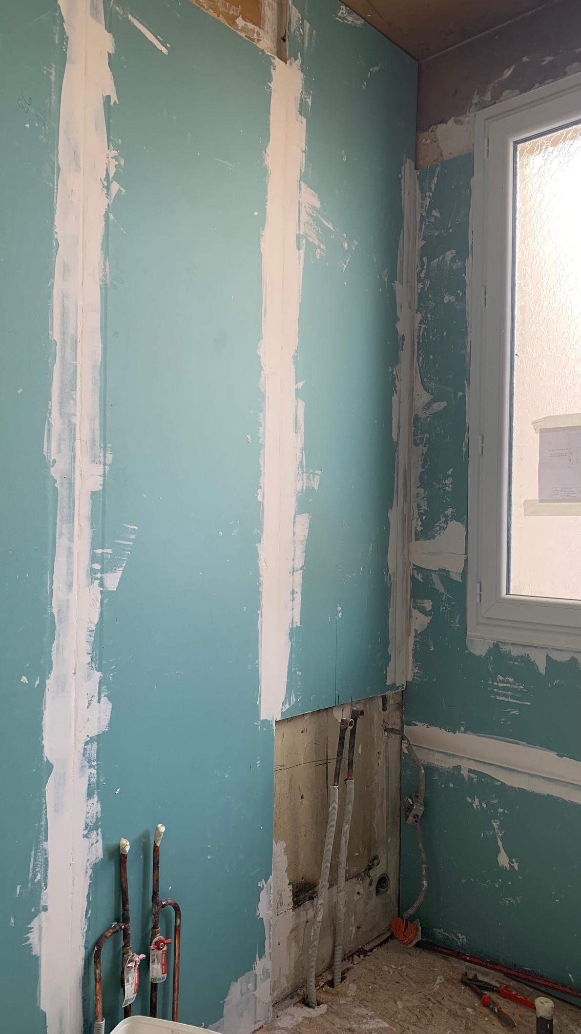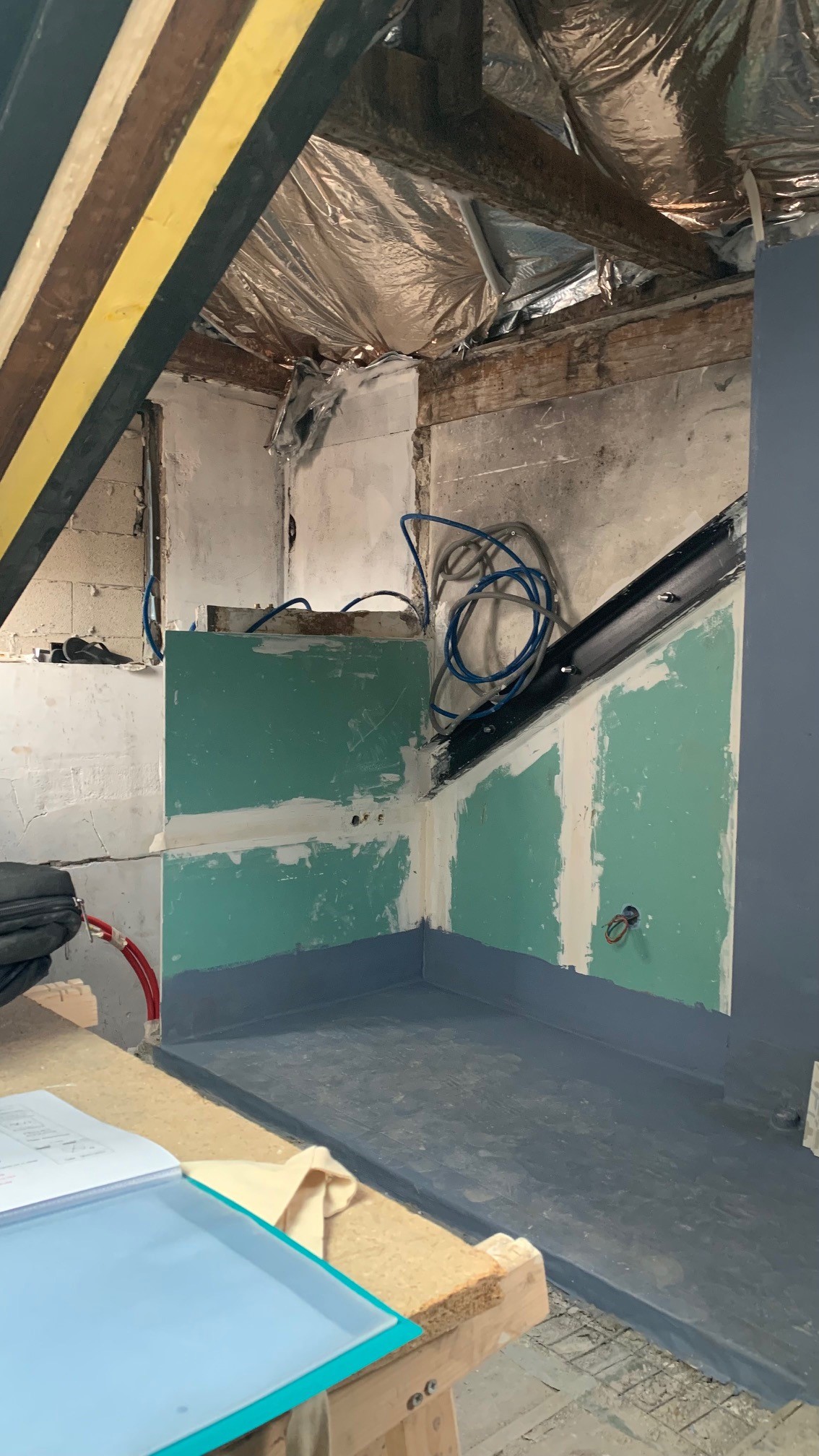 Quelques mois plus tard, les clients nous ont rappelés afin de rénover totalement leur salle de bain du 1er étage qui fait 5m² mais dans laquelle ils souhaitaient caser une baignoire, une douche séparée de la baignoire et une double vasque ! Au delà de cela, il a fallu déposer l’ancien parquet qui se trouvait sous le stratifié, refaire le faux plafond et se piquer sur la VMC que nous avions installée dans les combles (nous avions anticipé un éventuel futur raccordement de cette pièce car les clients avaient déjà cette idée en tête).