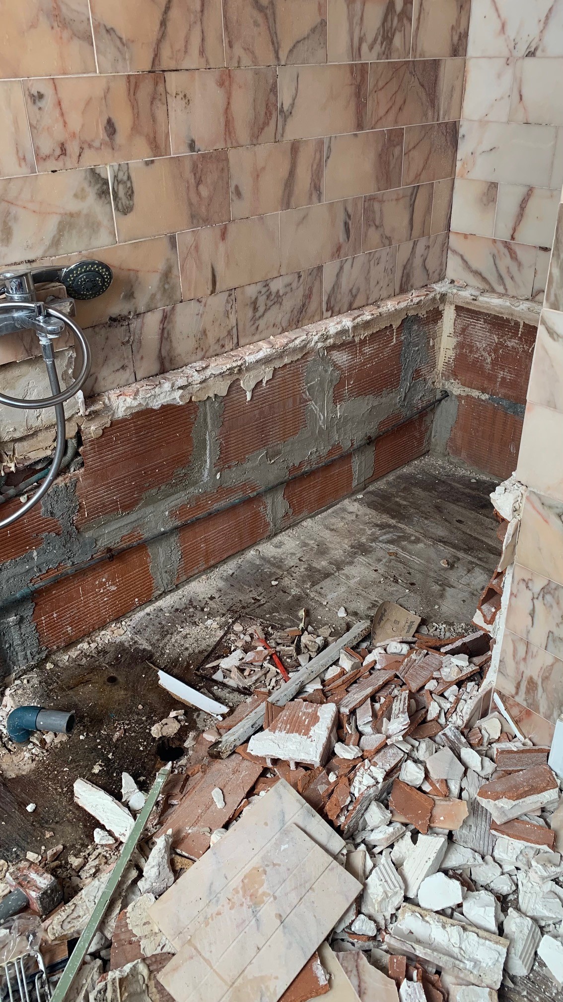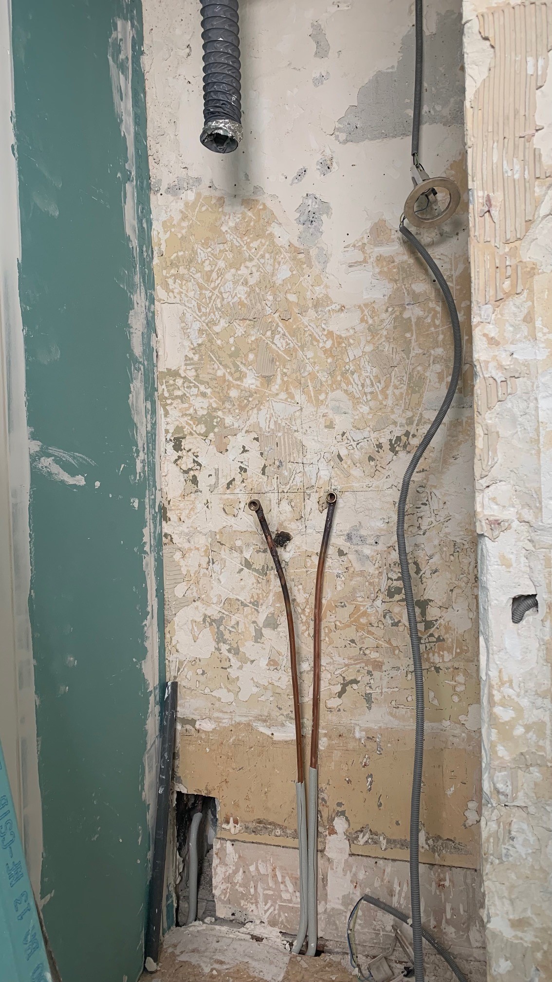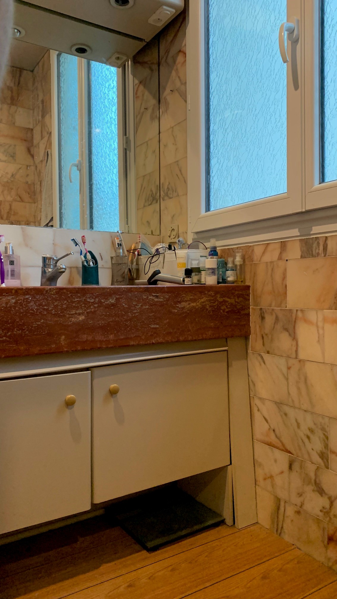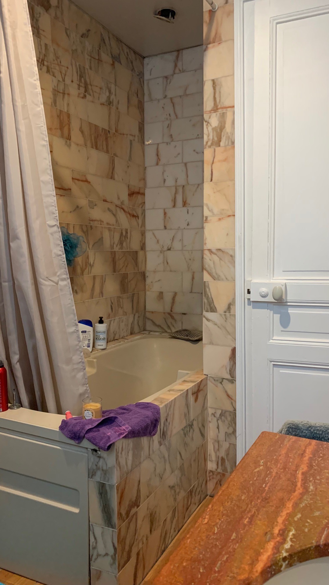 Quelques mois plus tard, les clients nous ont rappelés afin de rénover totalement leur salle de bain du 1er étage qui fait 5m² mais dans laquelle ils souhaitaient caser une baignoire, une douche séparée de la baignoire et une double vasque ! Au delà de cela, il a fallu déposer l’ancien parquet qui se trouvait sous le stratifié, refaire le faux plafond et se piquer sur la VMC que nous avions installée dans les combles (nous avions anticipé un éventuel futur raccordement de cette pièce car les clients avaient déjà cette idée en tête).