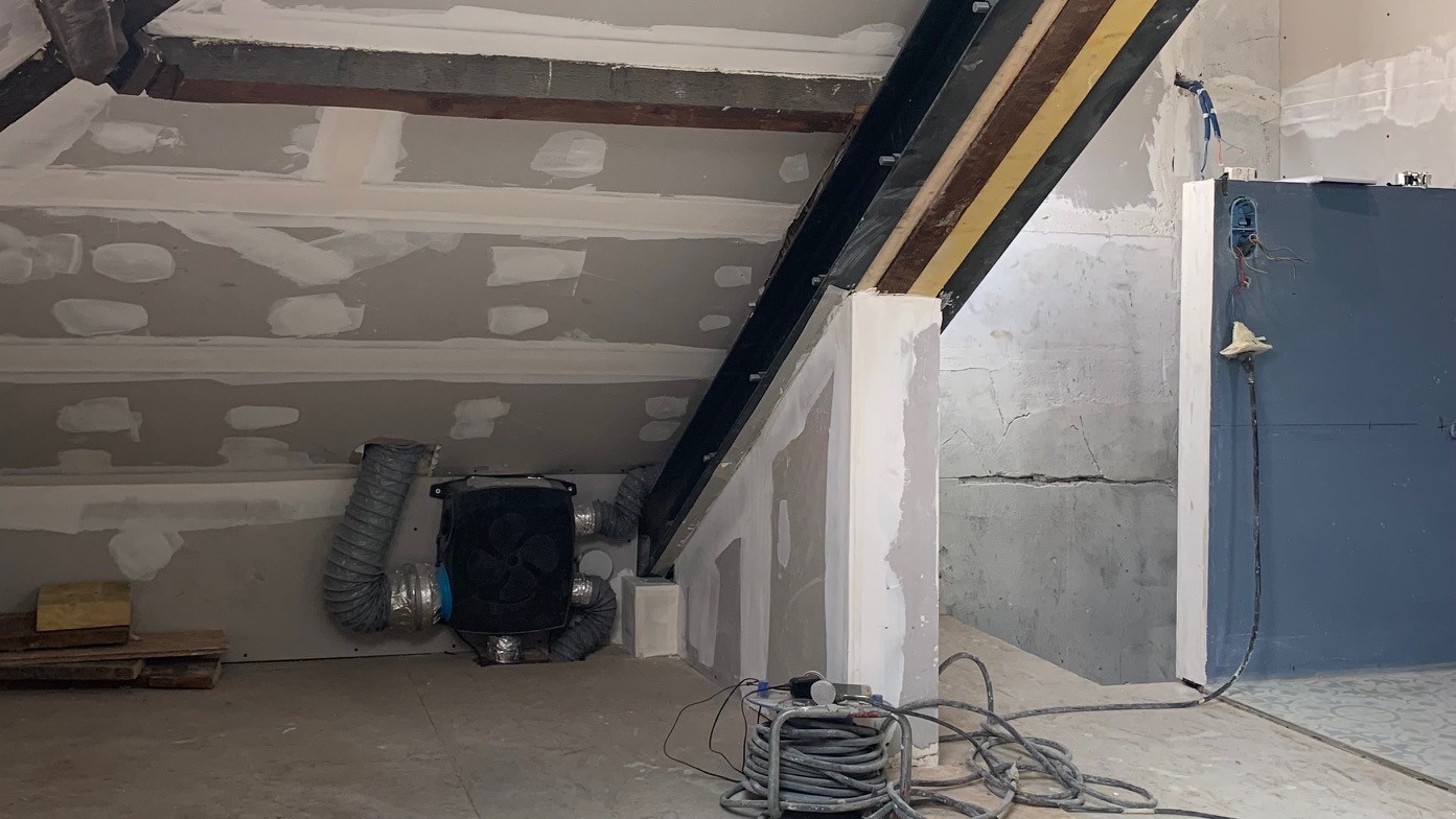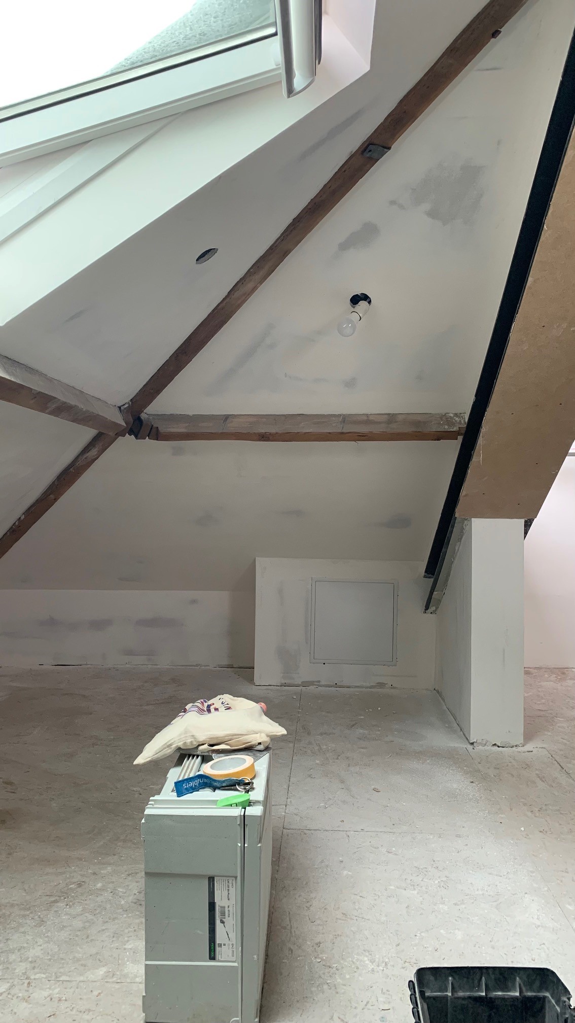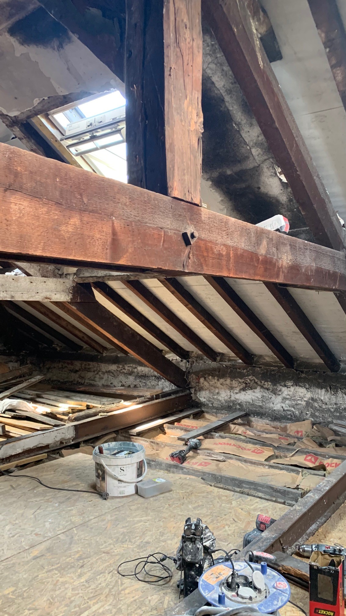 Comme on peut le voir sur ces photos prises avant et pendant les travaux, nous partions donc de très loin pour ce projet d’aménagement de combles pour lequel il a fallu repenser la charpente après consultation d’un Bureau d’Etudes Technique, modifier les ouvertures, créer un plancher, bien isoler phoniquement et thermiquement, créer une VMC, installer une climatisation réversible…