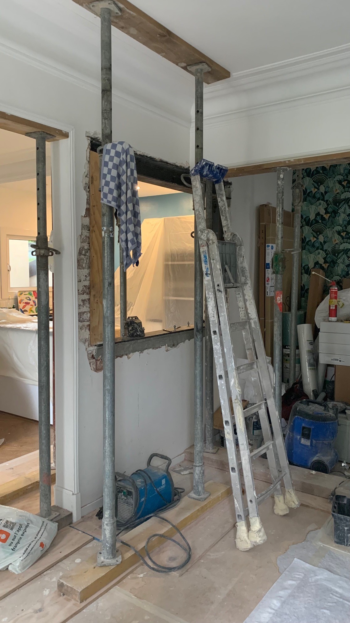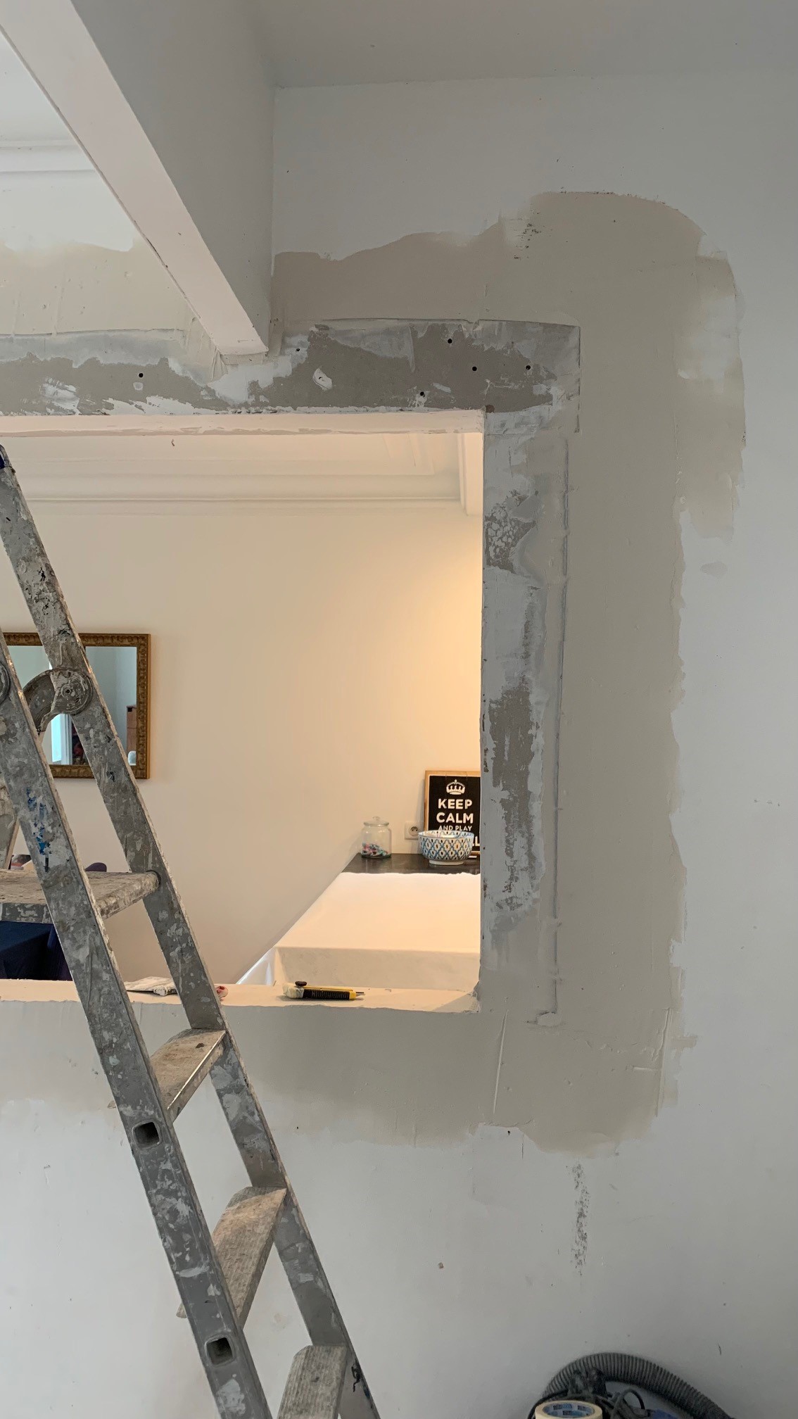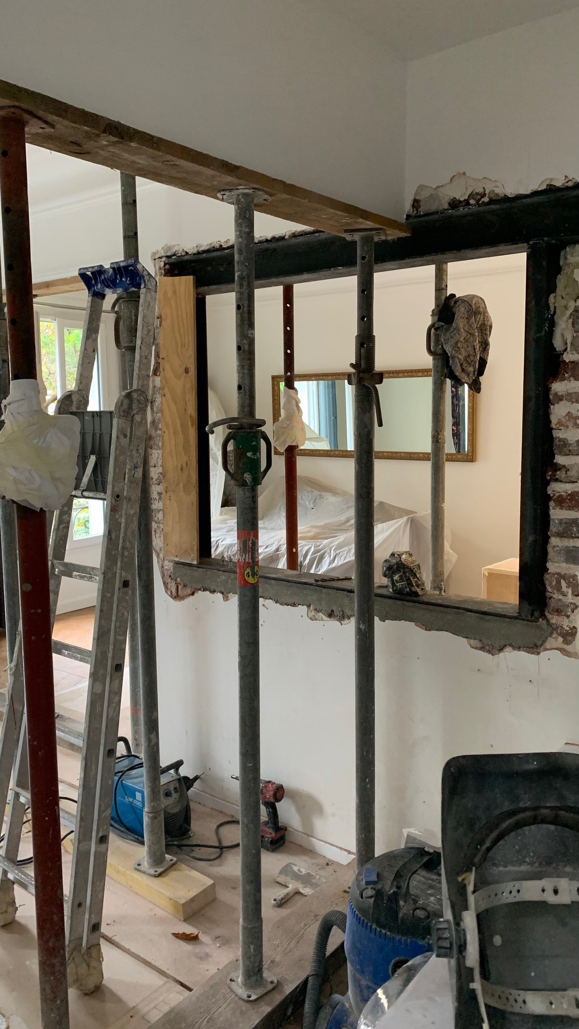 Le chantier des combles s’étant déroulé sans encombres et dans le respect du budget et du timing, les propriétaires nous ont immédiatement sollicités pour une ouverture de mur porteur au RDC afin de créer une verrière pour créer une vue depuis la cuisine sur le salon. Afin de conserver un esprit très épuré, nous avons opté pour un simple châssis vitré avec cadre blanc. Ci-dessus les photos après travaux et ci-dessous pendant.