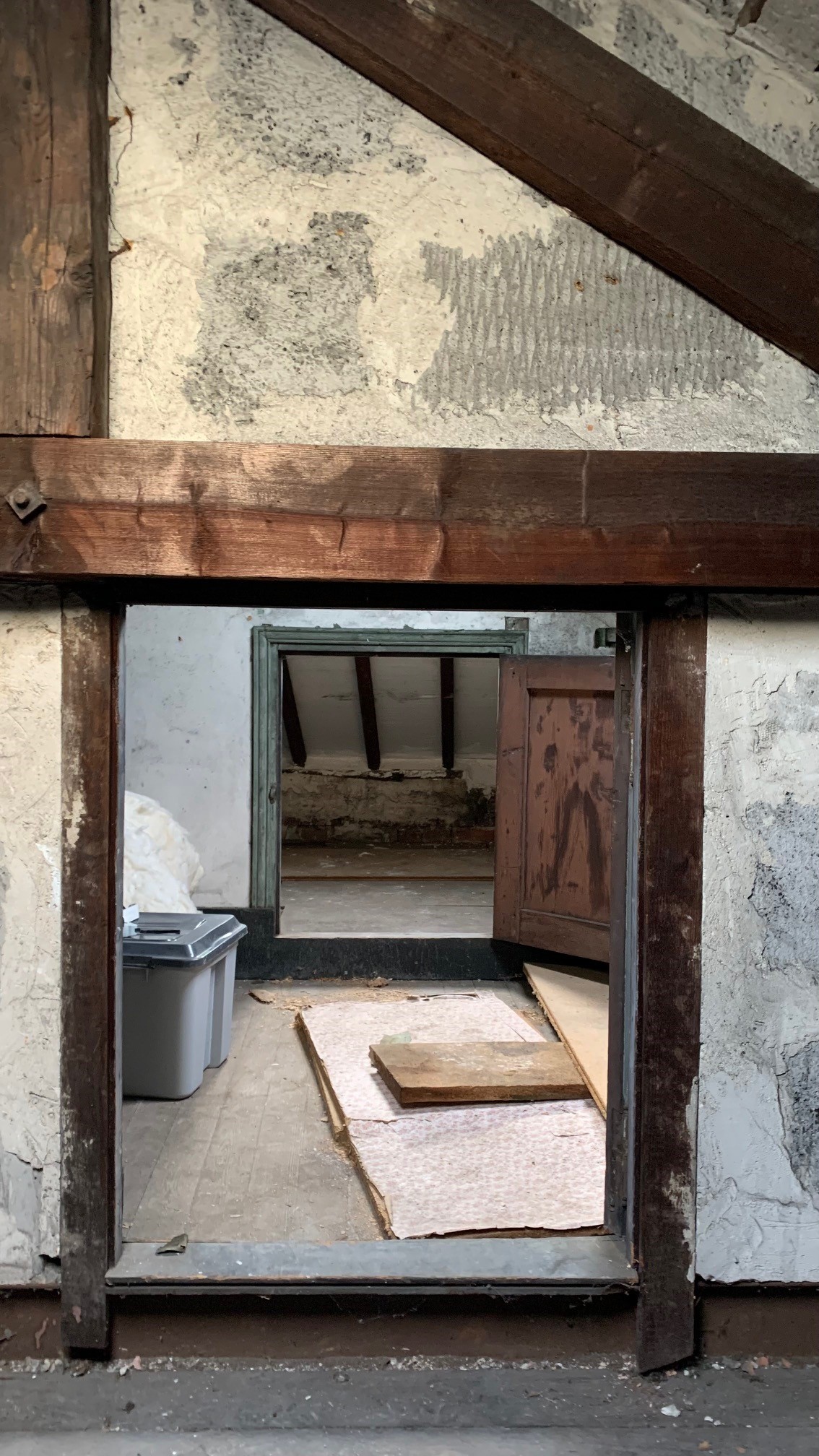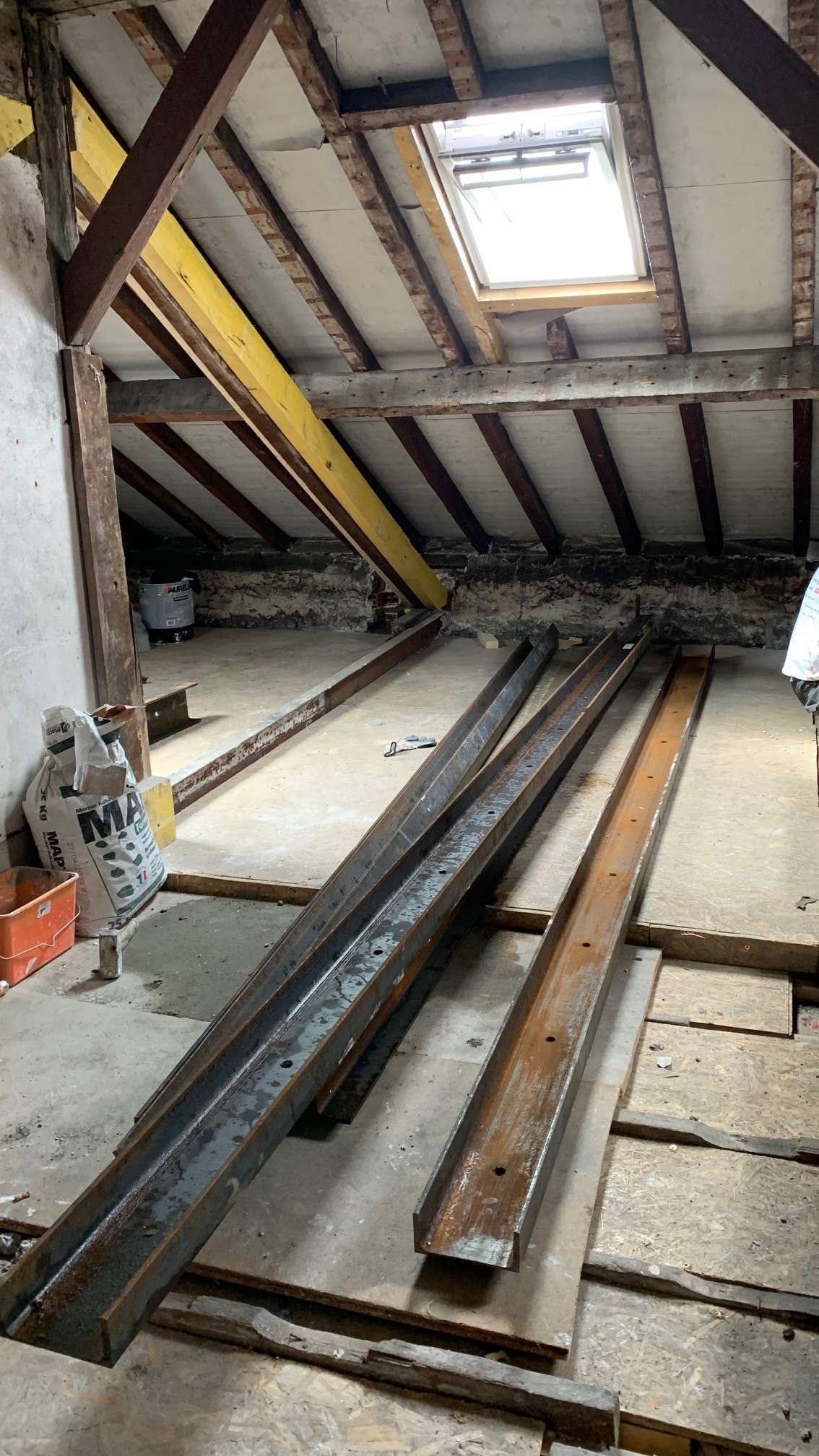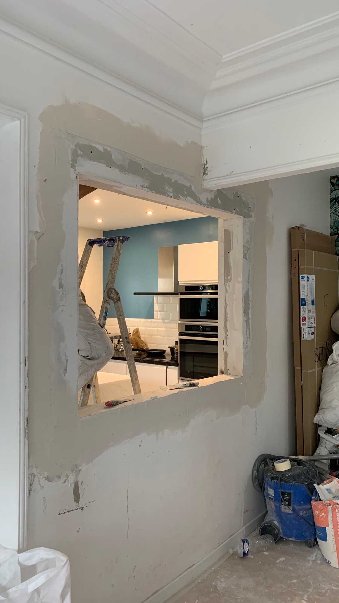 Le chantier des combles s’étant déroulé sans encombres et dans le respect du budget et du timing, les propriétaires nous ont immédiatement sollicités pour une ouverture de mur porteur au RDC afin de créer une verrière pour créer une vue depuis la cuisine sur le salon. Afin de conserver un esprit très épuré, nous avons opté pour un simple châssis vitré avec cadre blanc. Ci-dessus les photos après travaux et ci-dessous pendant.