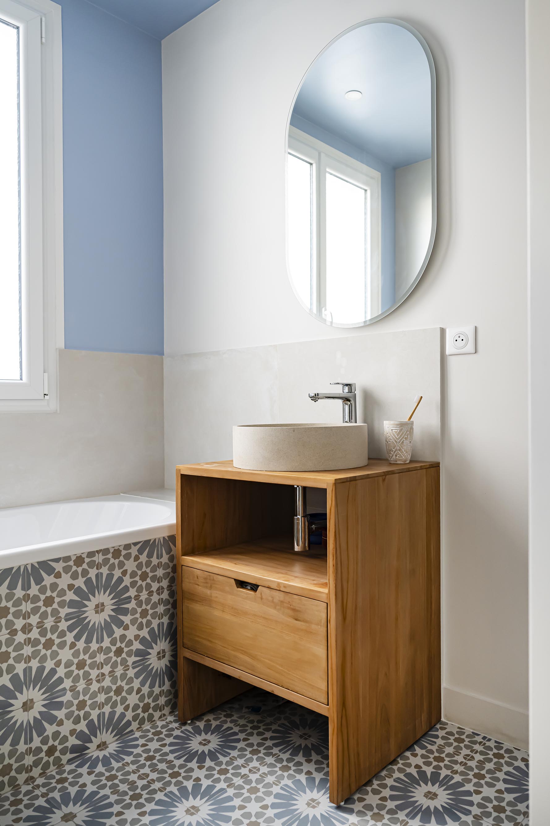Après avoir tourné le plan dans tous les sens et afin de respecter à la fois le cahier des charges et les normes de circulation, j’ai fini par trouver l’astuce en proposant de « couper » le meuble double vasque et le remplacer par 2 simples vasques qui se font face. Cela permettait de caser tous les attendus avec une vraie baignoire et une douche de taille correcte dans le renfoncement de l’ancienne baignoire.