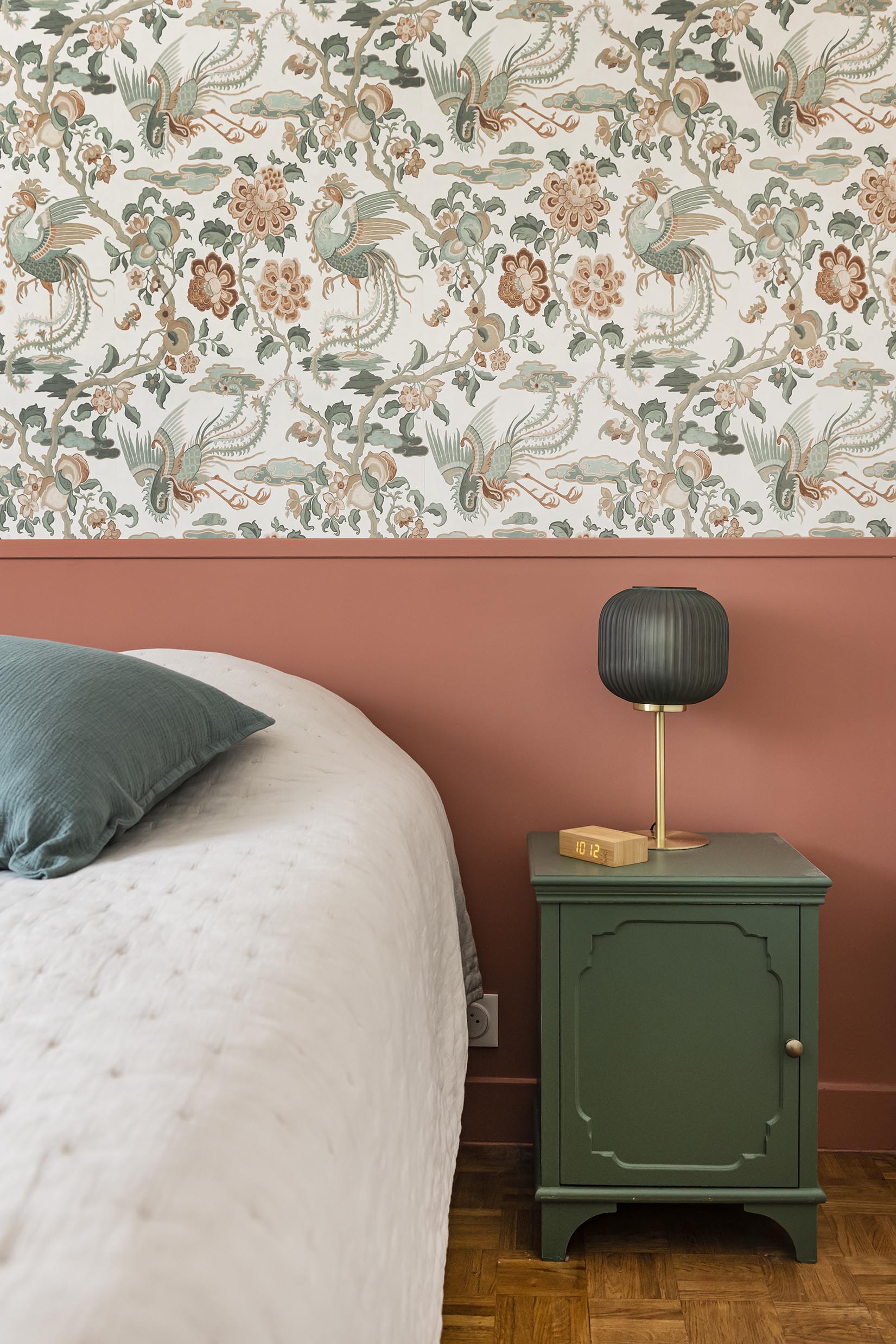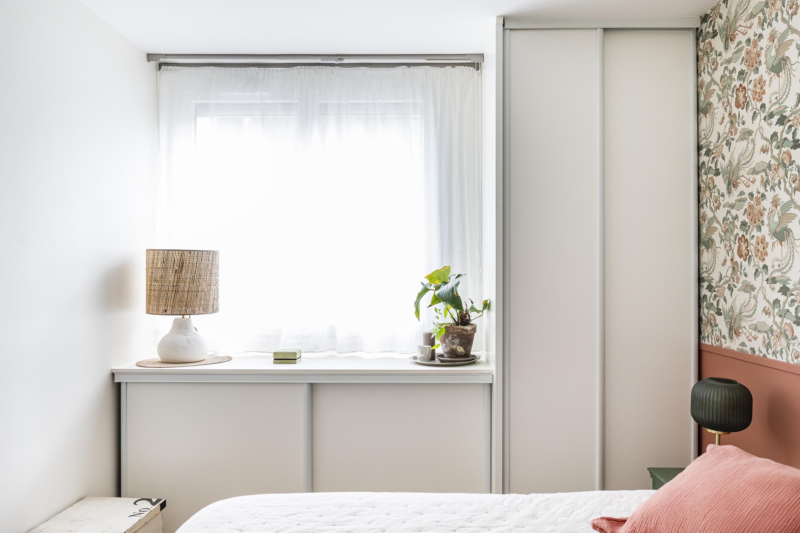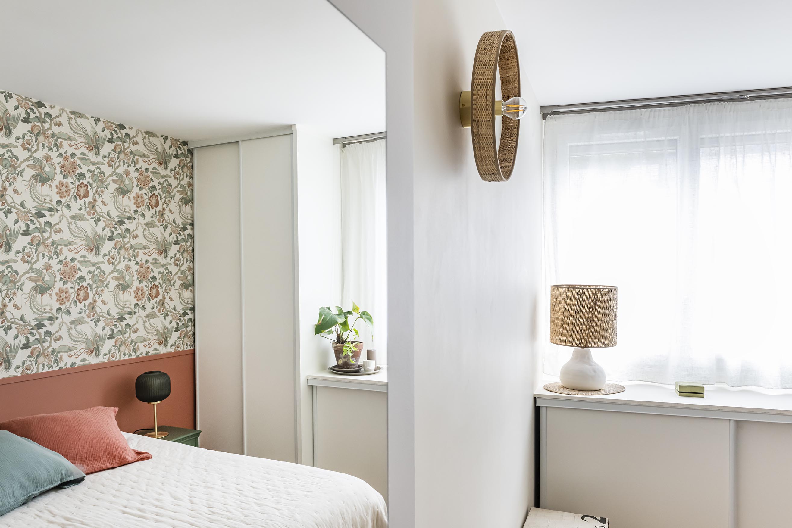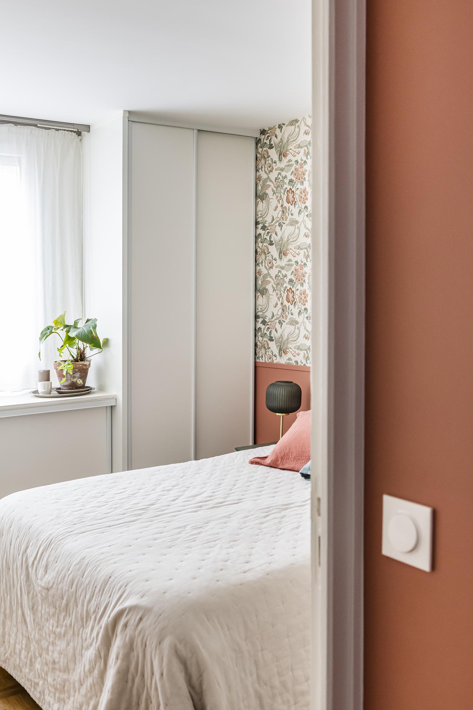 Dans la chambre qui a été réduite, l’idée était d’optimiser les rangements et de la rendre plus claire et cosy afin d’oublier qu’elle a perdu un petit mètre carré. On a ajouté un placard sous la fenêtre, assorti à la penderie existante. Les portes blanches coulissantes sont pratiques et se fondent dans le décor sur une base de blanc. Afin de donner de la perspective dès l’entrée de la chambre, un gros travail à 4 mains à été réalisé avec la cliente pour créer la tête de lit et trouver l’accord parfait entre le papier peint et la peinture terracotta du soubassement.