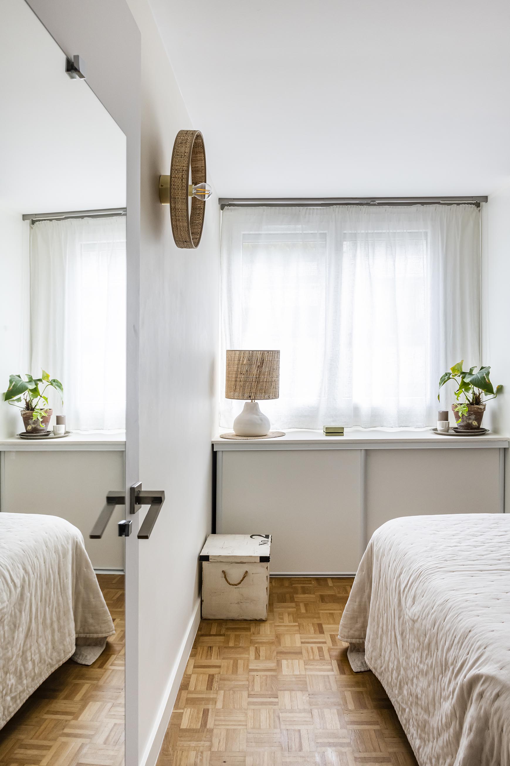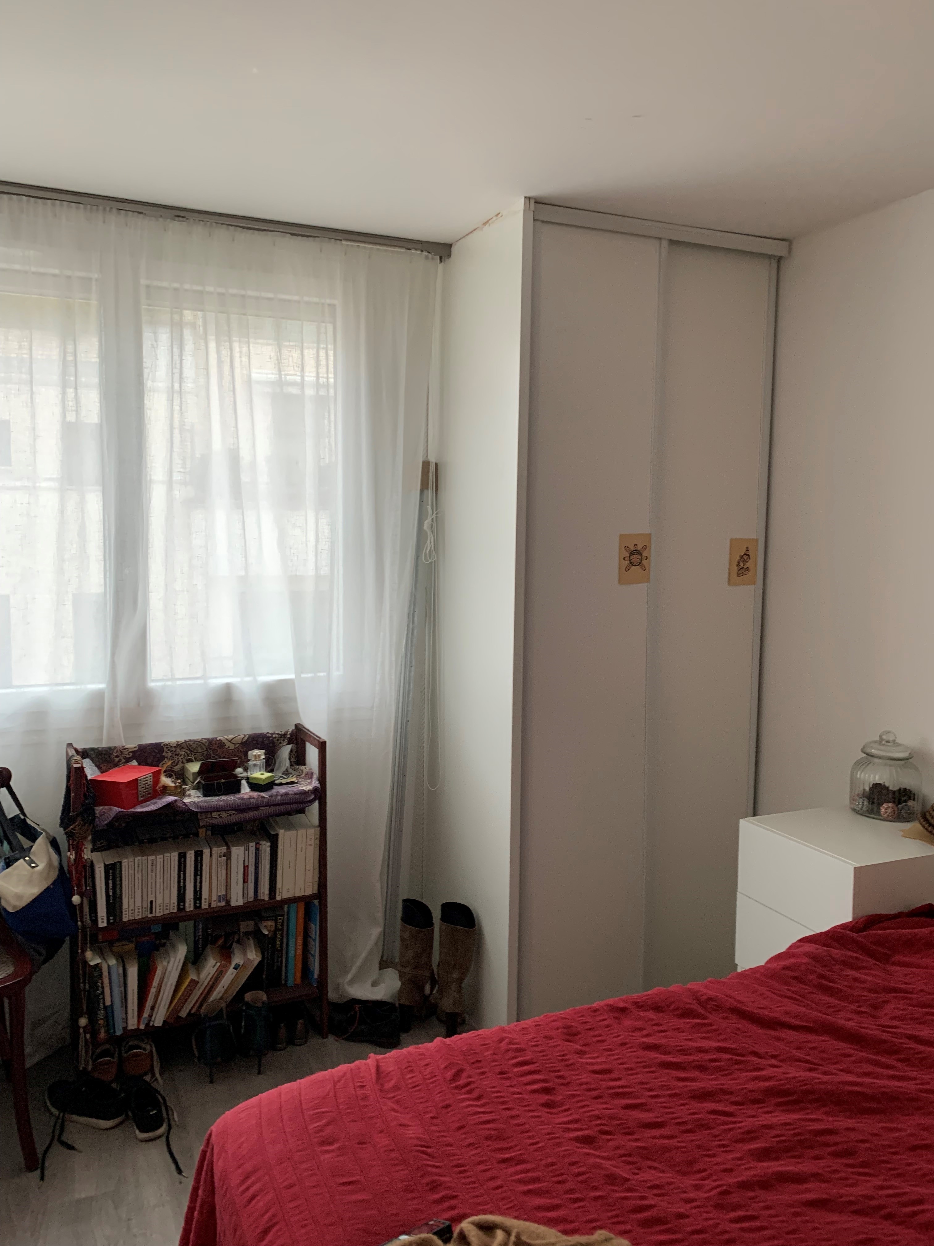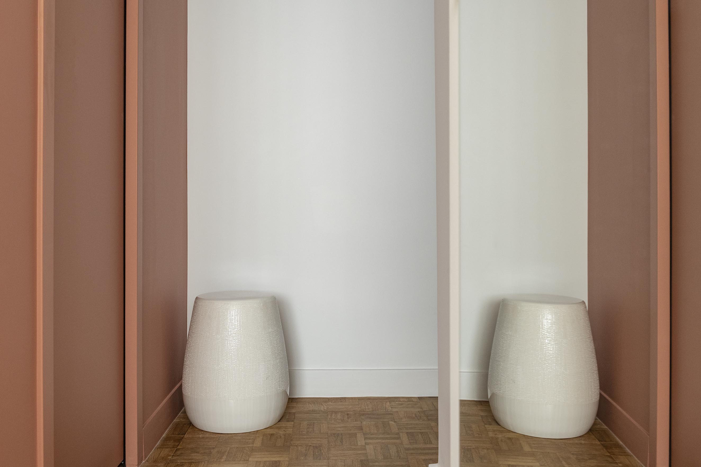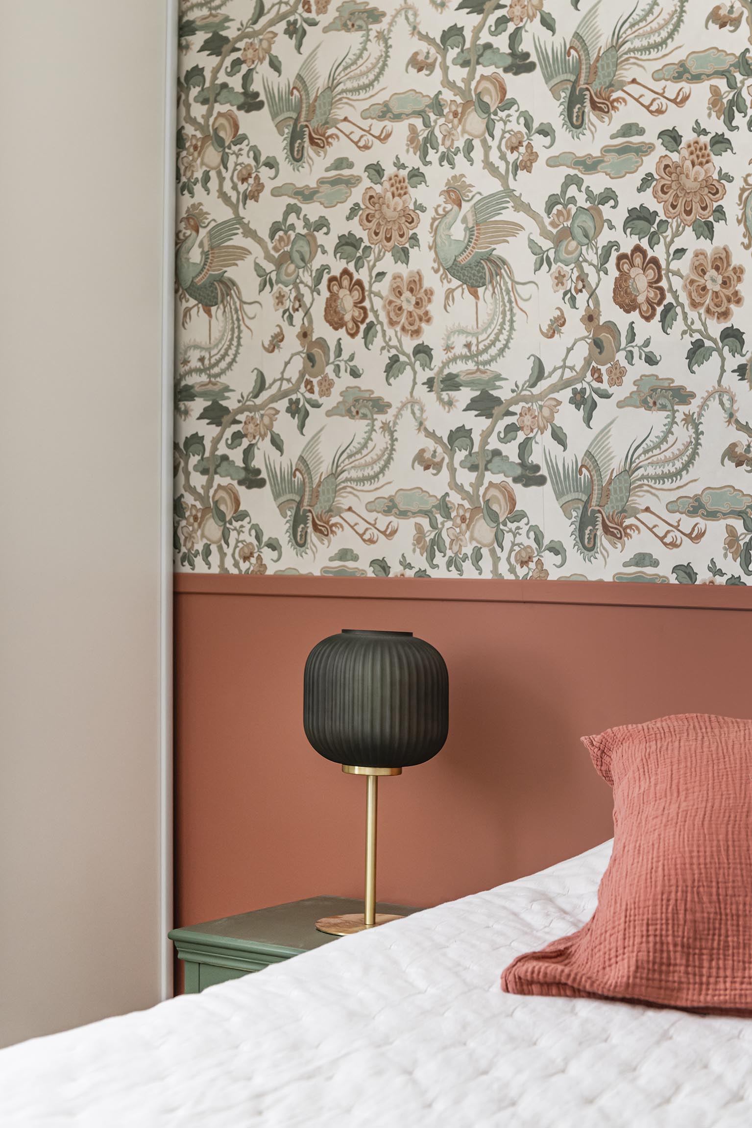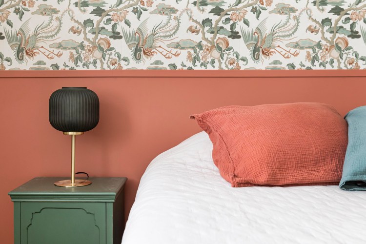 Dans la chambre qui a été réduite, l’idée était d’optimiser les rangements et de la rendre plus claire et cosy afin d’oublier qu’elle a perdu un petit mètre carré. On a ajouté un placard sous la fenêtre, assorti à la penderie existante. Les portes blanches coulissantes sont pratiques et se fondent dans le décor sur une base de blanc. Afin de donner de la perspective dès l’entrée de la chambre, un gros travail à 4 mains à été réalisé avec la cliente pour créer la tête de lit et trouver l’accord parfait entre le papier peint et la peinture terracotta du soubassement.