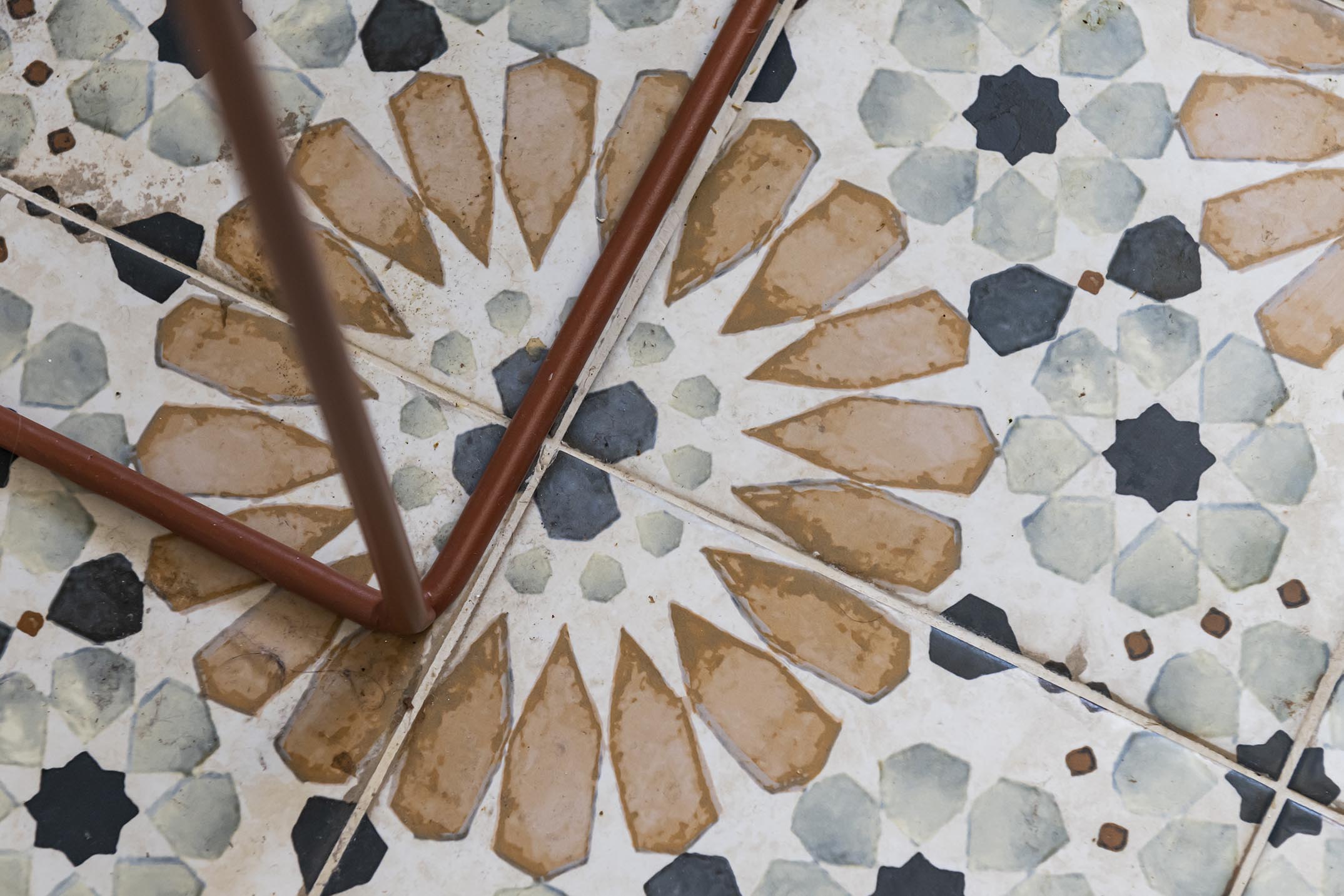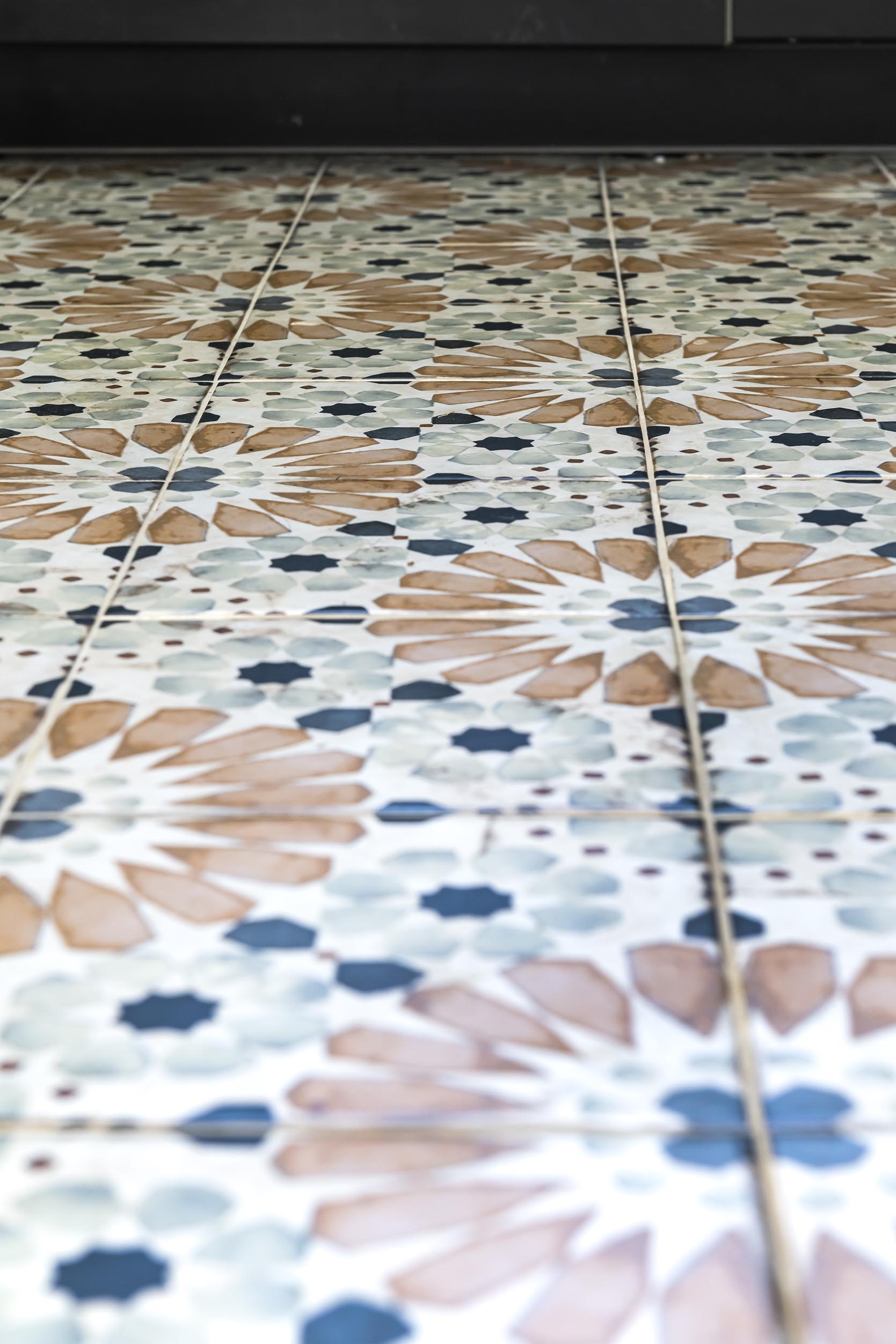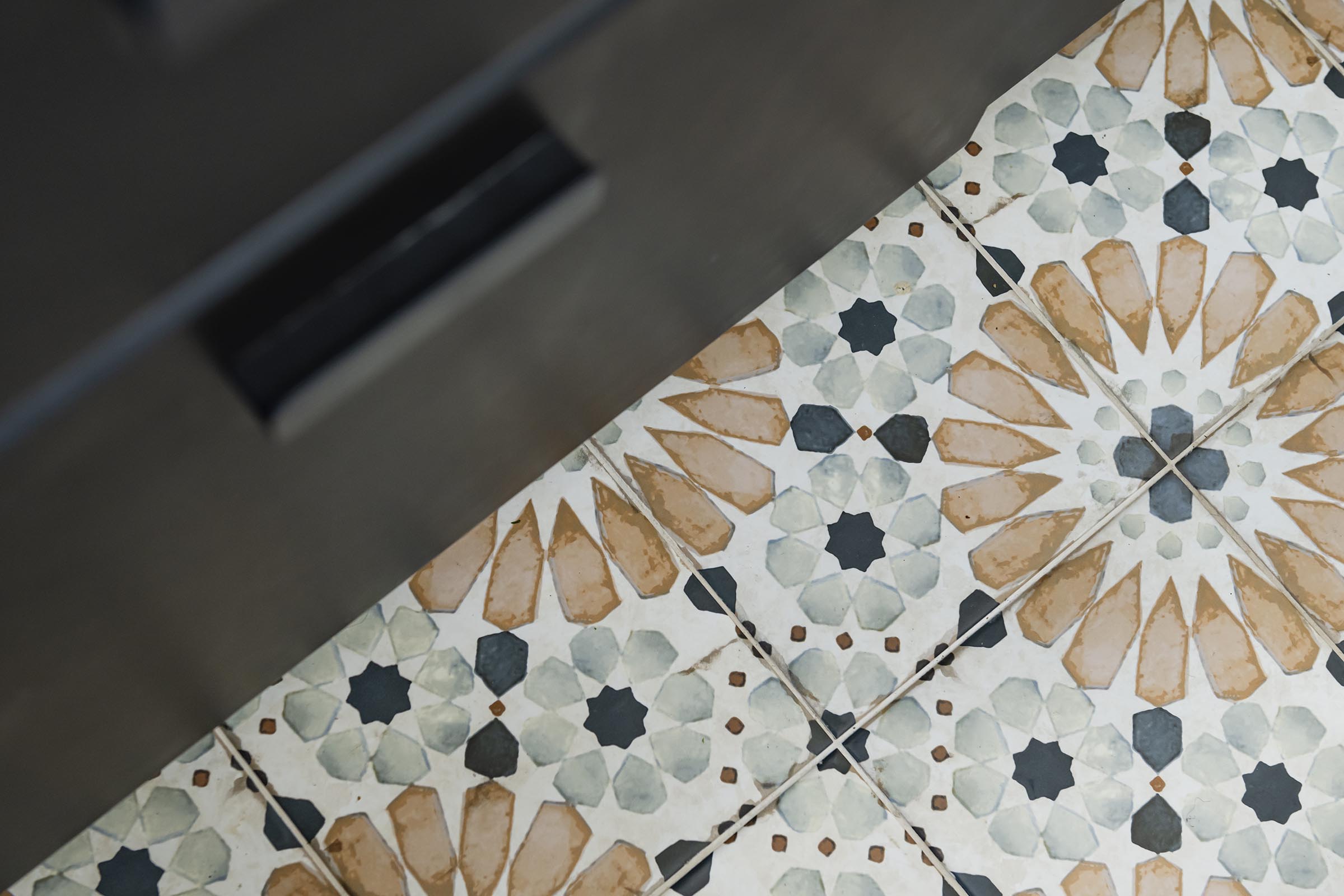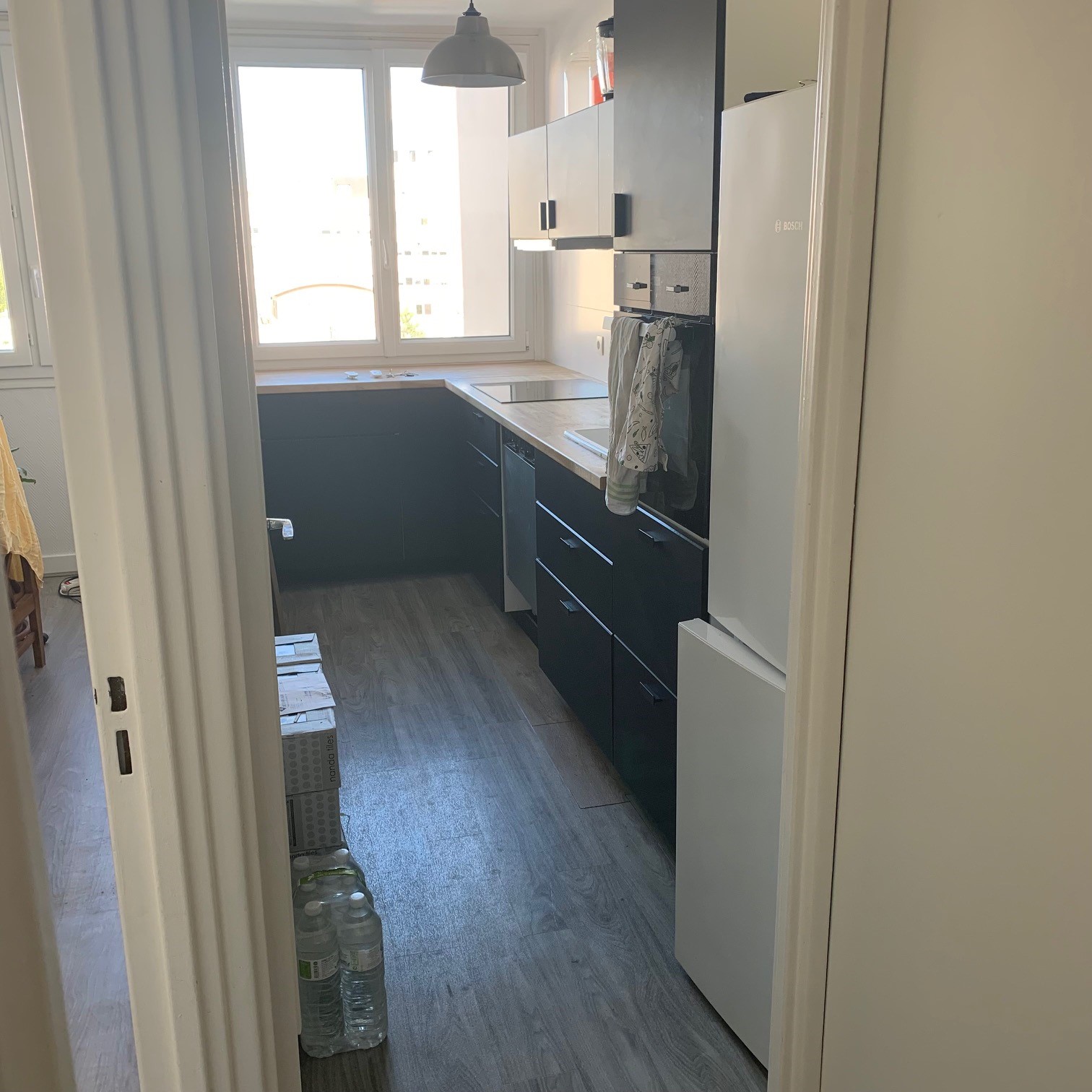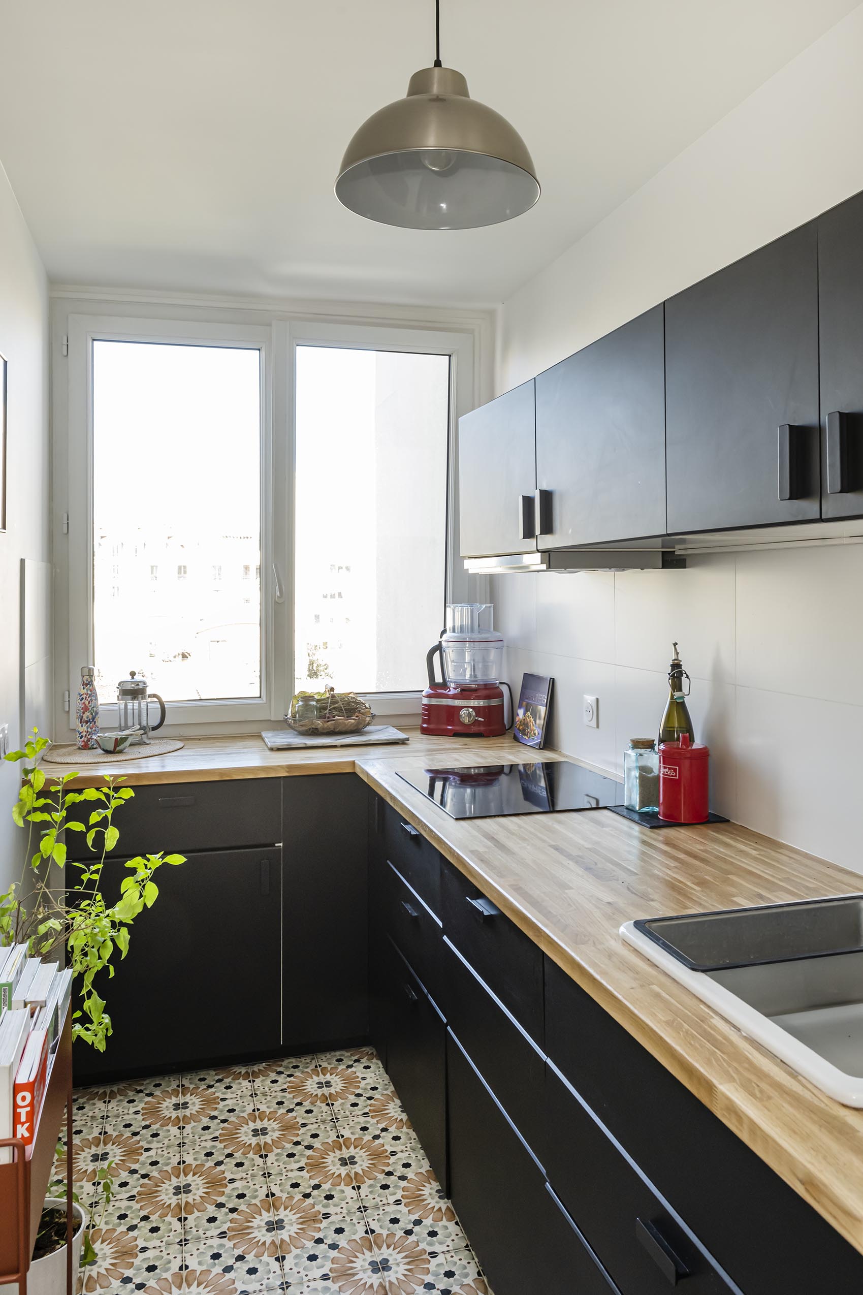 La cuisine était déjà noire mate mais avec un sol gris foncé mal posé. Nous avons redonné un coup de jeune au plan de travail en bois massif avec un ponçage et une huile de protection. Les murs ont été repeints en blanc après dépose de la toile de verre chevrons. Le changement le plus spectaculaire se situe au niveau du sol avec ce carrelage très coloré et graphique effet carreaux de ciment qui donne du caractère à la cuisine et propose un contraste très intéressant avec le noir.