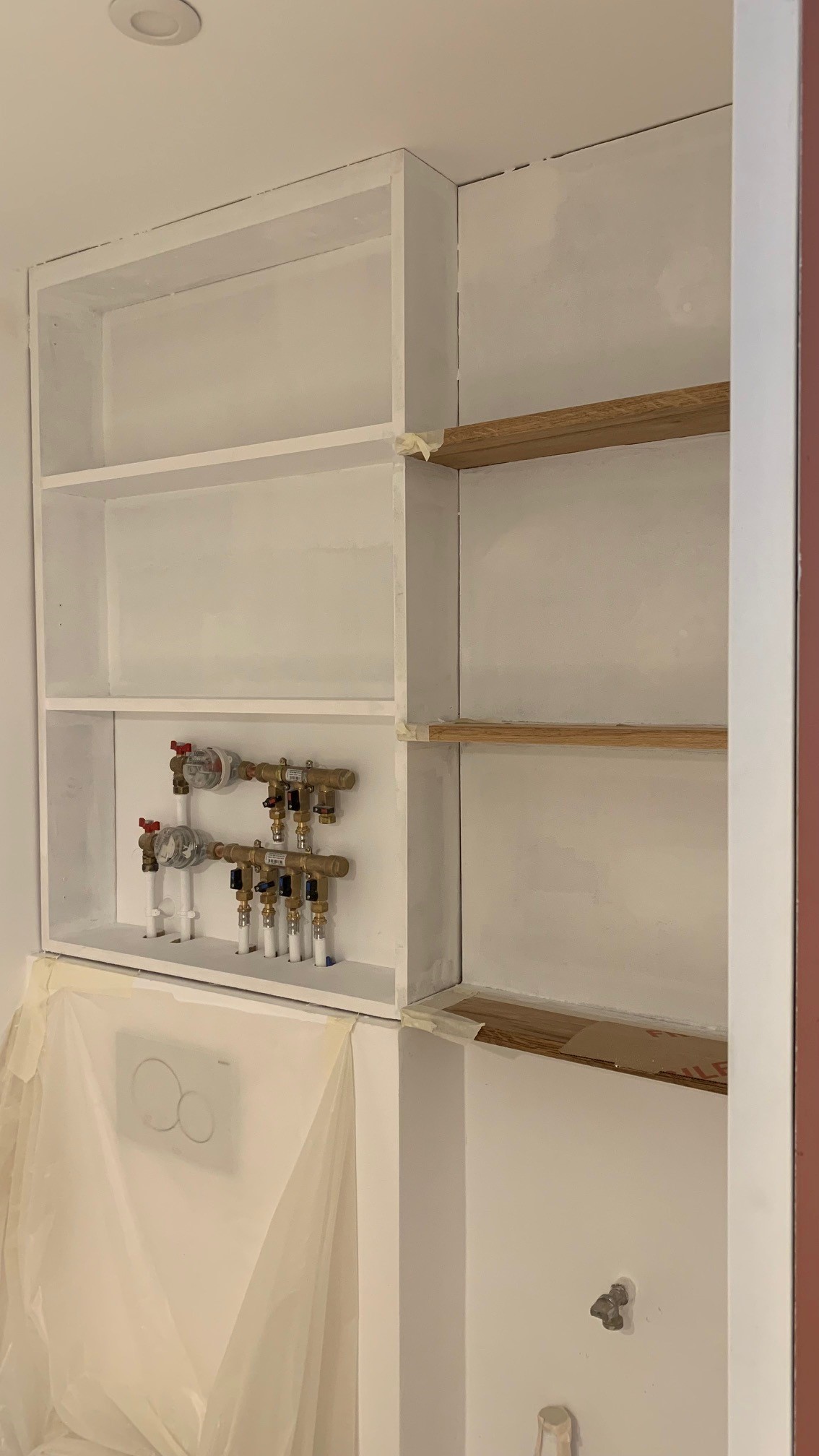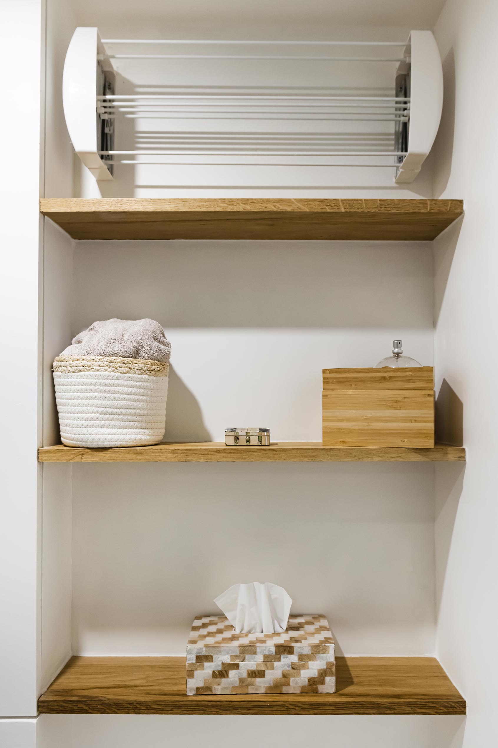 Dans cette nouvelle salle d’eau, nous avons réussi à caser un vrai meuble vasque de 80 cm de large en teck massif avec beaucoup de rangements, une grande douche d’angle avec un receveur pentagonal du commerce (par souci budgétaire, nous avons anticipé la taille du receveur et repositionné la nouvelle cloison pour que le receveur s’encastre parfaitement dans l’angle, comme s’il était sur mesure). En revanche, il n’était pas possible de trouver la paroi de douche en angle de 45° dans le commerce. La paroi sur mesure a été la petite folie du projet. En effet, dans un projet, afin de tenir le budget, il est impératif de savoir à l’avance ce qui va coûter un peu plus cher et d’en tenir compte pour le reste des choix. Il est possible de proposer des choses originales, créatives et astucieuses sans forcément dépenser beaucoup. Les 2 dernières fonctions de la salle d’eau sont les WC suspendus au-dessus desquels on a positionné un petit placard sur mesure peint comme les murs pour le rendre quasi invisible et le lave linge sous plan surmonté de tablettes en chêne à fixations invisibles.