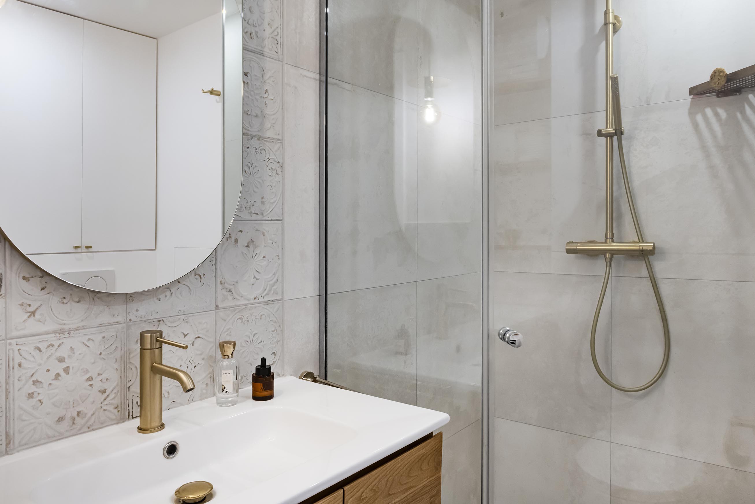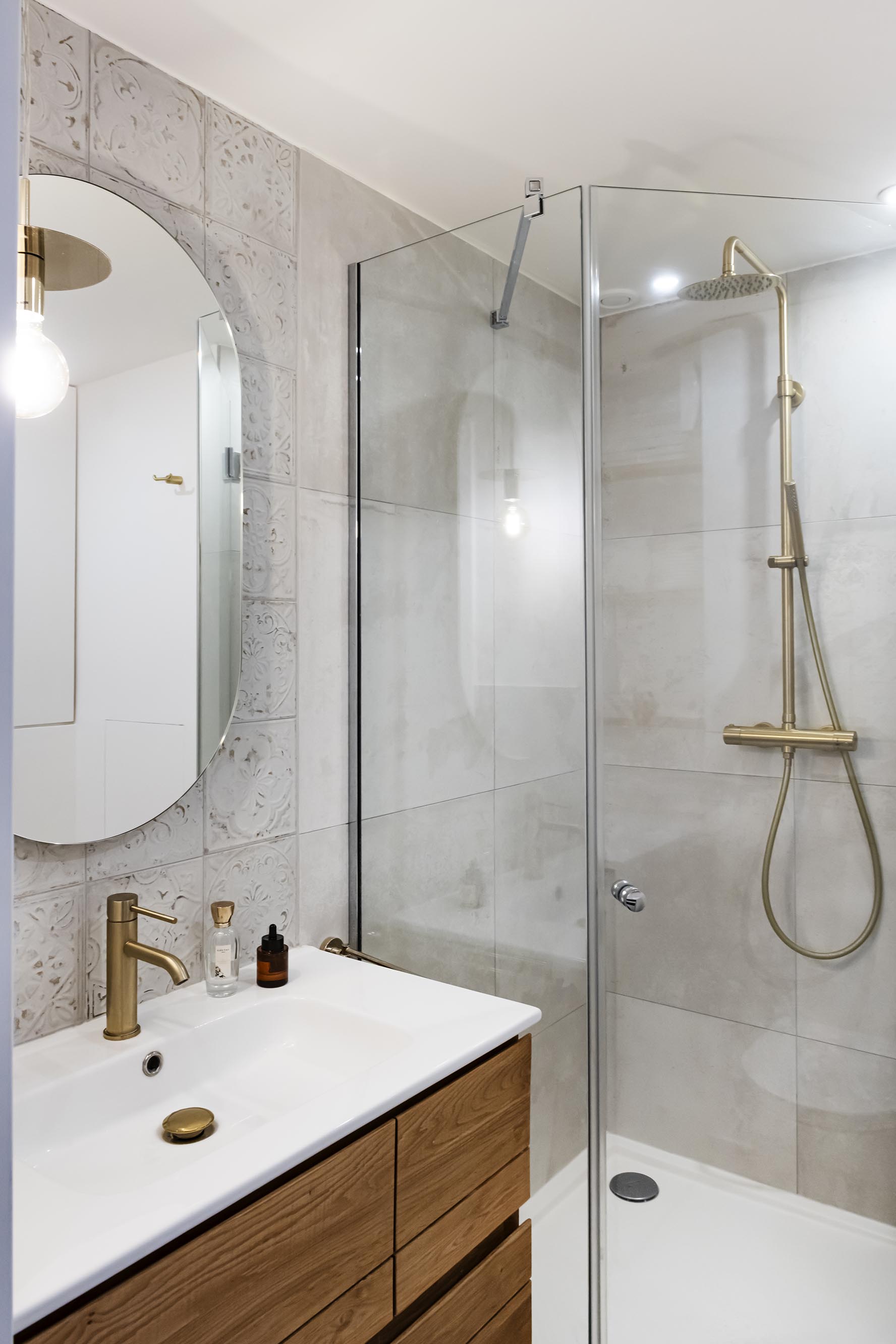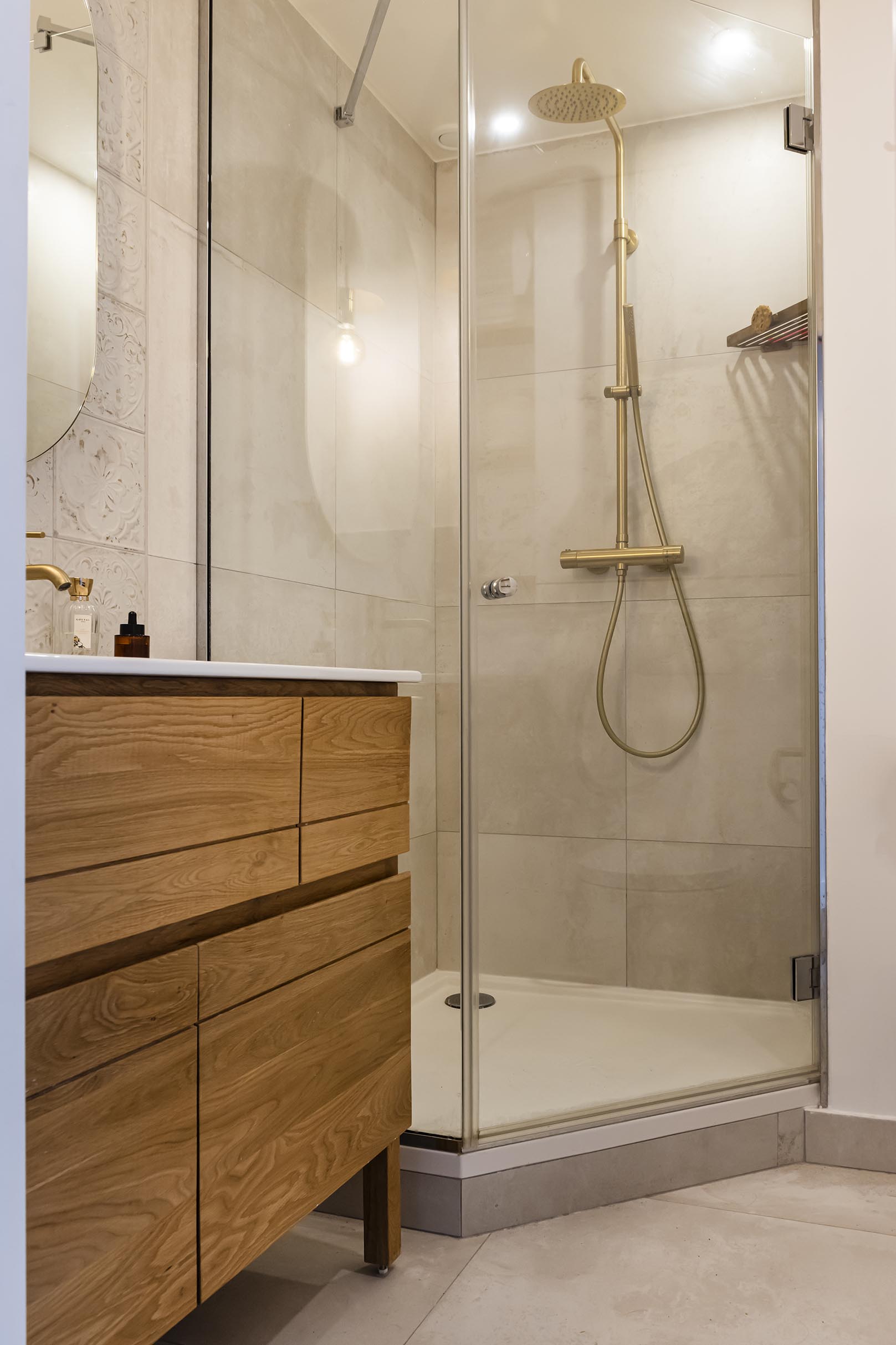 La problématique de départ dans cet appartement était la minuscule salle de bain avec baignoire, WC, lave linge et lave mains (il n’y avait même pas la place de mettre un vrai meuble vasque !). La grande décision a été de faire le choix de décaler la cloison d’environ 30 cm vers la chambre qui était de taille suffisante. Afin d’optimiser l’espace dans la future salle d’eau (la cliente souhaitait une douche), j’ai proposé de déplacer la porte en partie centrale pour une distribution en étoile car il fallait caser 4 fonctions dans environ 3m². Le système de porte à galandage s’est naturellement imposé pour fluidifier la circulation. Côté déco, j’ai proposé un esprit bohème / Japandi dans des tons très clairs avec des touches de bois et de laiton pour ne pas surcharger ce petit espace. Nous sommes parties des carrelages texturés de la crédence pour lesquels la cliente a eu un véritable coup de cœur pour décliner la décoration du reste de la pièce.