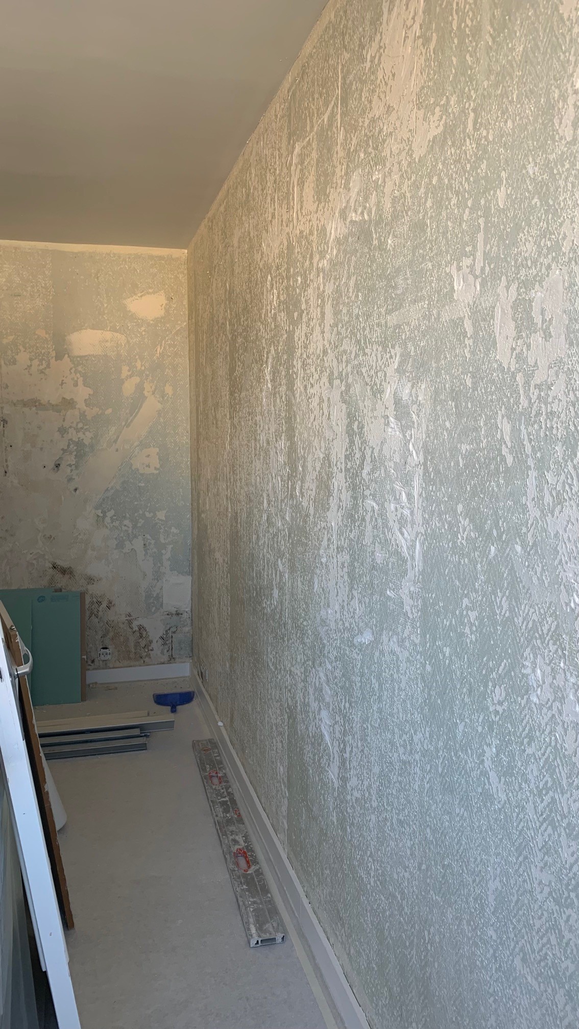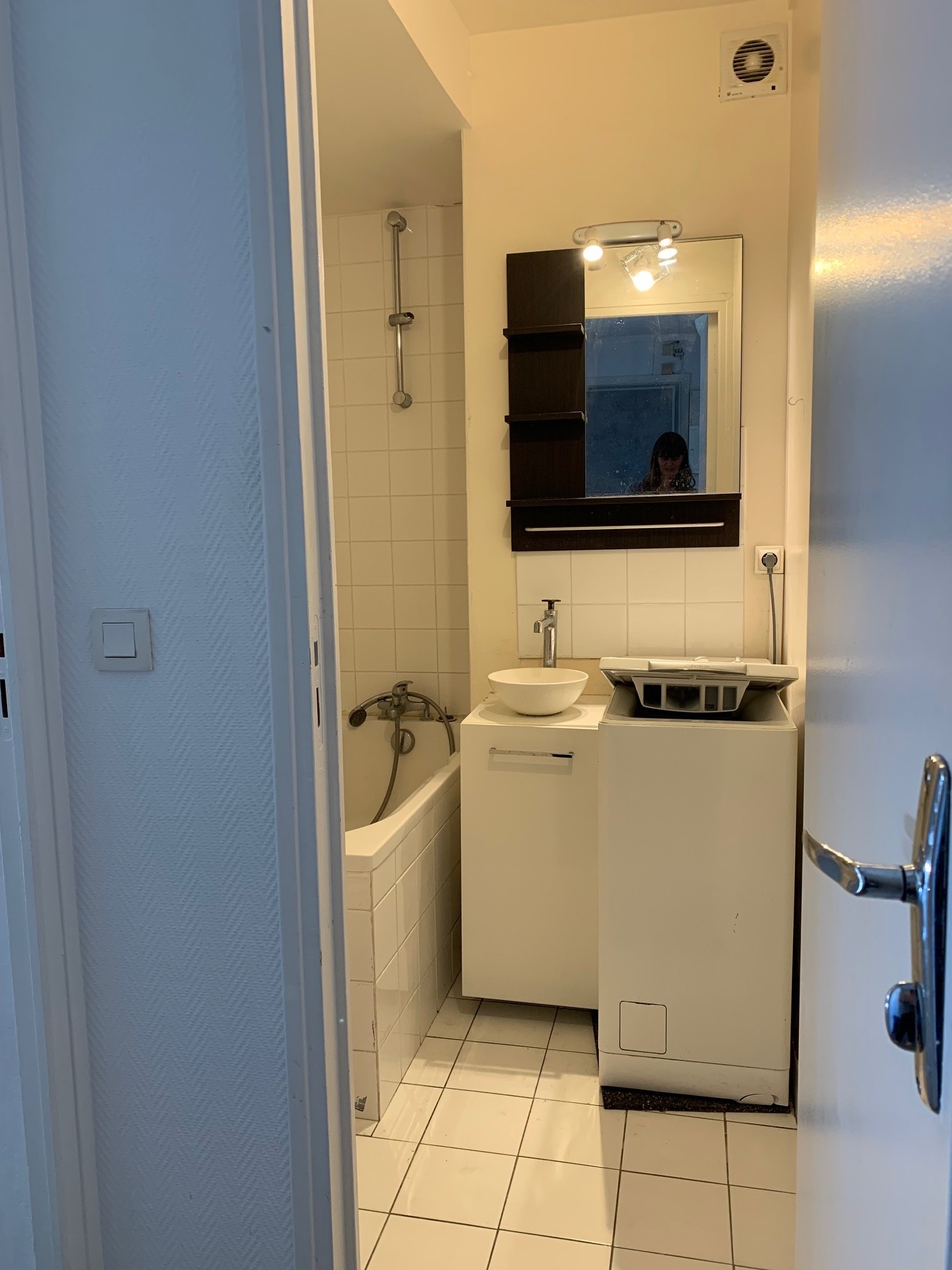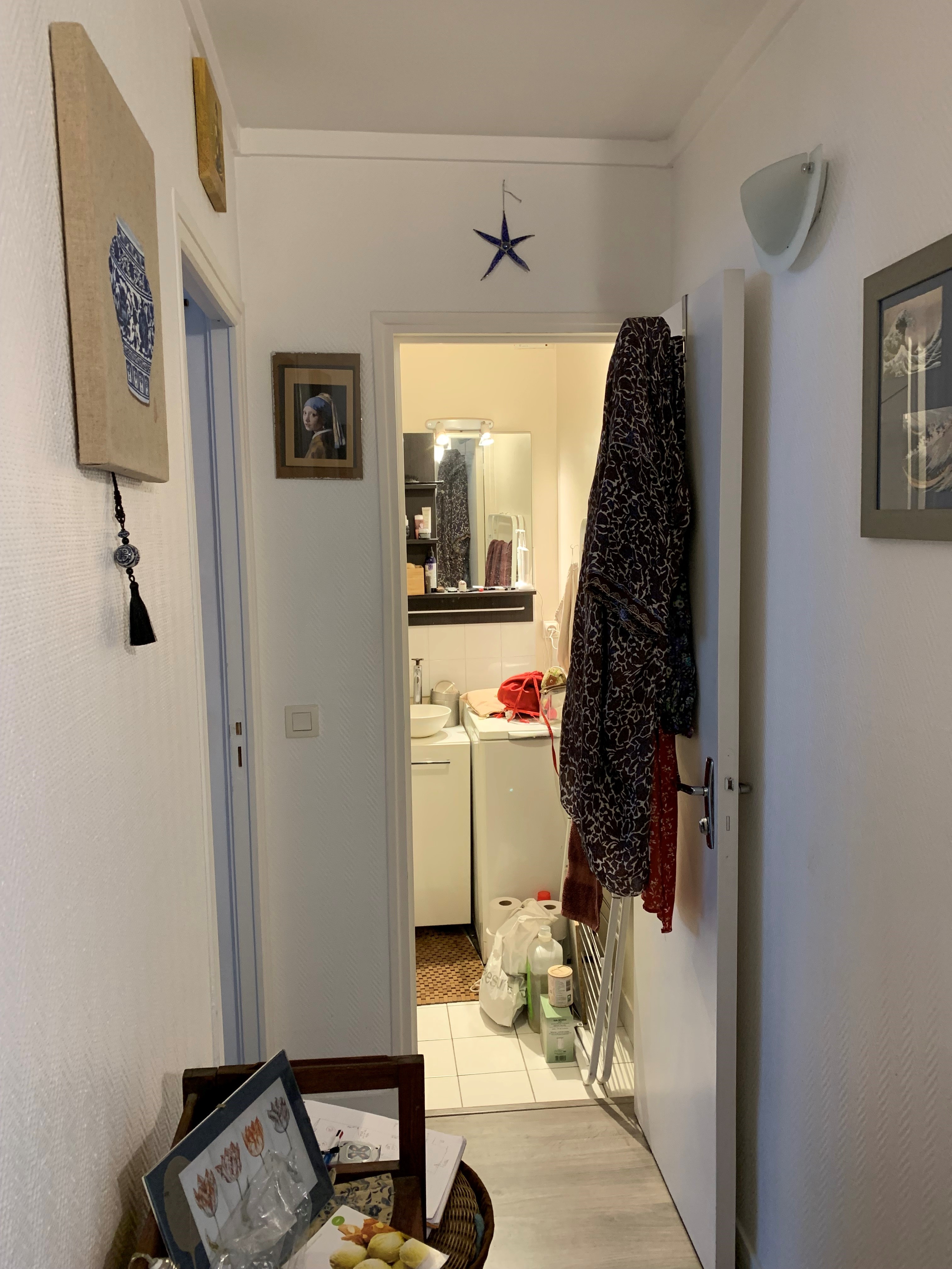 La problématique de départ dans cet appartement était la minuscule salle de bain avec baignoire, WC, lave linge et lave mains (il n’y avait même pas la place de mettre un vrai meuble vasque !). La grande décision a été de faire le choix de décaler la cloison d’environ 30 cm vers la chambre qui était de taille suffisante. Afin d’optimiser l’espace dans la future salle d’eau (la cliente souhaitait une douche), j’ai proposé de déplacer la porte en partie centrale pour une distribution en étoile car il fallait caser 4 fonctions dans environ 3m². Le système de porte à galandage s’est naturellement imposé pour fluidifier la circulation. Côté déco, j’ai proposé un esprit bohème / Japandi dans des tons très clairs avec des touches de bois et de laiton pour ne pas surcharger ce petit espace. Nous sommes parties des carrelages texturés de la crédence pour lesquels la cliente a eu un véritable coup de cœur pour décliner la décoration du reste de la pièce.