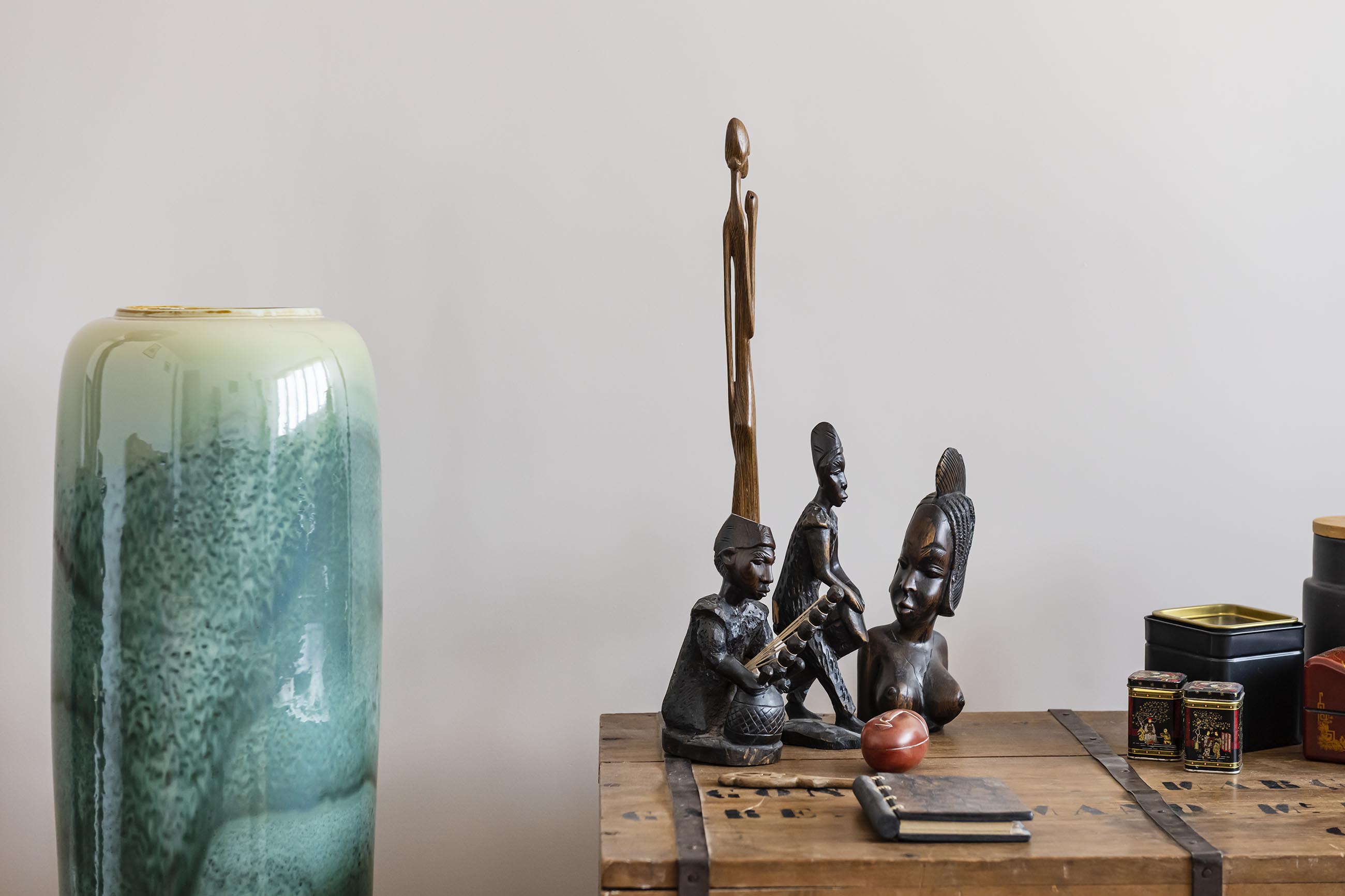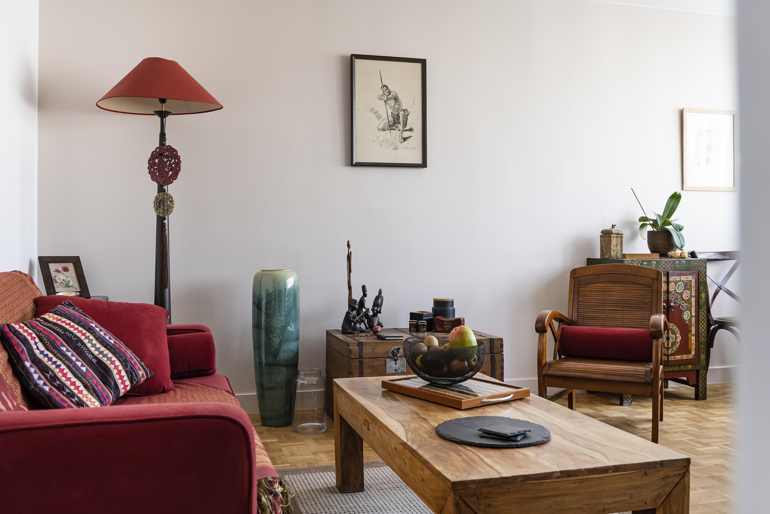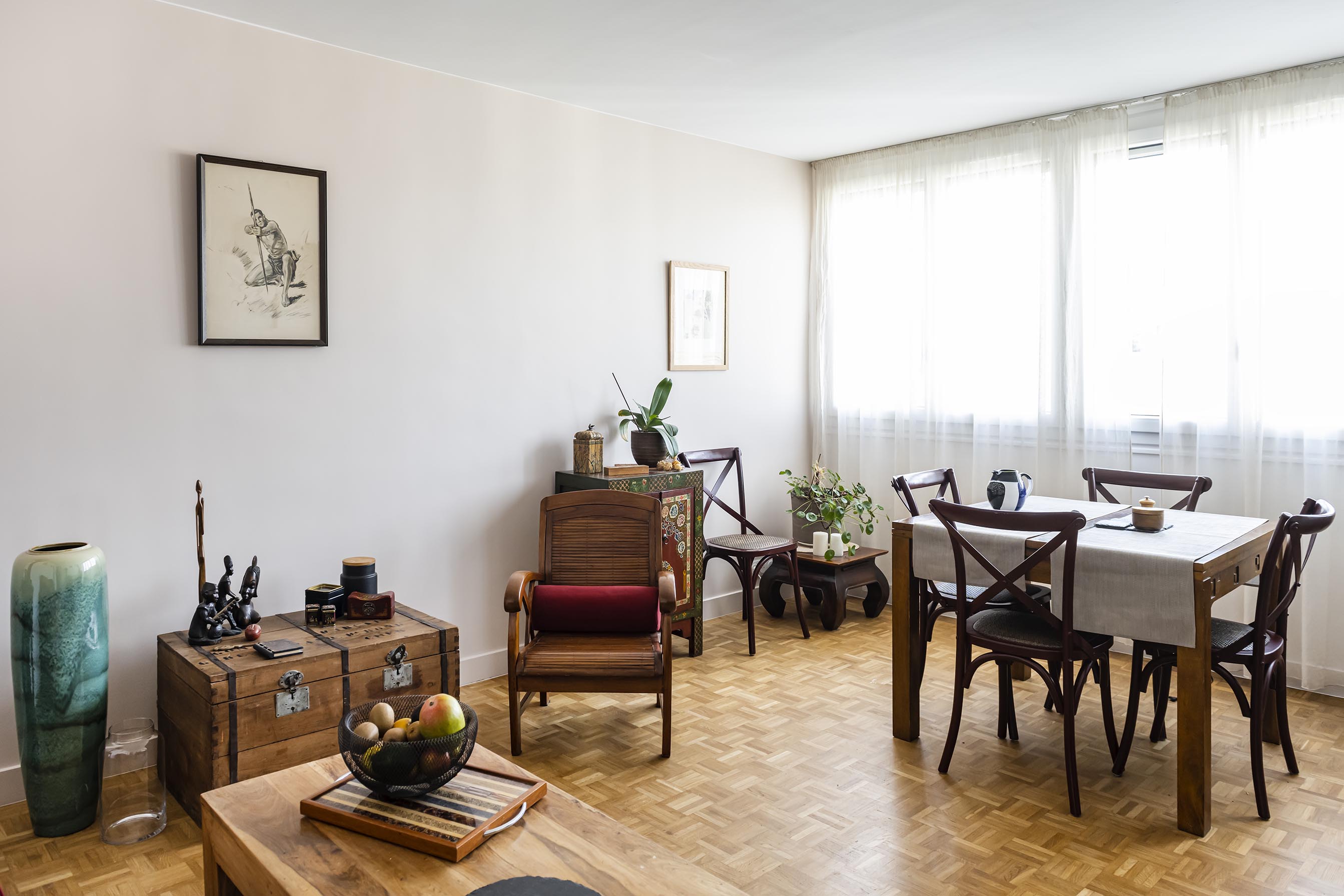 Partout dans l’appartement, les murs étaient recouverts de toile de verre à chevrons et le sol d’un stratifié gris très foncé. Avec l’artisan, nous avons proposé de récupérer le parquet Noël d’origine, typique des années de construction de l’immeuble afin de rendre l’ensemble plus chaleureux. La toile de verre retirée partout, tous les murs et plafonds ont pu être repeints et sont redevenus lisses, un vrai soulagement pour la cliente ! Dans le salon / salle à manger, nous avons conservé l’ensemble des meubles et de la décoration de la cliente mais avec ce nouveau sol et ces murs blancs et café au lait, tout s’éclaire !