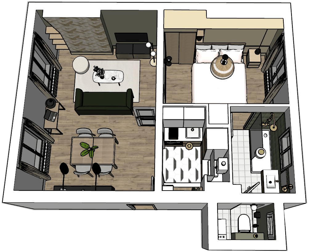 J’aime particulièrement travailler sur l’optimisation des petits espaces. Dans ce cas, la prestation de suivi de chantier est essentielle car il faut sans cesse reprendre les côtes pour s’assurer que tout rentre, au fur et à mesure de la démolition et du montage des nouvelles cloisons. La gestion des angles qui ne sont pas toujours droits est primordiale afin de vérifier que toutes les portes et les tiroirs s’ouvrent correctement. L’appartement a été loué rapidement après la fin des travaux avec un loyer bien supérieur à celui pratiqué avant la transformation. Mission accomplie.