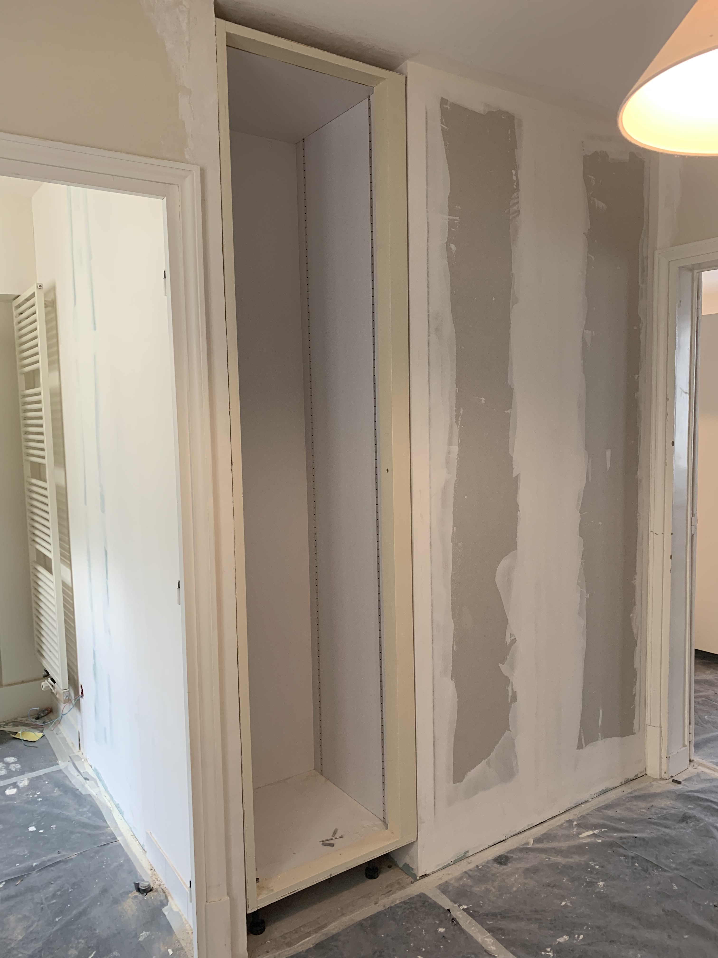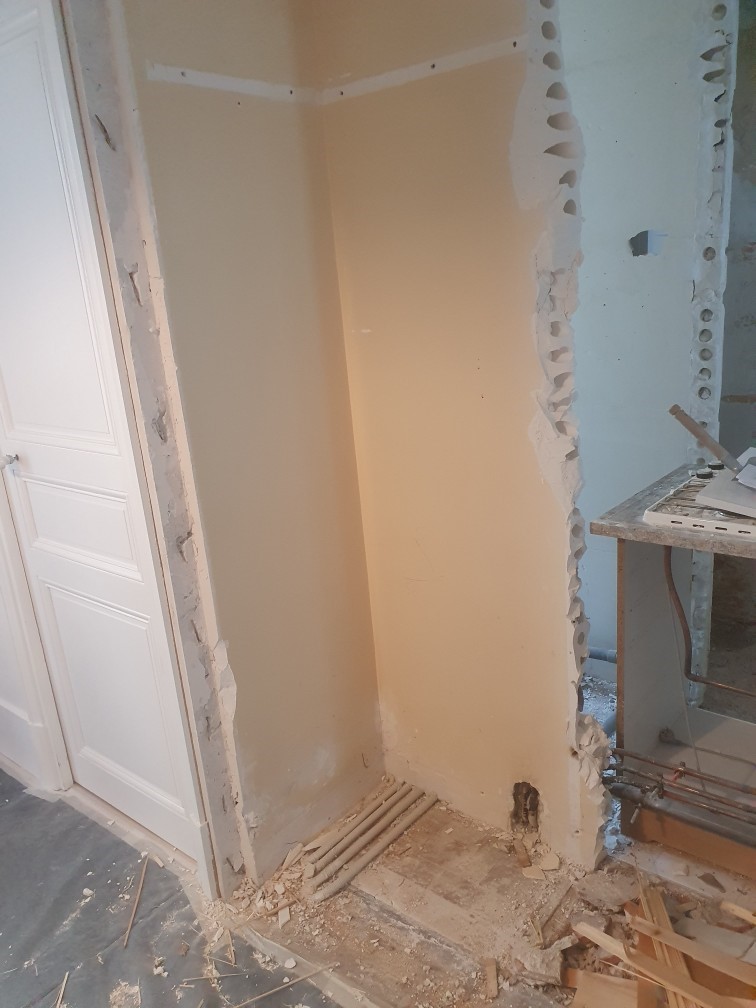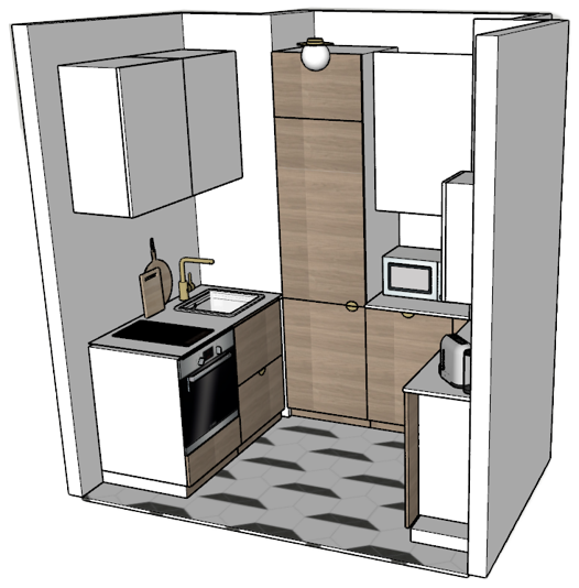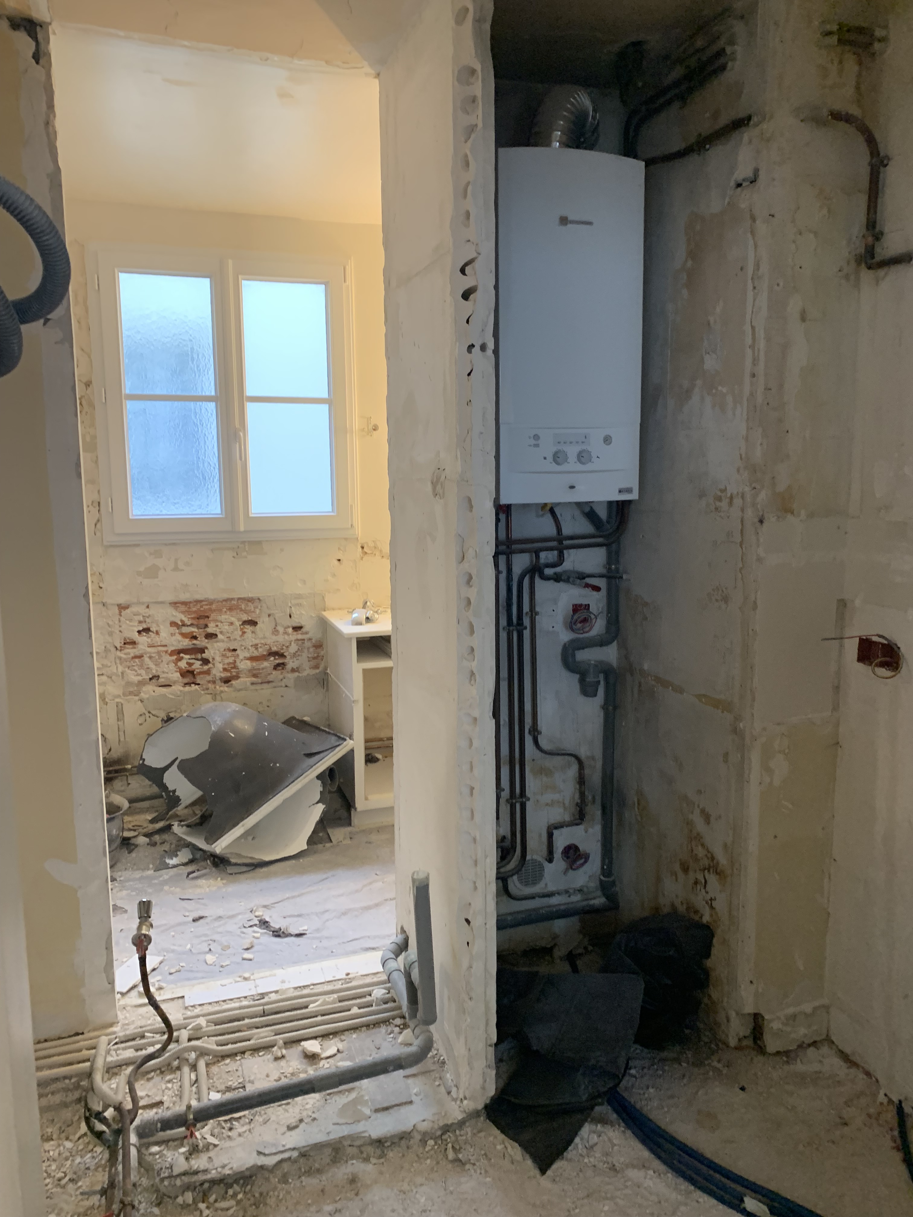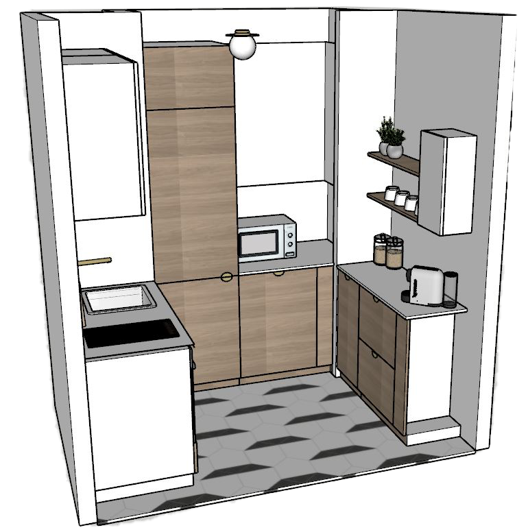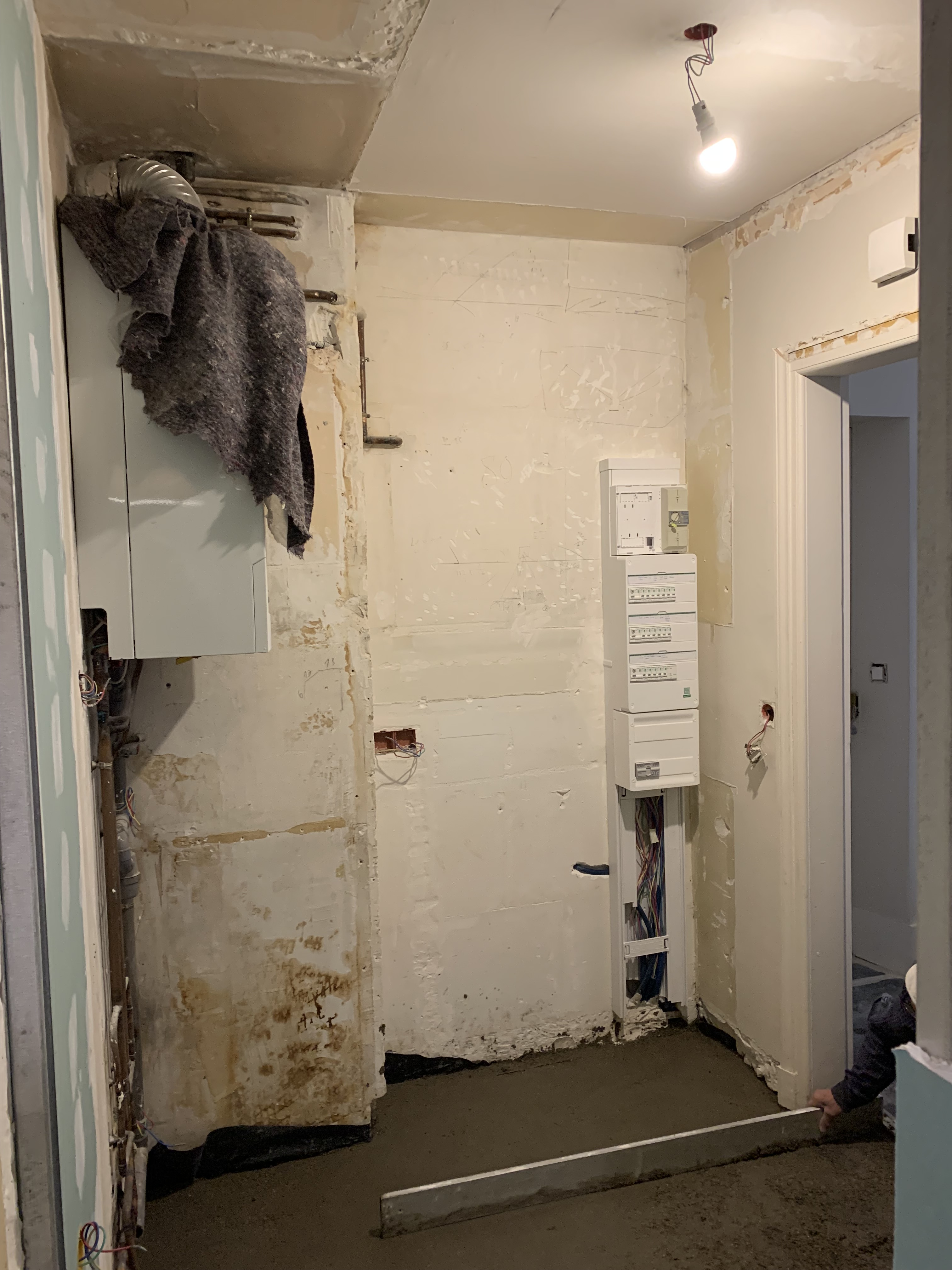 La cuisine a été digne de Tetris niveau expert ! Le client souhaitait y intégrer la chaudière, un four standard, une double plaque à induction, une hotte intégrée, un évier, un combiné frigo / congélateur et même un lave vaisselle de 60cm ! Le tout, avec un plan de travail et un peu de rangement tout de même. Et pour rendre le challenge encore plus pointu, il nous a fallu ajouter le tableau électrique que nous avions trouvé sur le palier, dans les parties communes (ce qui n’est pas aux normes).