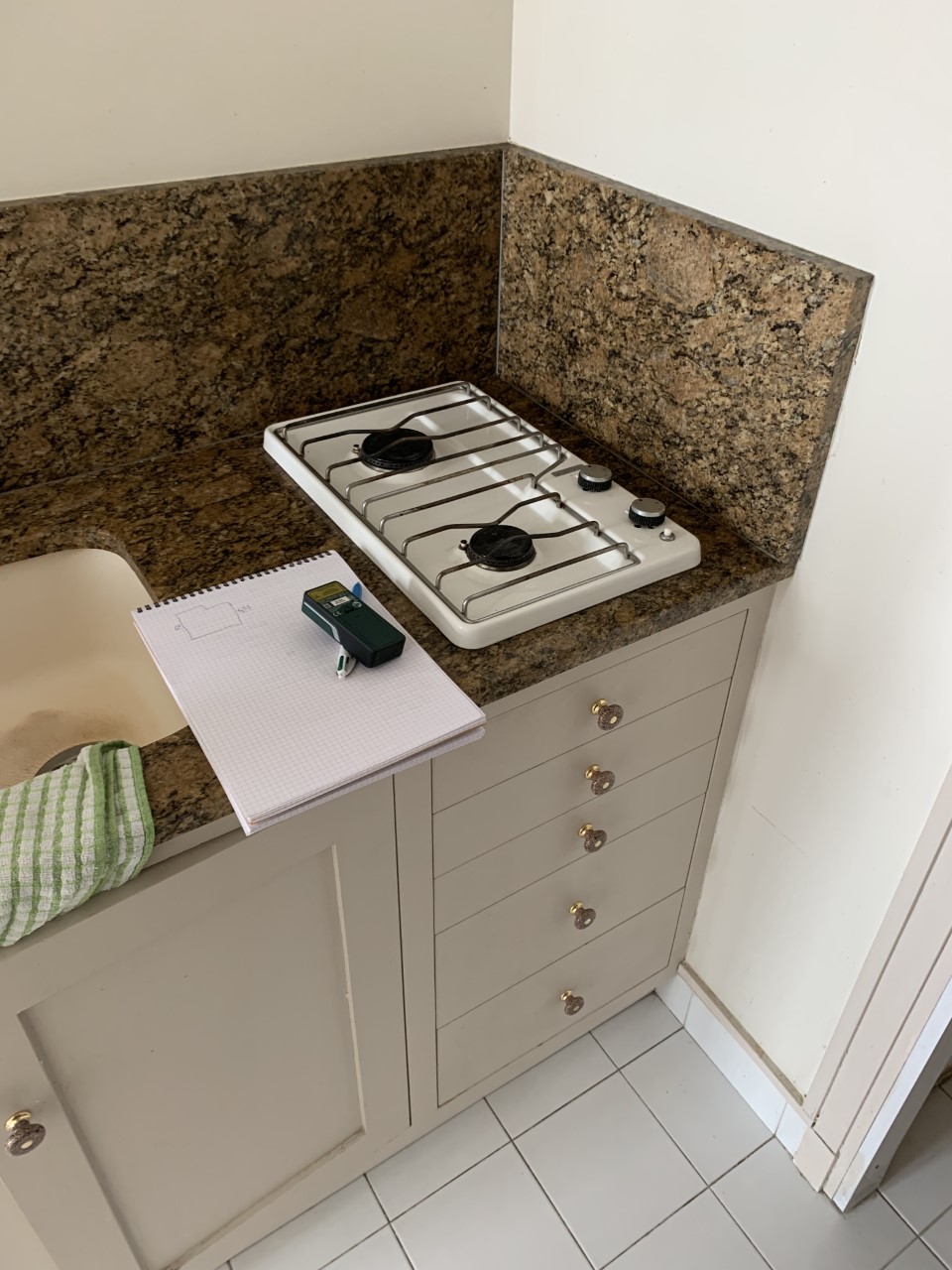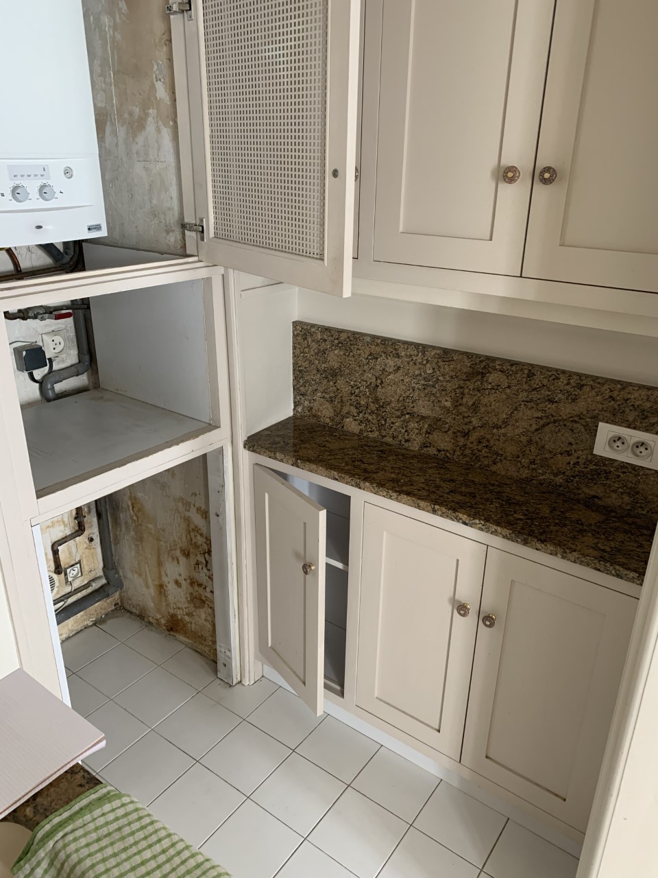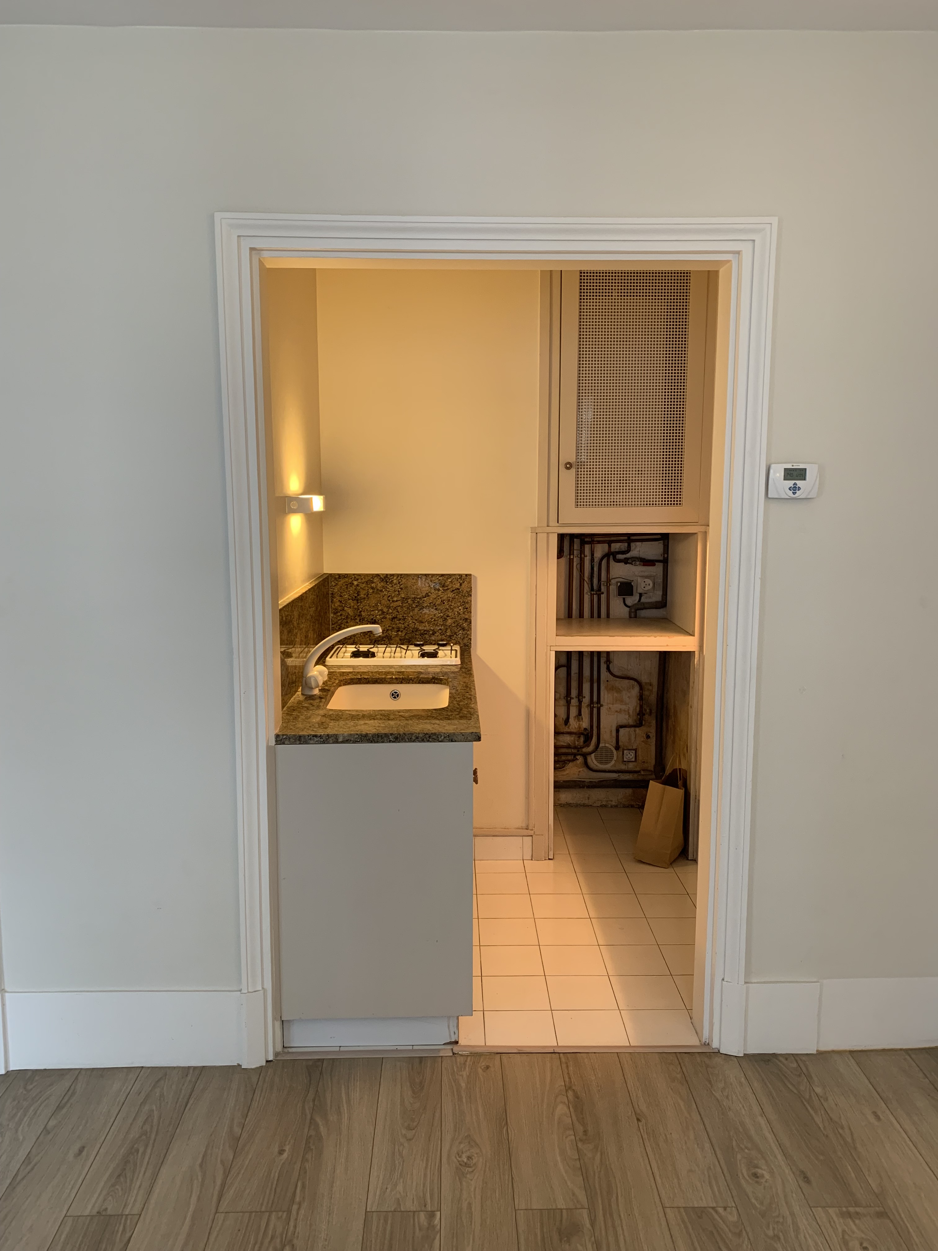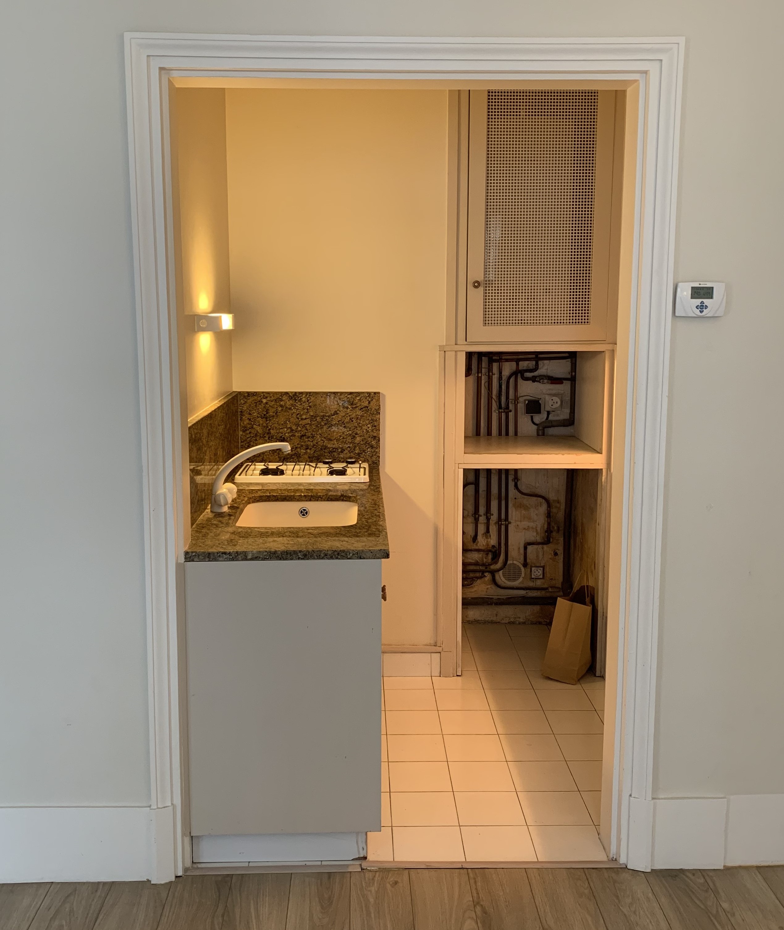 La cuisine a été digne de Tetris niveau expert ! Le client souhaitait y intégrer la chaudière, un four standard, une double plaque à induction, une hotte intégrée, un évier, un combiné frigo / congélateur et même un lave vaisselle de 60cm ! Le tout, avec un plan de travail et un peu de rangement tout de même. Et pour rendre le challenge encore plus pointu, il nous a fallu ajouter le tableau électrique que nous avions trouvé sur le palier, dans les parties communes (ce qui n’est pas aux normes).