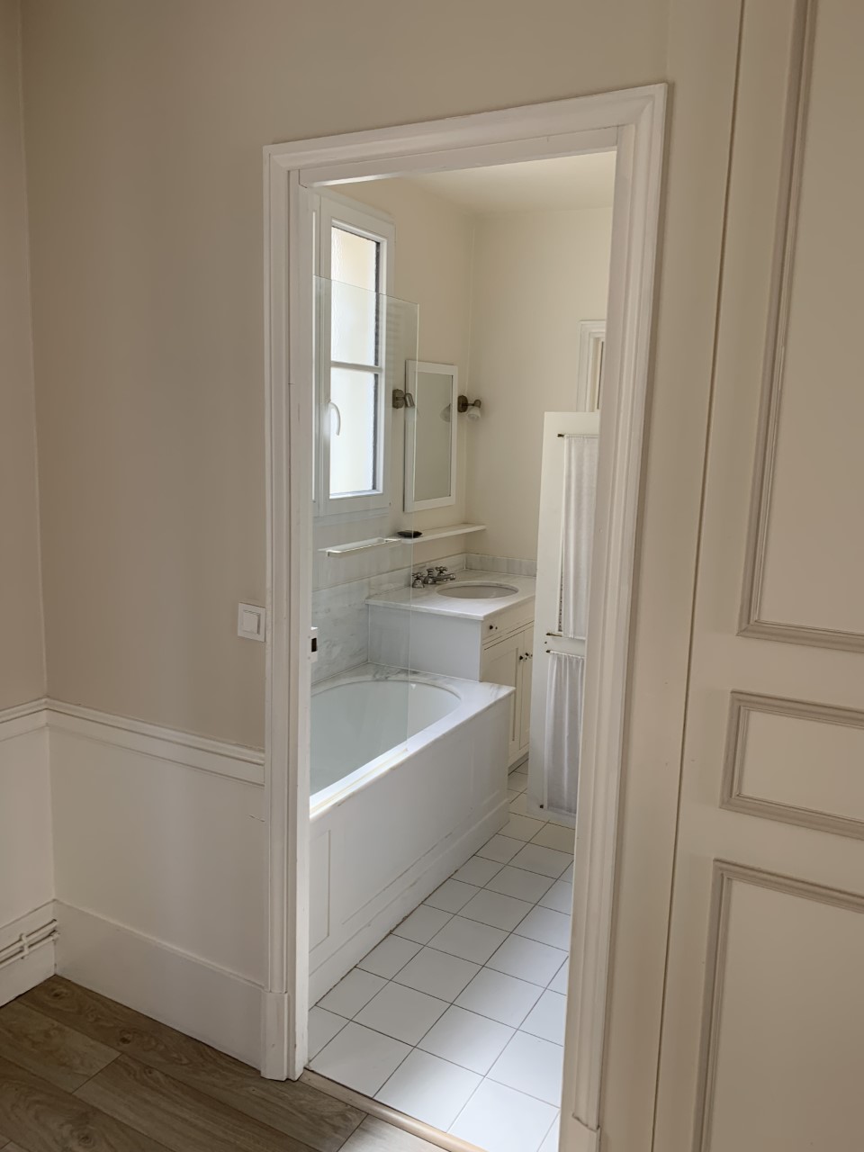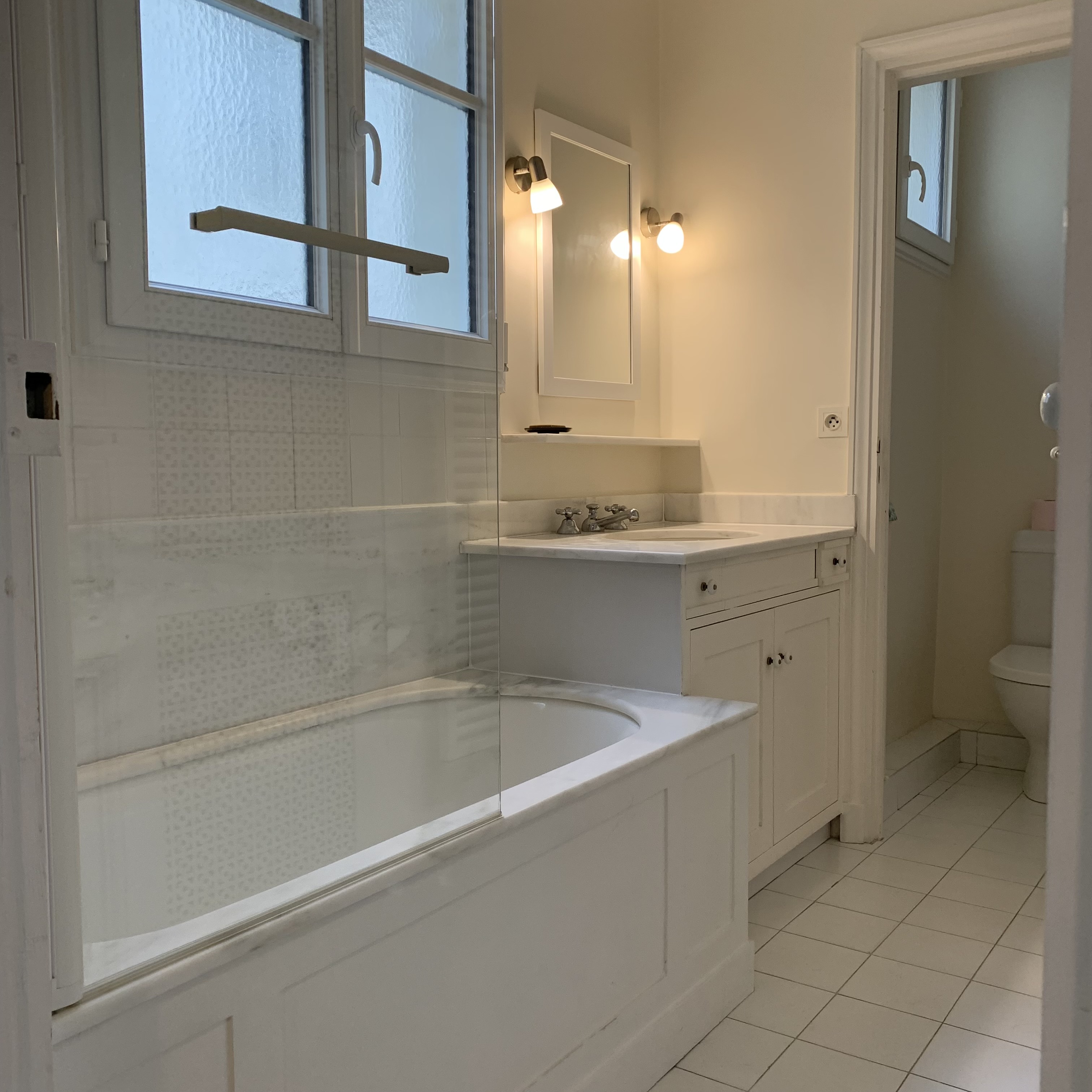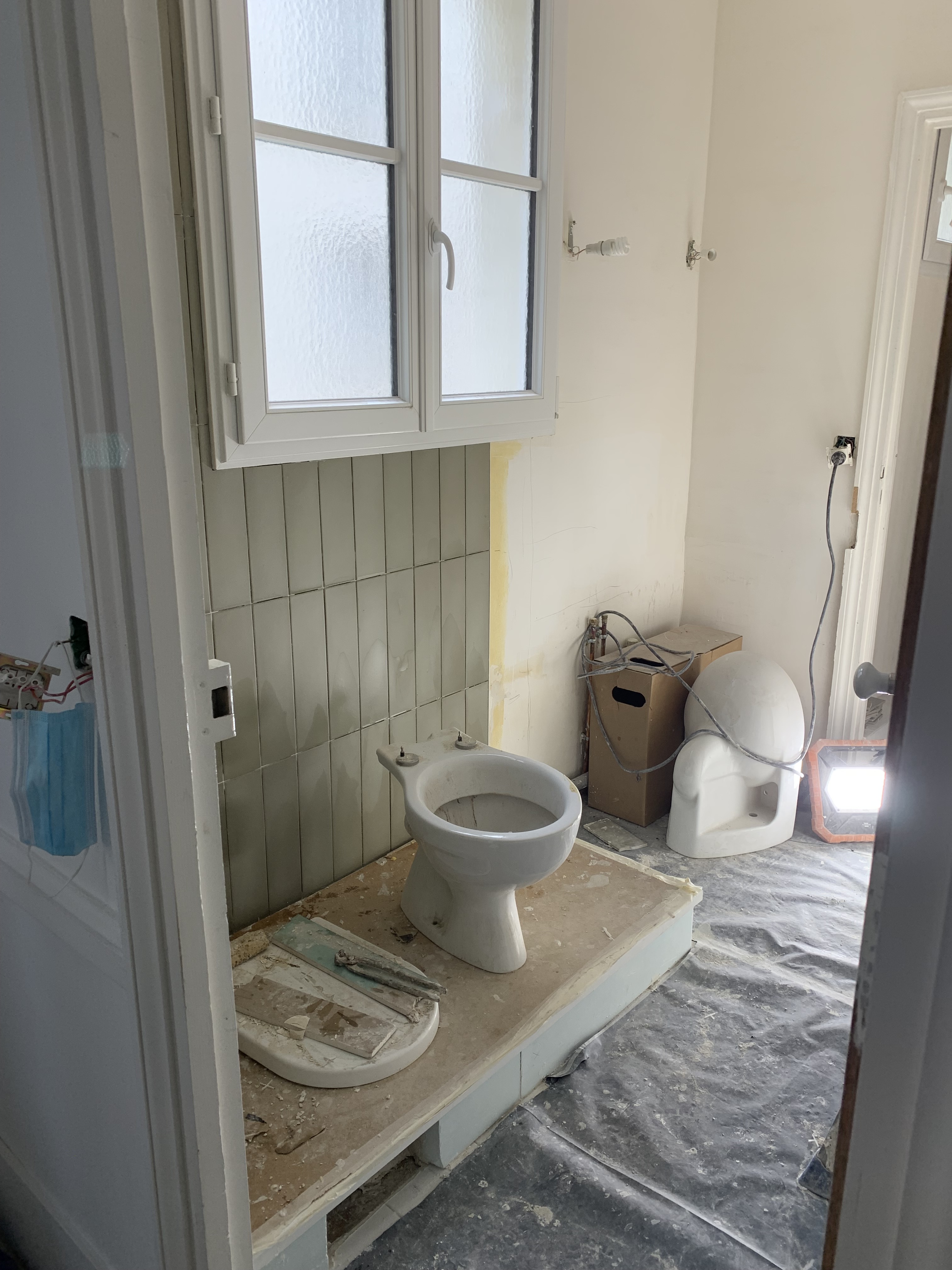 Le budget est assez serré (investissement locatif) donc il faut capitaliser sur les atouts et conserver un maximum de ce qui est en bon état ou exploitable : le parquet, les fenêtres double vitrage, le système de chauffage et, après réflexion, le carrelage du sol de la salle de bain et des WC sera conservé.
