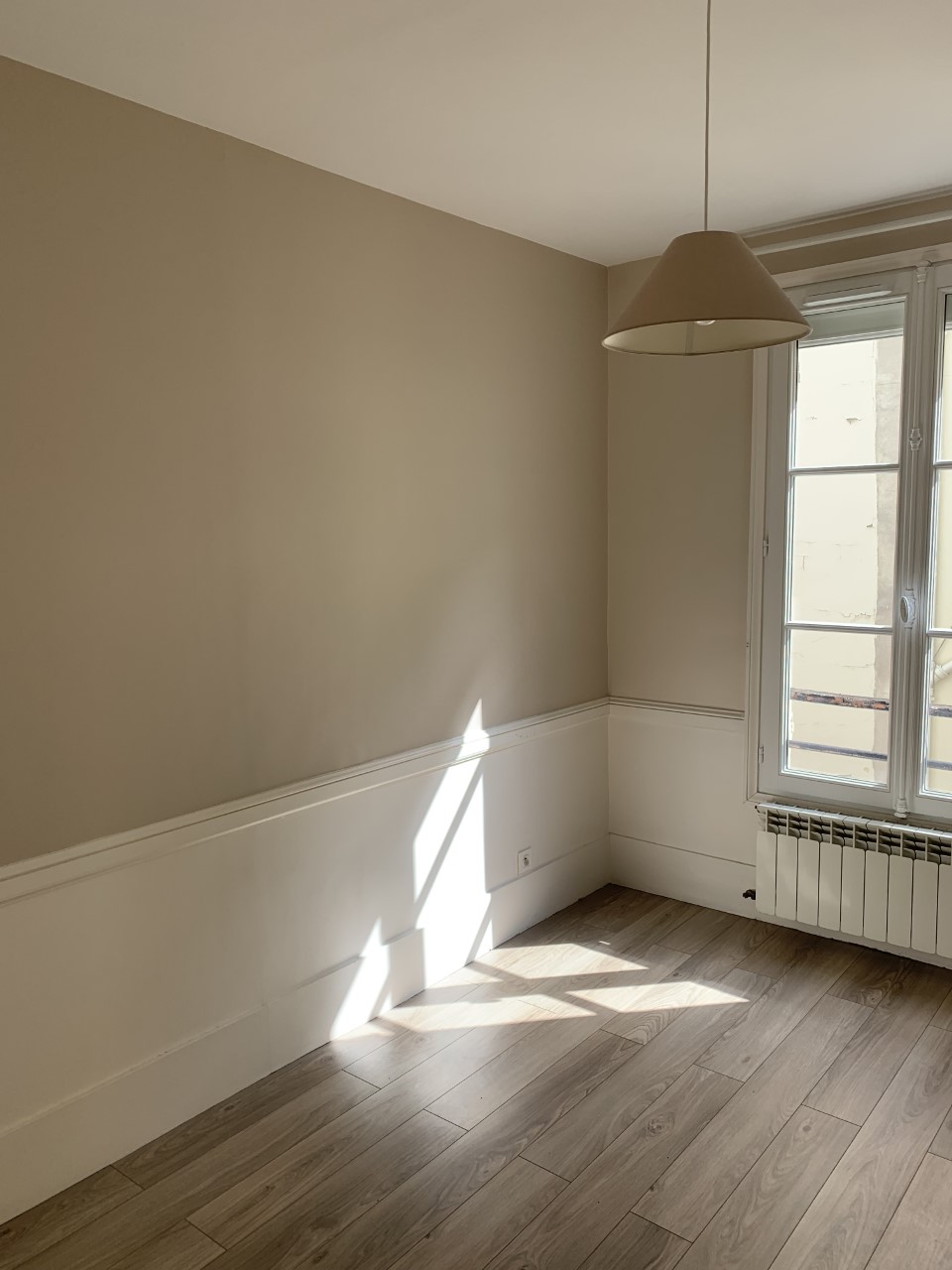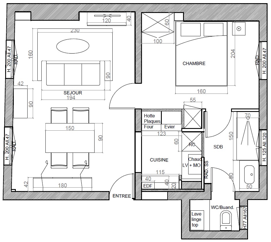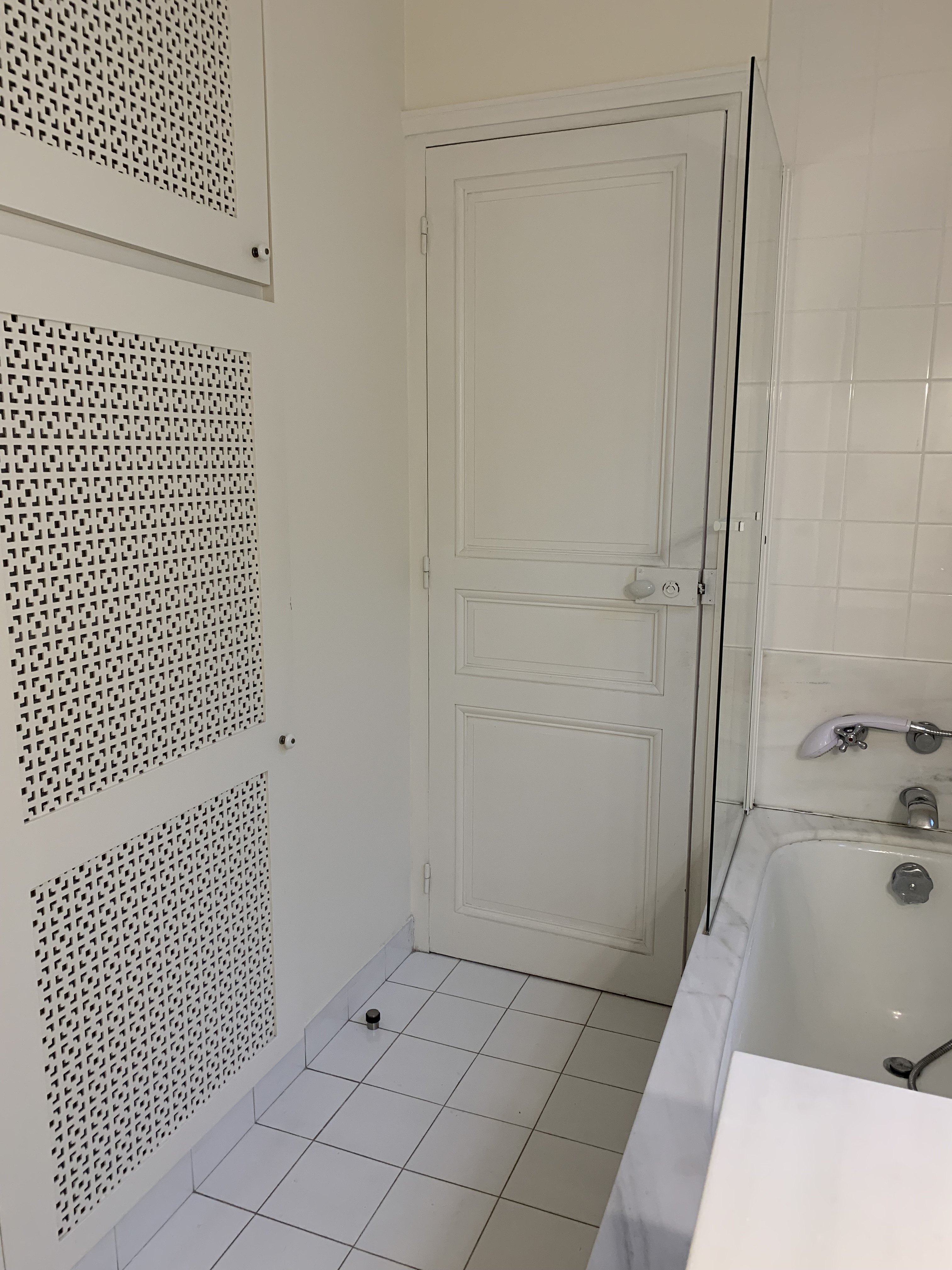 Le budget est assez serré (investissement locatif) donc il faut capitaliser sur les atouts et conserver un maximum de ce qui est en bon état ou exploitable : le parquet, les fenêtres double vitrage, le système de chauffage et, après réflexion, le carrelage du sol de la salle de bain et des WC sera conservé.