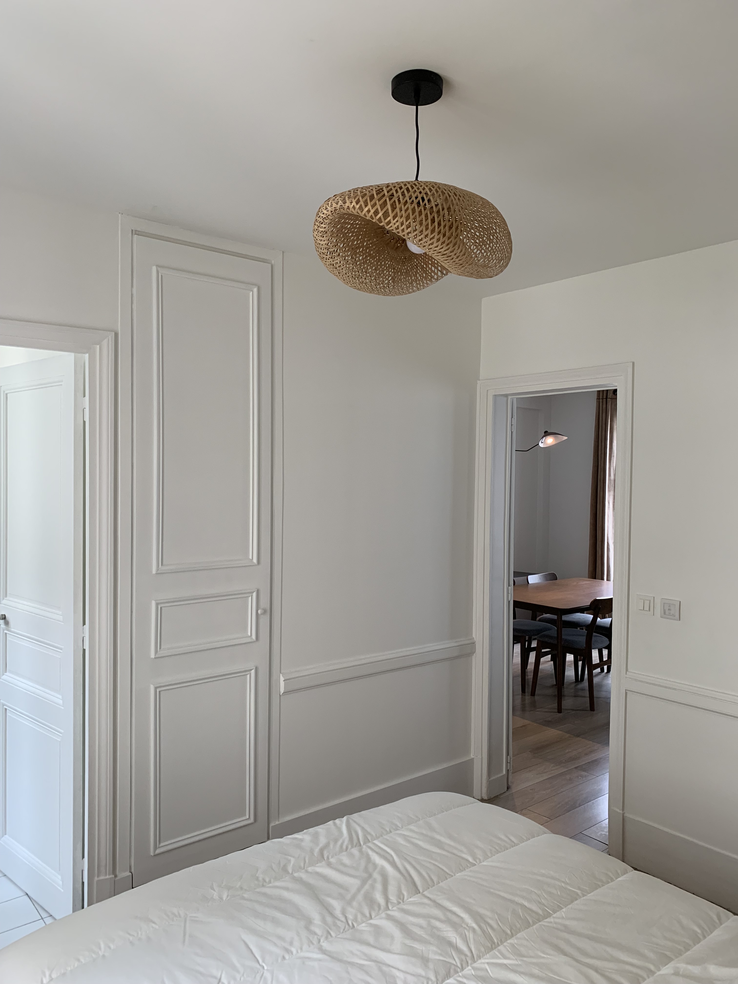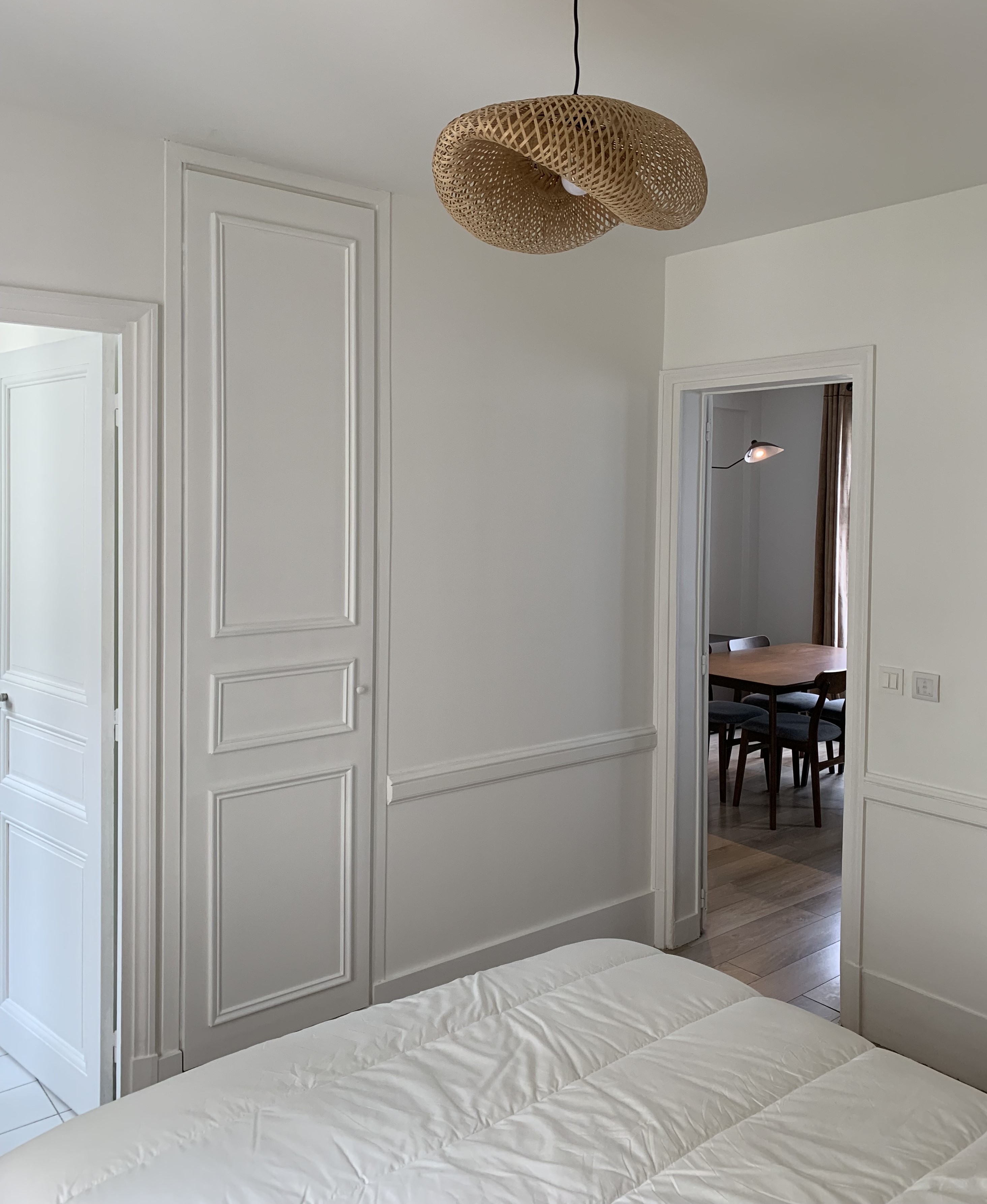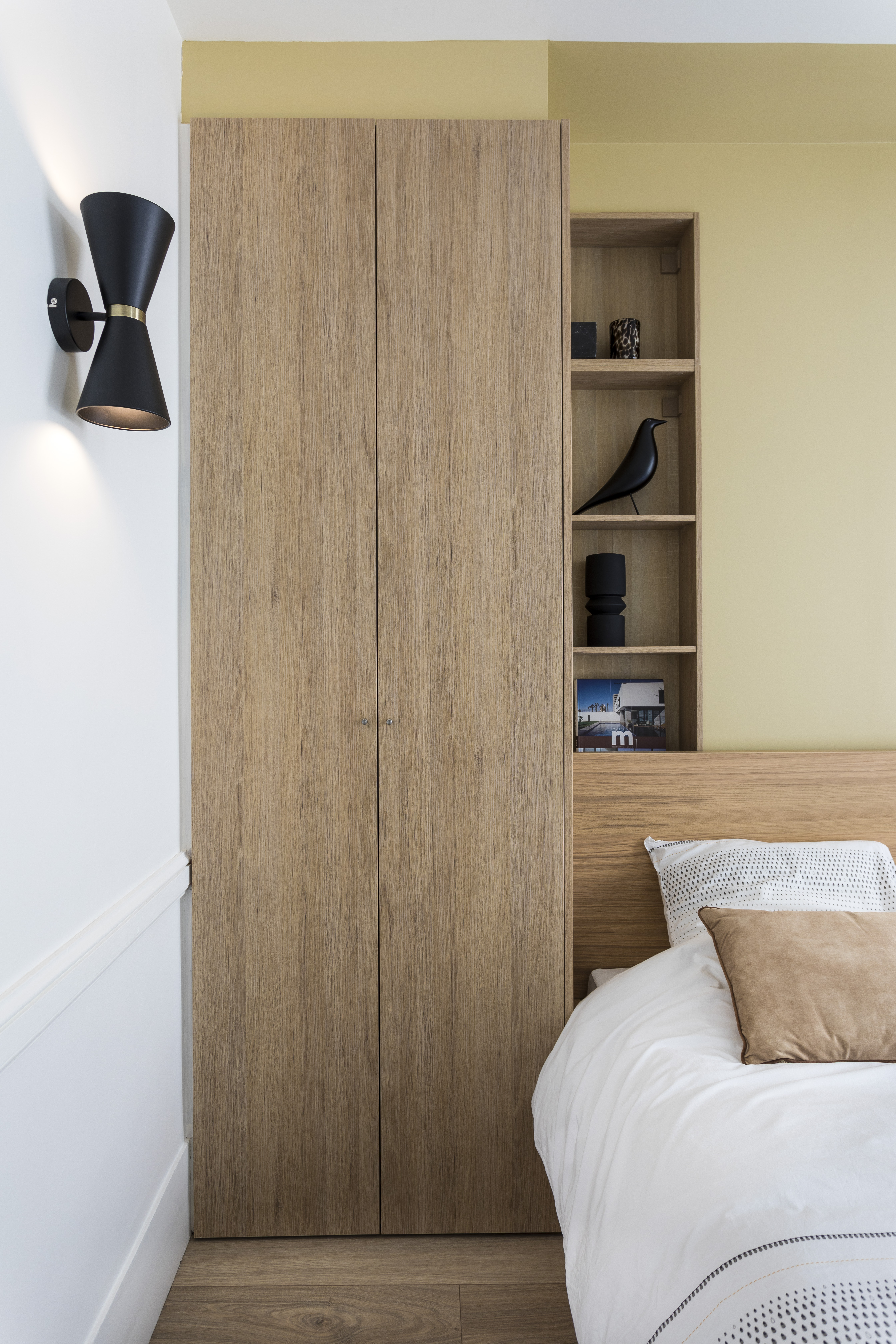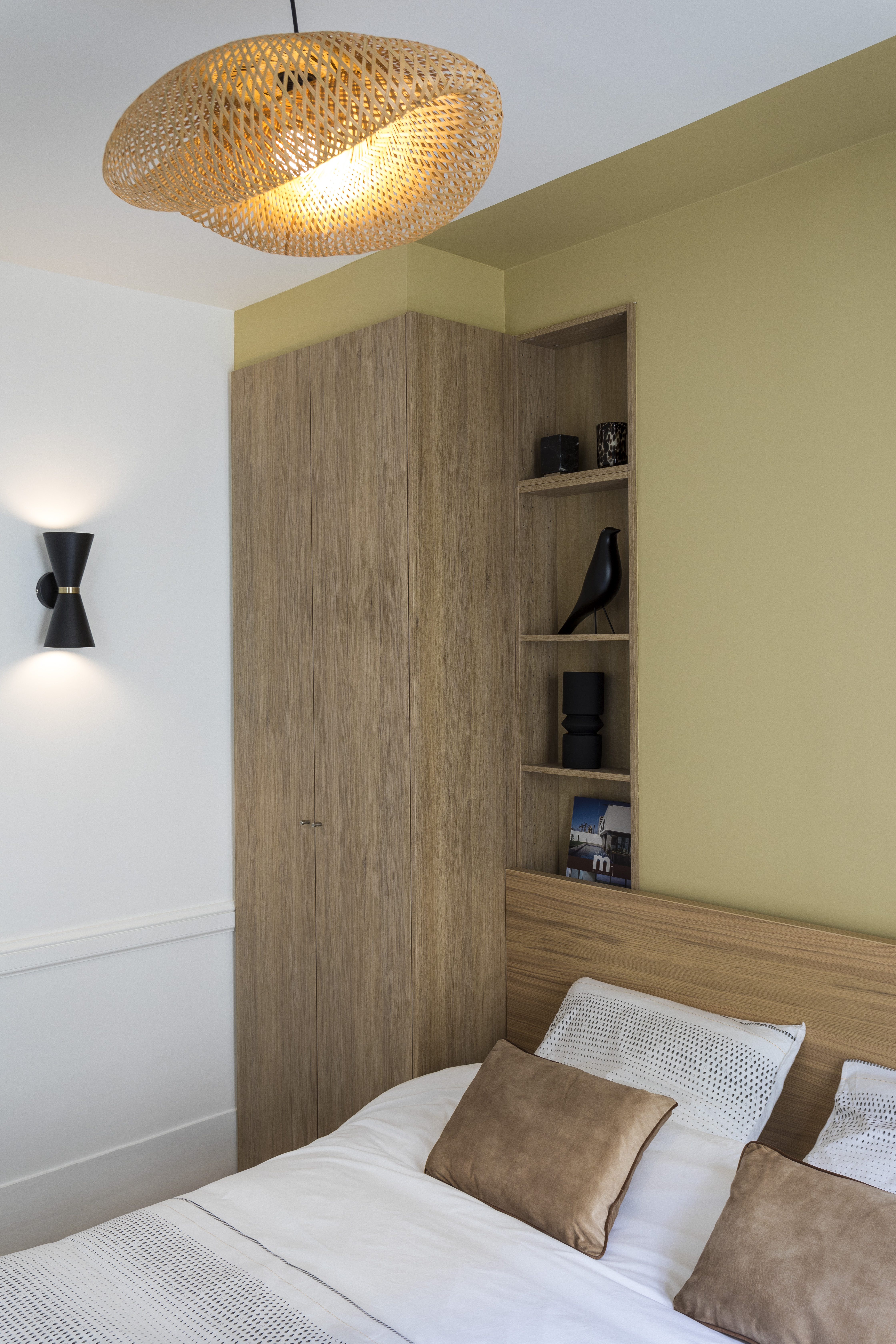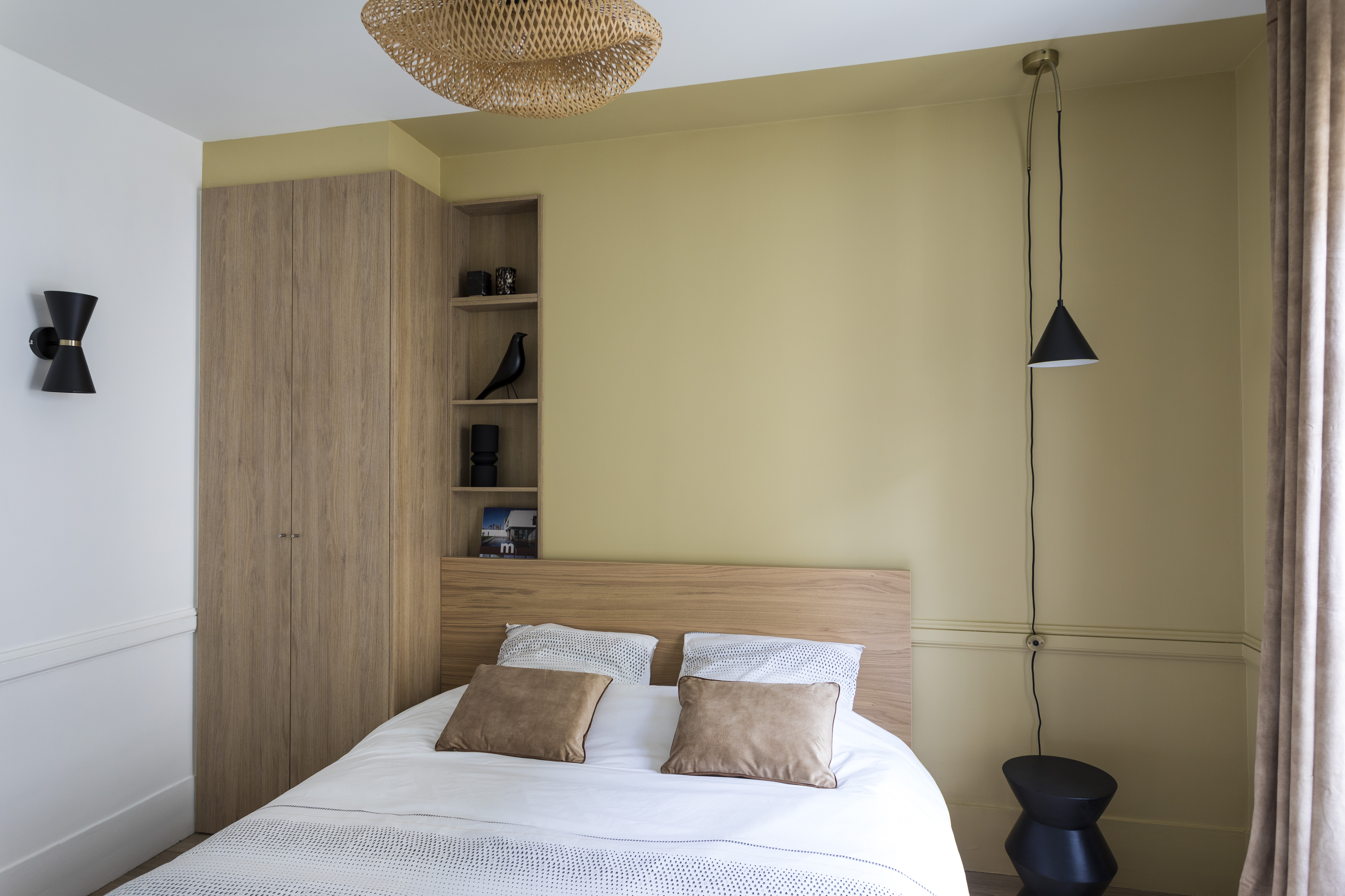 Dans la chambre, on a conservé 1/3 du placard existant mais il fallait récupérer du rangement (on a perdu environ 1 mètre linéaire de penderie au profit de la cuisine). Sa surface ne permet pas de mettre beaucoup de meubles car il faut conserver un passage pour accéder à la salle de bain et aux WC. L’astuce a été d’exploiter la bibliothèque de faible profondeur cachée dans le mur porteur derrière une porte dérobée et d’utiliser ces 25 cm de profondeur pour semi encastrer un dressing du commerce d’un mètre de large. Ainsi il ne dépasse plus de que 35 cm au lieu de 60. Le reste a été exploité en petites étagères assorties au dressing pour servir de chevet d’un côté du lit car celui-ci devait rester centré dans la pièce pour des raisons de circulation. Ainsi, j’ai créé une tête de lit asymétrique, mise en valeur par une simple bande de peinture qui dépasse sur le plafond et le mur du fond pour créer un effet de boîte et donner de la profondeur à la chambre. On a l’impression que le lit s’enfonce dans le mur. Un coffrage en MDF peint de la même couleur au-dessus du placard donne l’impression que tout a été réalisé sur-mesure. De grands tiroirs sous le lit compensent le placard démoli dans la SDB.