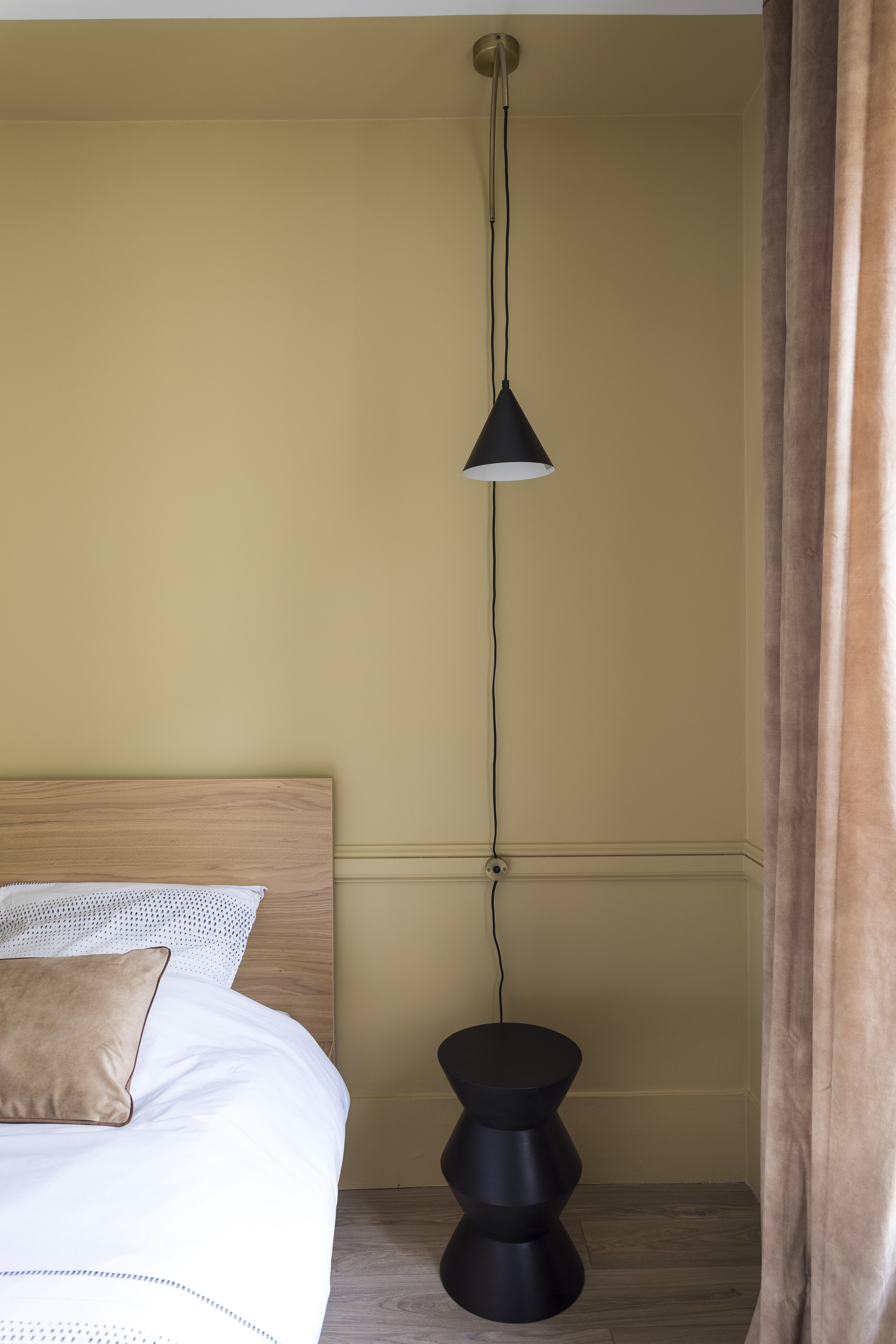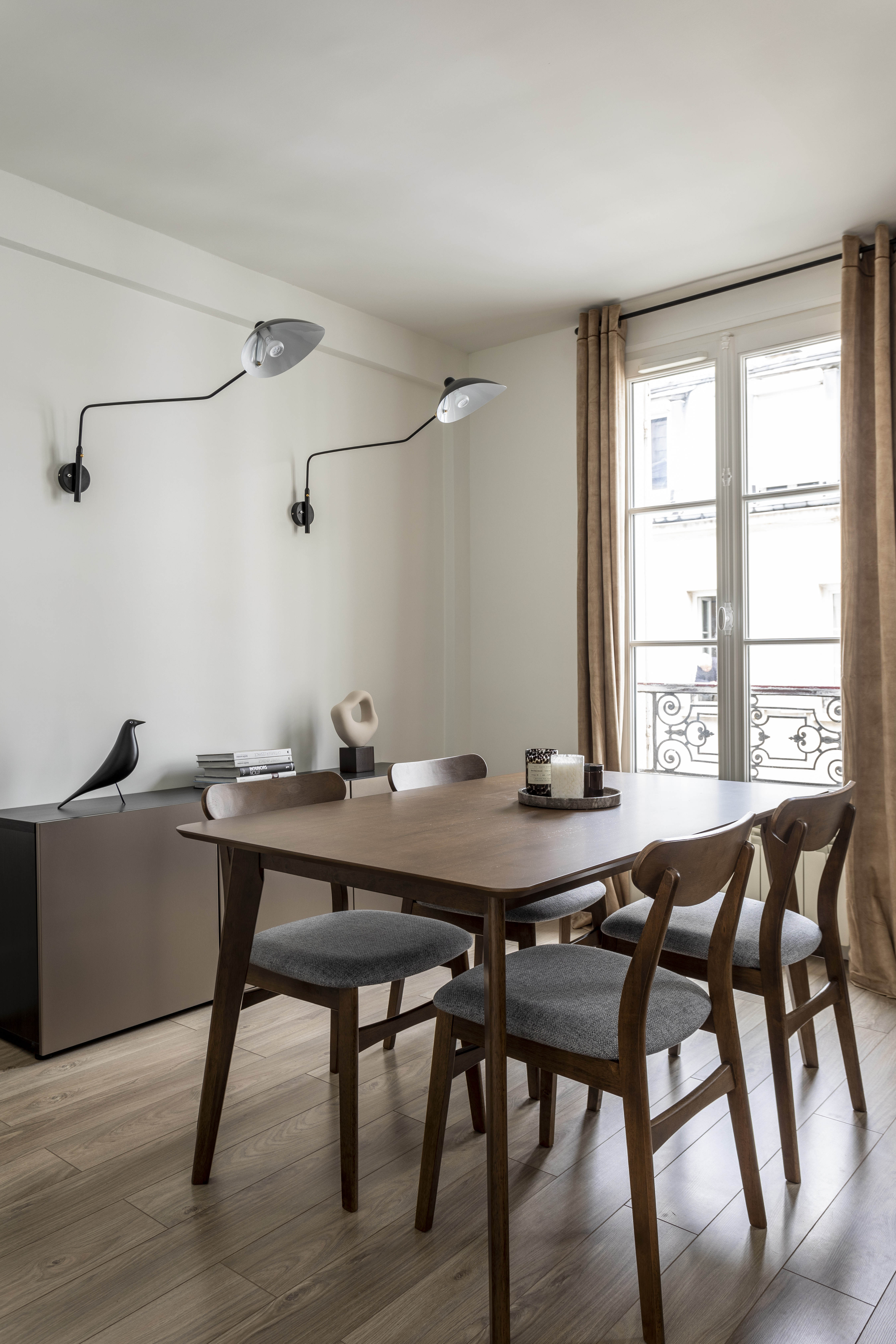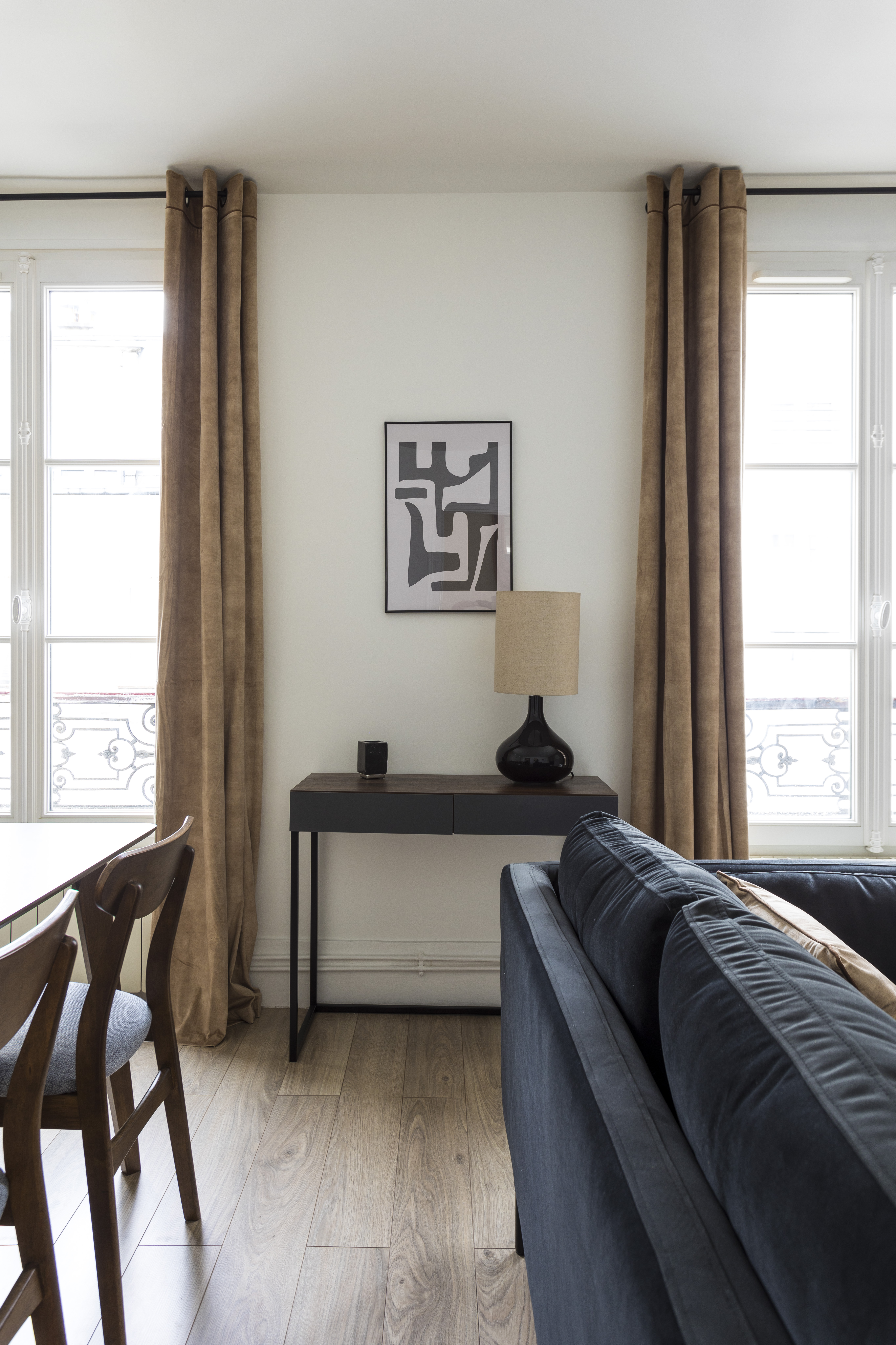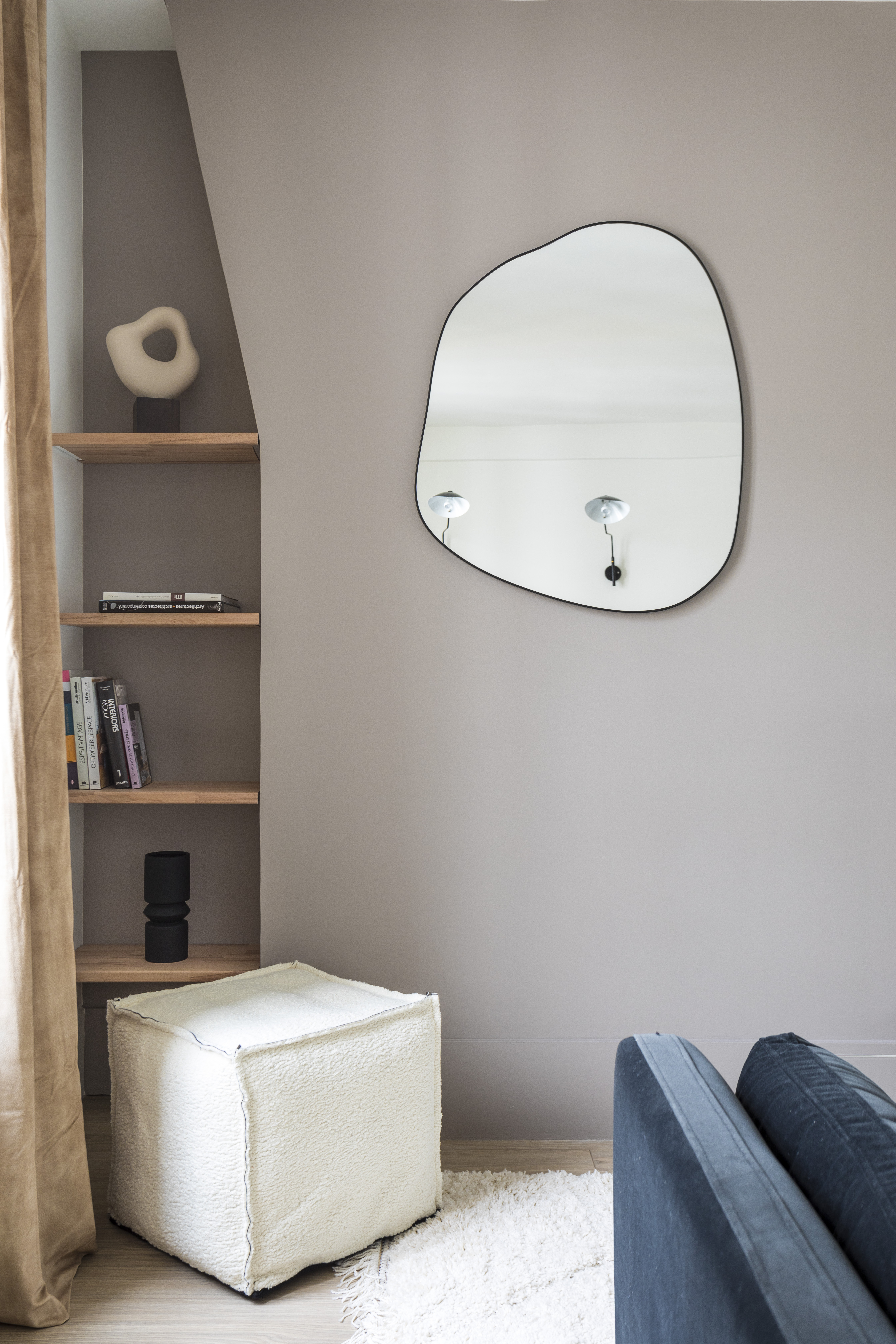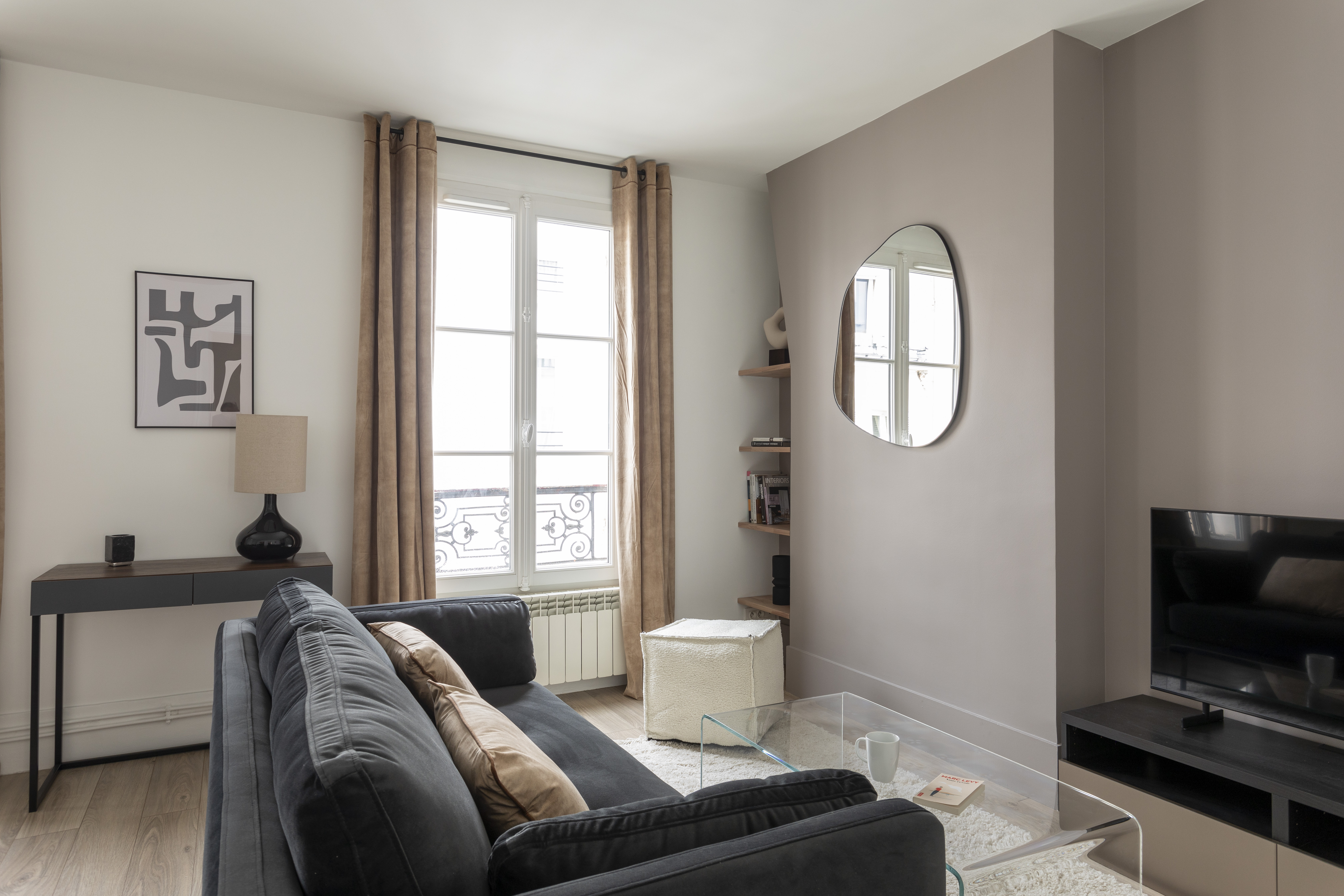 On entre directement dans le double séjour qui est de forme rectangulaire avec 2 fenêtres, ce qui permet de faciliter son aménagement avec un espace repas dès l’entrée, à côté de la cuisine et un espace salon au fond. Entre les 2 fenêtres, j’en ai profité pour installer une console qui peut faire office de bureau d’appoint pour le télétravail. Pas de gros travaux ici, juste de la décoration avec enduits, peintures et sélection de mobilier, luminaires, rideaux et déco. Afin d’exploiter chaque mètre carré, j’ai proposé des petites tablettes en chêne sur-mesure dans le coin du salon, près de la fenêtre.