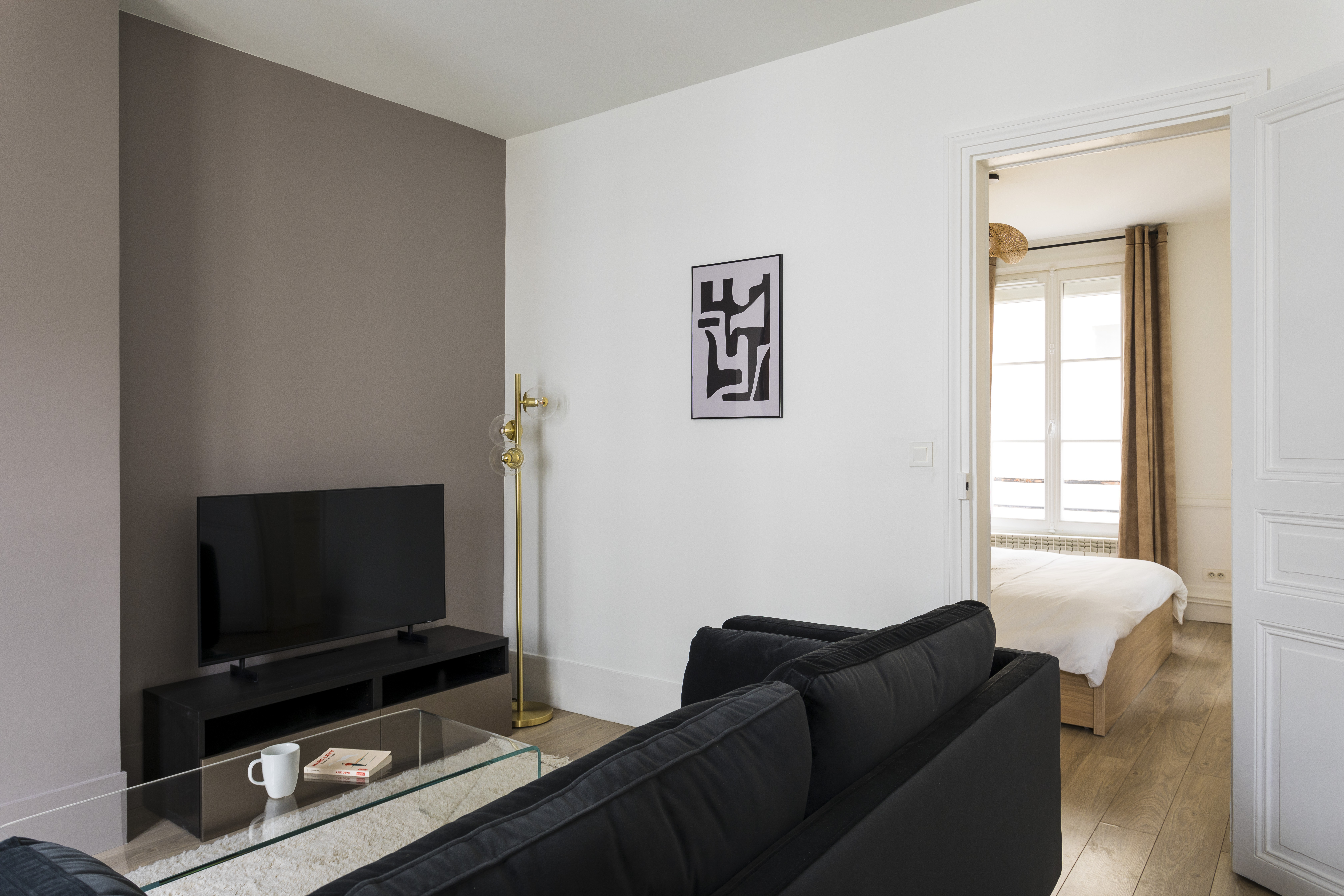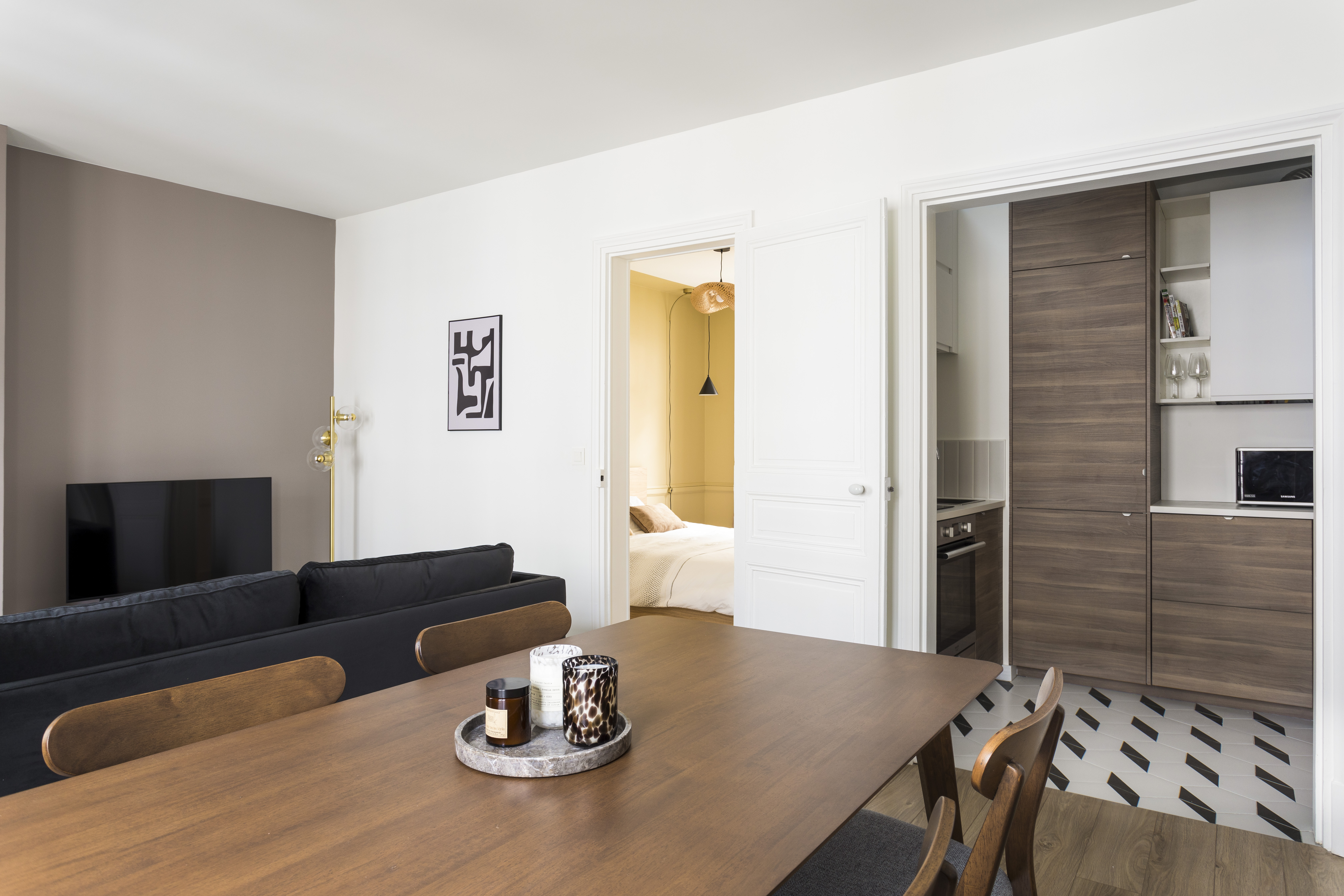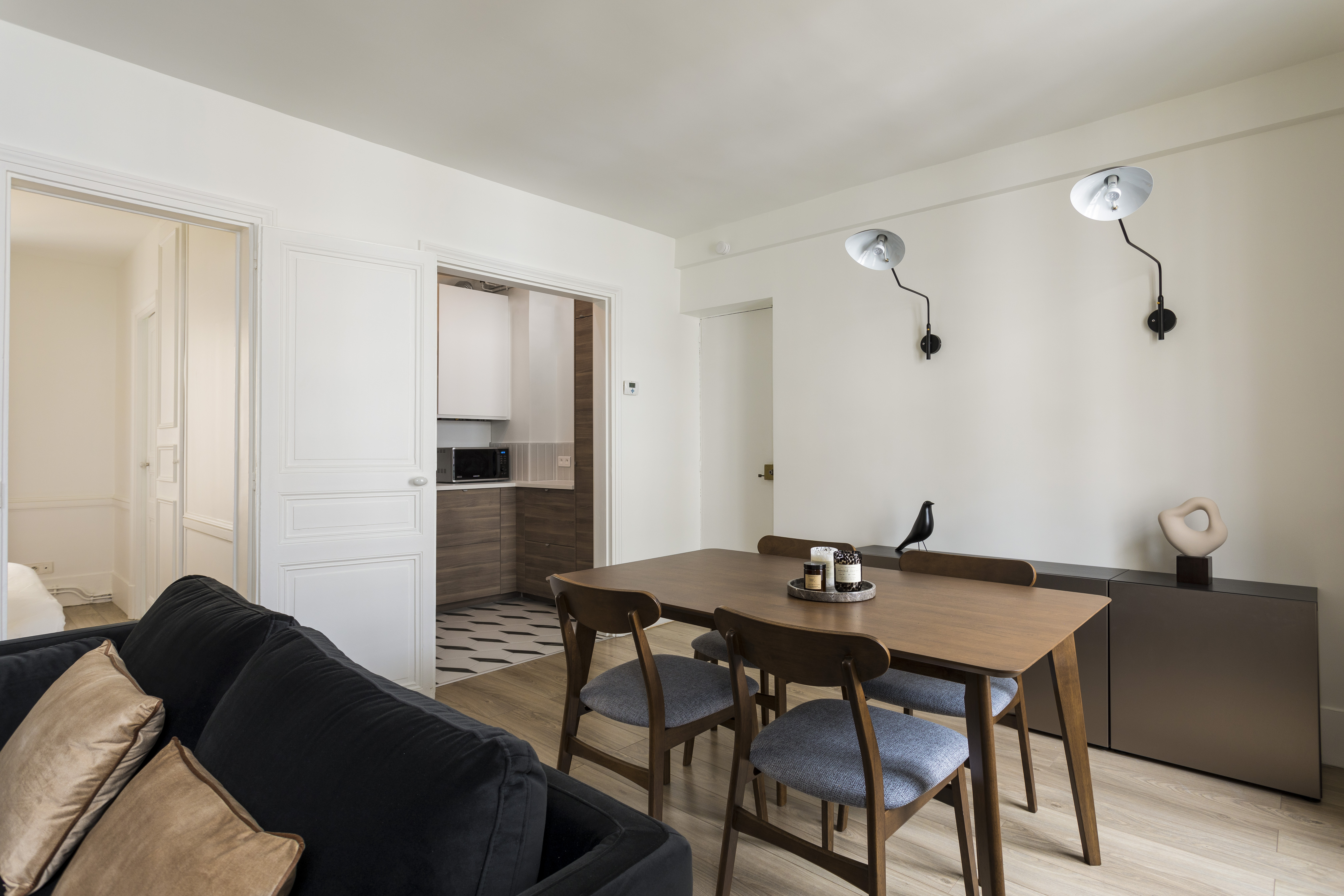 Rénovation, aménagement et décoration de ce 2 pièces de 41m² destiné à la location meublée dans le 7e arrondissement de Paris. Le client est un investisseur qui souhaite louer plus cher que son prédécesseur en proposant des prestations plus haut de gamme avec une vraie cuisine équipée et une nouvelle salle de bain, le tout avec une décoration sobre mais qui a du caractère, afin de plaire au plus grand nombre.
