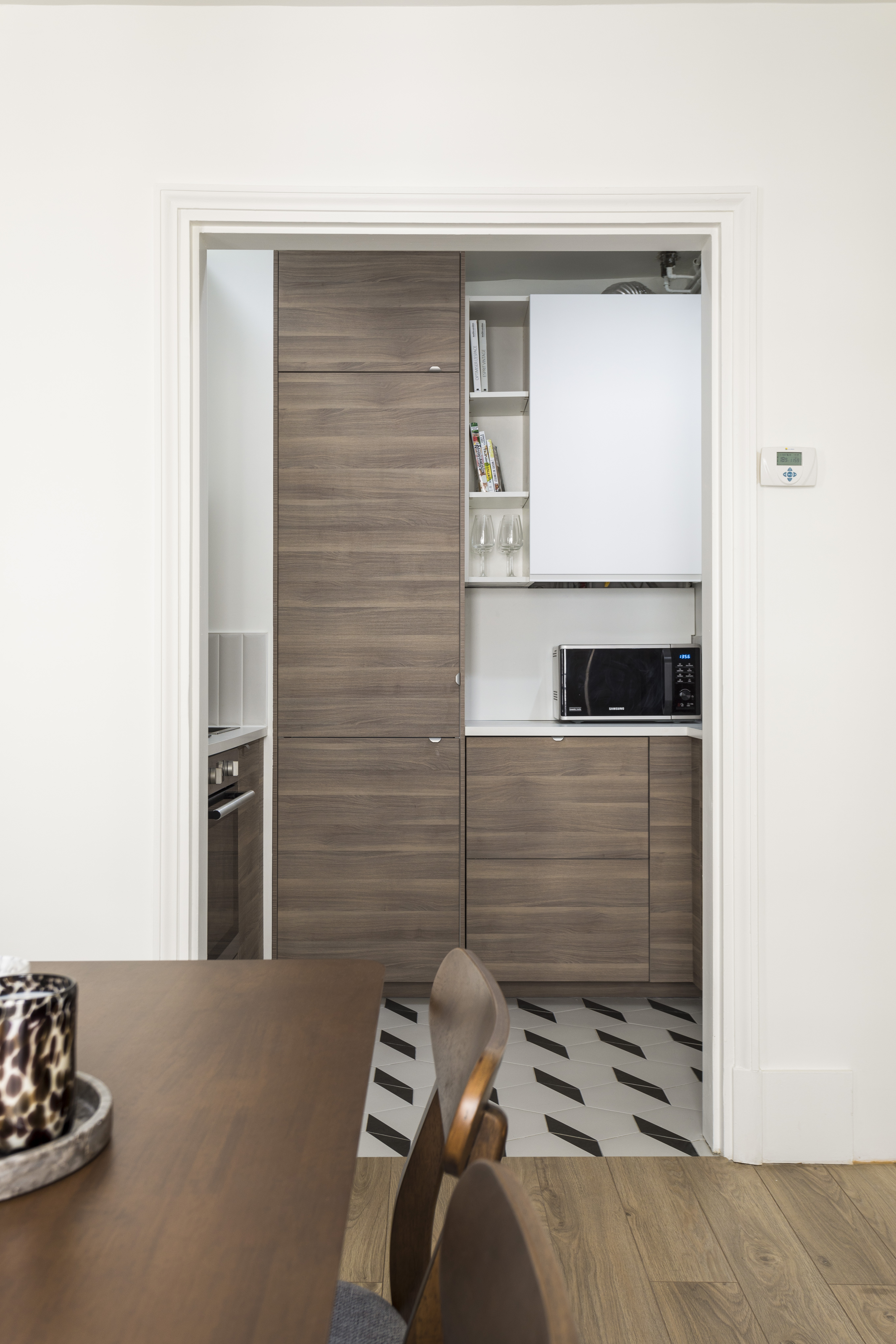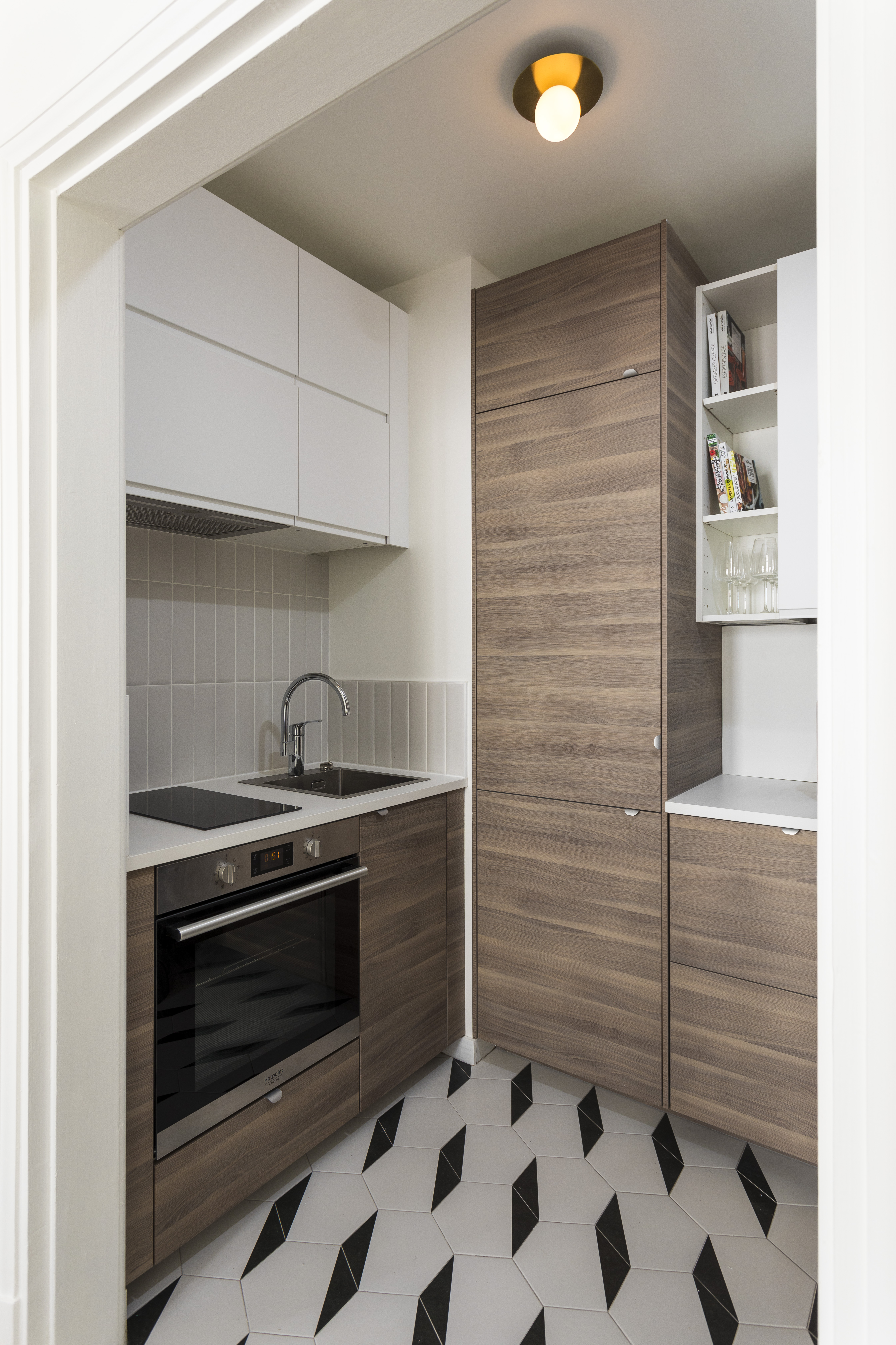 L’essentiel du budget a été consacré à l’agrandissement de la cuisine car au départ elle fait moins de 3m² ! Le véritable défi fut de proposer une cuisine toute équipée dans cet espace minuscule, en récupérant 2/3 du grand placard de la chambre et en poussant littéralement le mur, ainsi que le placard de la SDB. Cette pièce passe ainsi de 2.5 à 4 mètres carrés, ce qui reste un vrai casse-tête. Pour compenser, j’ai dû trouver des astuces pour récupérer l’espace de rangement perdu dans la chambre en proposant une tête de lit asymétrique. Enfin, le client tenait à remplacer les WC par des WC suspendus, donc nous avons décidé, pour des questions budgétaires, de conserver le carrelage blanc au sol de la SDB et des WC et de composer avec ce dernier pour tout de même proposer un vrai changement en attirant l’attention sur les murs.