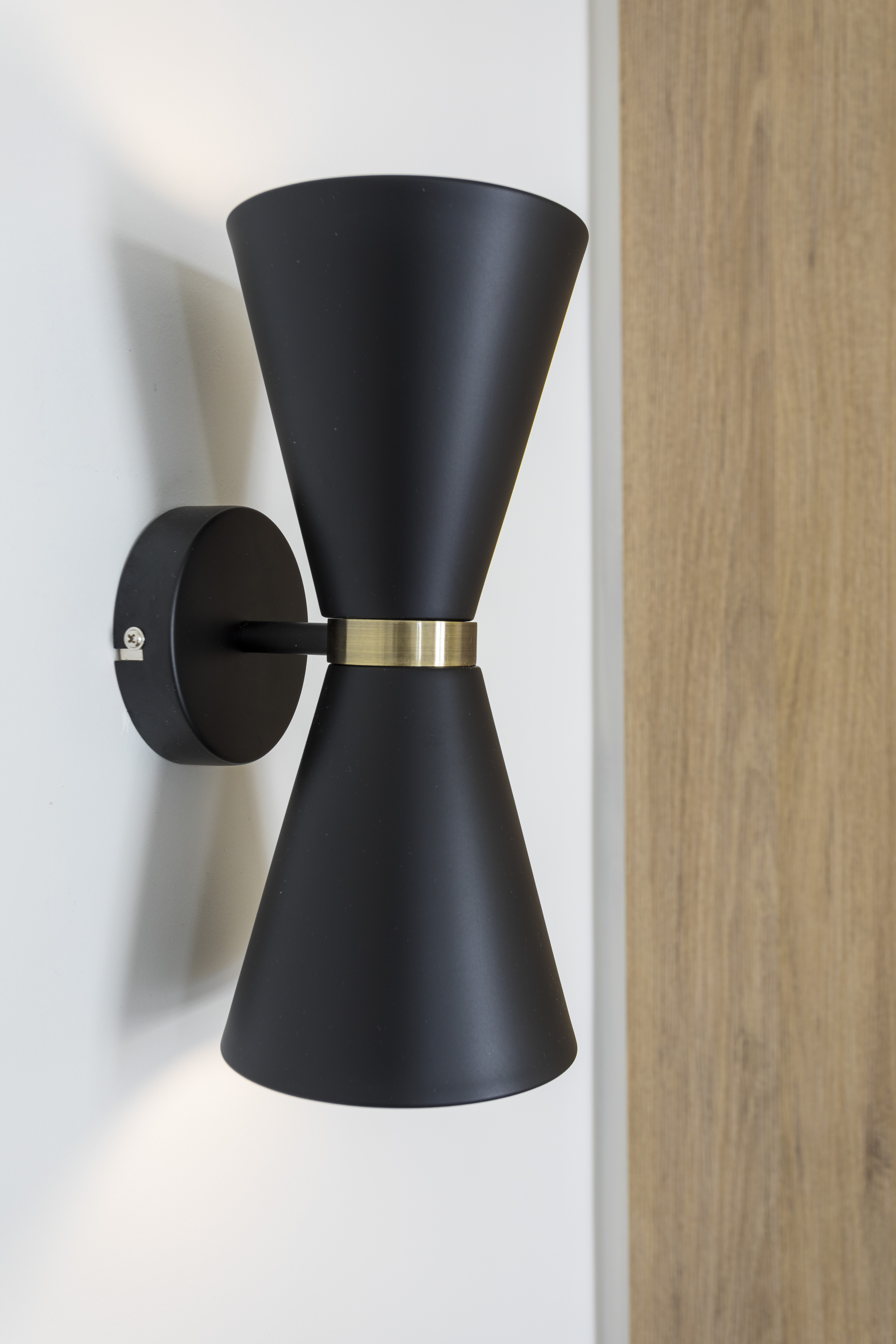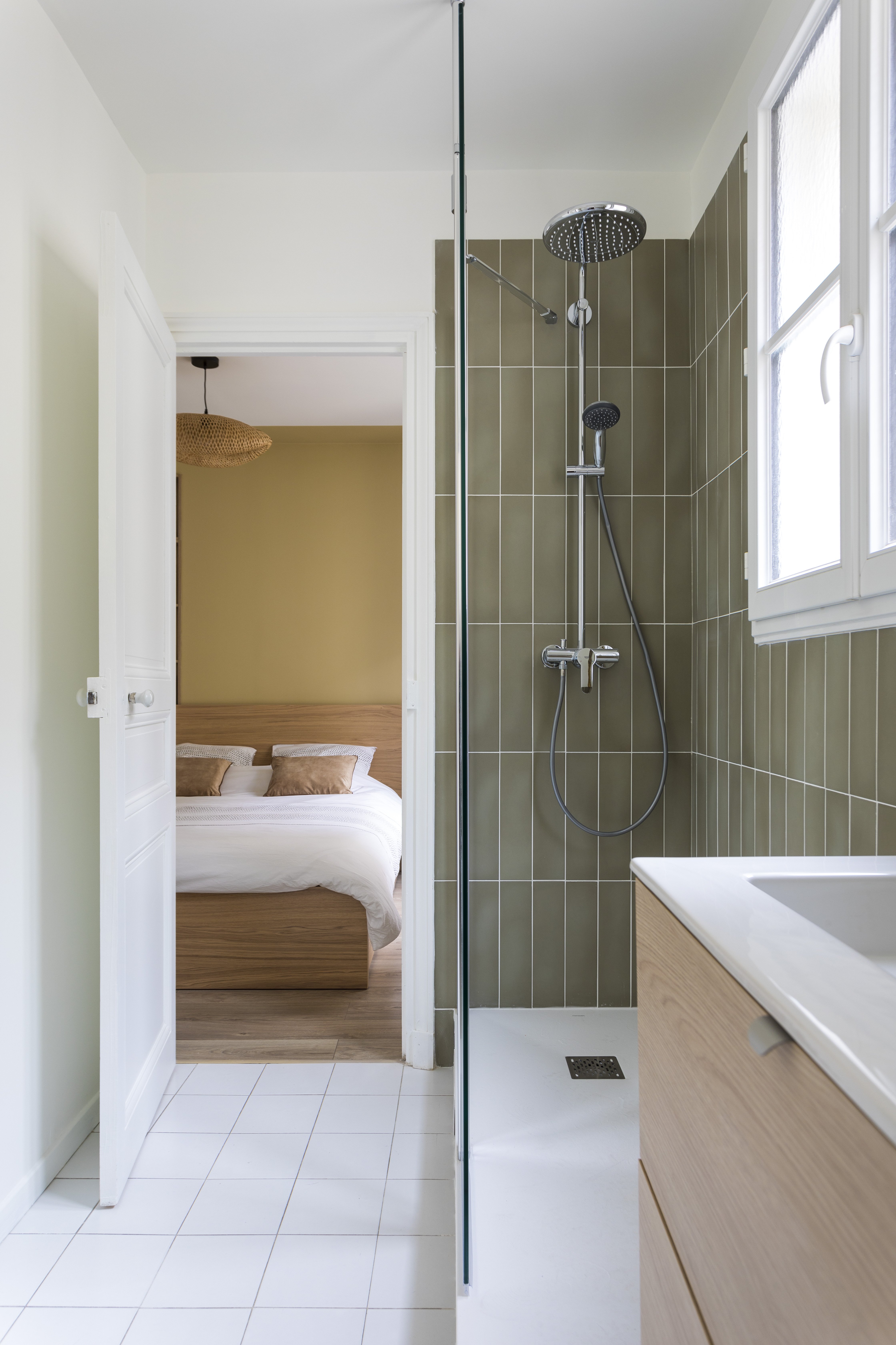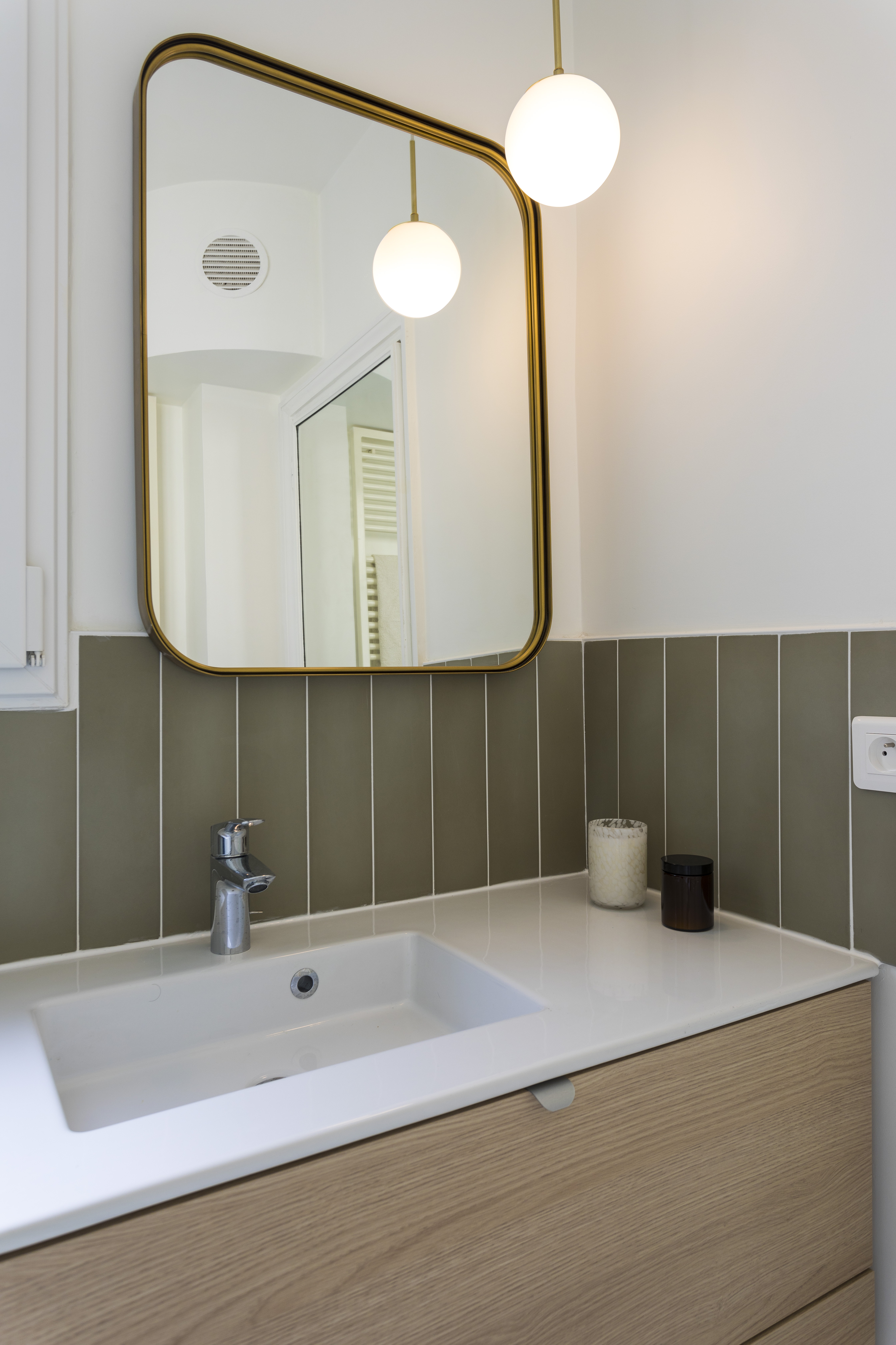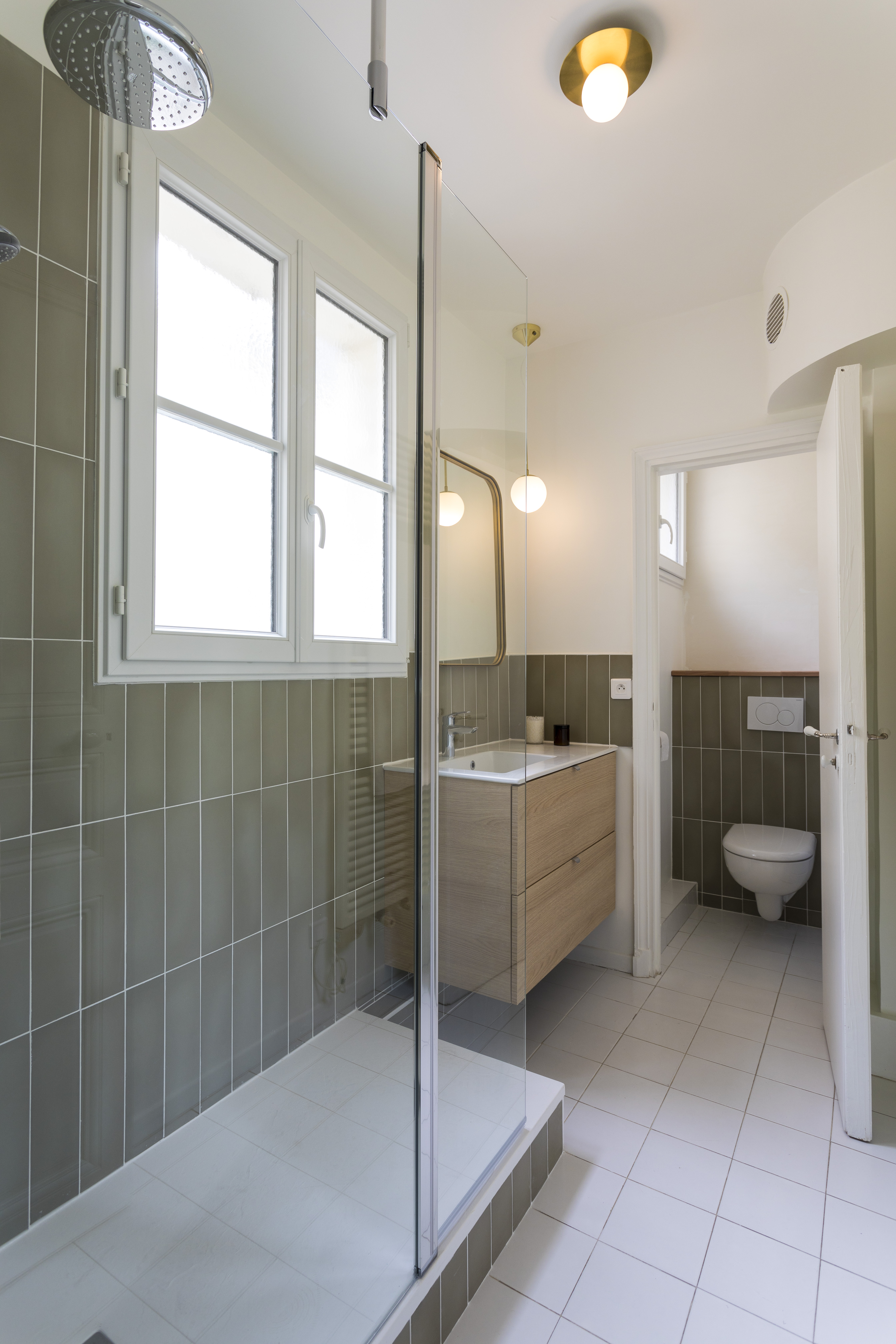 Pour la SDB, le sol en bon état a été conservé mais il est très banal et sans intérêt. Mon idée a été d’attirer l’attention sur les murs avec une couleur marquée plus osée et un calepinage très tendance en pose verticale. Une grande douche avec un receveur sur-mesure a pris la place de l’ancienne baignoire en fonte (et oui, le sol n’était pas carrelé sous la baignoire !). Au fond, derrière la porte miroir que j’ai souhaité conserver également pour le côté pratique, les WC, passés en suspendus, sont assortis à la salle d’eau. Les touche de bois (chêne clair) et de laiton (miroir, luminaires) réchauffent le tout.