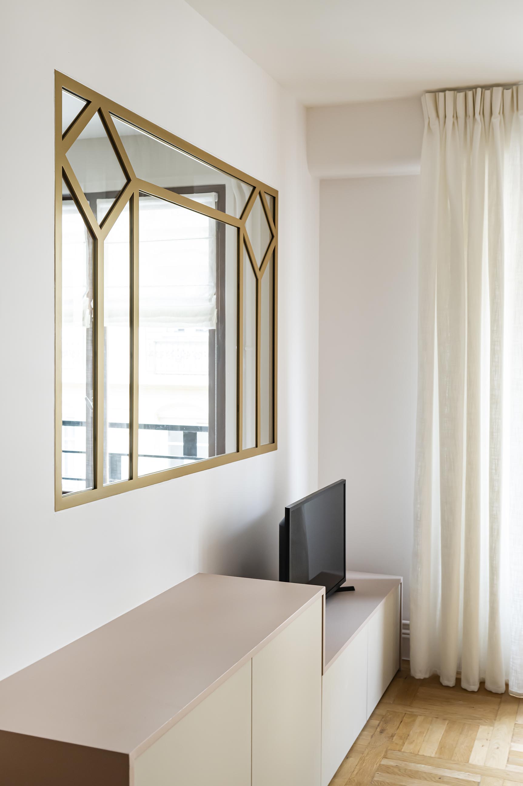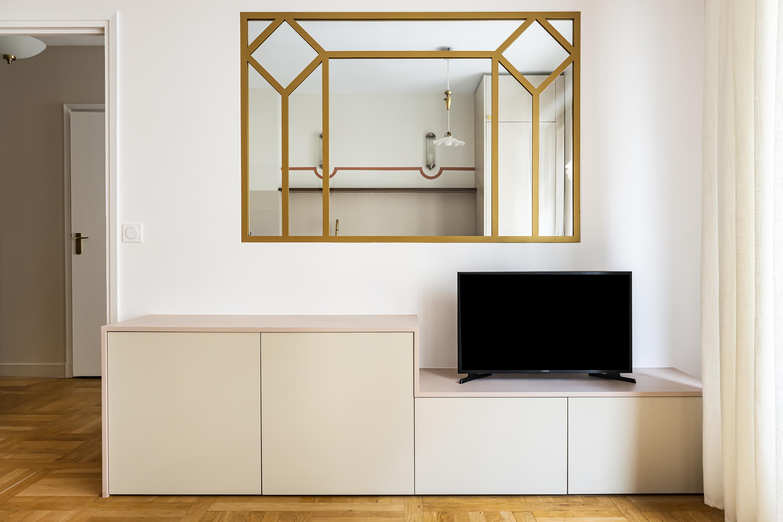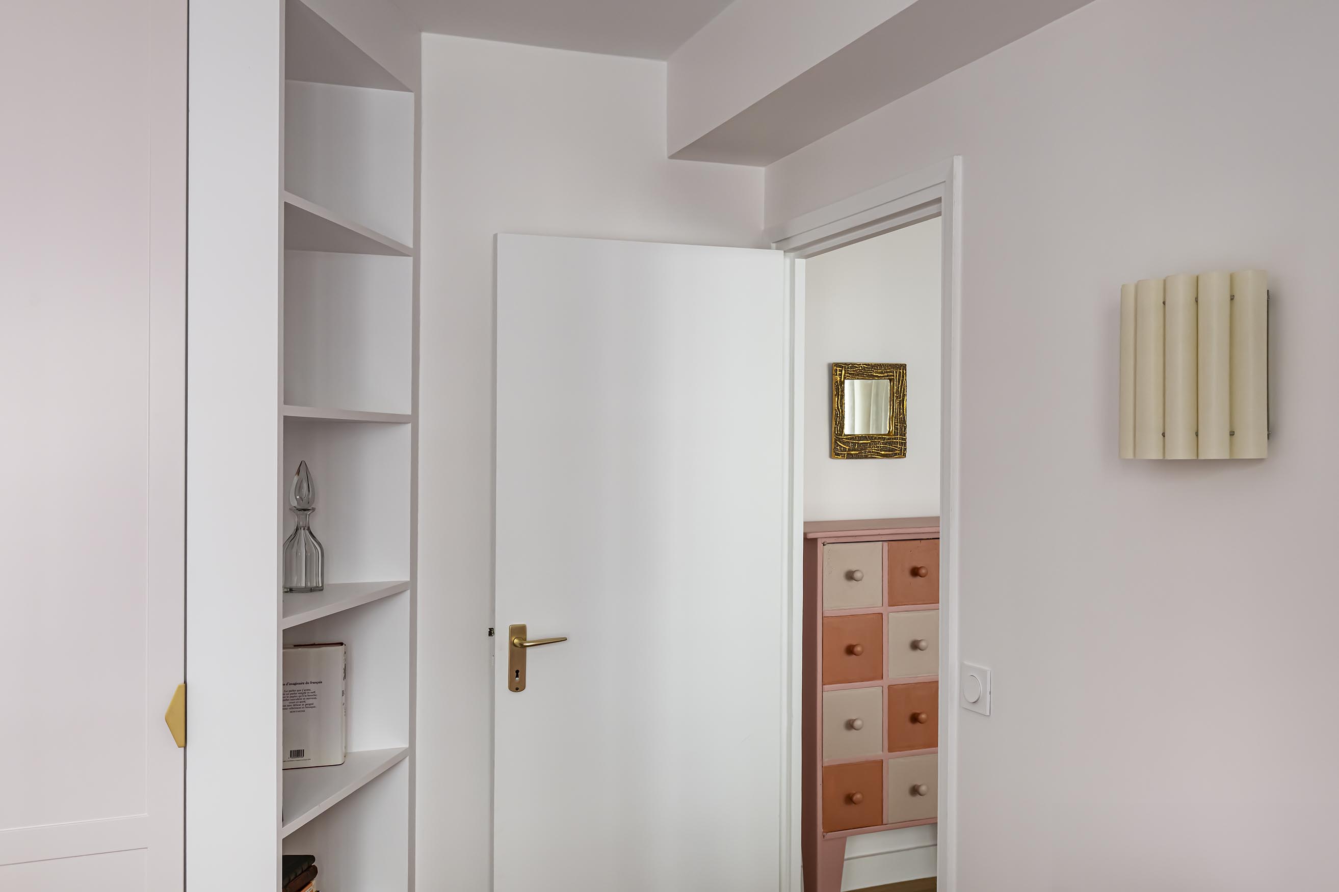 La chambre tout en douceur dans ses tonalités de rose pâle et beige a bénéficié d’un nouveau parquet refait quasi à l’identique de celui du reste de l’appartement, d’un grand dressing réalisé en semi mesure avec un habillage en biais face à la porte pour éviter de buter sur une façade en entrant. Les niches décoratives en biais apportent une touche décorative et permettent de proposer un meuble plus léger visuellement. De jolis rideaux occultants réalisés sur-mesure viennent parfaire les finitions.