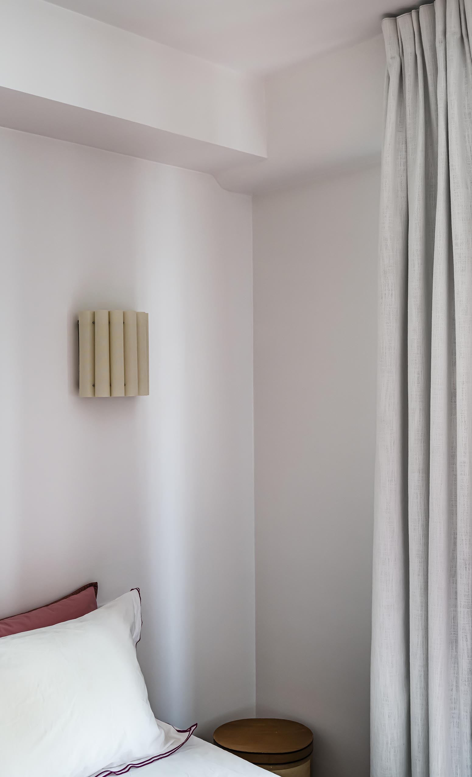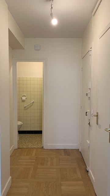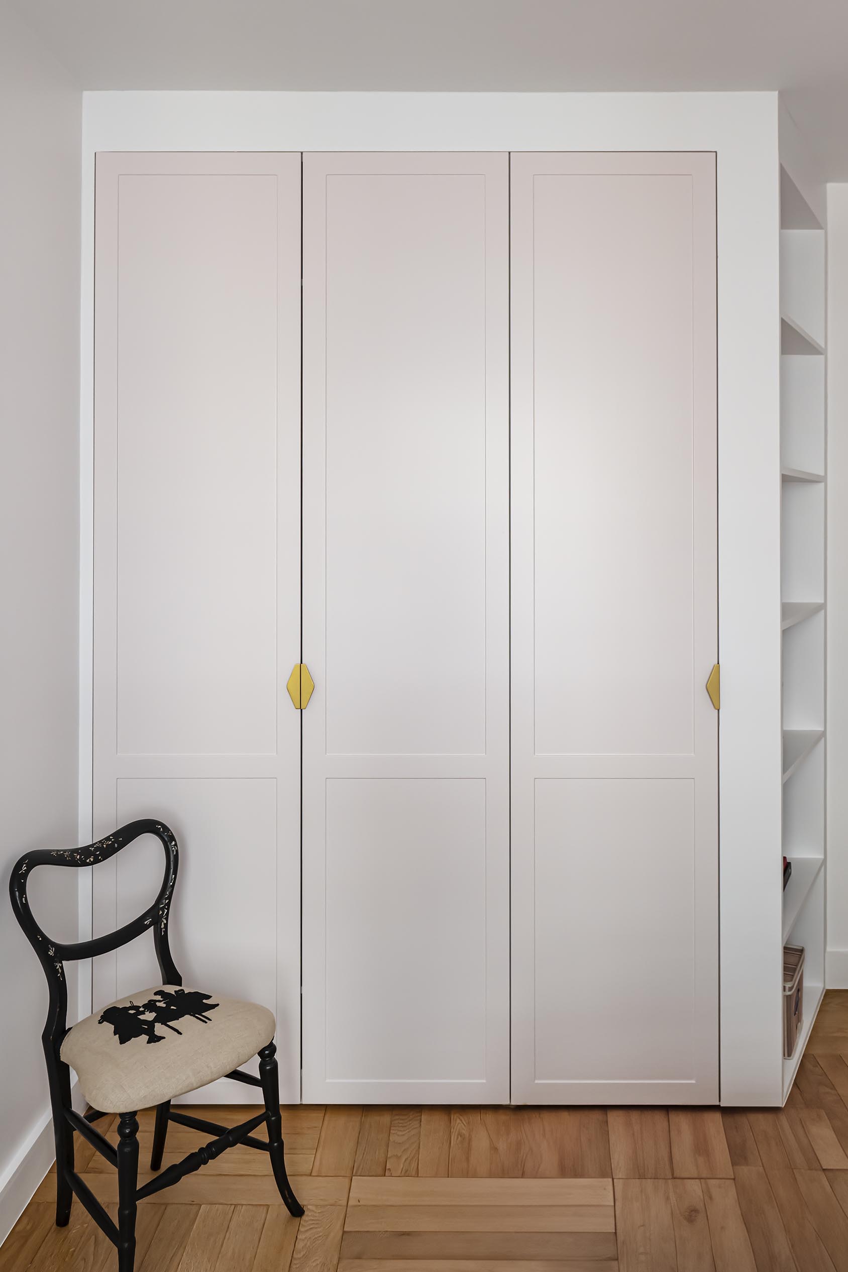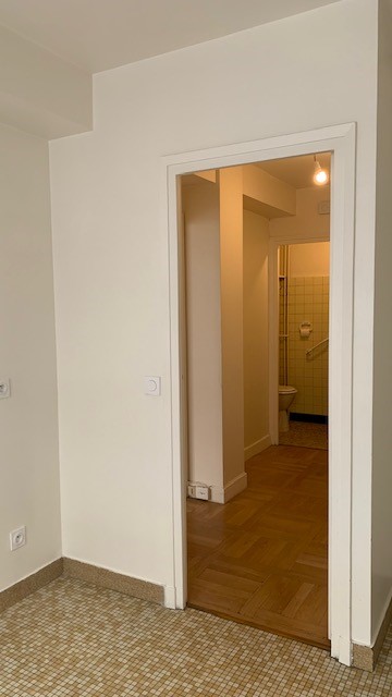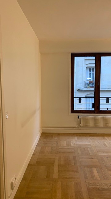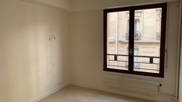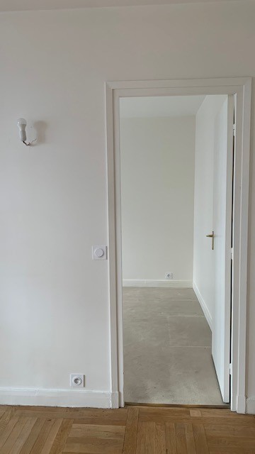 La chambre tout en douceur dans ses tonalités de rose pâle et beige a bénéficié d’un nouveau parquet refait quasi à l’identique de celui du reste de l’appartement, d’un grand dressing réalisé en semi mesure avec un habillage en biais face à la porte pour éviter de buter sur une façade en entrant. Les niches décoratives en biais apportent une touche décorative et permettent de proposer un meuble plus léger visuellement. De jolis rideaux occultants réalisés sur-mesure viennent parfaire les finitions.